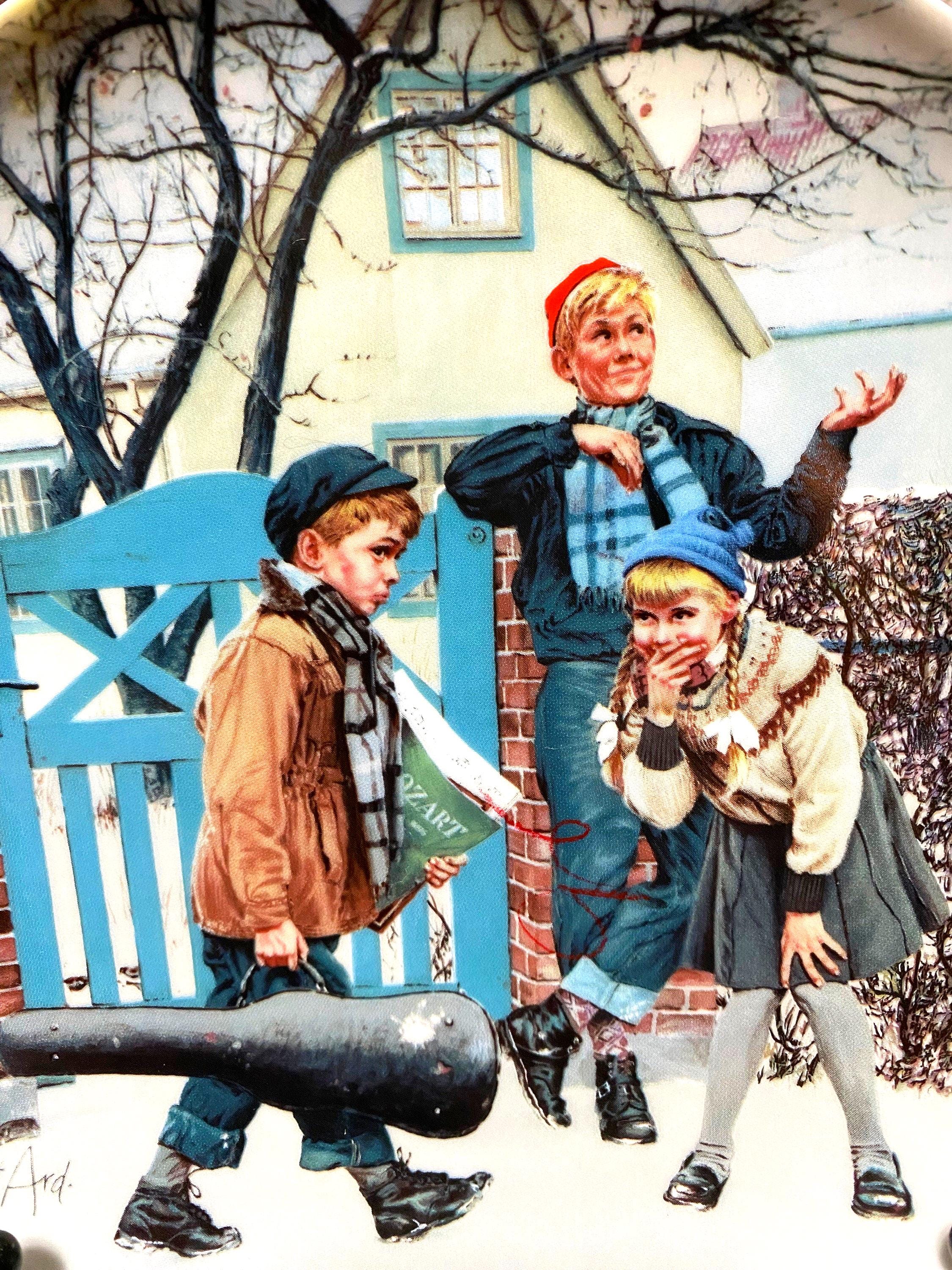 This is a lovely Bing & Grondahl vintage collectible plate featuring a boy with his instrument as the other kids are teasing. Copenhagen porcelain, Bradex number: 14-B36-7-2.