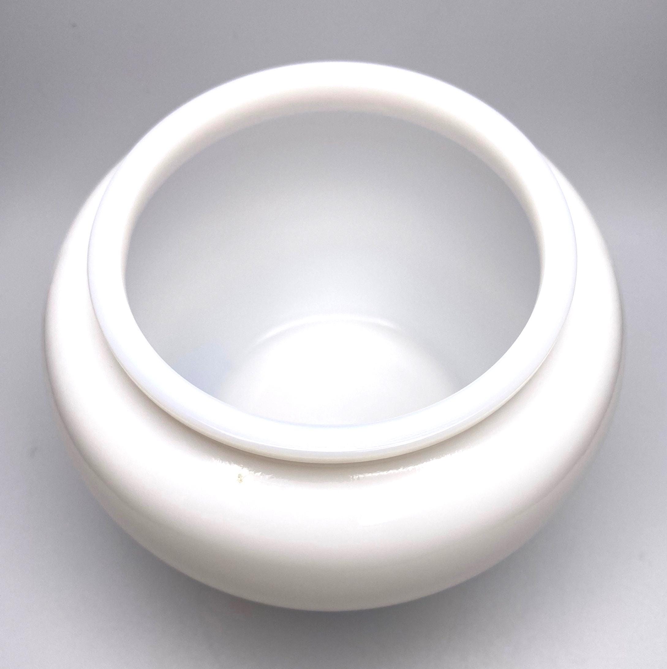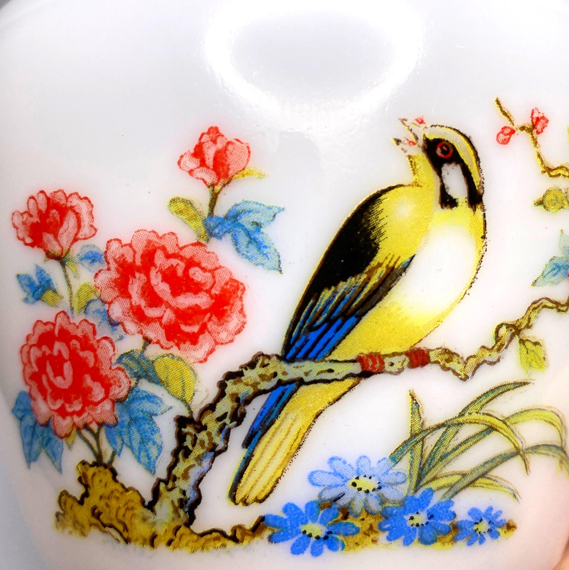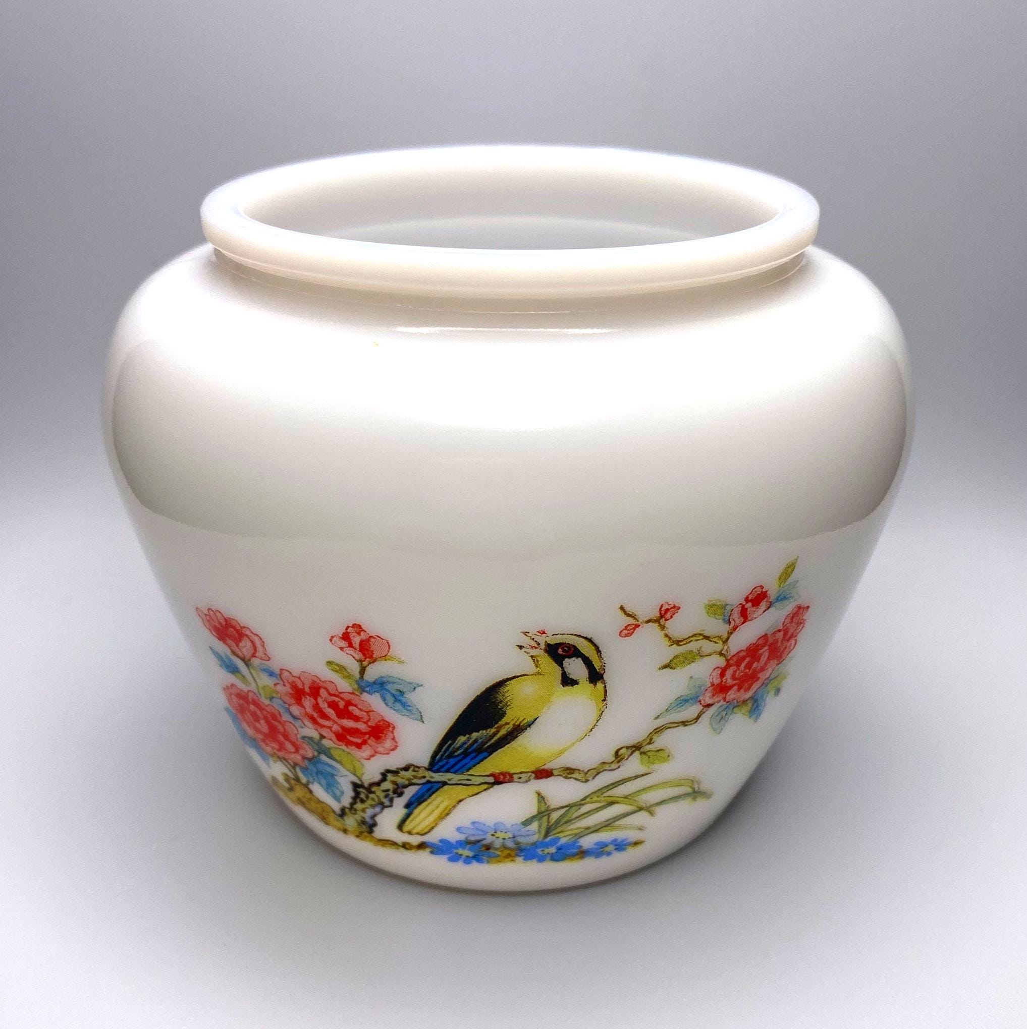 This is a lovely vintage Avon milk glass ginger jar from the 1970's. It's simple, but beautiful with eye catching color against the white milk glass. It's missing its lid, but would re-purpose beautifully with some greenery or flowers, or a candle.