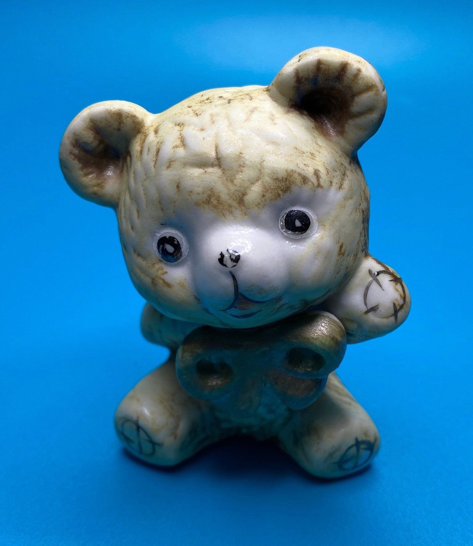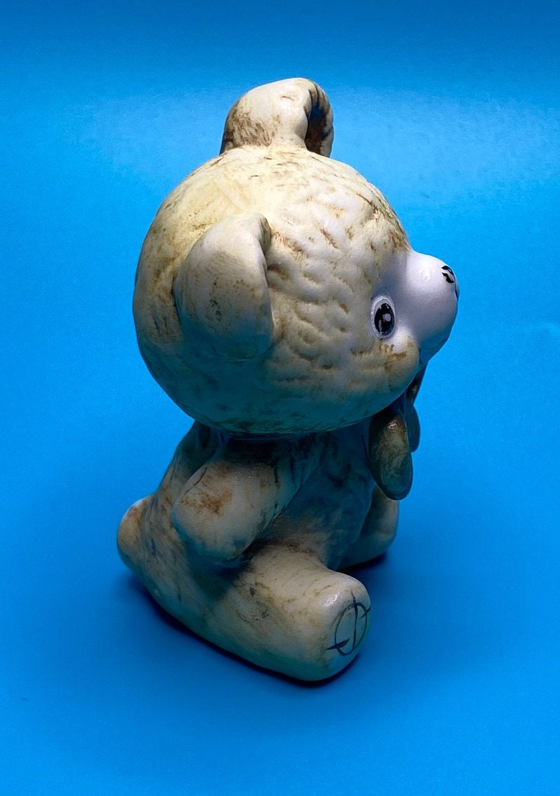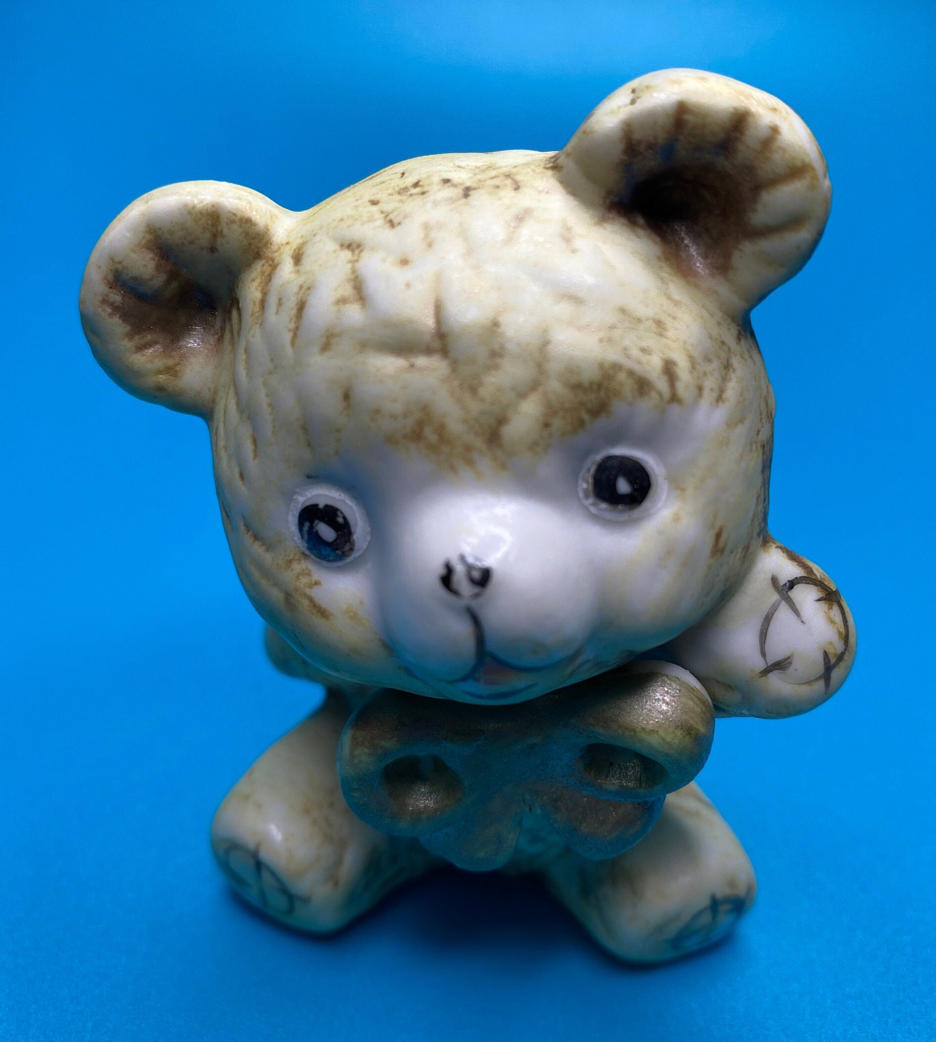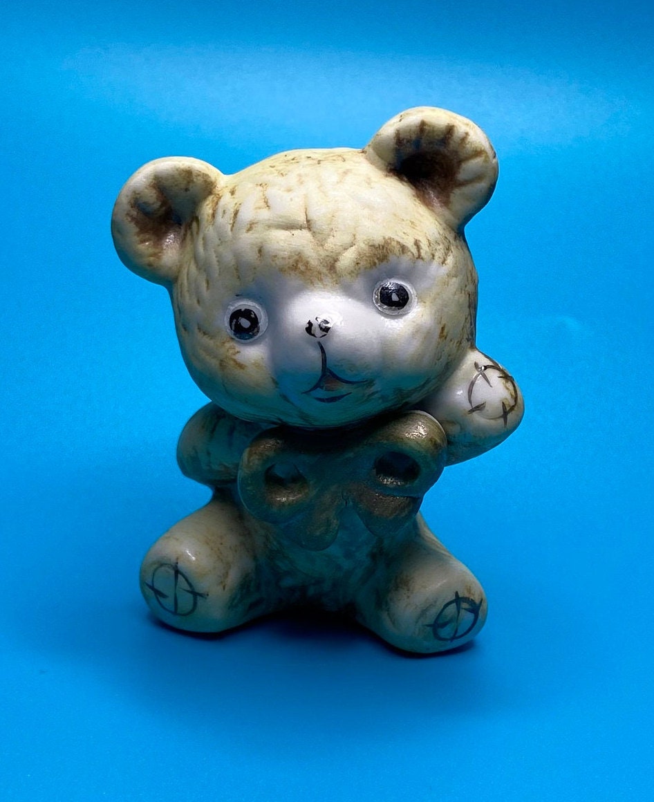 Sweet vintage ceramic bear with a bow. His paint is worn from past love and age, but it adds to his charm. Unique bear for someone who loves or collects teddy bears. Would also be a very cute in a nursery or child's room.