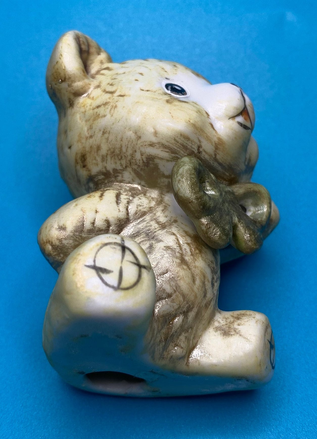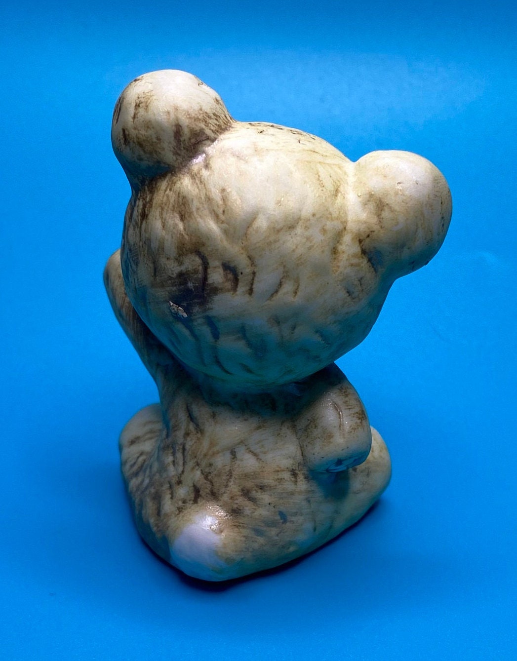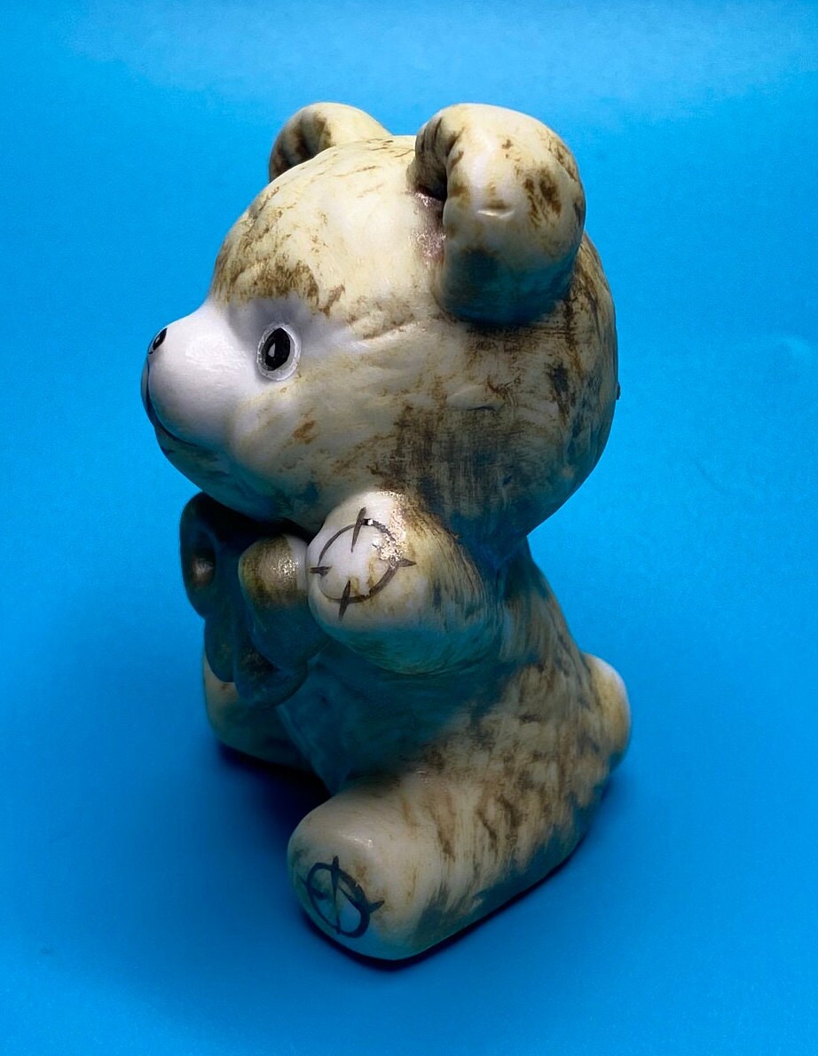 Sweet vintage ceramic bear with a bow. His paint is worn from past love and age, but it adds to his charm. Unique bear for someone who loves or collects teddy bears. Would also be a very cute in a nursery or child's room.