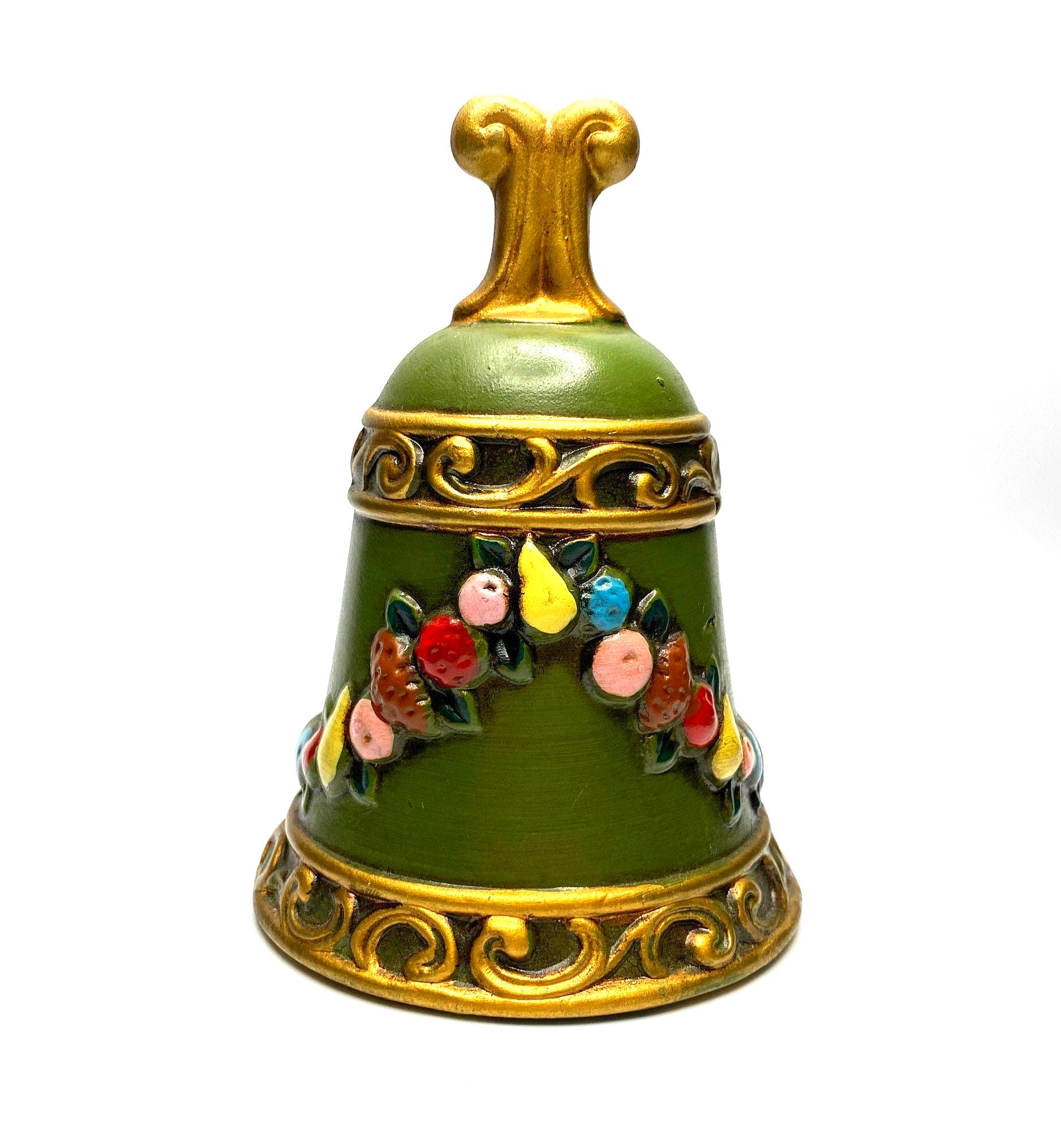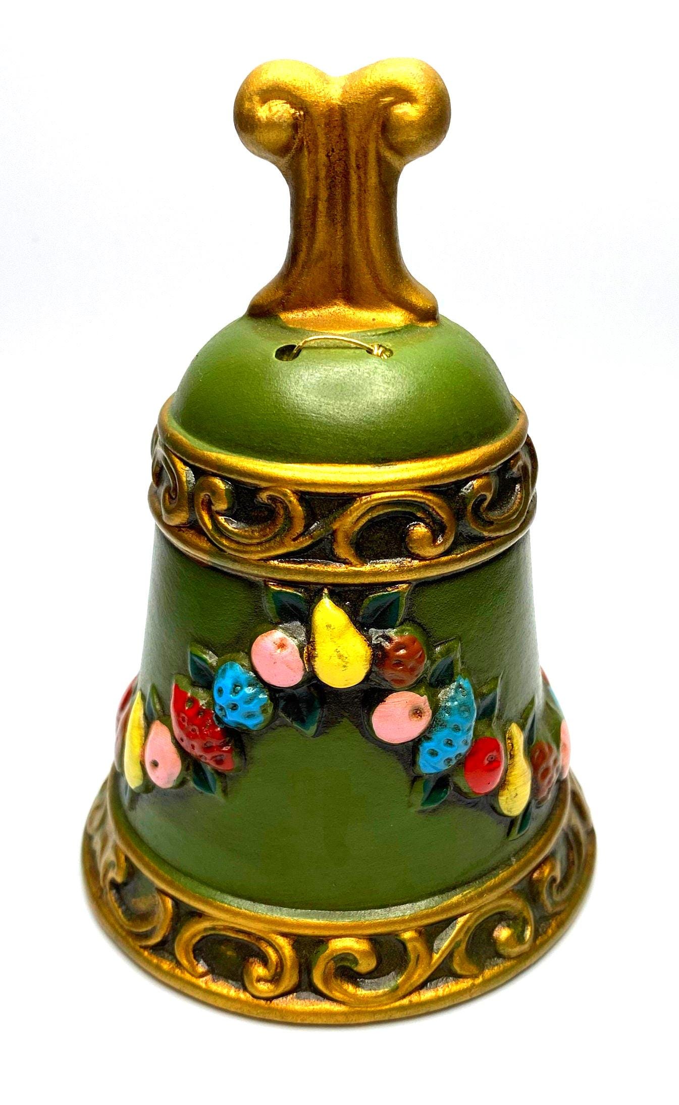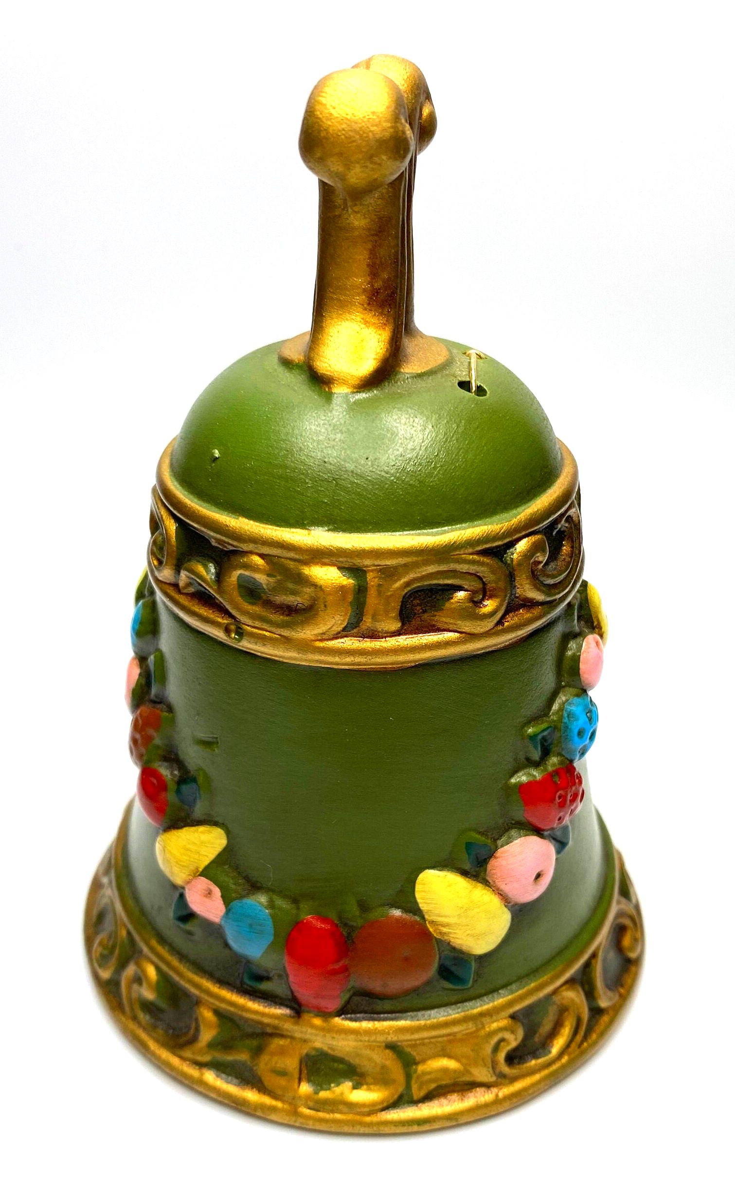This is a lovely vintage matte finish bell decorated with fruit. The bell is dark green accented with a string of multi-colored fruit and accented in gold. It has the Napcoware sticker inside the bell and stamped with X-8383. Would be a great accent to your vintage decor and would make a great touch for the Christmas season.
