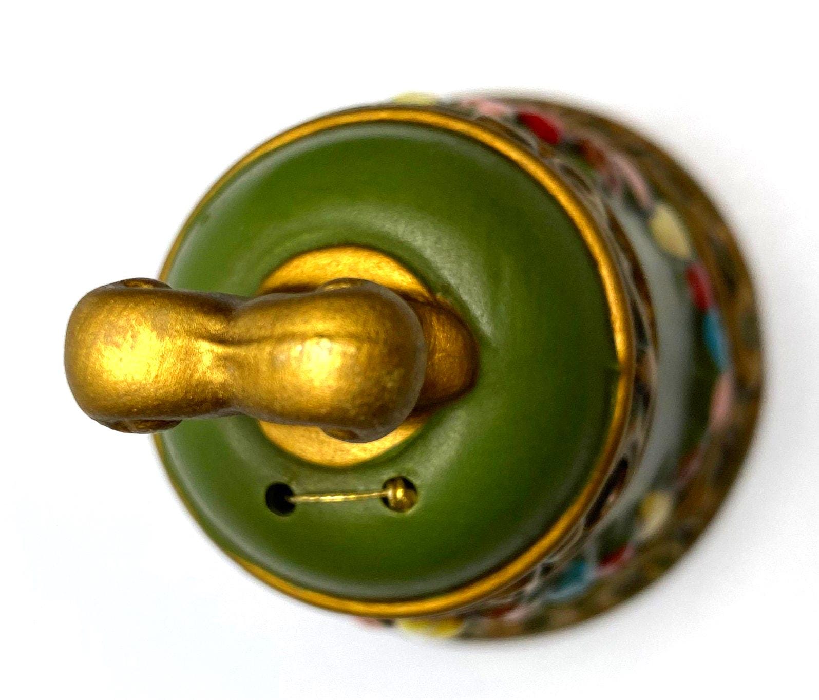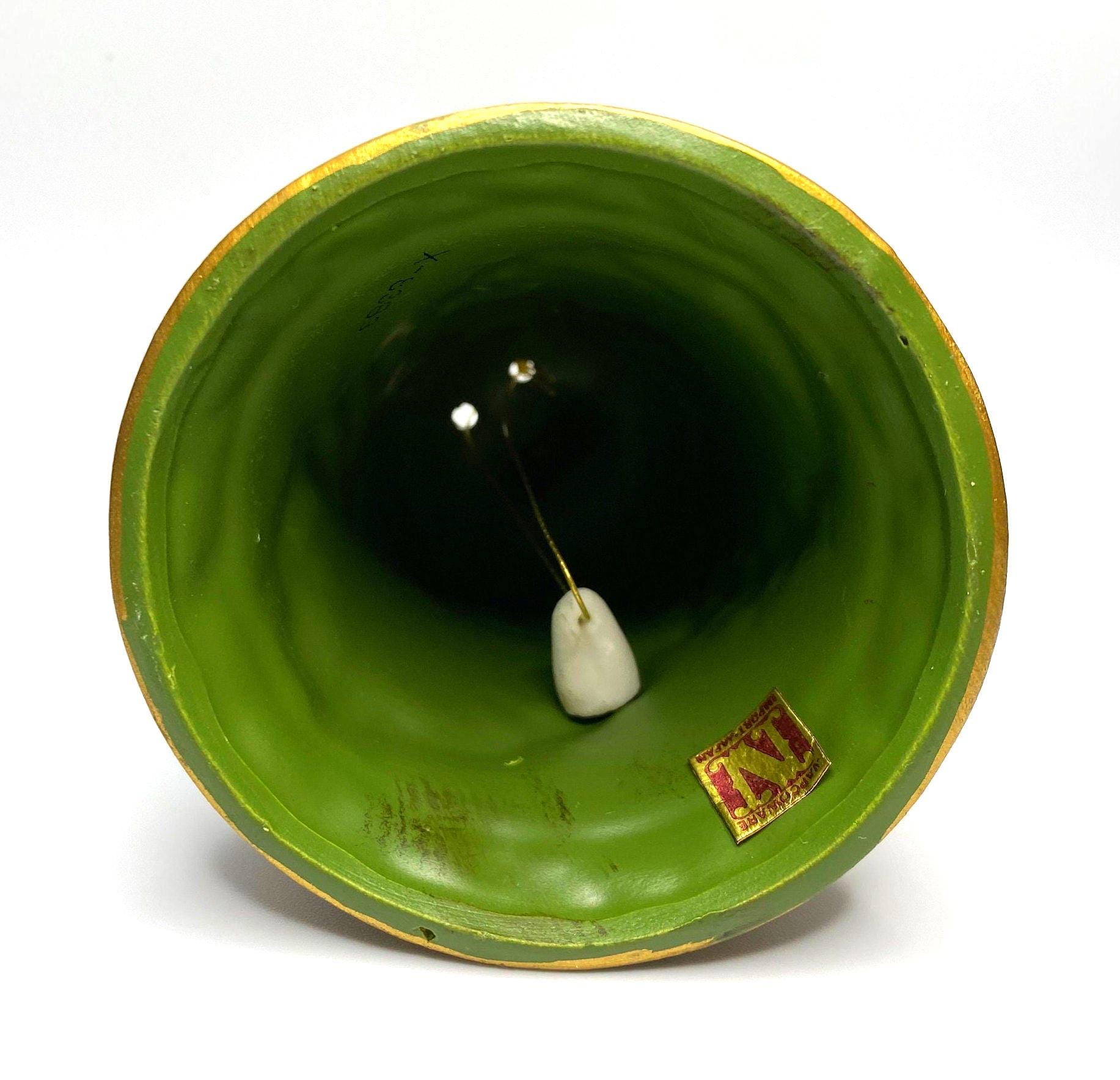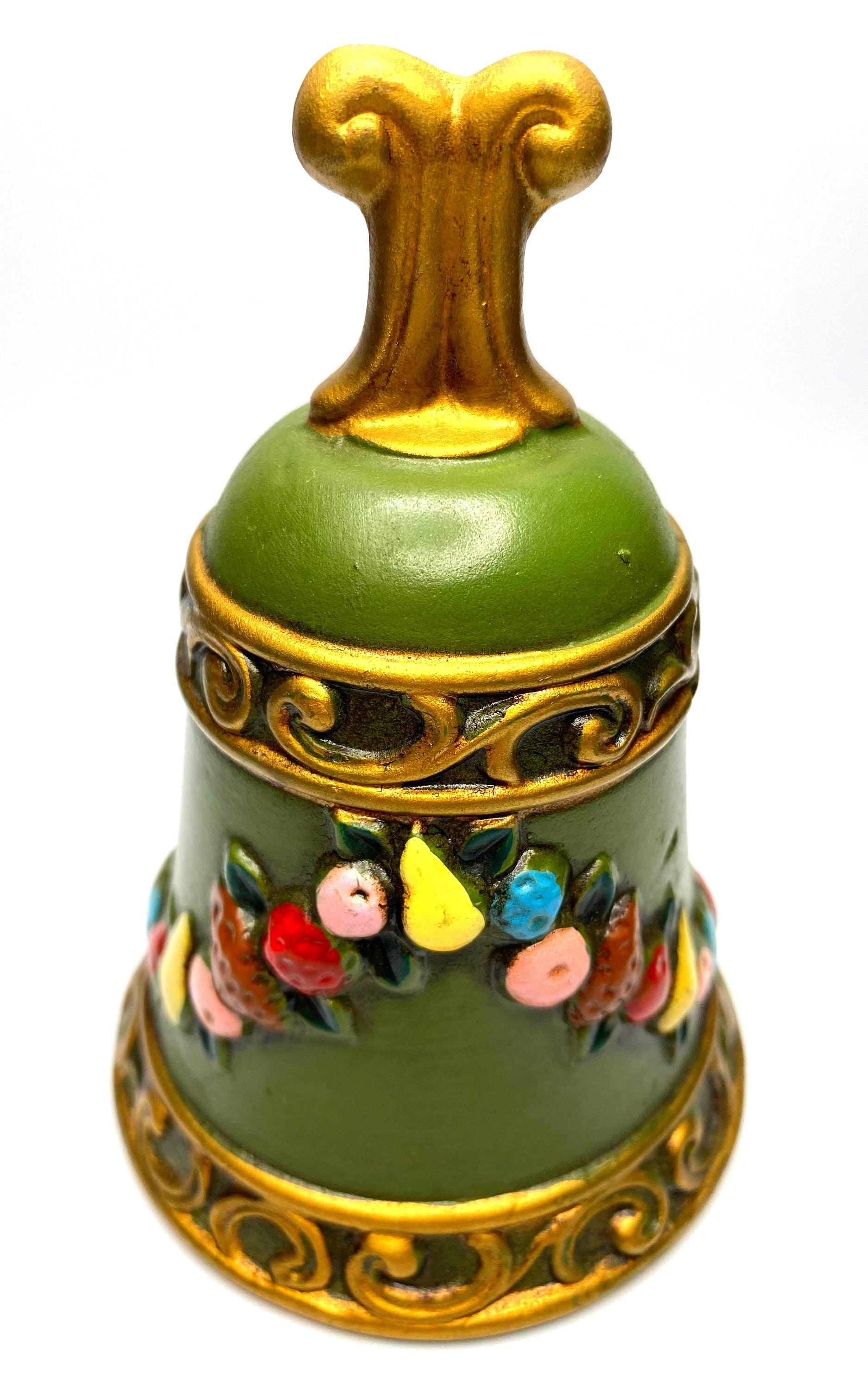 This is a lovely vintage matte finish bell decorated with fruit. The bell is dark green accented with a string of multi-colored fruit and accented in gold. It has the Napcoware sticker inside the bell and stamped with X-8383. Would be a great accent to your vintage decor and would make a great touch for the Christmas season.