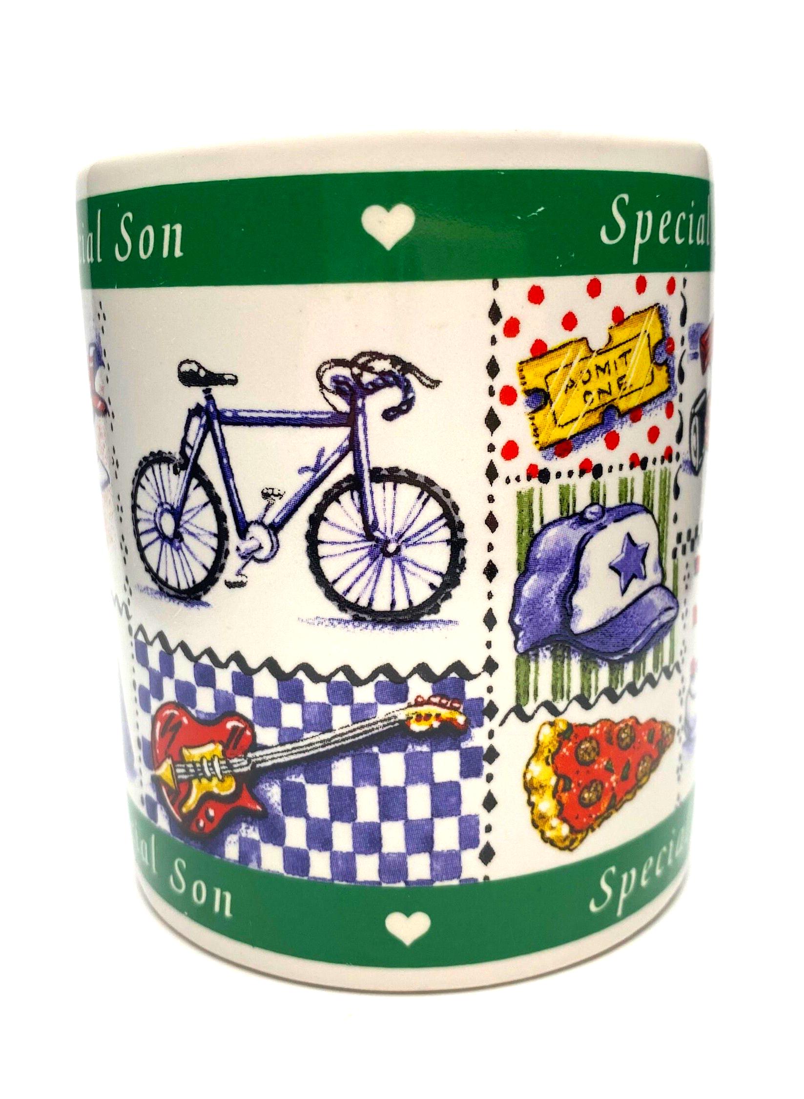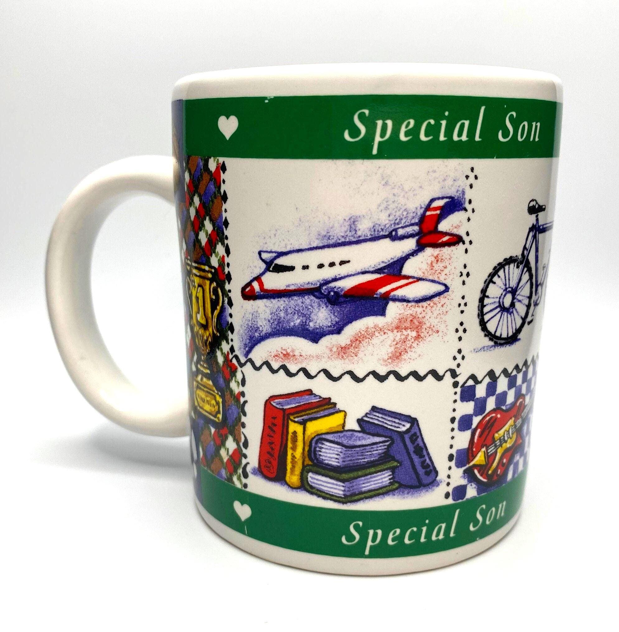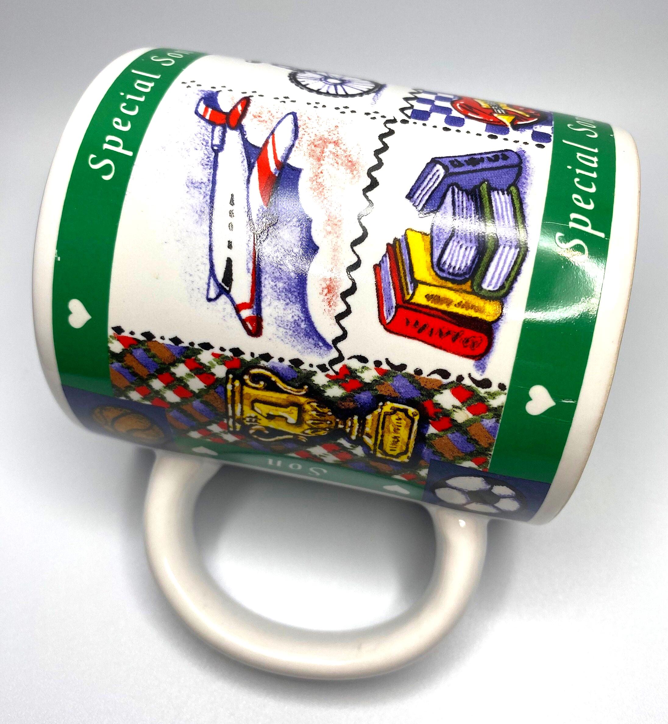 This is an Avon mug that would make a perfect gift for a special son! The mug is decorated with a variety of images, sneakers, pizza, sports car and more. The mug reads, "Special Son" and includes a 3D surprise basketball!