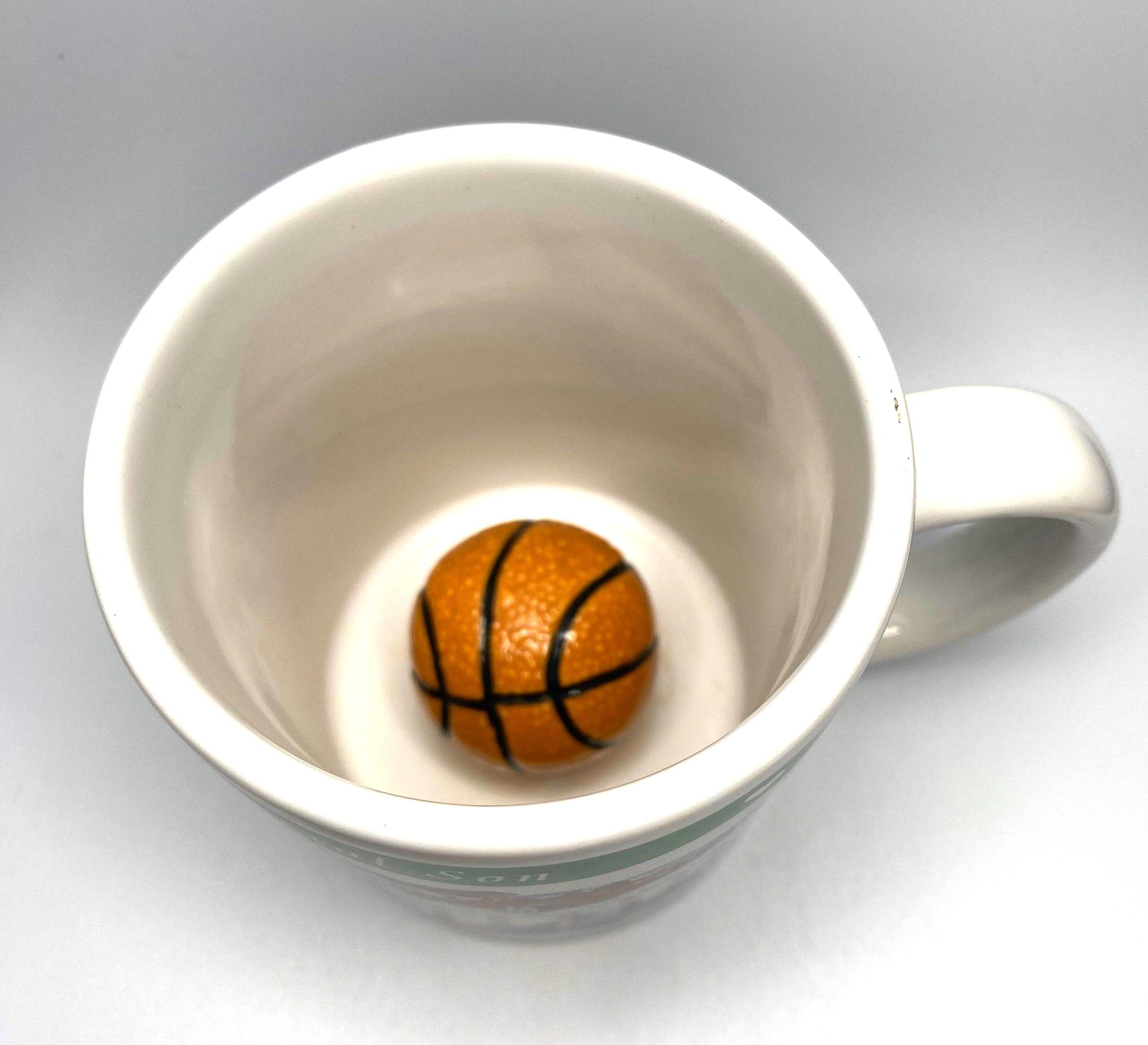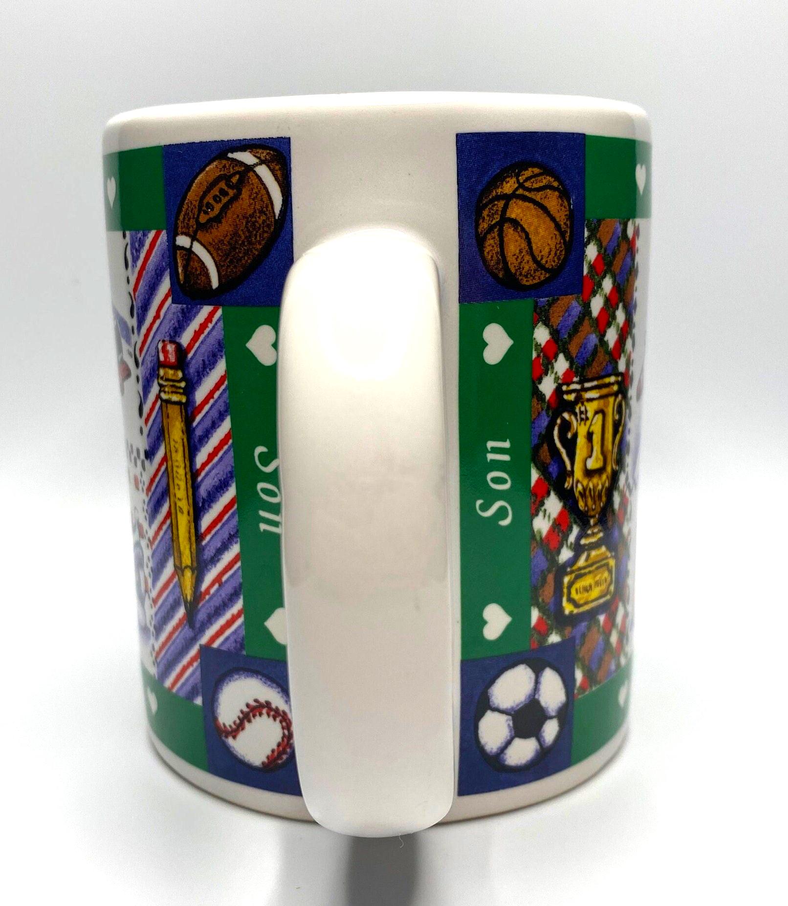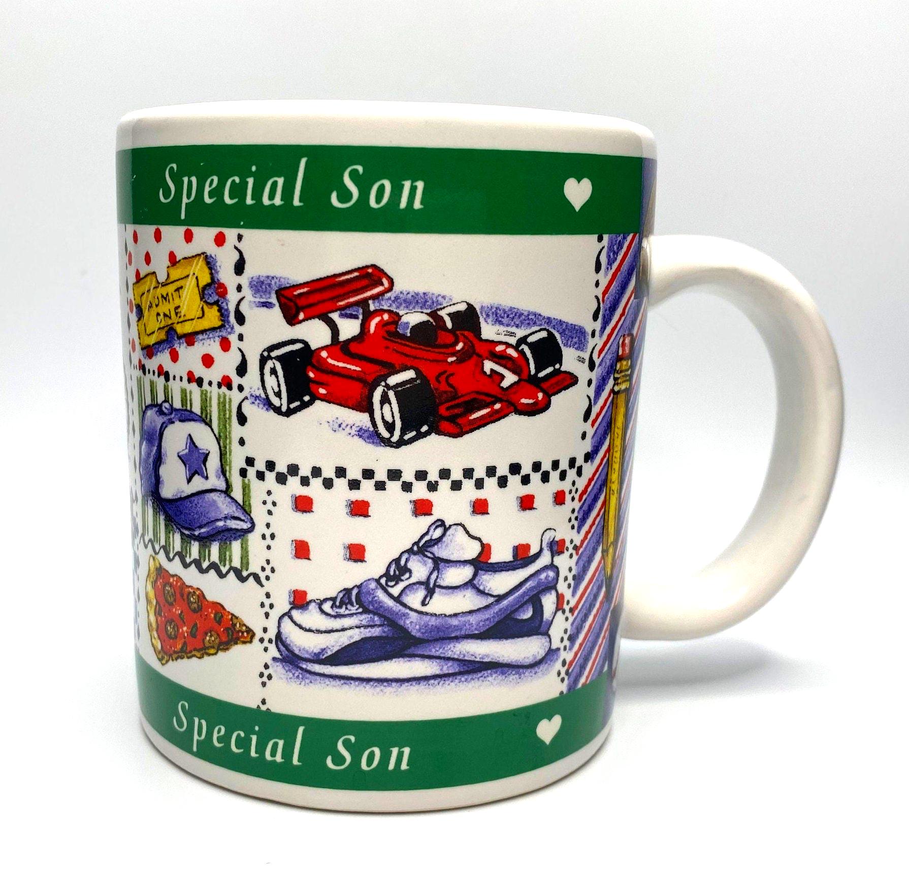 This is an Avon mug that would make a perfect gift for a special son! The mug is decorated with a variety of images, sneakers, pizza, sports car and more. The mug reads, "Special Son" and includes a 3D surprise basketball!
