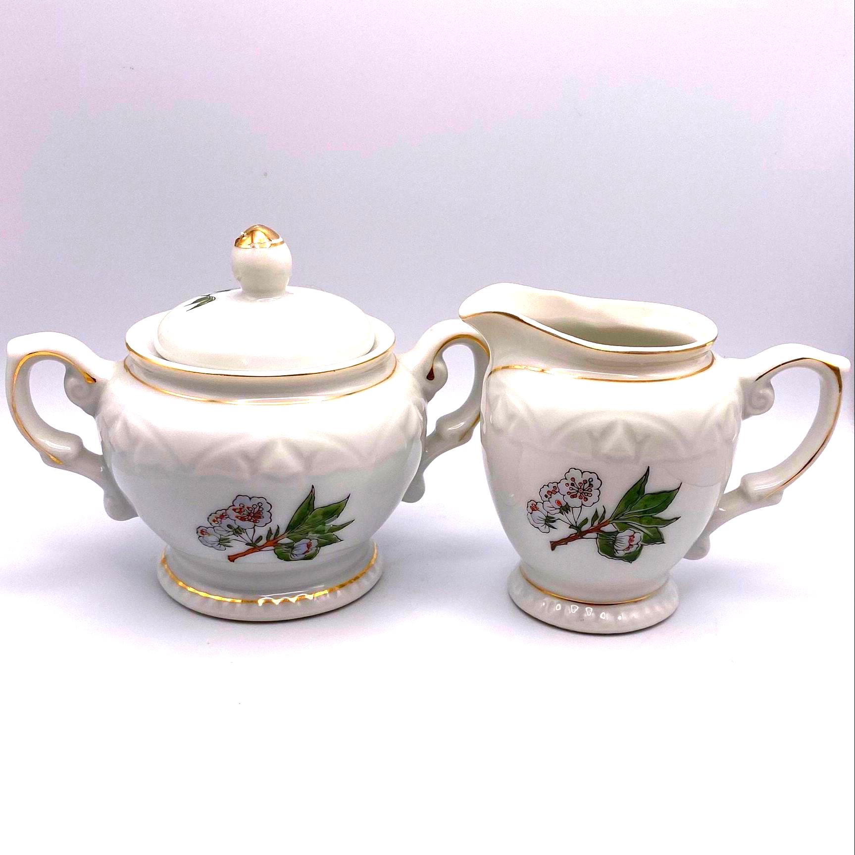 Introducing this beautiful vintage bone china creamer and sugar set, marked EMS Japan with a floral design. This set has a simple floral design with gold trim that adds a touch of elegance to any table setting. Perfect for serving cream and sugar during tea time or adding a touch of vintage charm to your home decor.