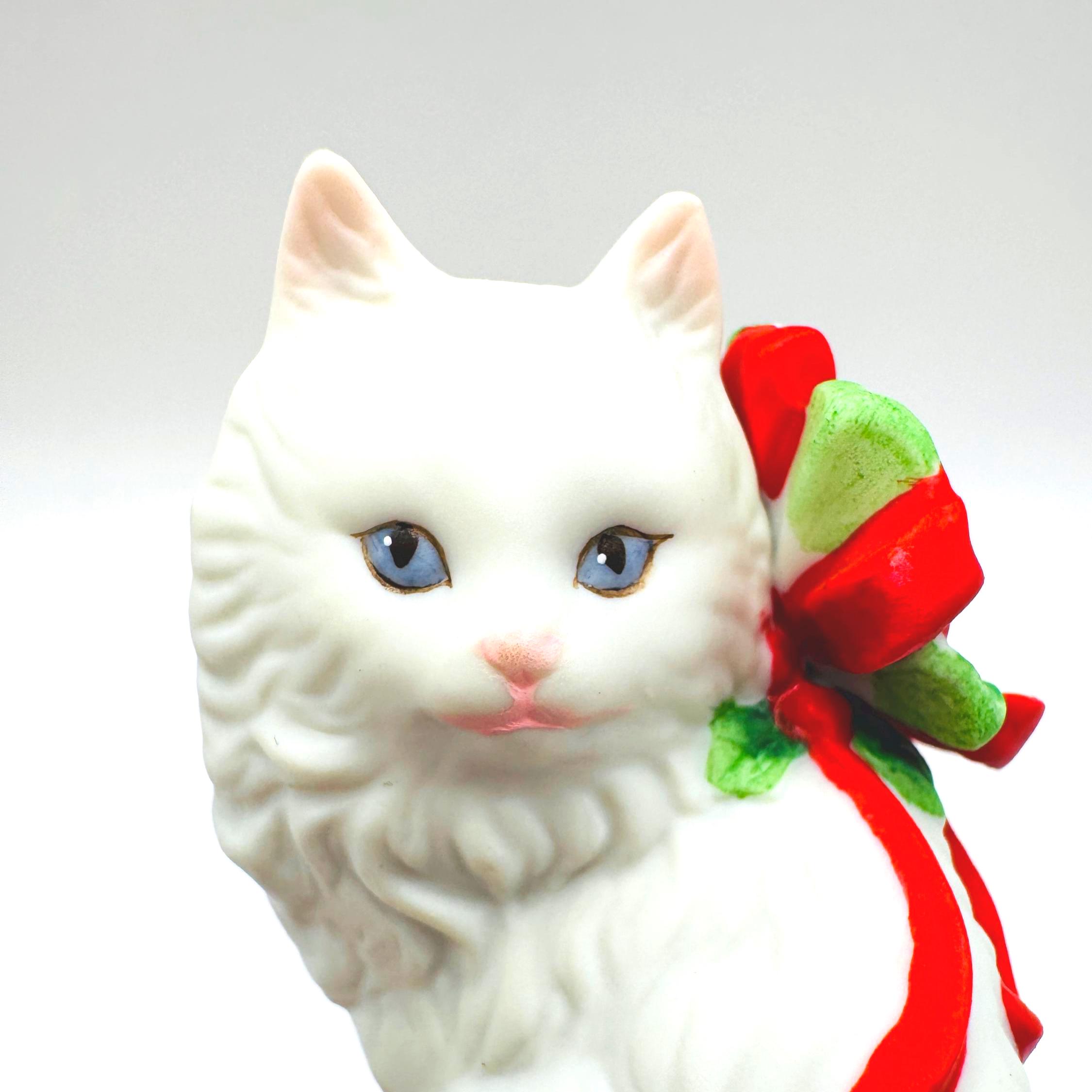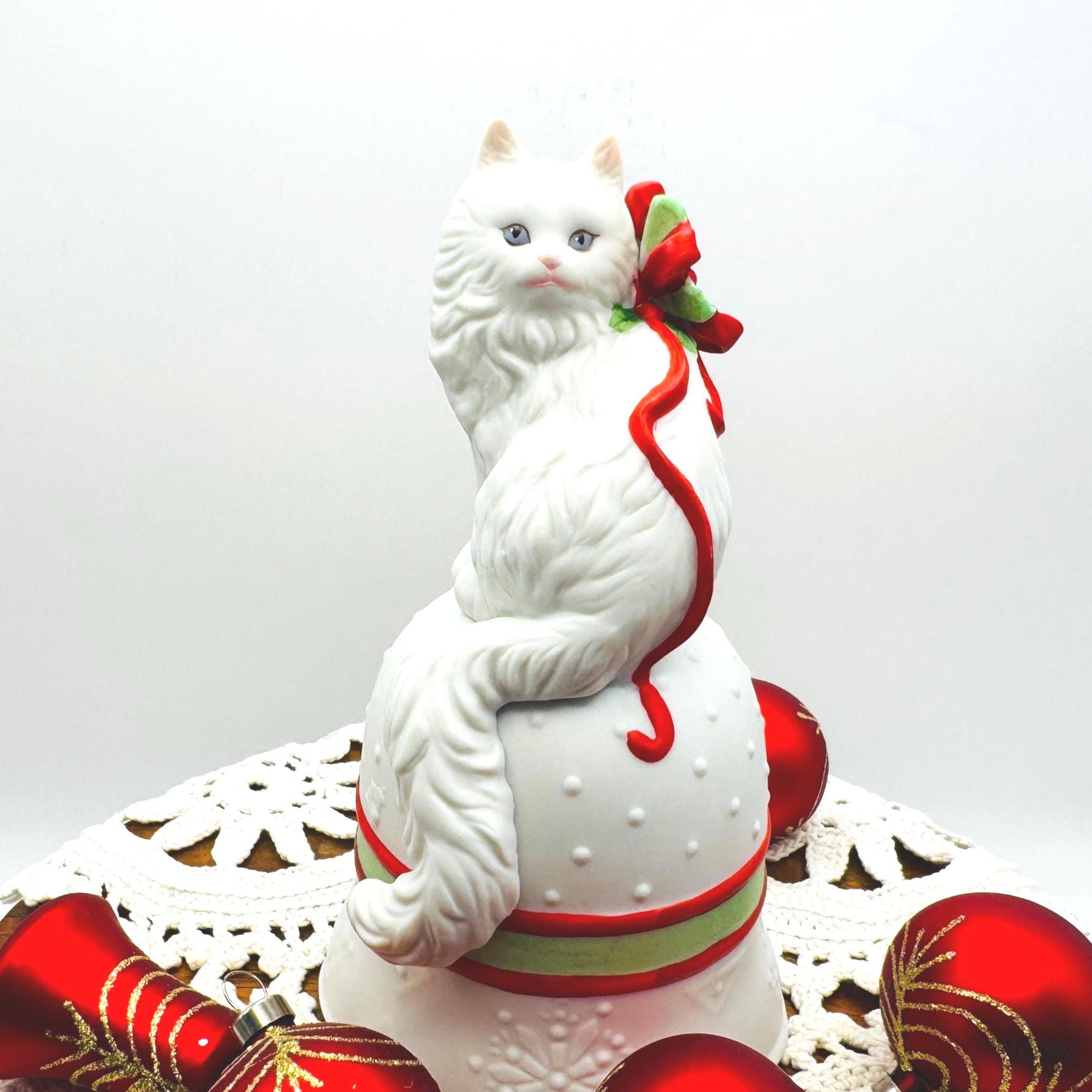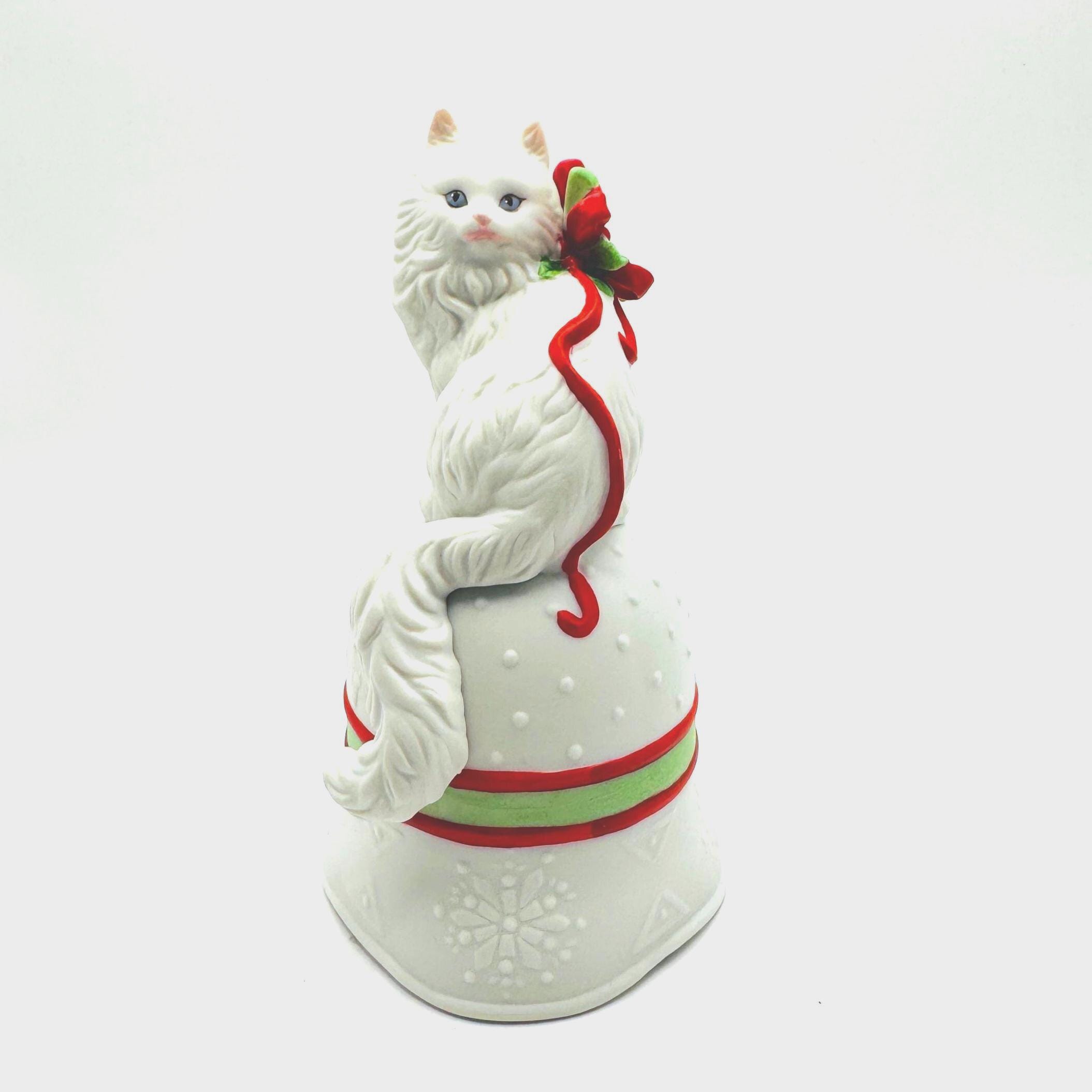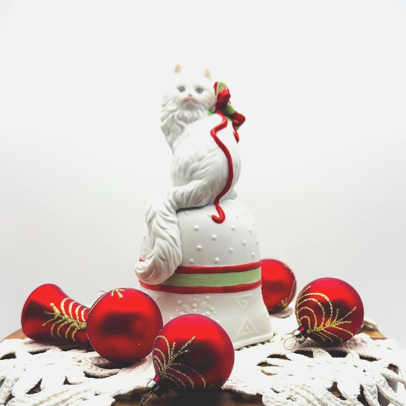Add a touch of vintage charm to your holiday decor with this adorable white cat bell. Complete with a festive holly bow, this cute collectible will bring a festive cheer to your home this Christmas season. Perfect for cat lovers and collectors alike!