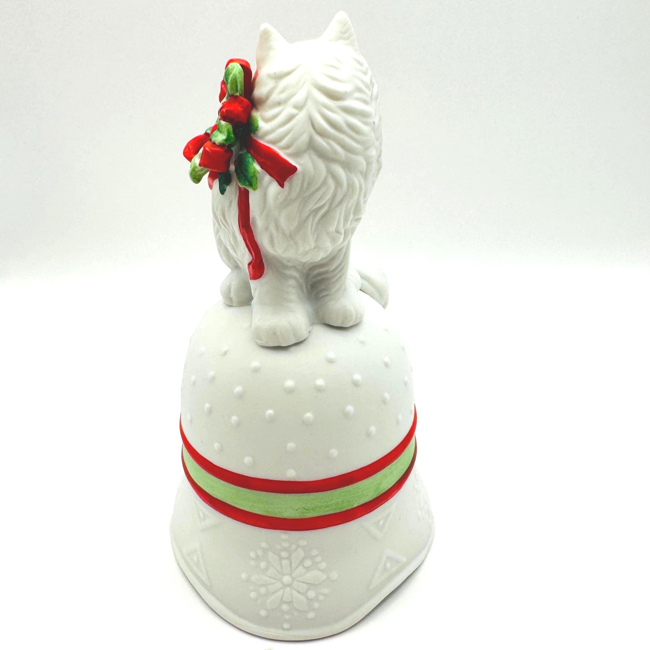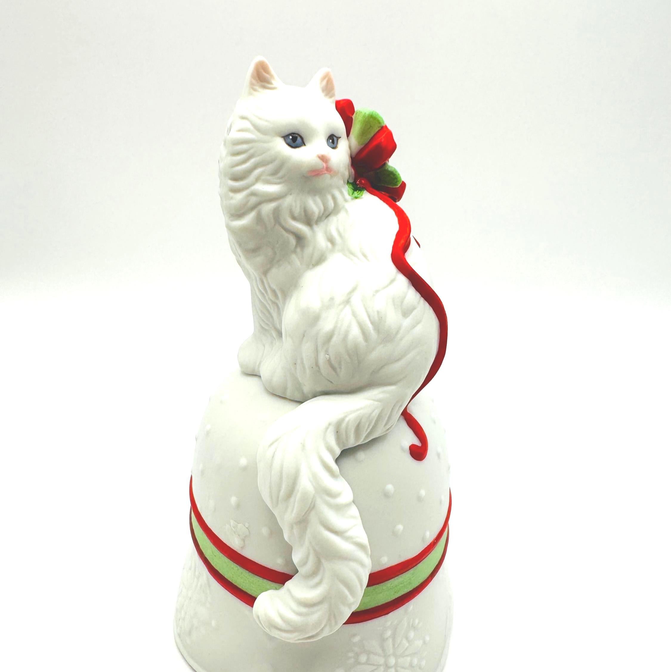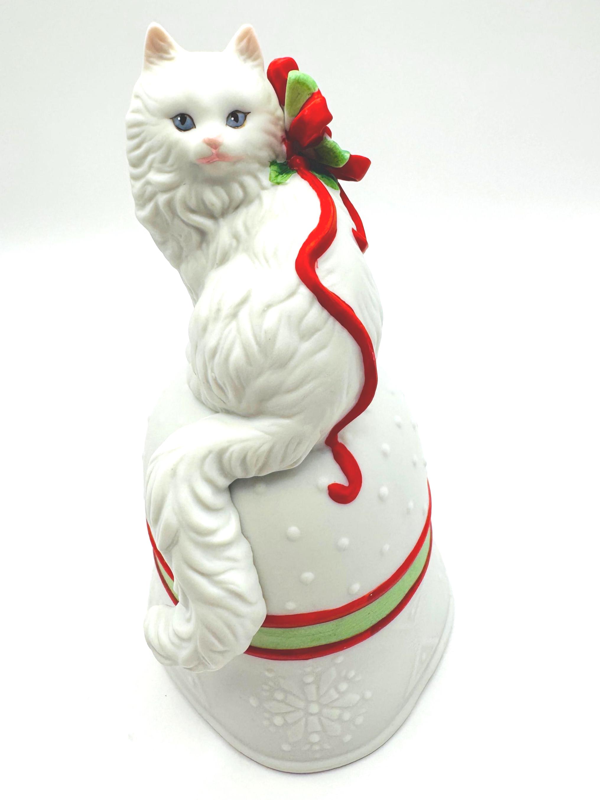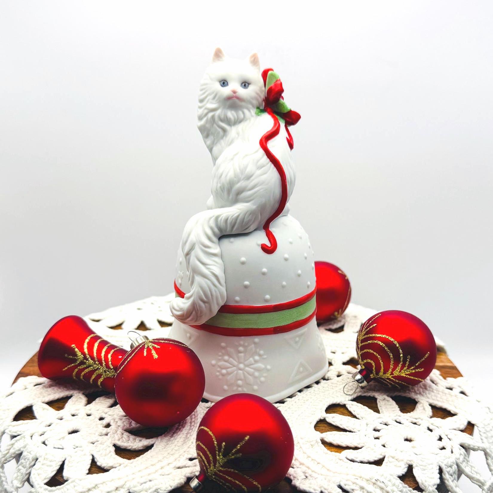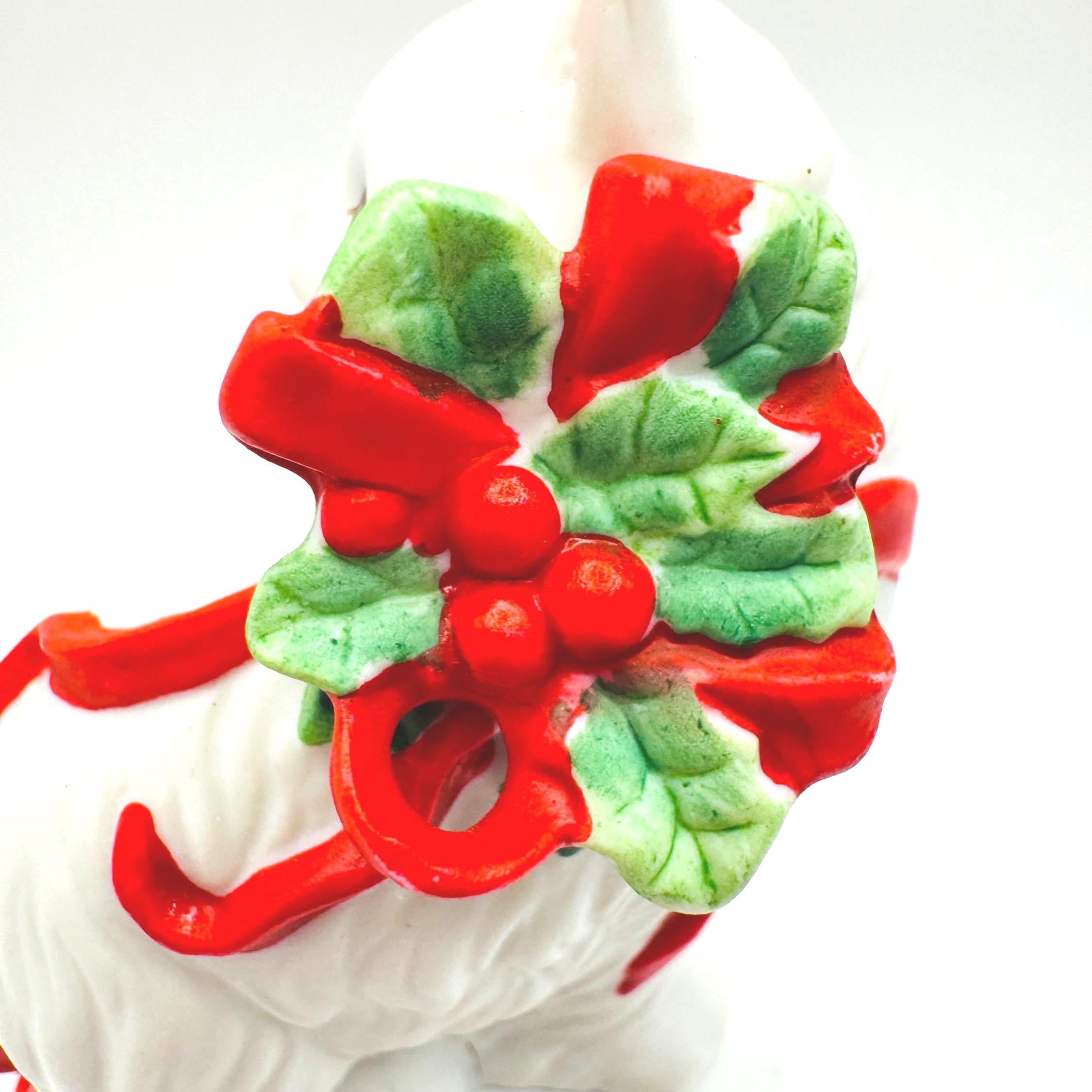Add a touch of vintage charm to your holiday decor with this adorable white cat bell. Complete with a festive holly bow, this cute collectible will bring a festive cheer to your home this Christmas season. Perfect for cat lovers and collectors alike!