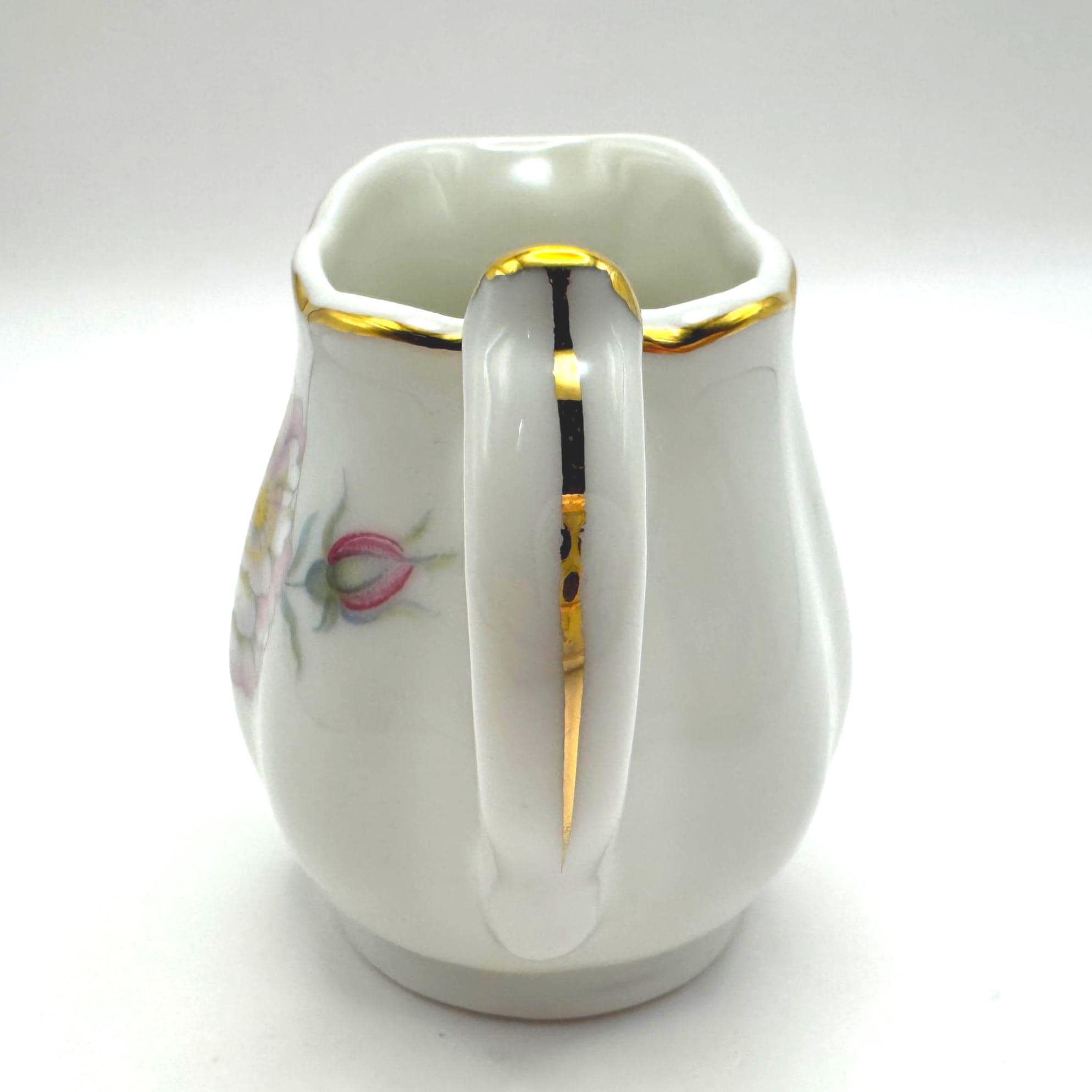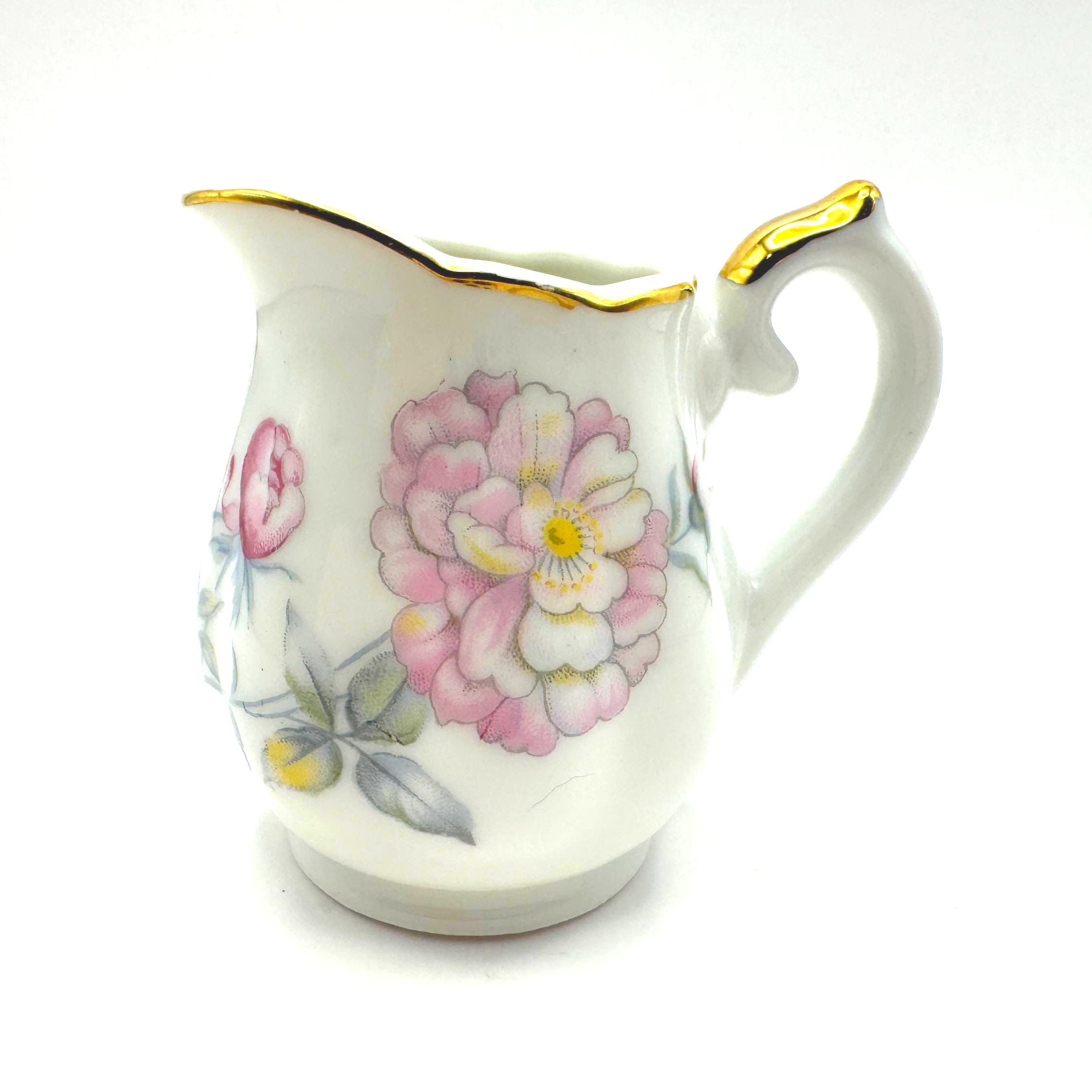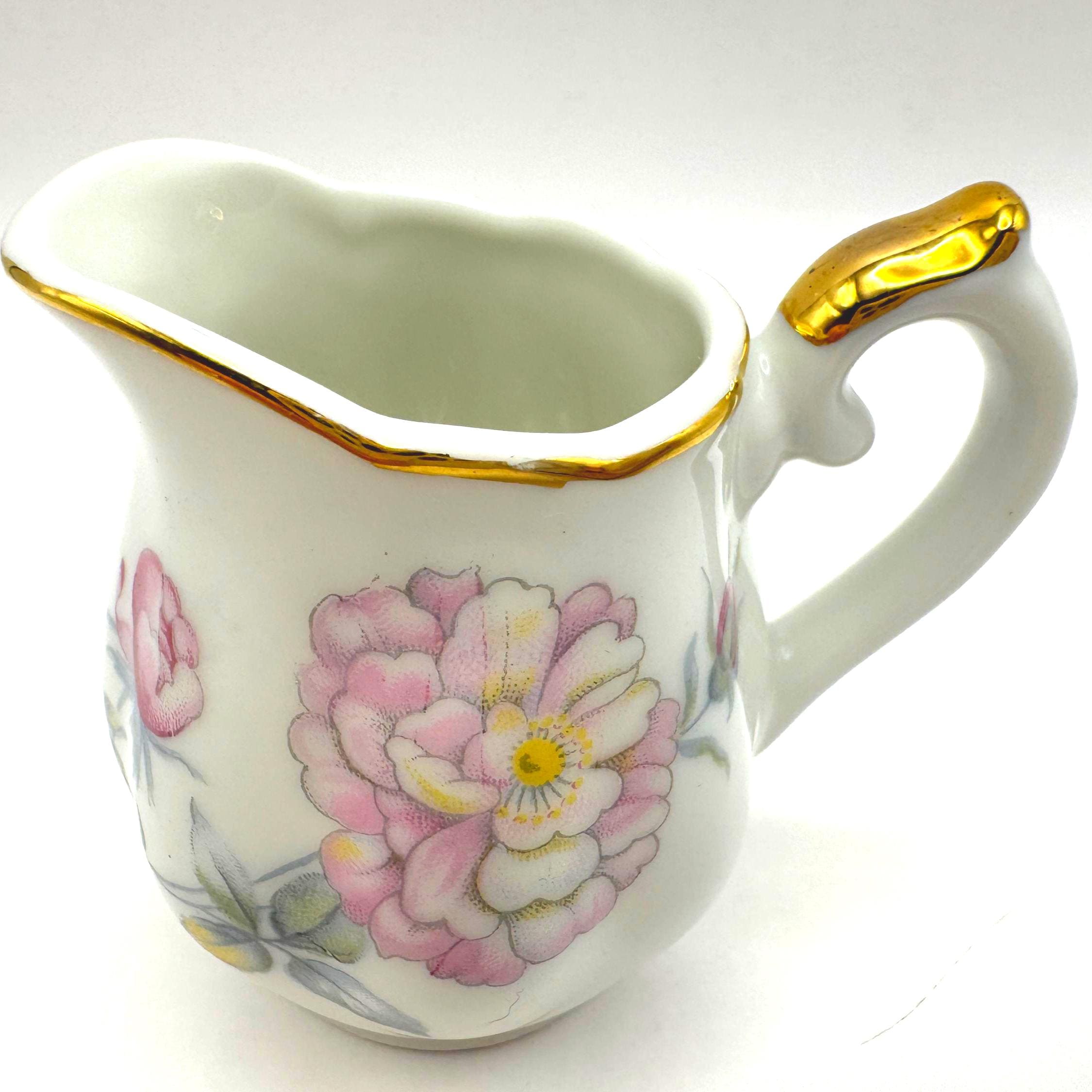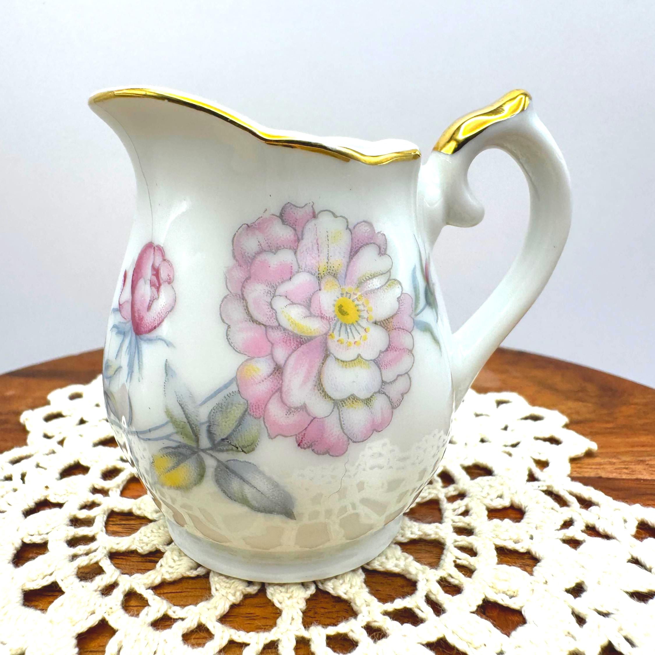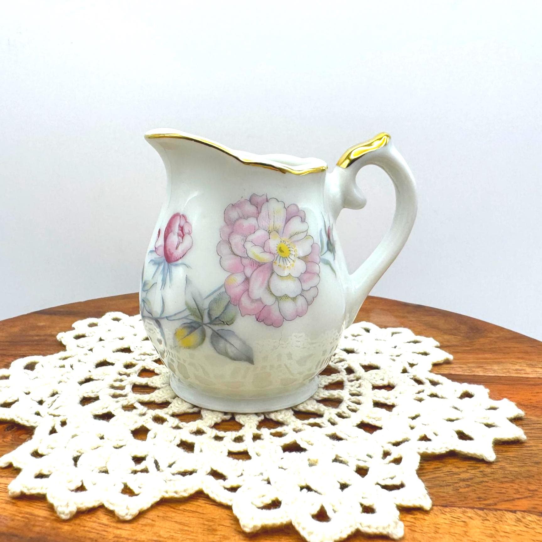 This charming vintage porcelain creamer features a delicate floral design in soft pinks, yellows, and greens, finished with hand applied gold trim on the rim and handle. it's classic bulbous shape and scalloped top edge make it perfect as a small table creamer or as a decorative collectible in your china cabinet. (no maker's mark)