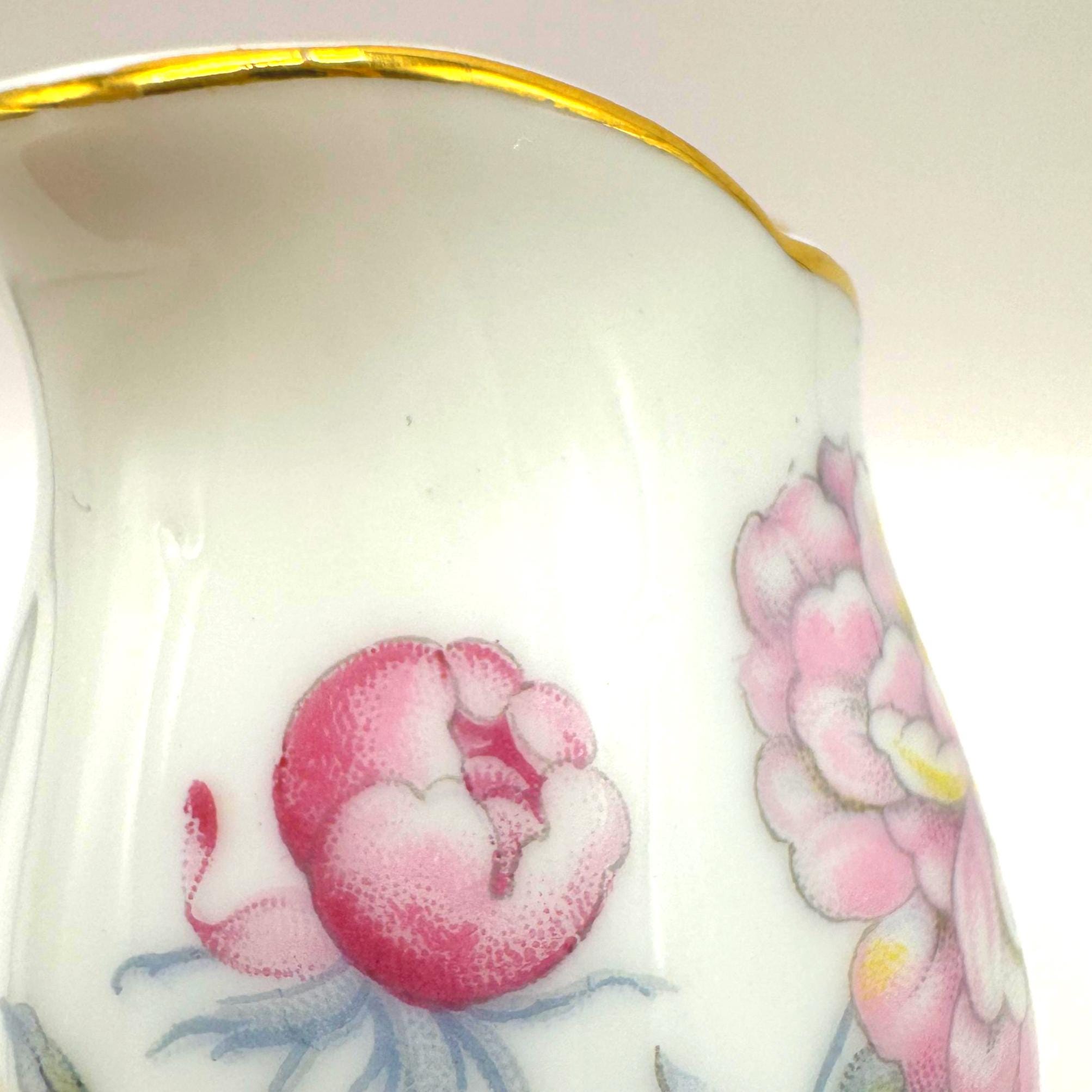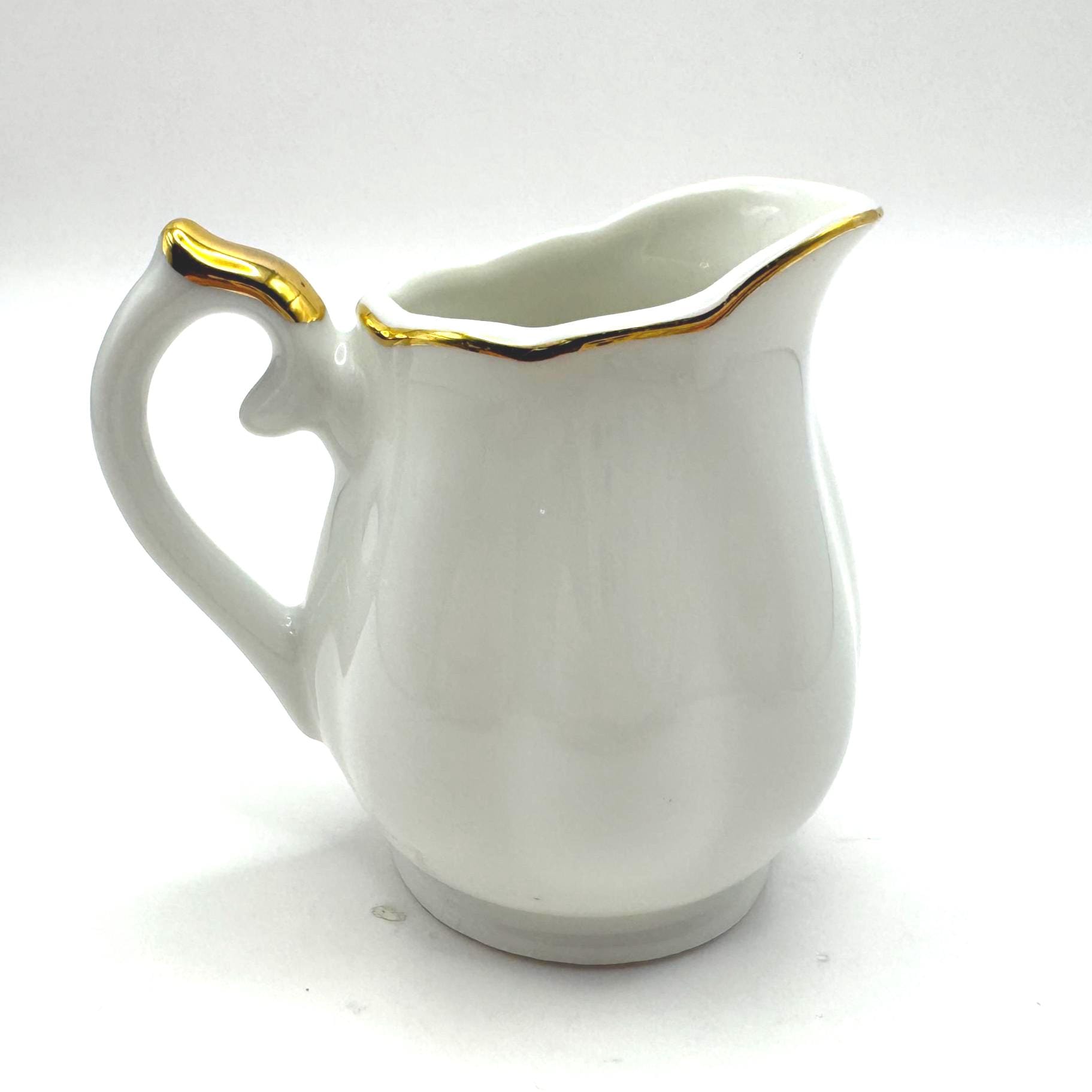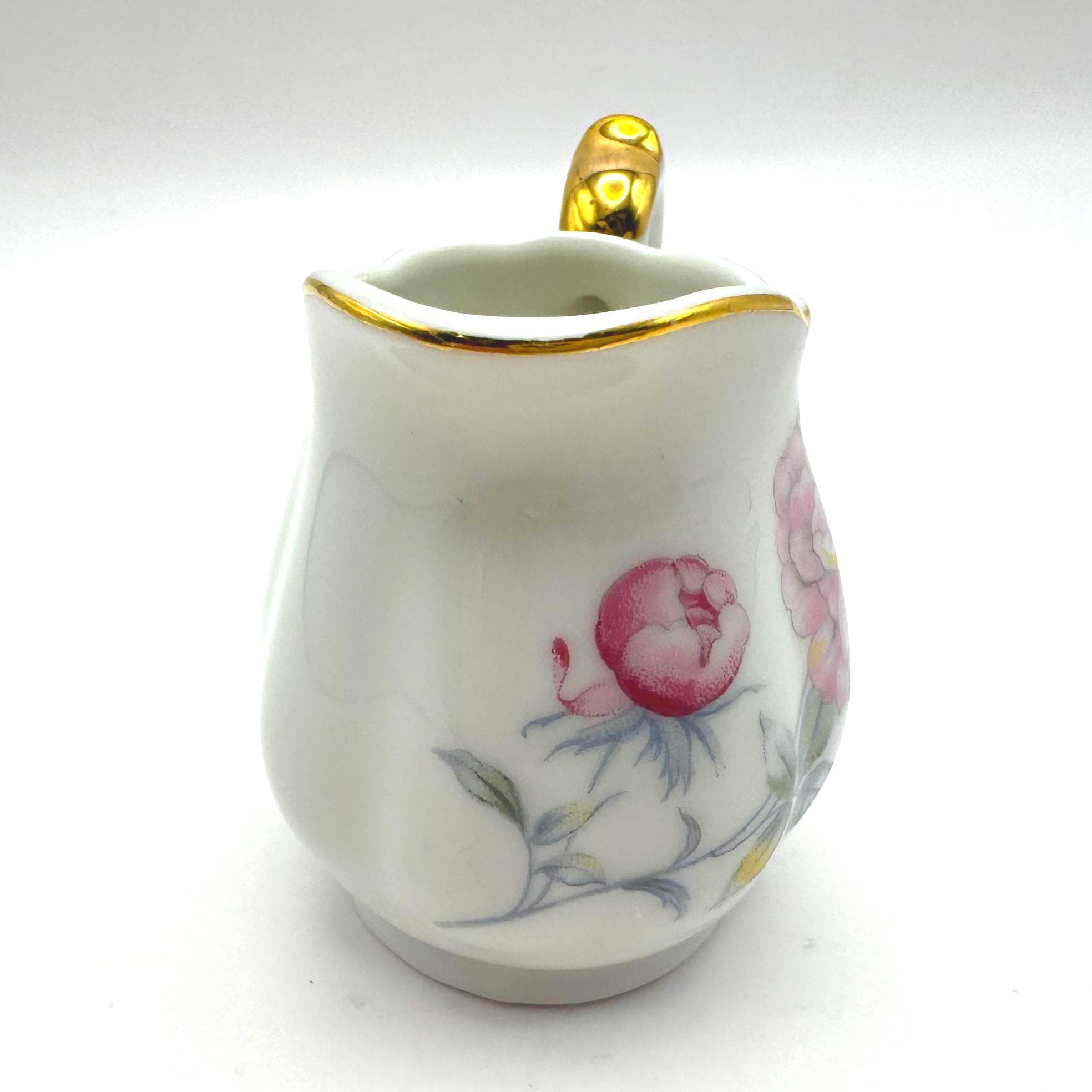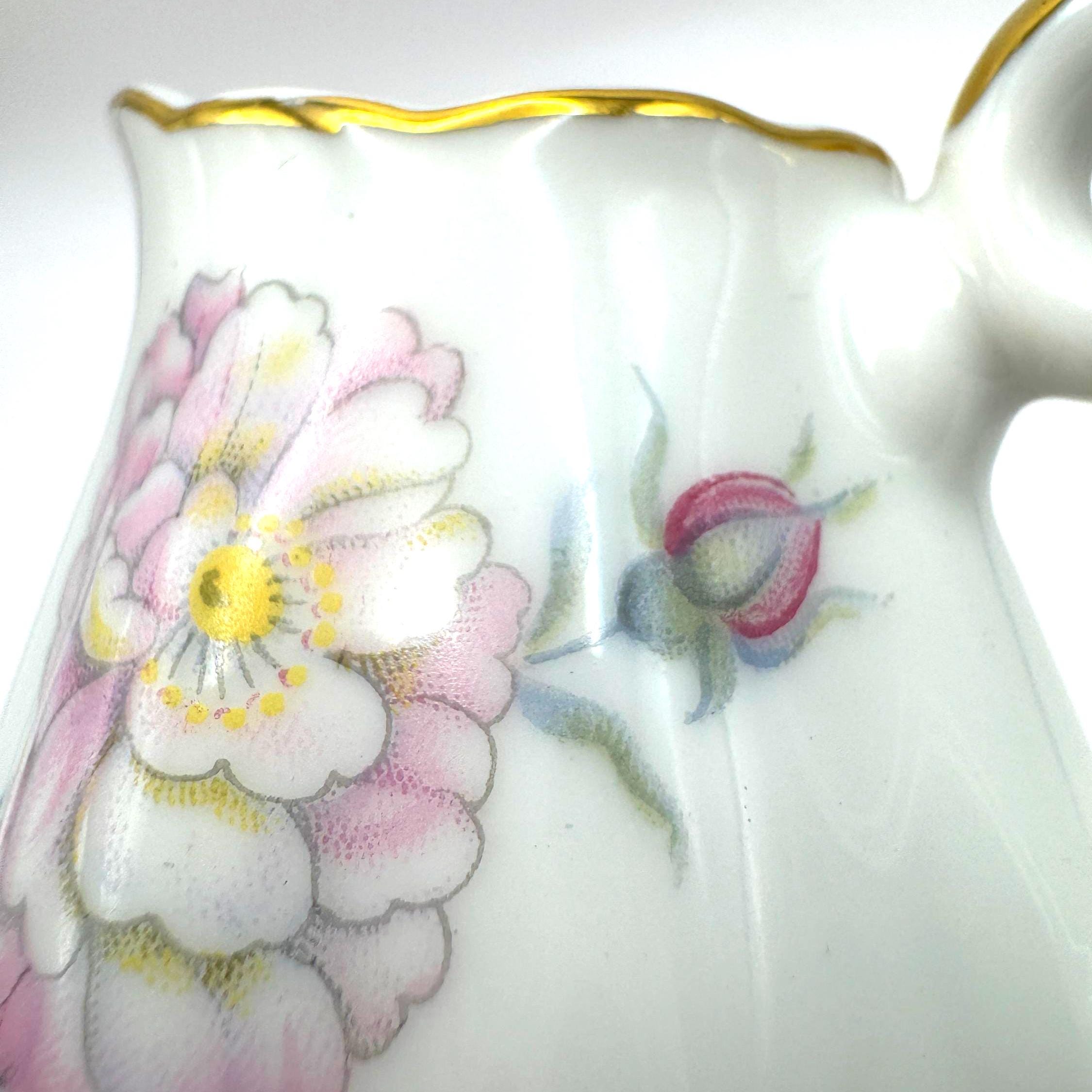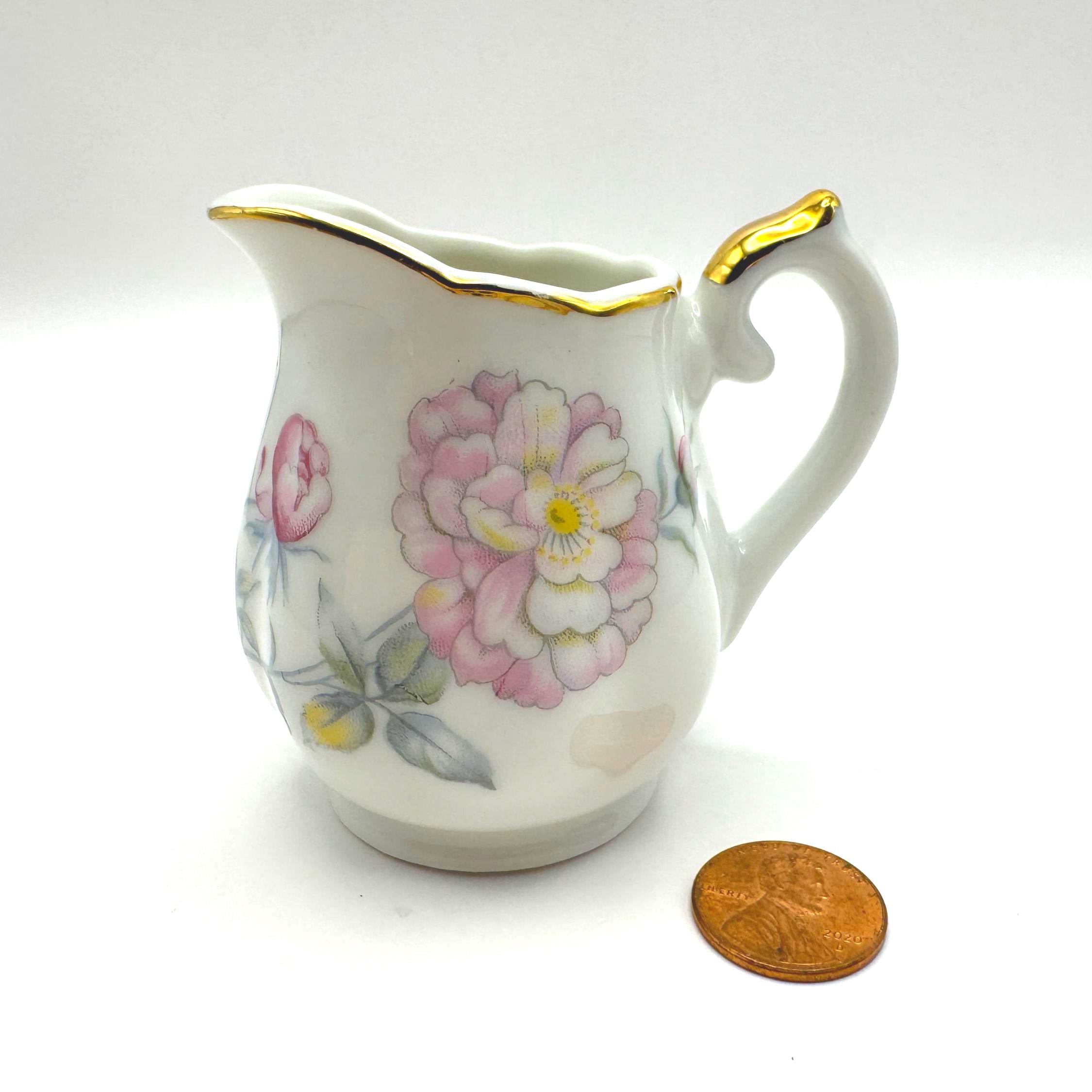 This charming vintage porcelain creamer features a delicate floral design in soft pinks, yellows, and greens, finished with hand applied gold trim on the rim and handle. it's classic bulbous shape and scalloped top edge make it perfect as a small table creamer or as a decorative collectible in your china cabinet. (no maker's mark)
