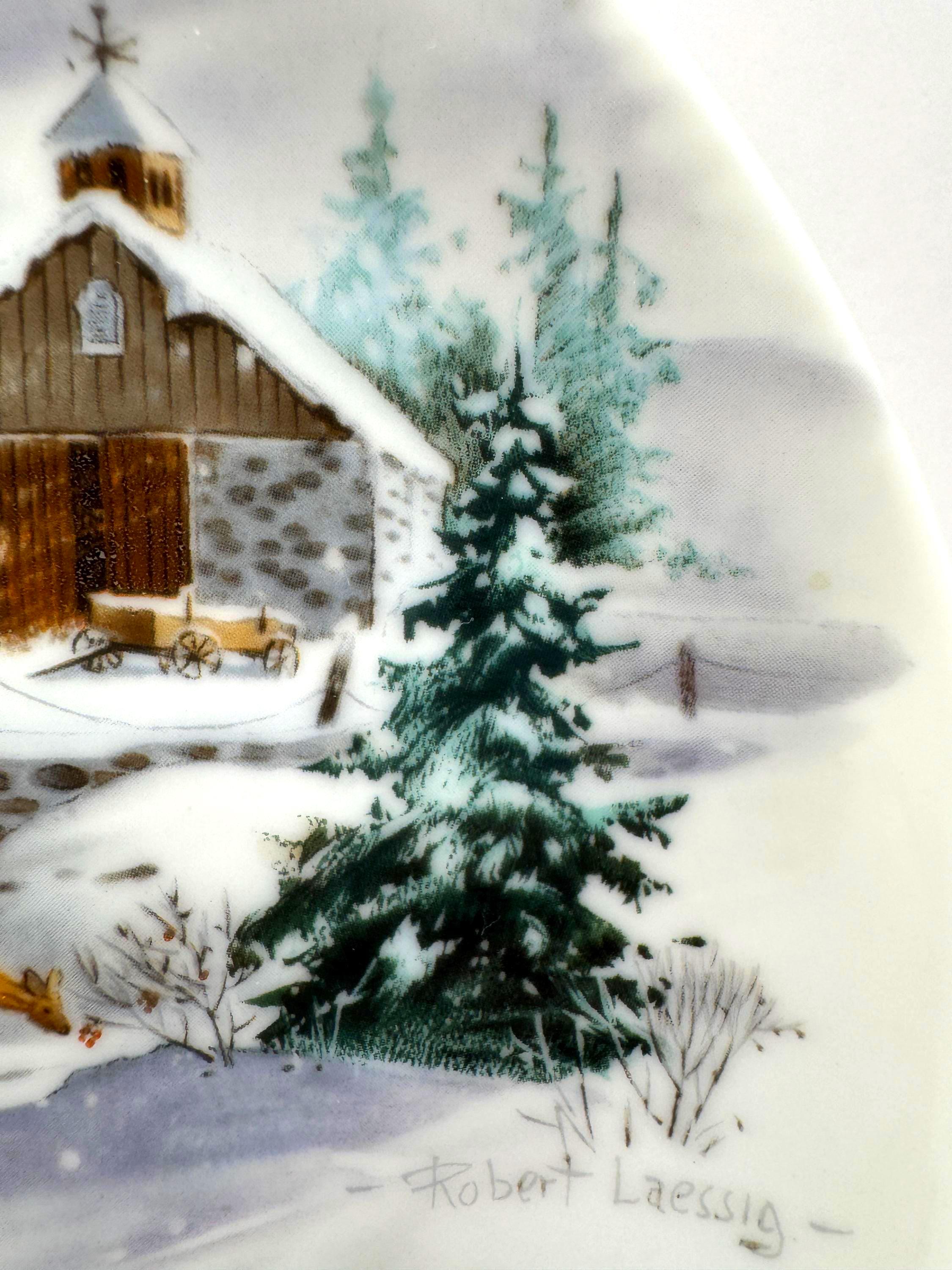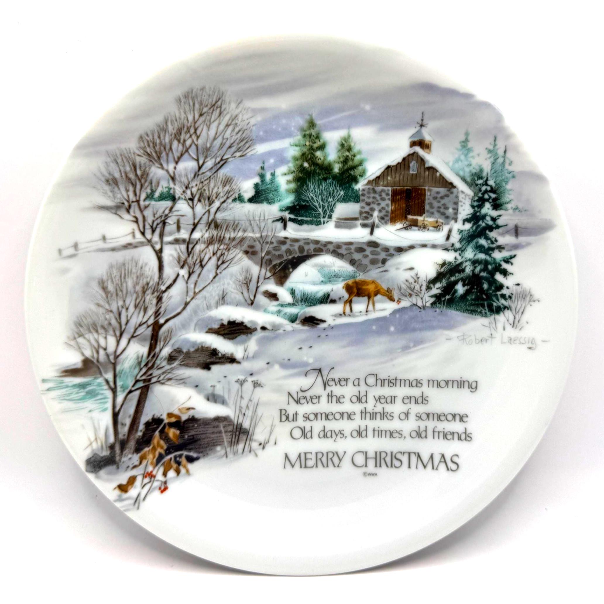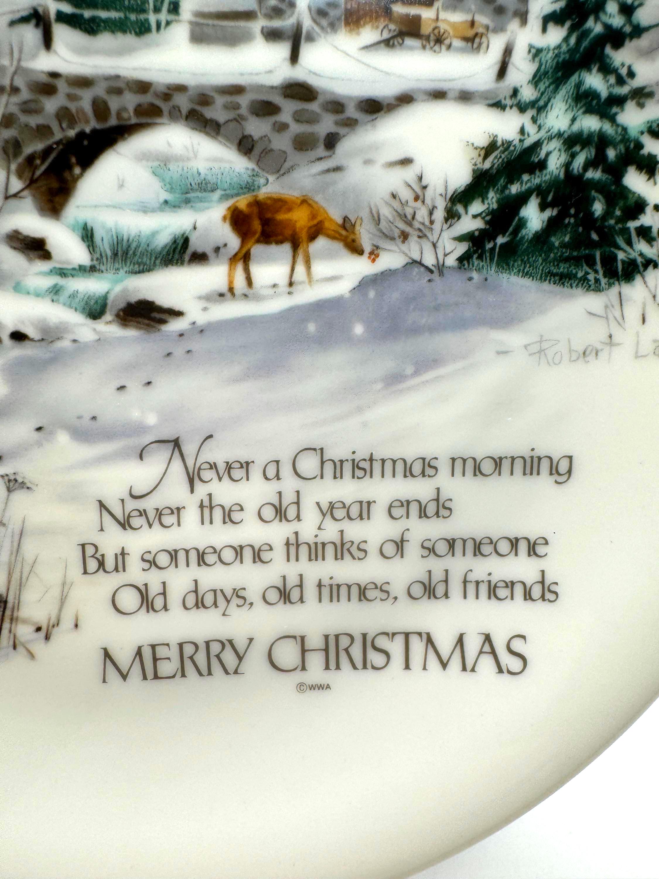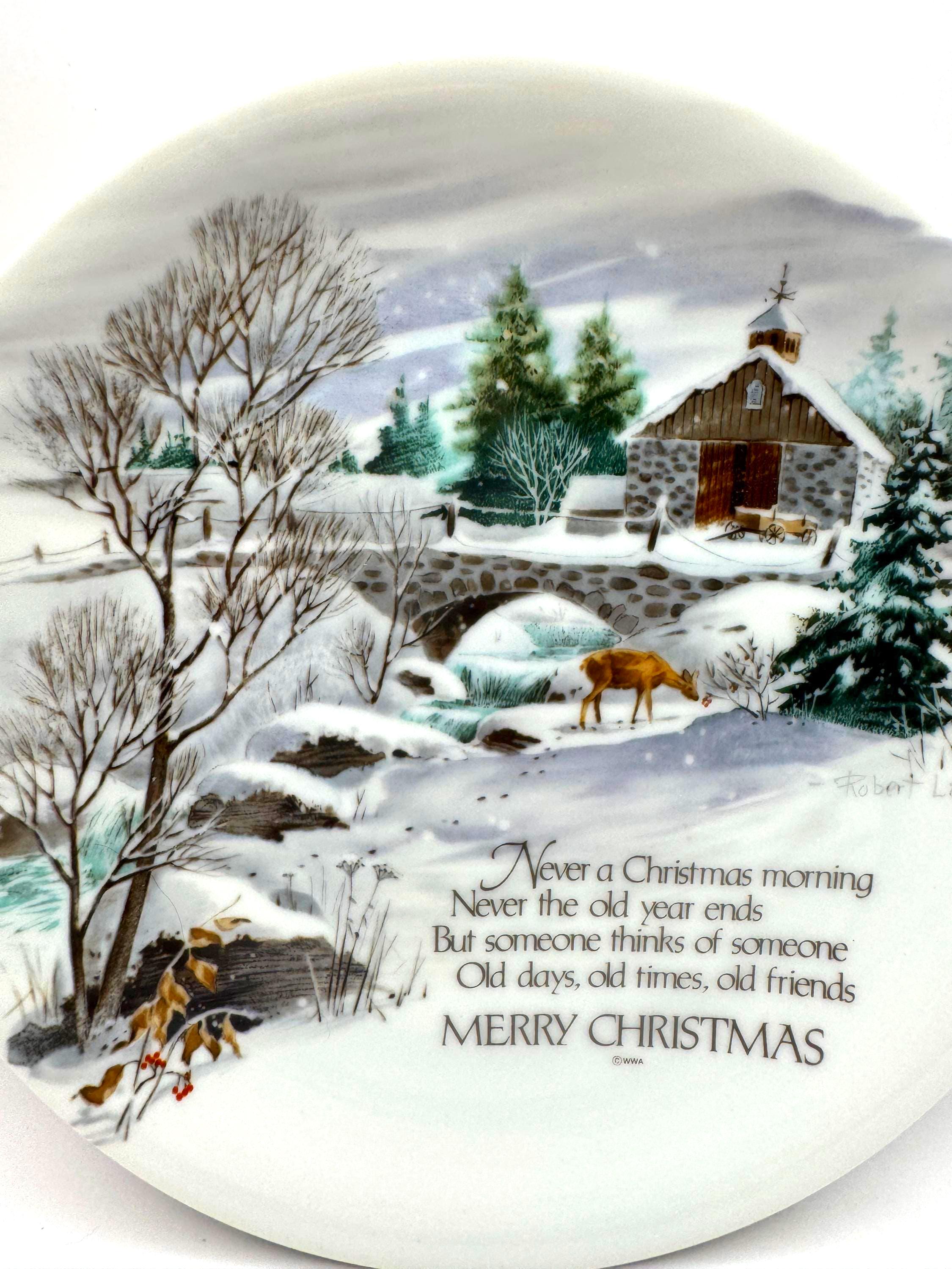 Bring a touch of peaceful nostalgia to your holiday decor with this beautiful Robert Laessig "Never a Christmas morning" collector plate, part of the Winterscene Series II by WWA (World Wide Art Studios). Produced in Japan, this fine porcelain plate captures the quiet beauty of a snowy Christmas morning and the timeless warmth of friendship.