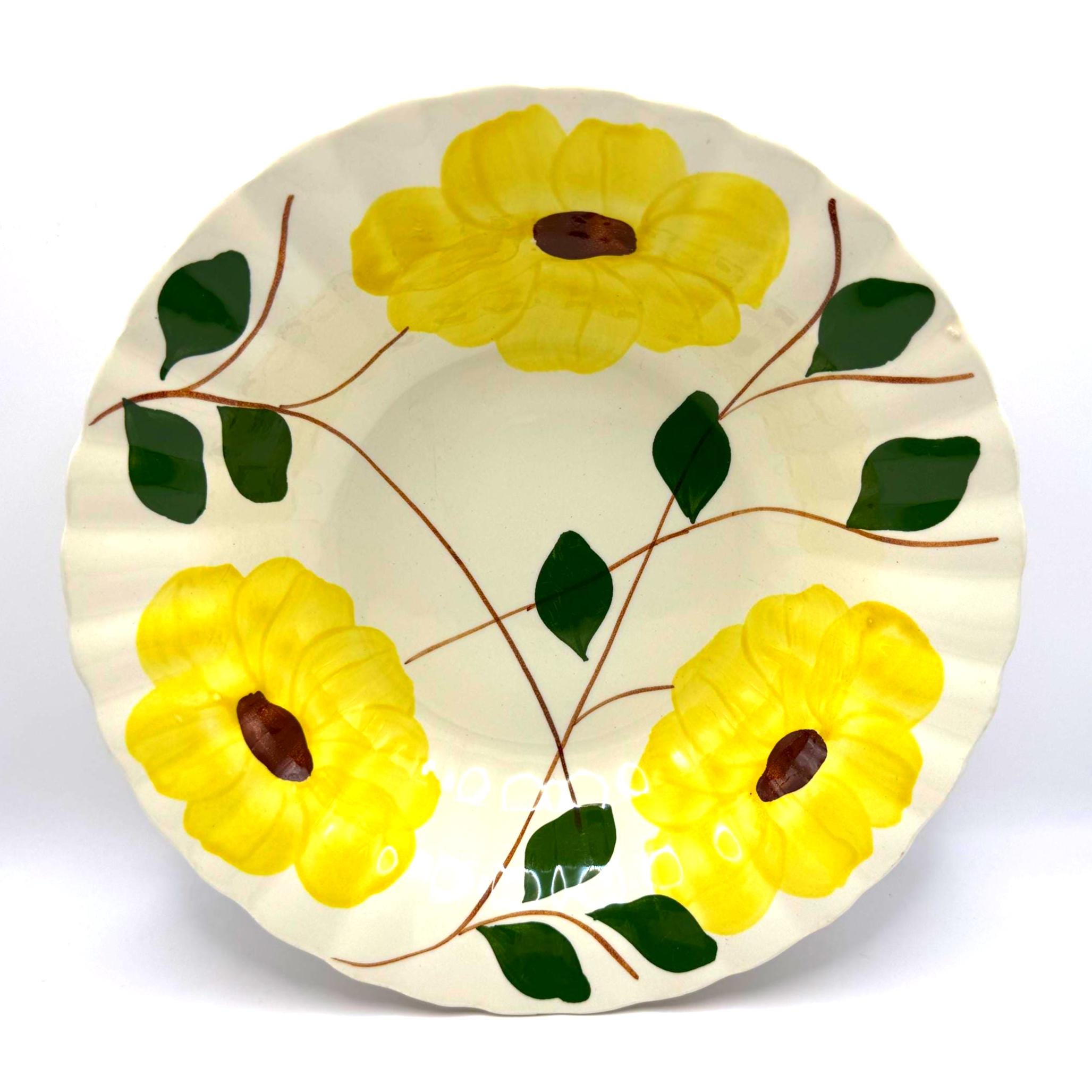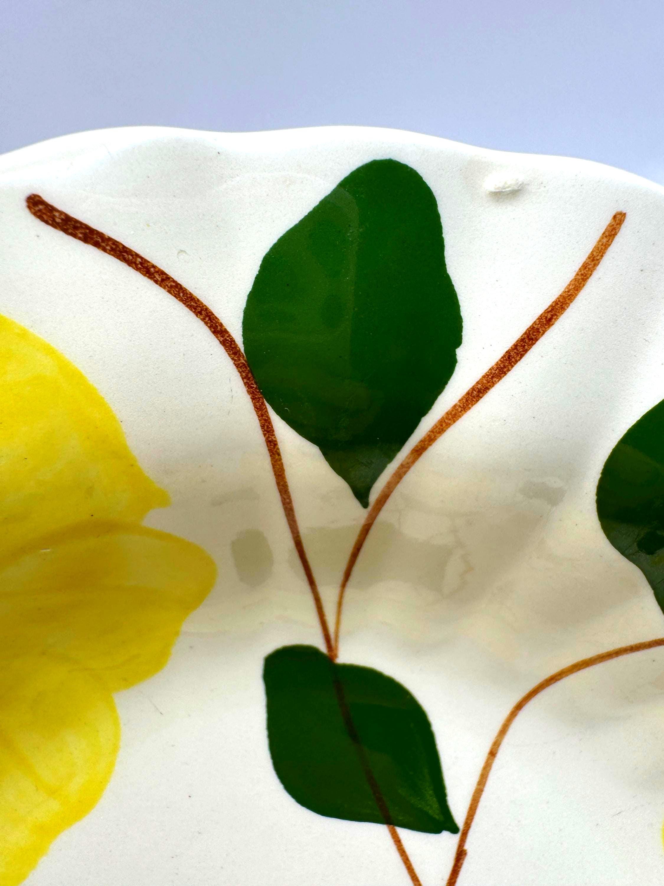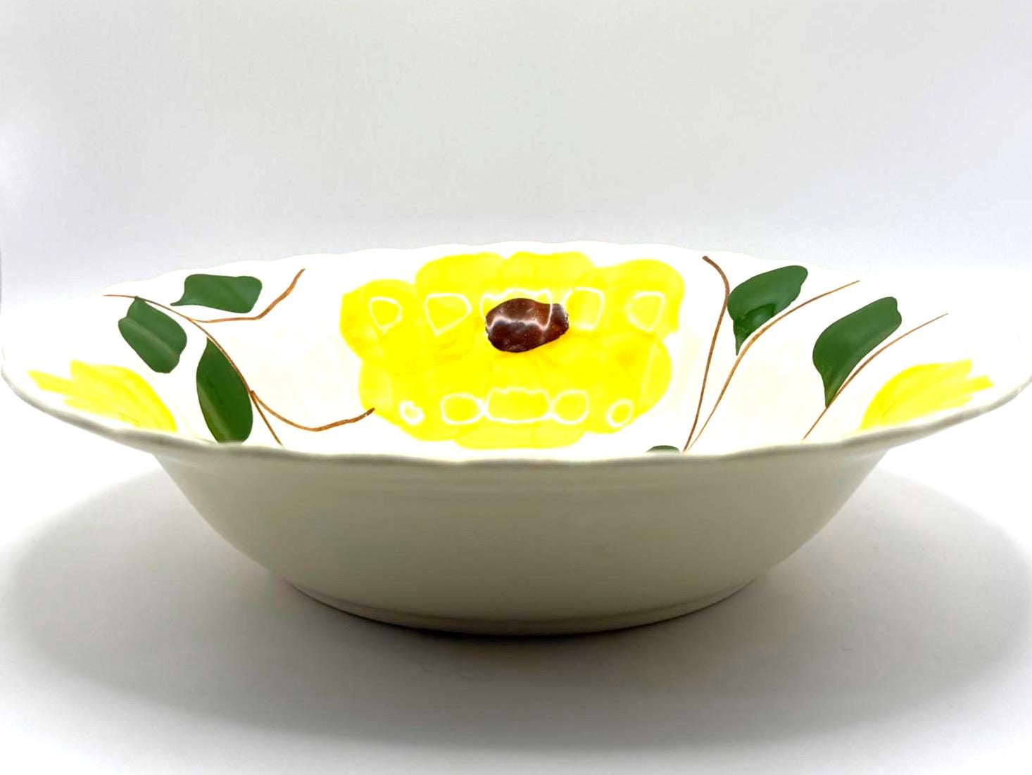 Vintage Blue Ridge Southern Potteries serving bowl featuring the cheerful yellow 'Noonday' hand-painted floral pattern. This hand decorated pieces showcases three bright yellow blooms with green leaves and brown stems on creamy white base. Made in the USA, hand-painted underglaze with the signature wavy edge design Blue Ridge is loved for.