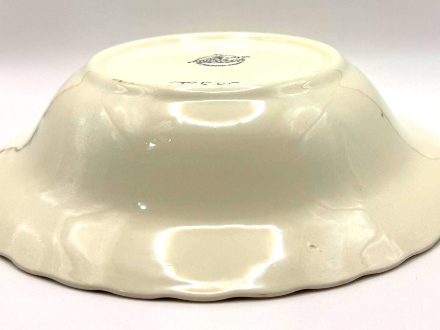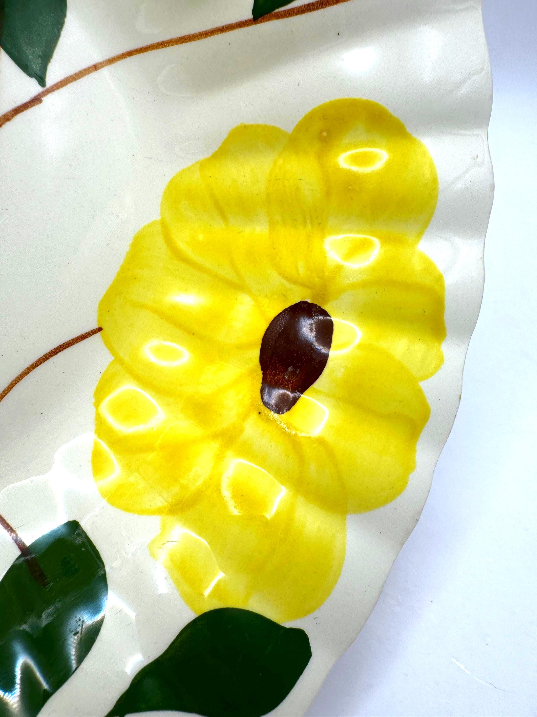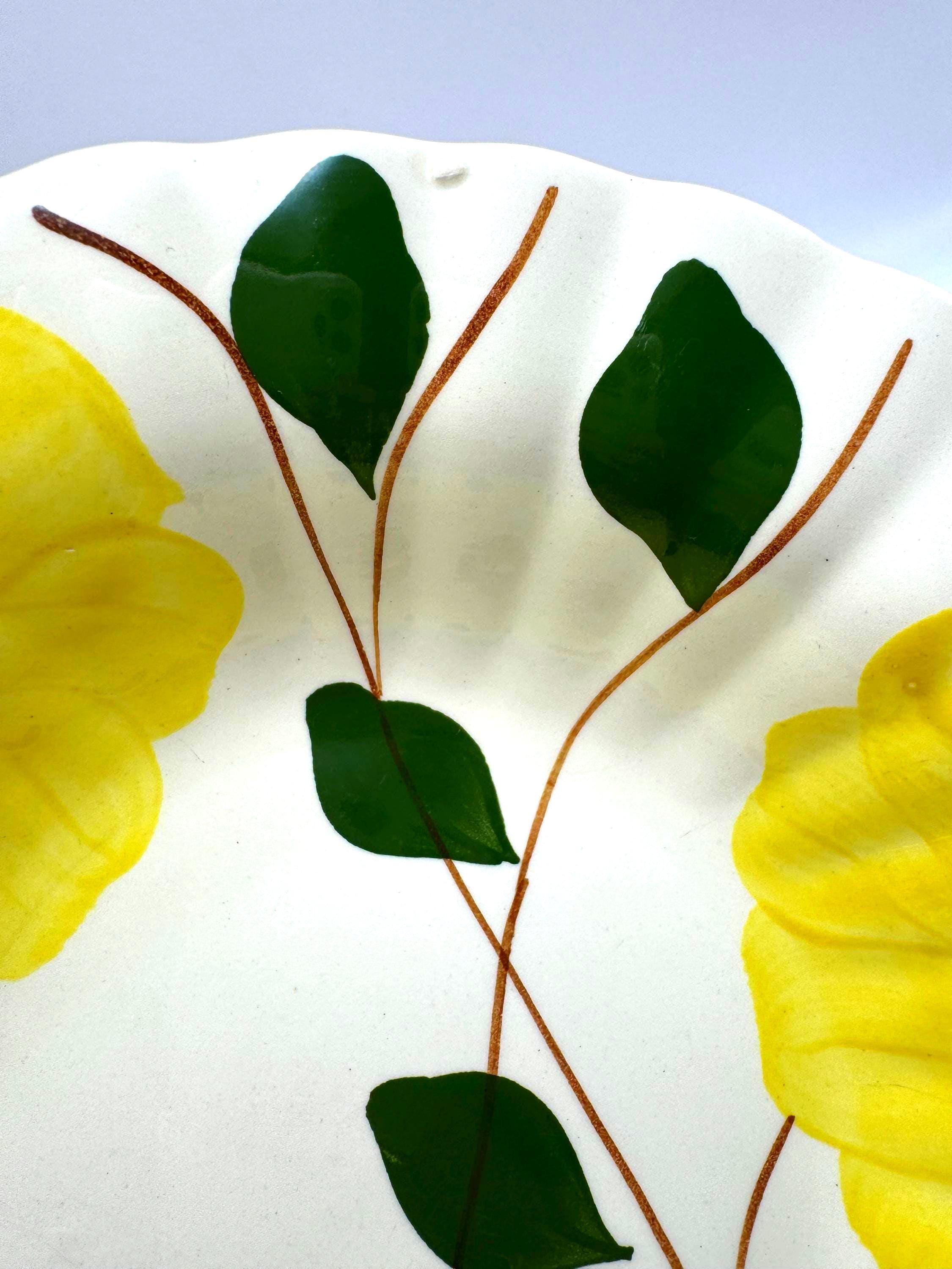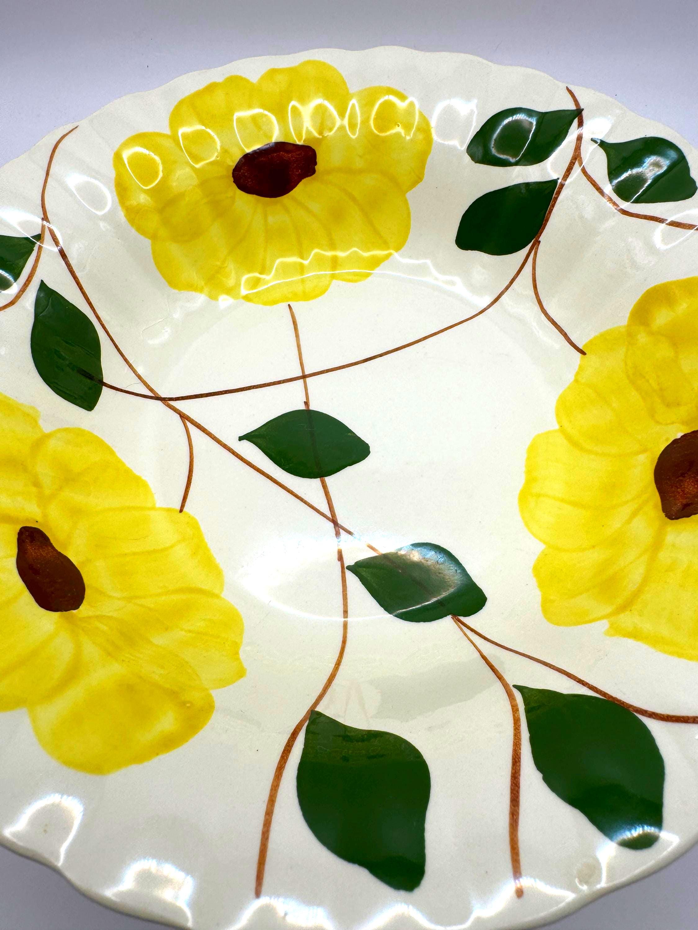 Vintage Blue Ridge Southern Potteries serving bowl featuring the cheerful yellow 'Noonday' hand-painted floral pattern. This hand decorated pieces showcases three bright yellow blooms with green leaves and brown stems on creamy white base. Made in the USA, hand-painted underglaze with the signature wavy edge design Blue Ridge is loved for.