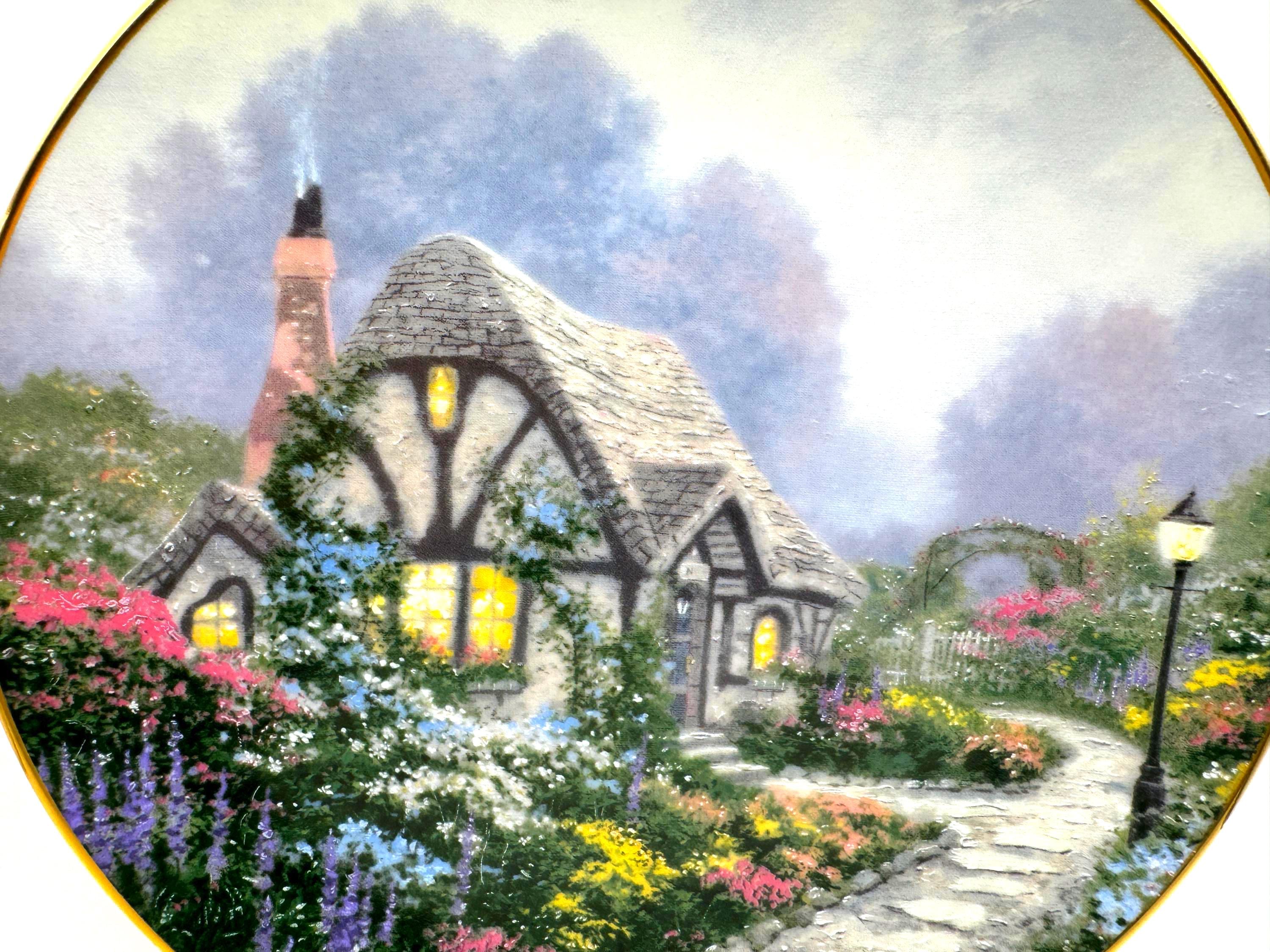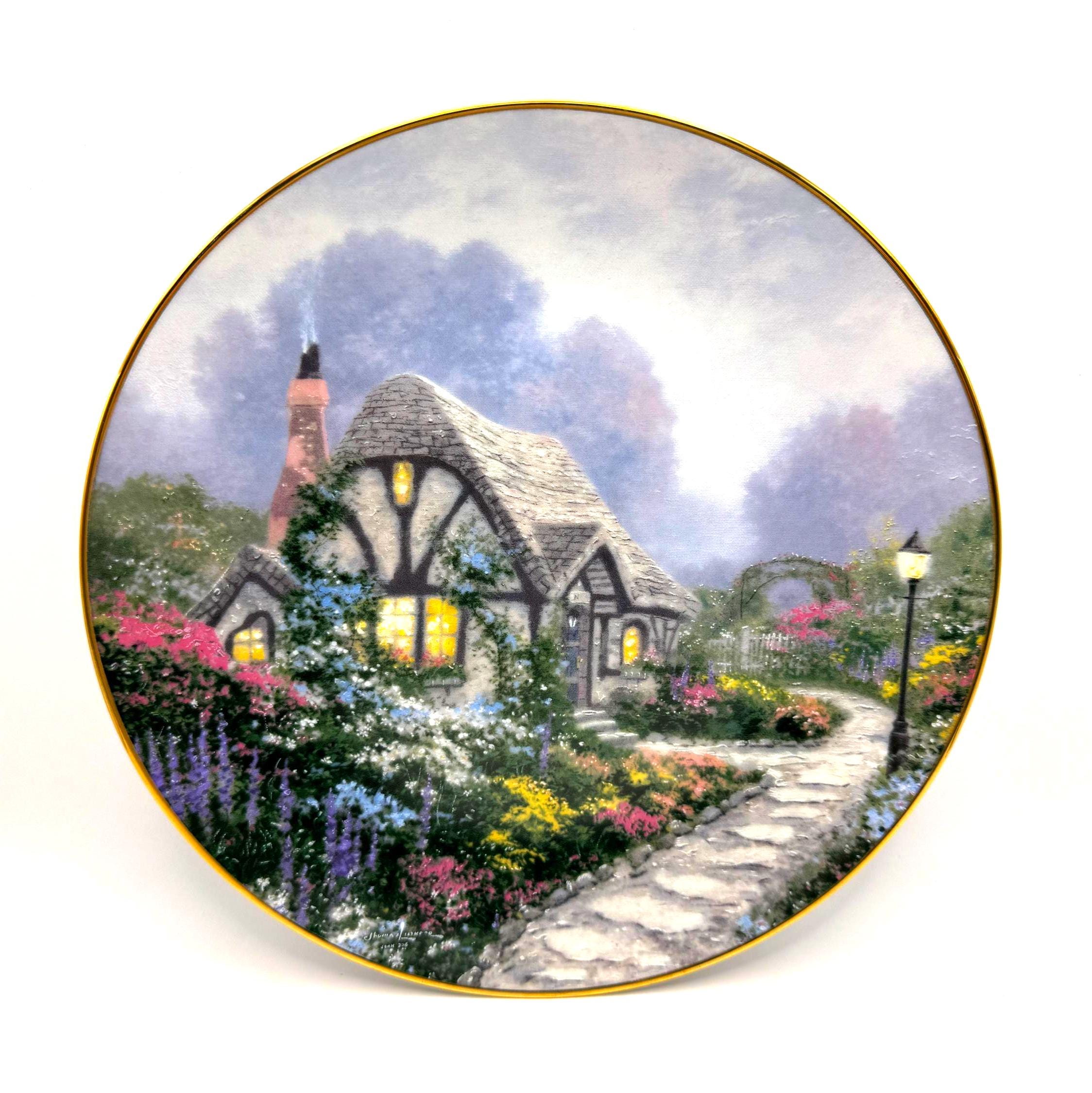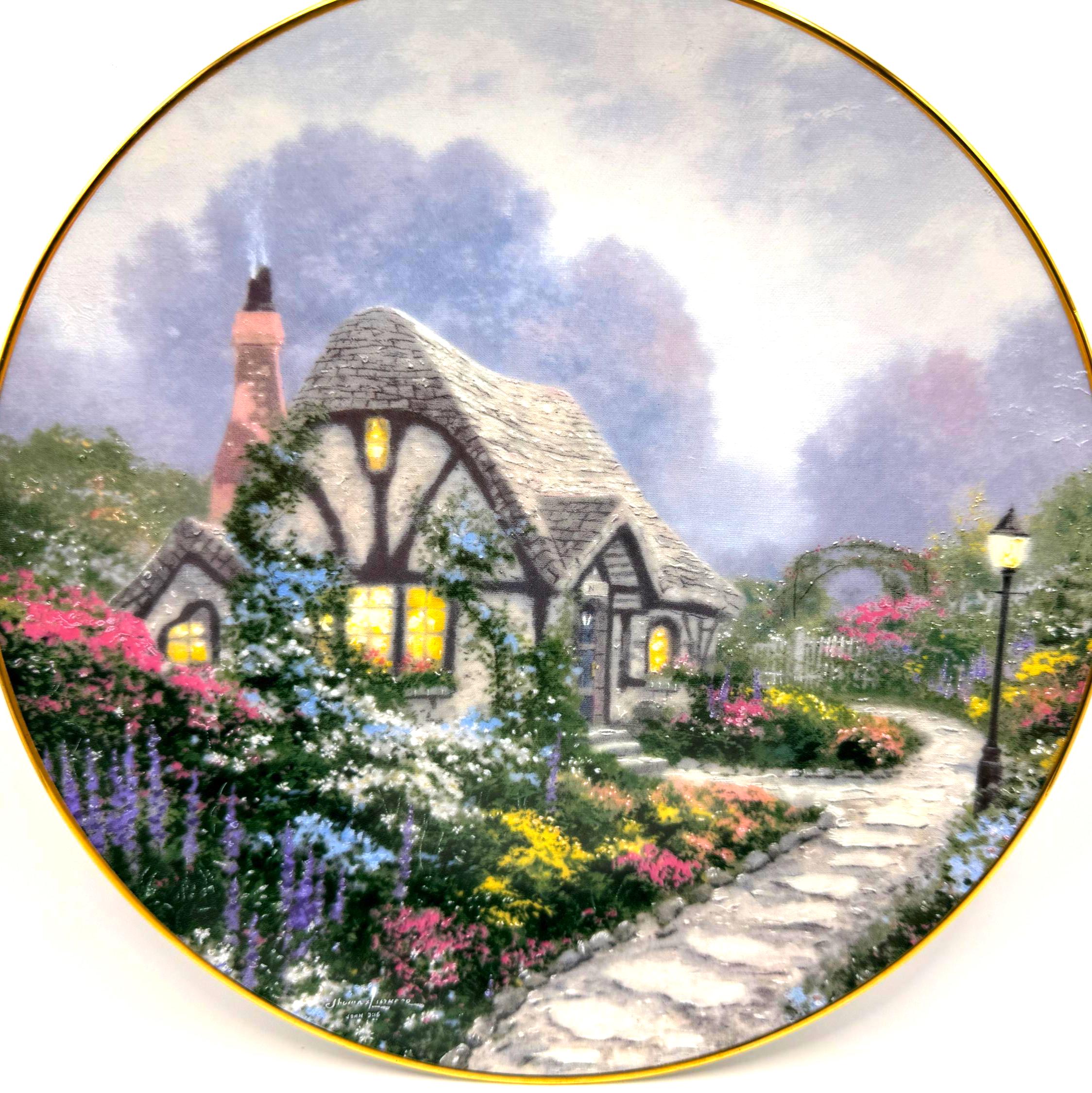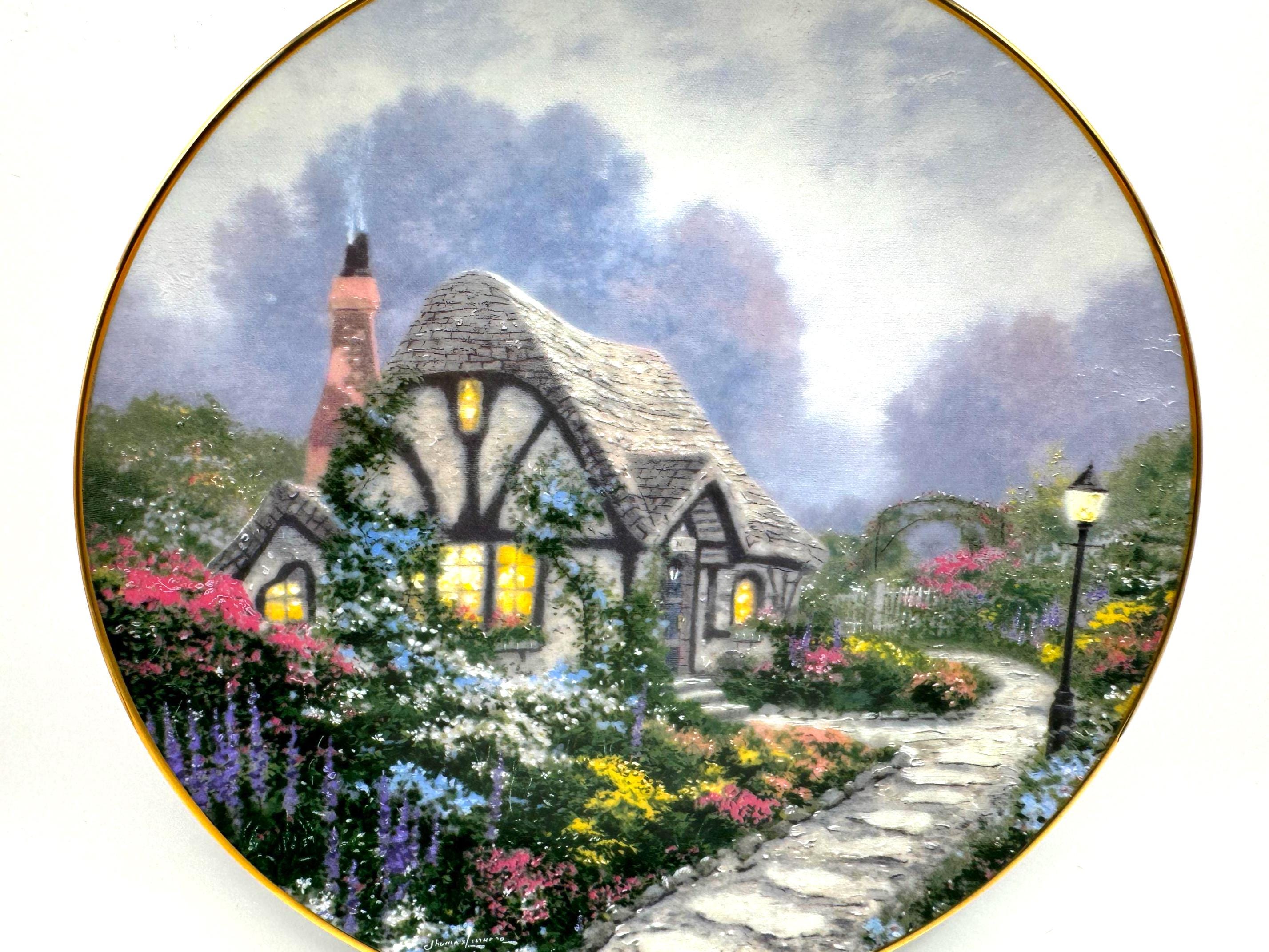 Escape into the peaceful charm of 'Chandler's Cottage', a 1991 limited edition collector plate from the beloved Thomas Kinkade. Crafted by the Edwin Knowles China Company, this beautifully detailed porcelain plate features Kinkade's signature warm light glowing through the windows of an English countryside cottage surrounded by lush, colorful gardens. A must have for Kinkade collectors and fans of cozy English cottage art.