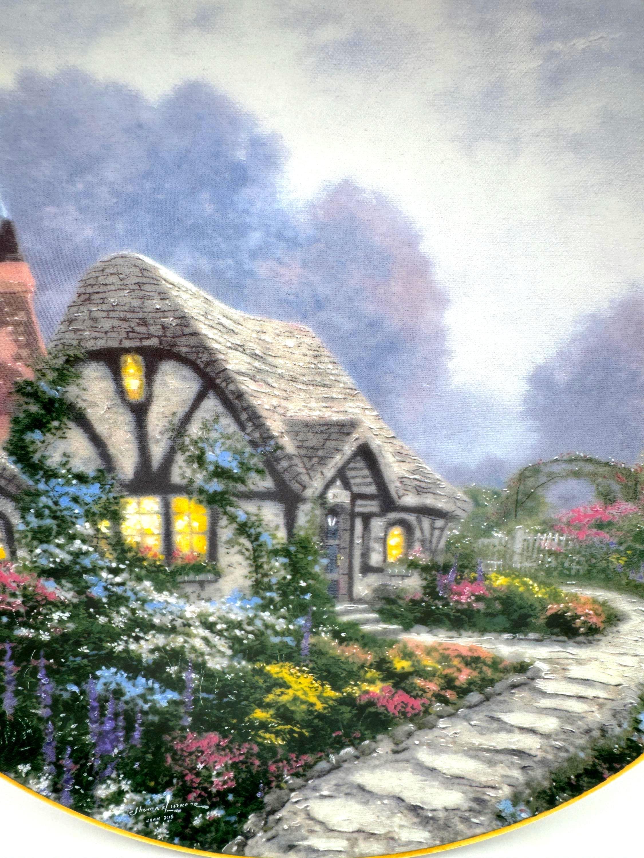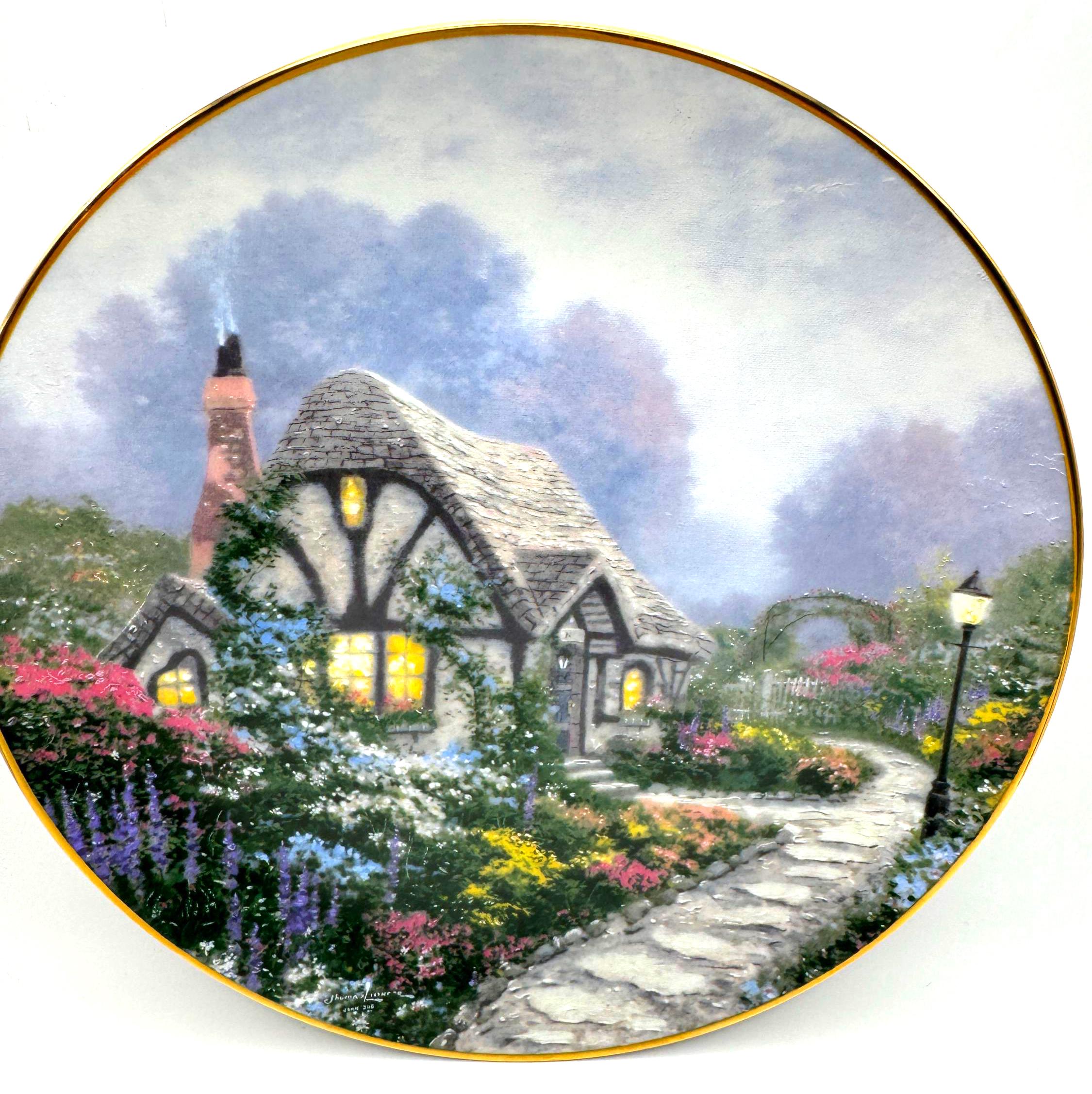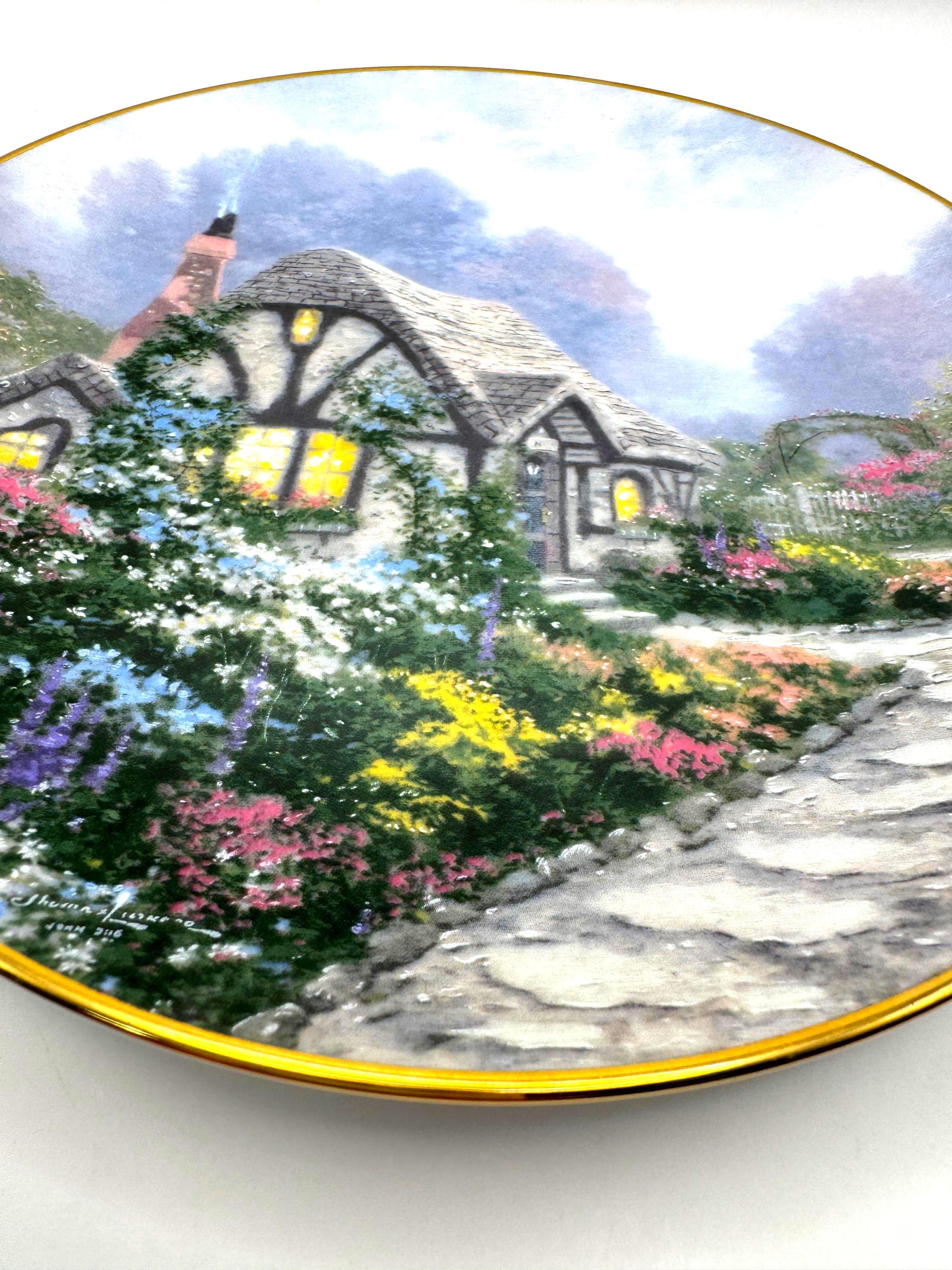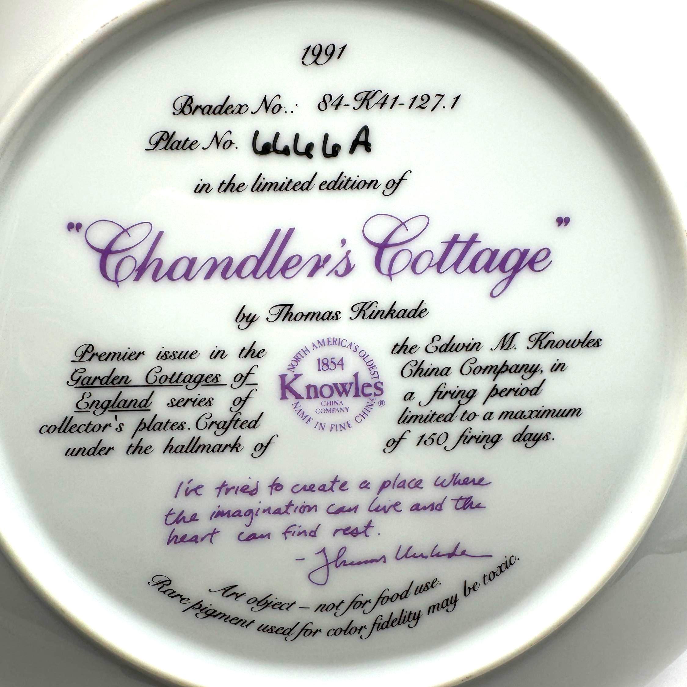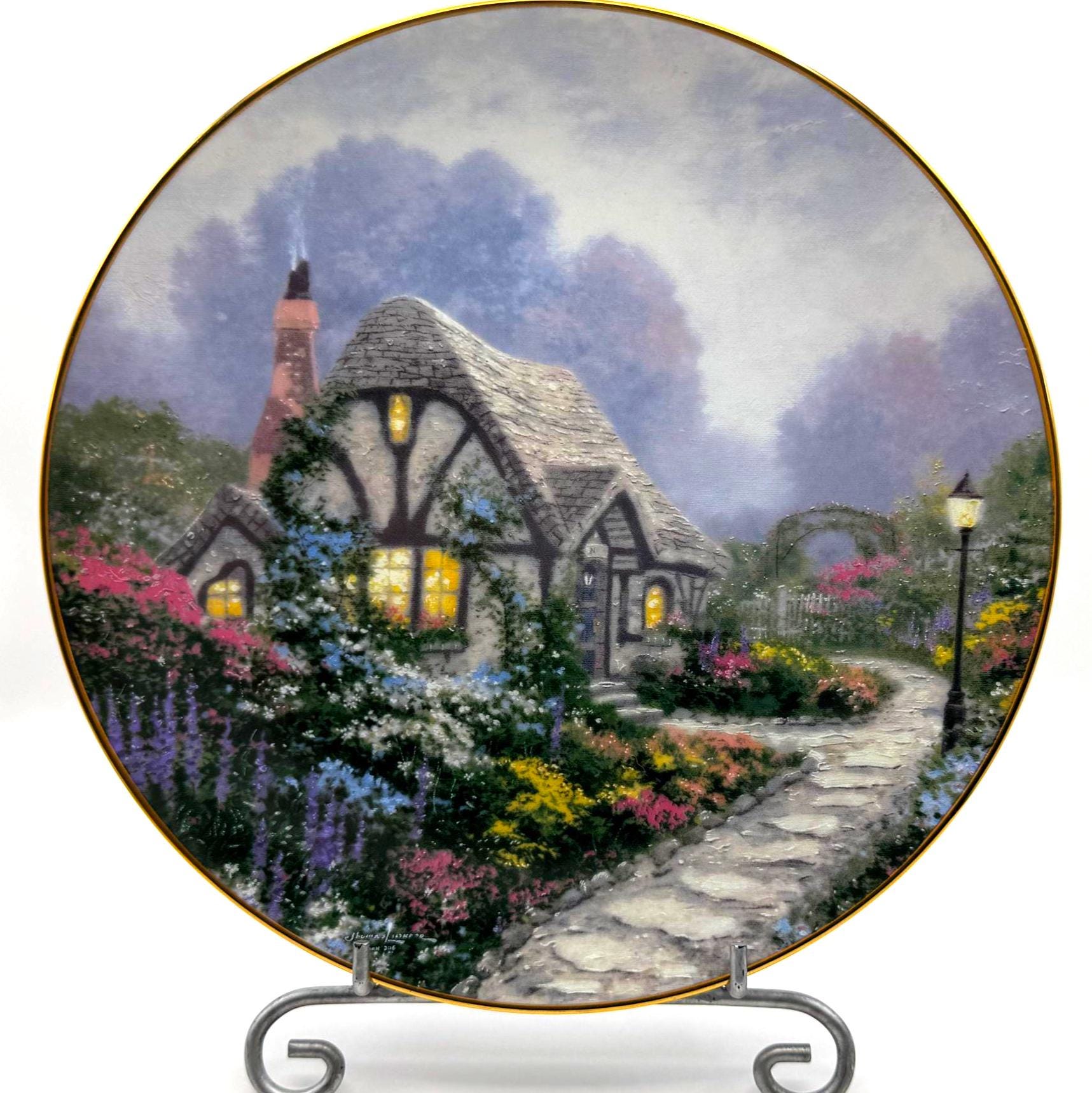 Escape into the peaceful charm of 'Chandler's Cottage', a 1991 limited edition collector plate from the beloved Thomas Kinkade. Crafted by the Edwin Knowles China Company, this beautifully detailed porcelain plate features Kinkade's signature warm light glowing through the windows of an English countryside cottage surrounded by lush, colorful gardens. A must have for Kinkade collectors and fans of cozy English cottage art.