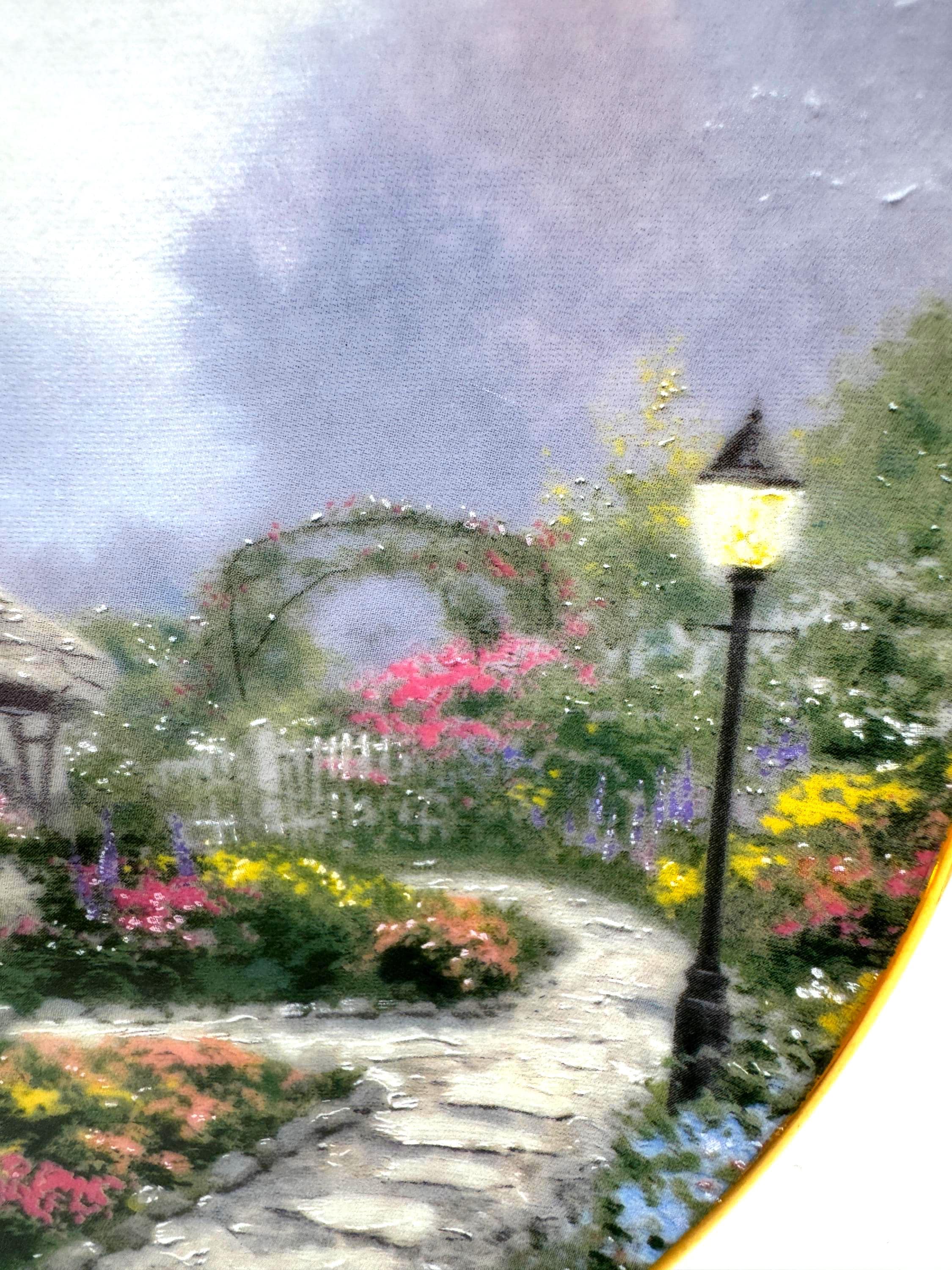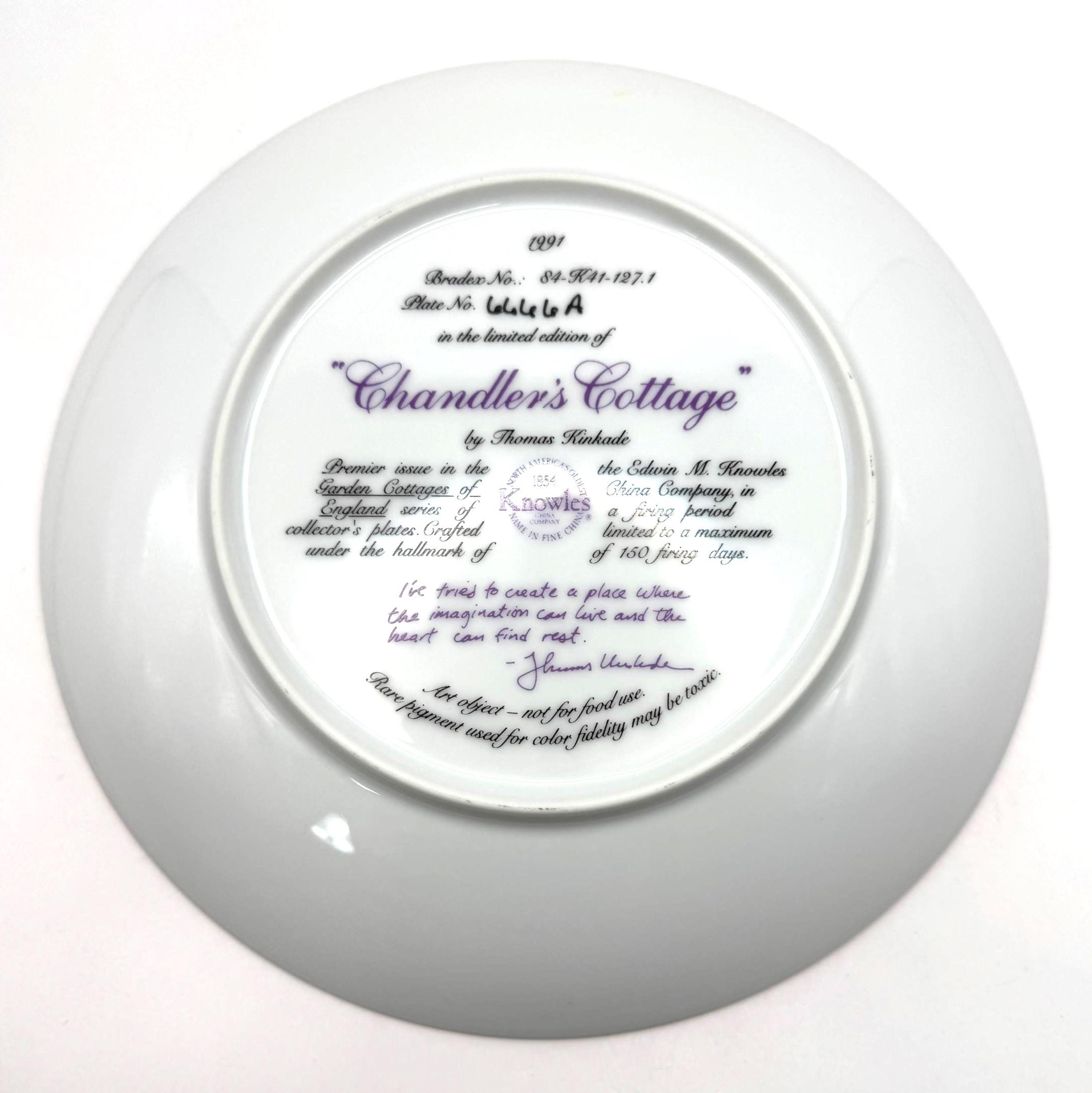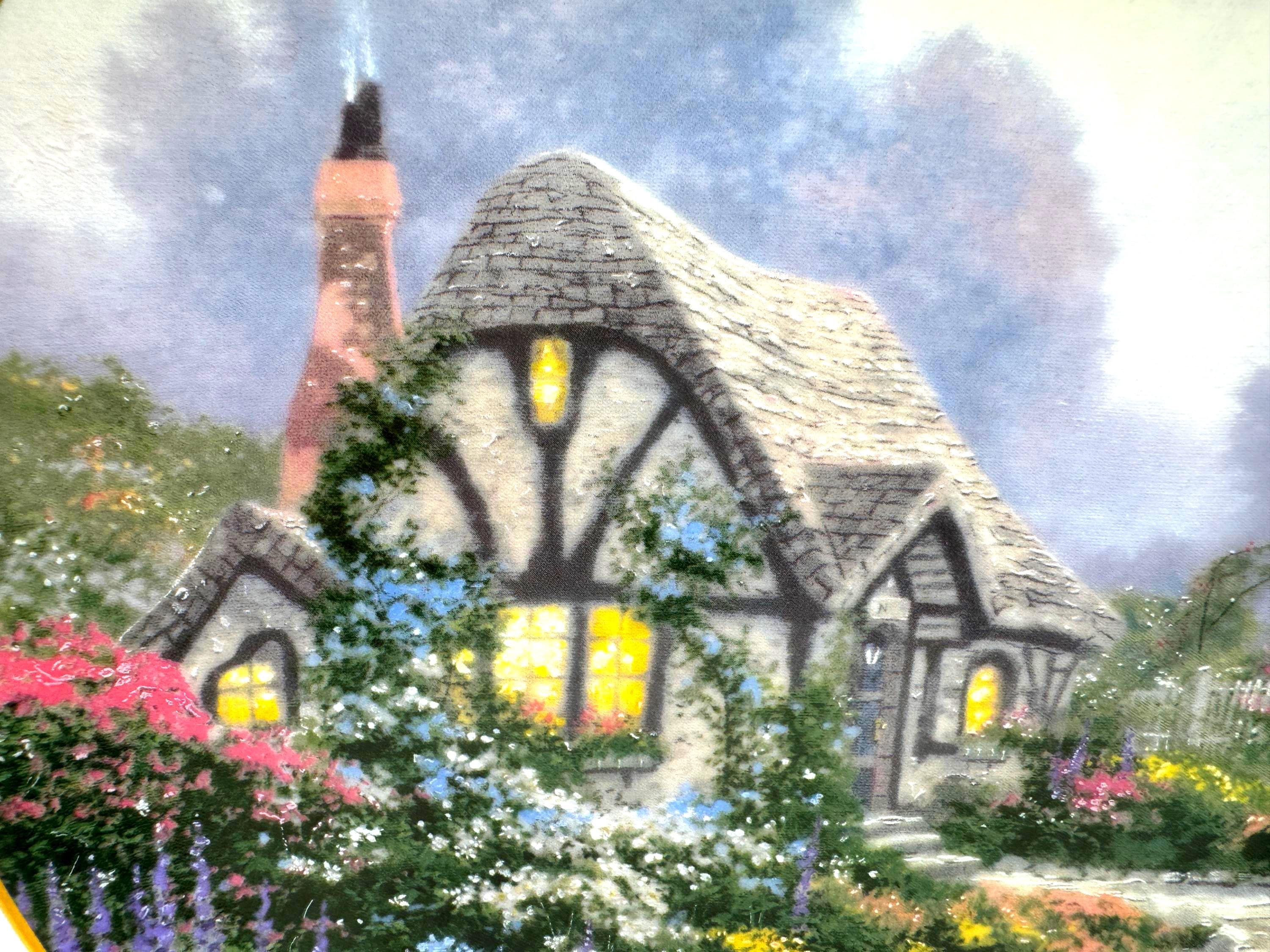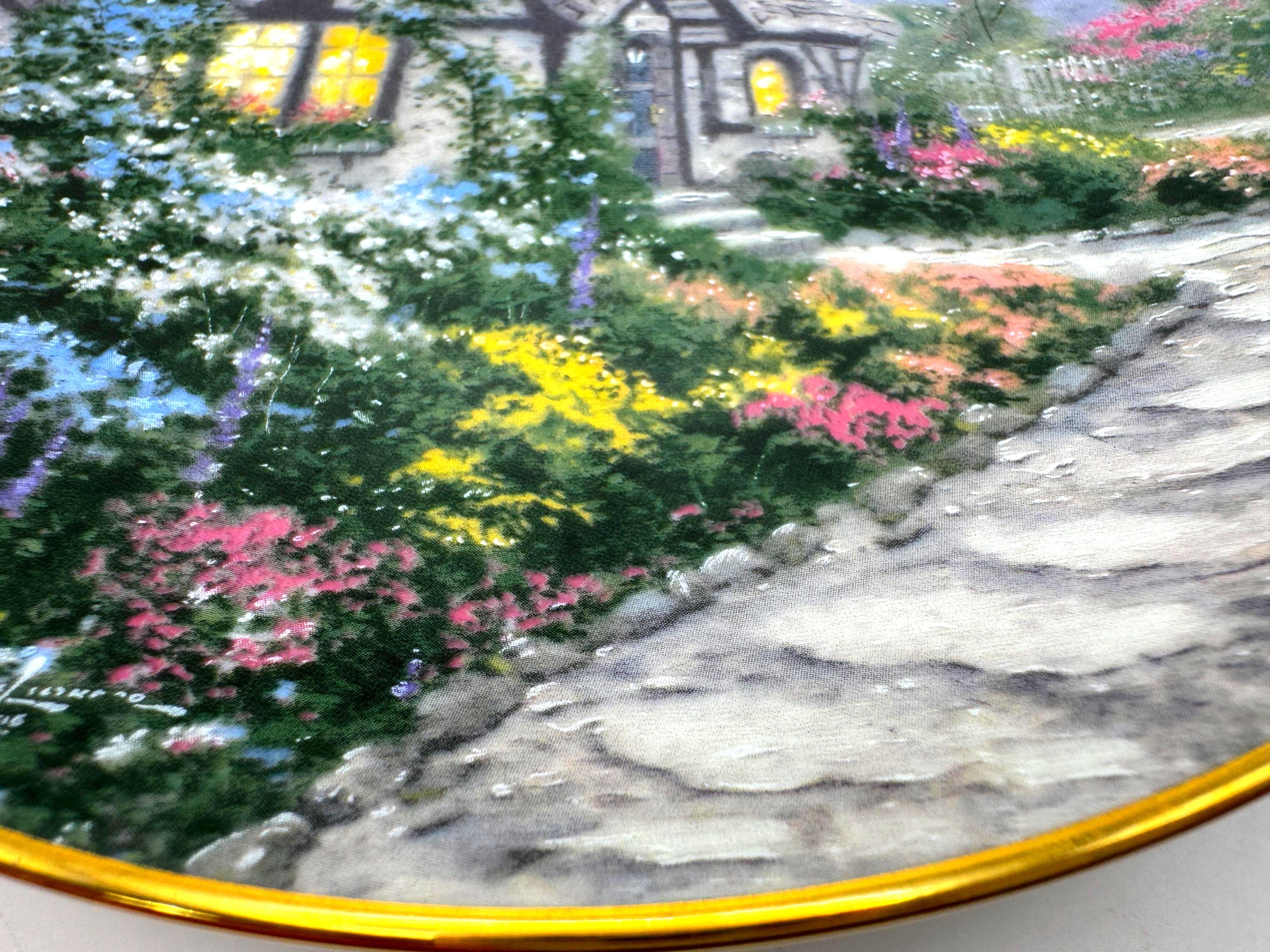 Escape into the peaceful charm of 'Chandler's Cottage', a 1991 limited edition collector plate from the beloved Thomas Kinkade. Crafted by the Edwin Knowles China Company, this beautifully detailed porcelain plate features Kinkade's signature warm light glowing through the windows of an English countryside cottage surrounded by lush, colorful gardens. A must have for Kinkade collectors and fans of cozy English cottage art.