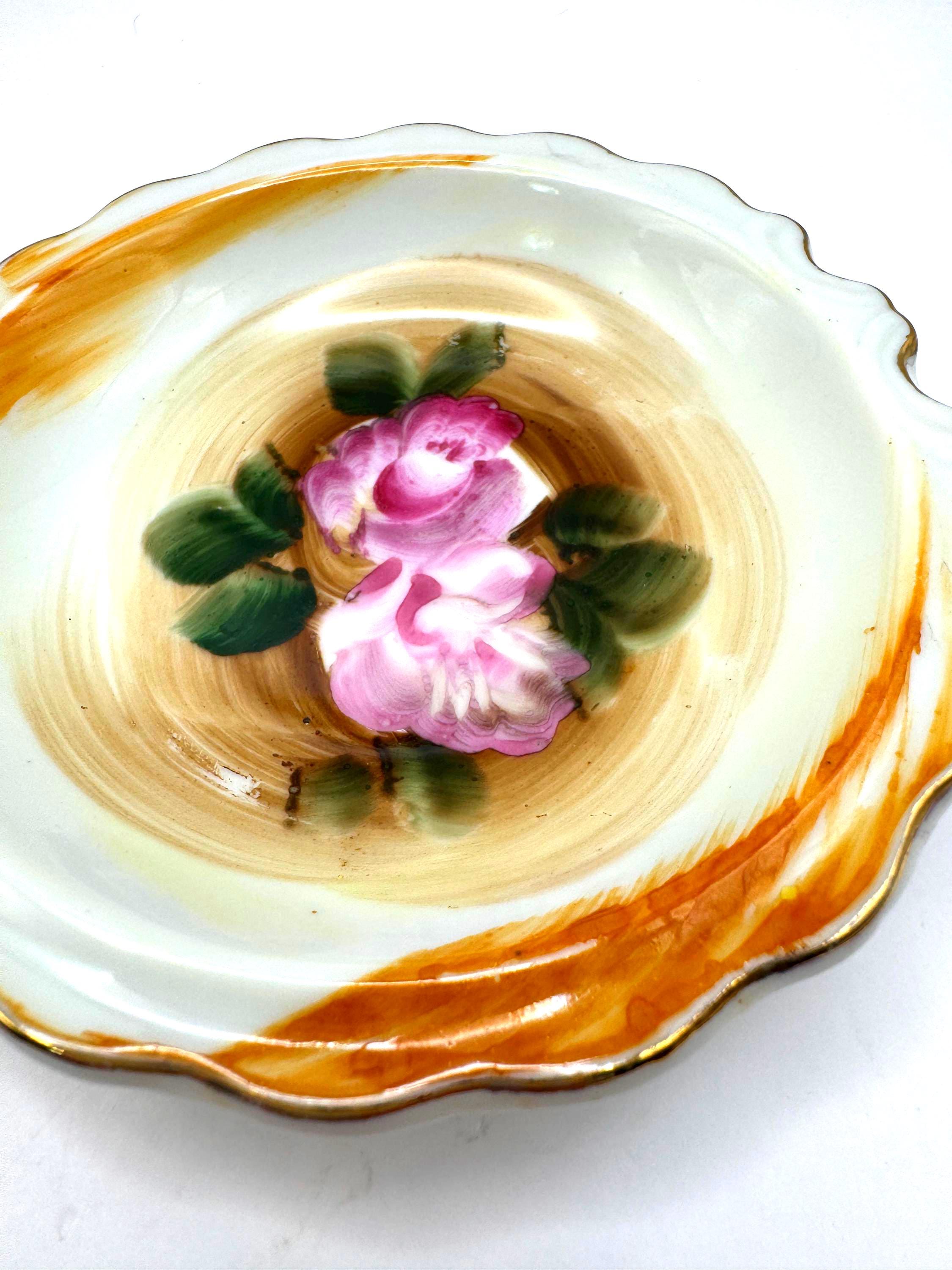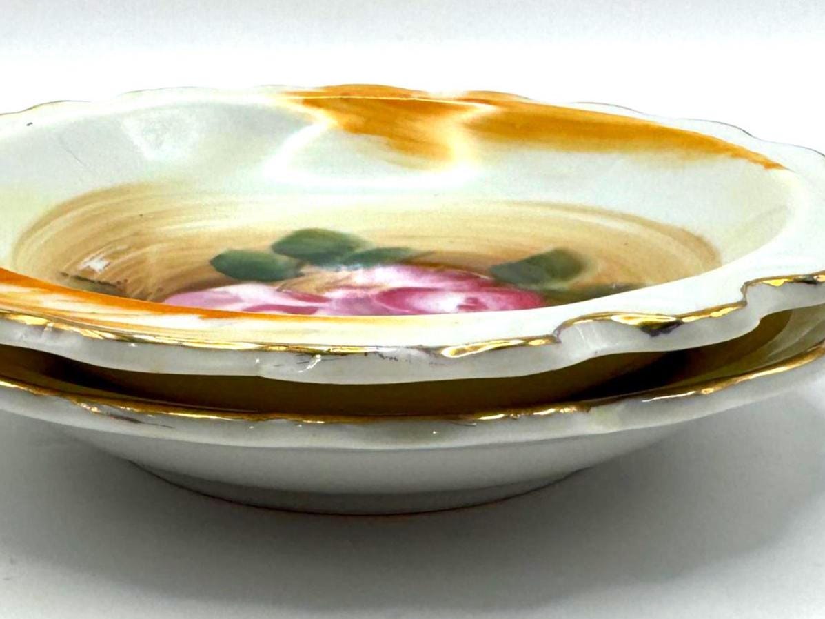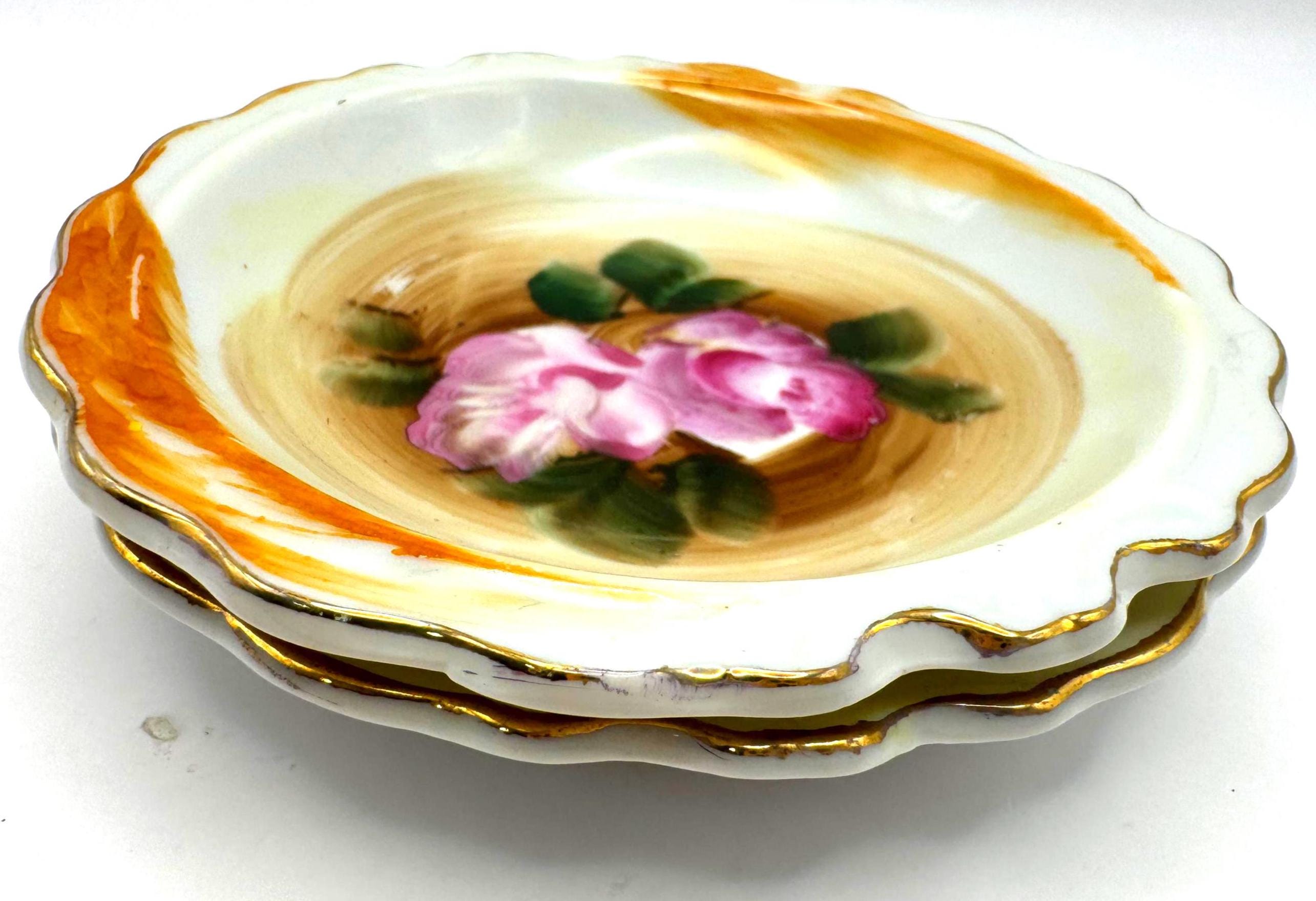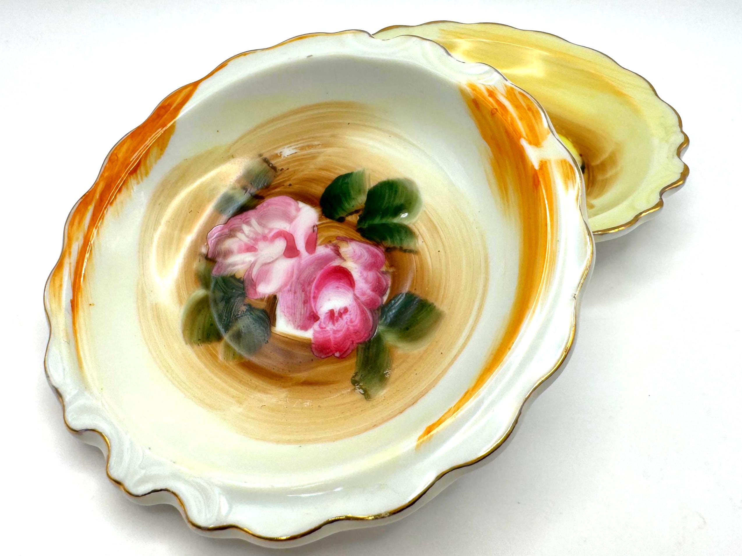 Beautifully detailed with painterly brushstrokes and finished with gold trim and a scalloped edge, these small bowls are ideal for use as trinket holders or vintage display accents.