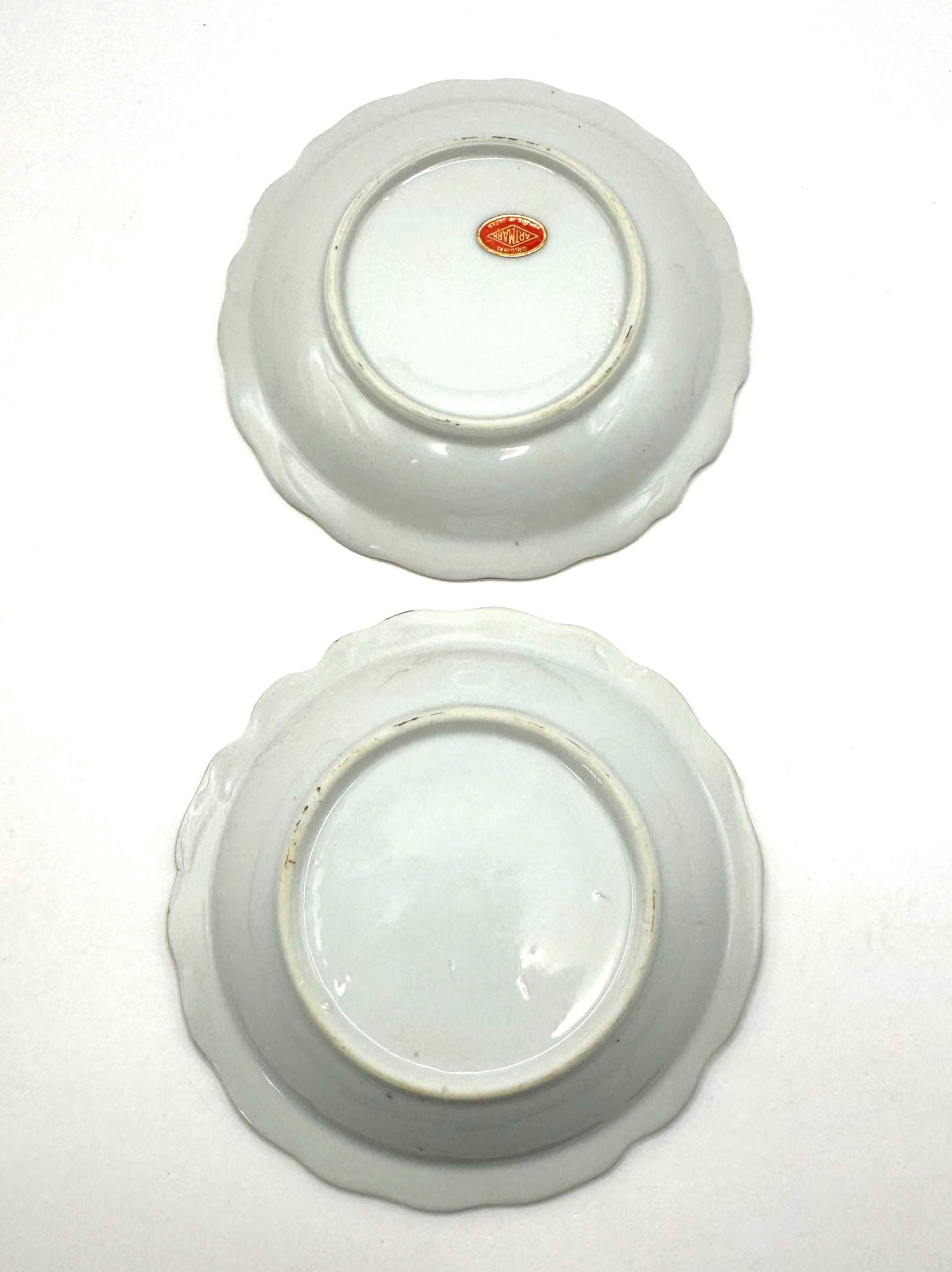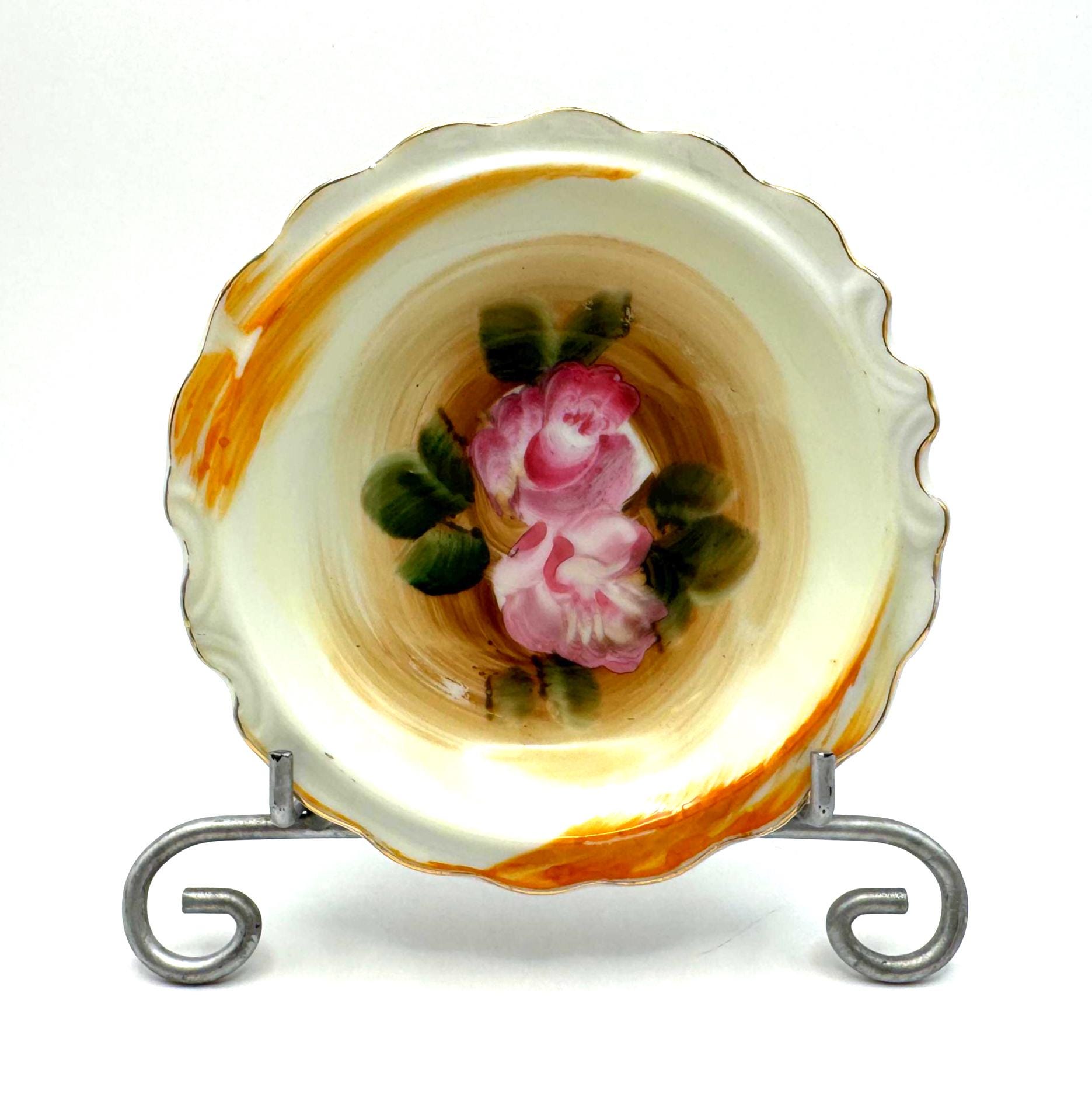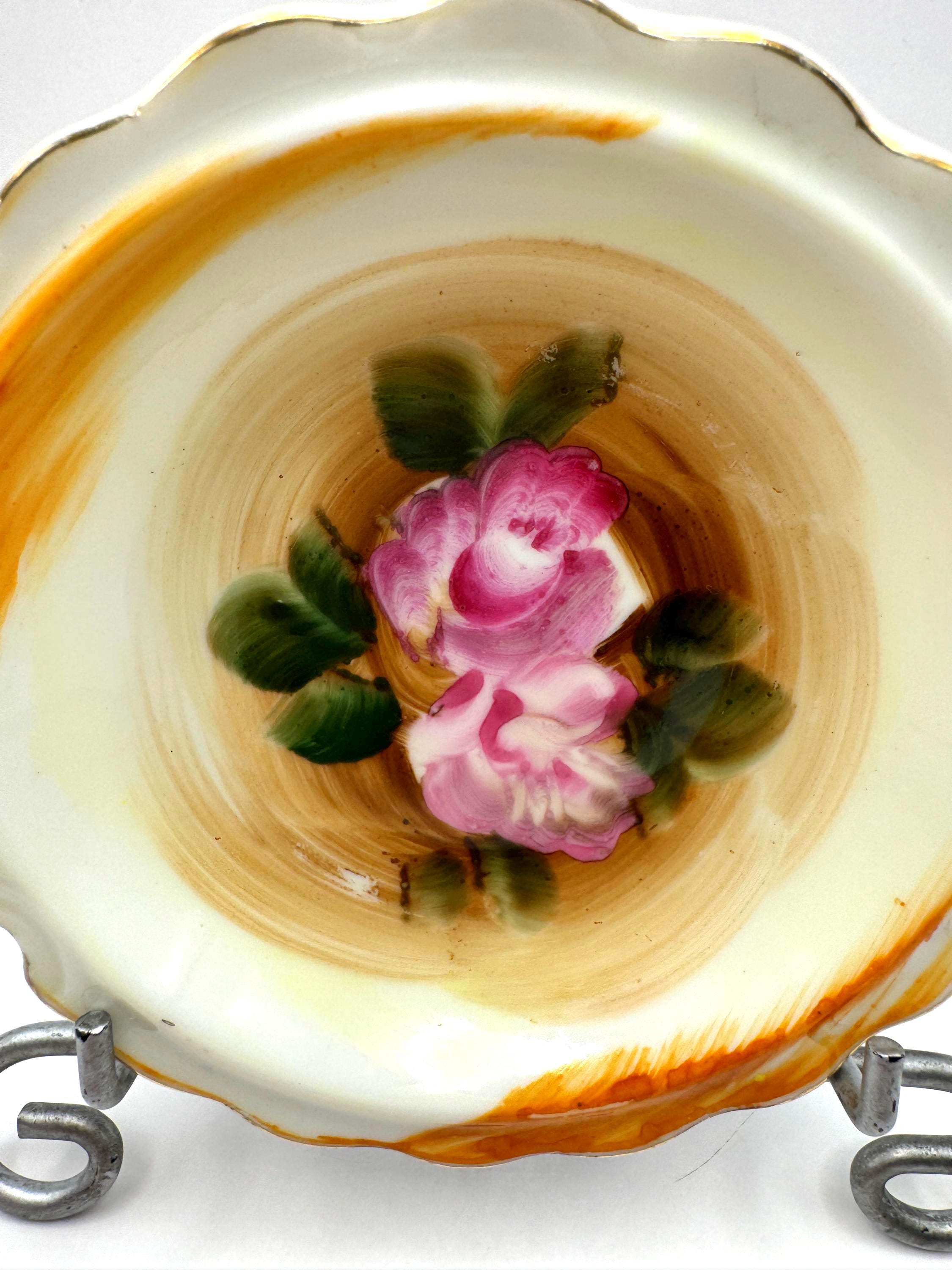 Beautifully detailed with painterly brushstrokes and finished with gold trim and a scalloped edge, these small bowls are ideal for use as trinket holders or vintage display accents.