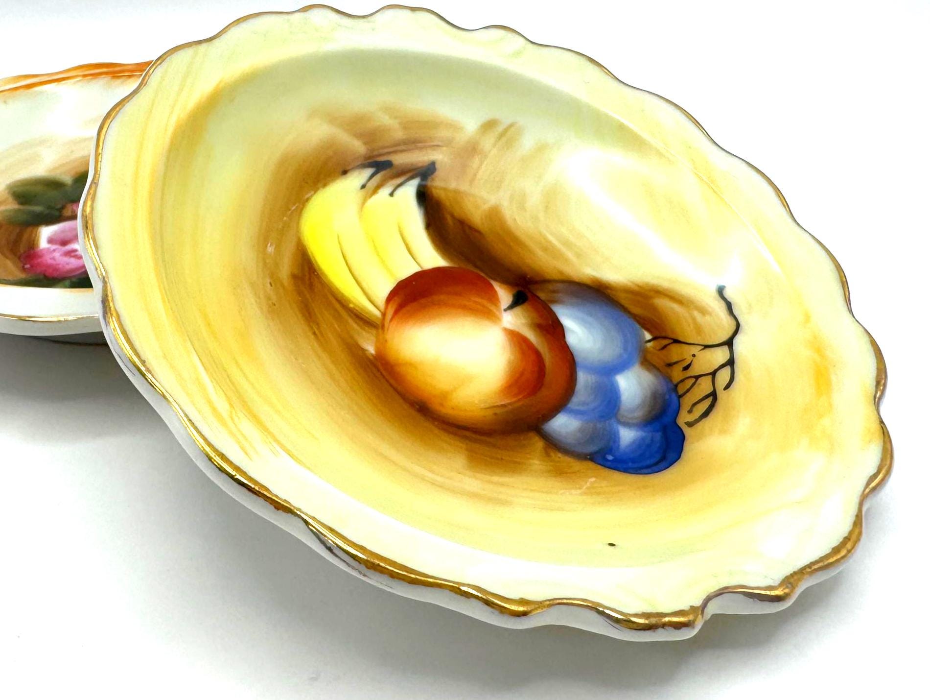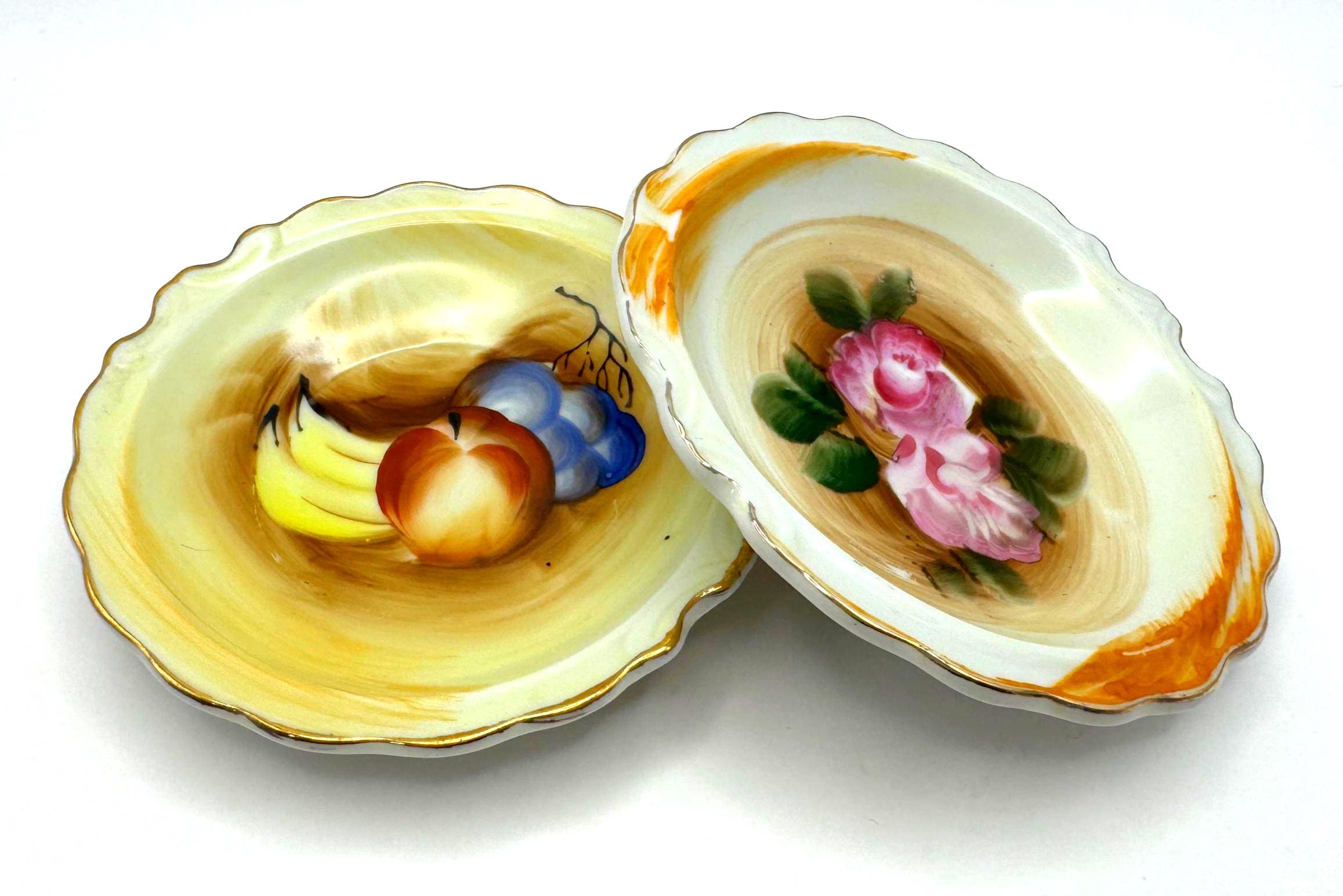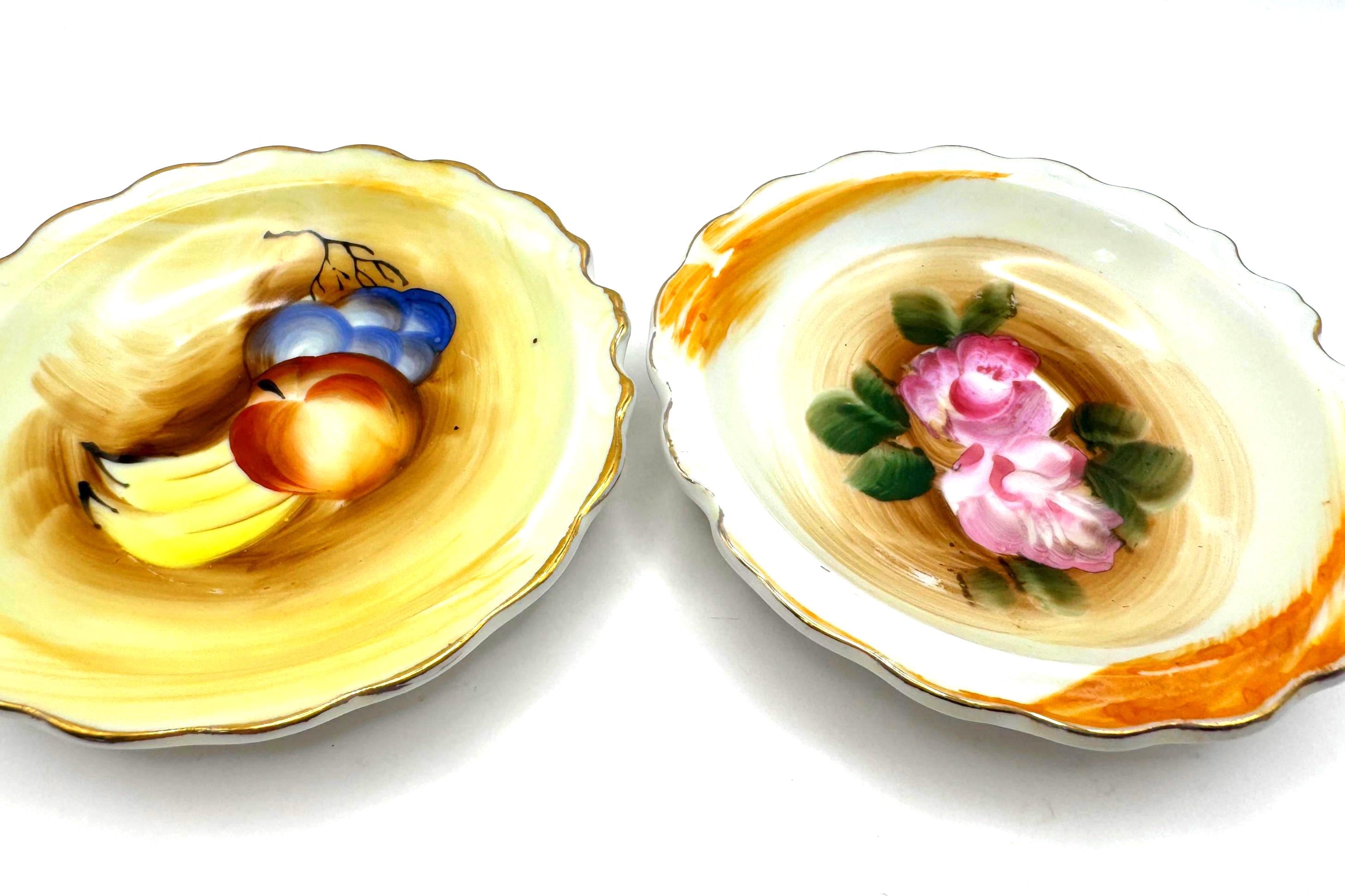 Add a touch of vintage charm with this pair of small hand-painted Artmark porcelain bowls made in Japan, circa 1950s-1960s. Each bowl features a unique design--one with pink rose bouquet, the other with a fruit still life in soft brown and yellow tones.