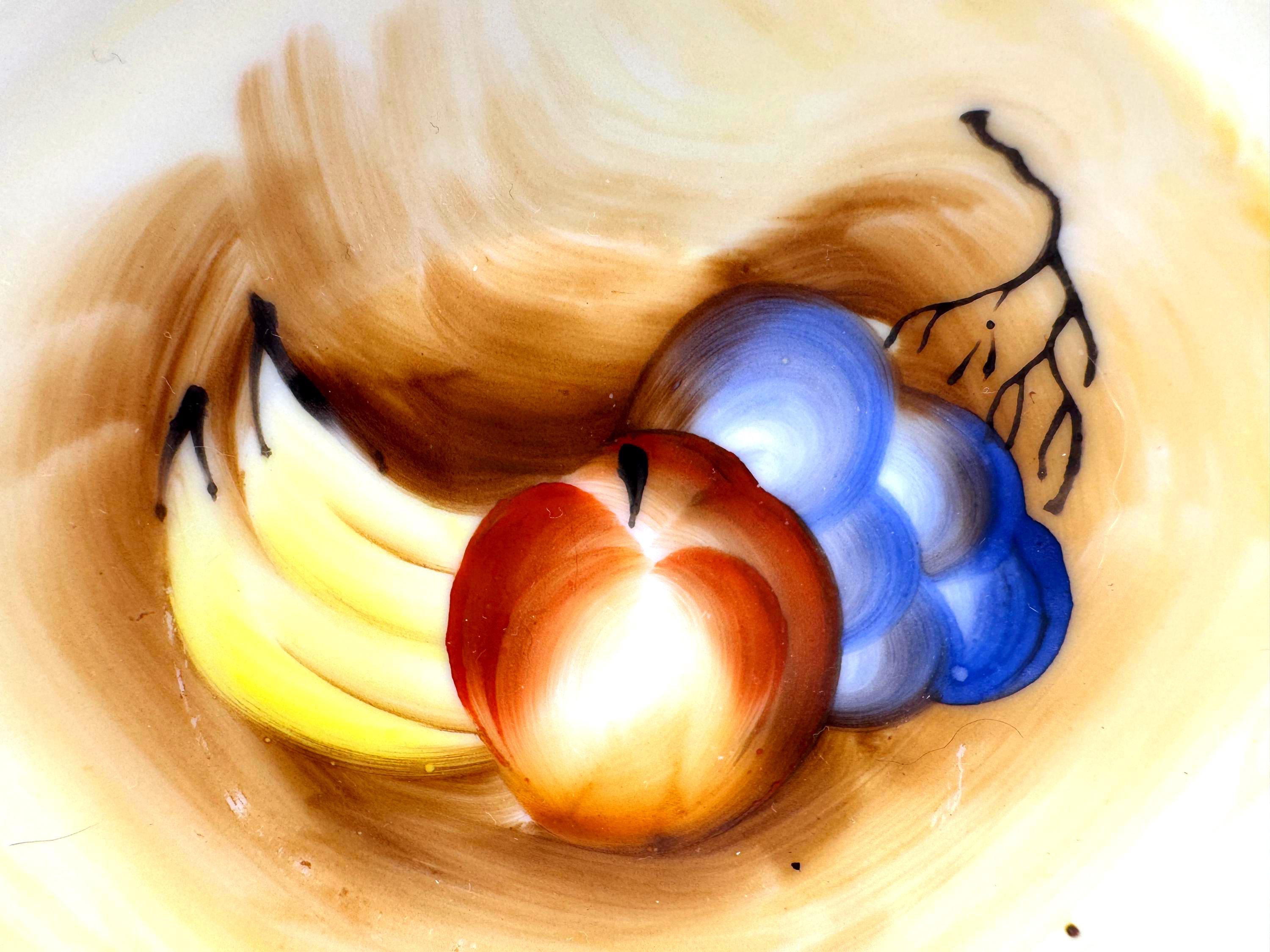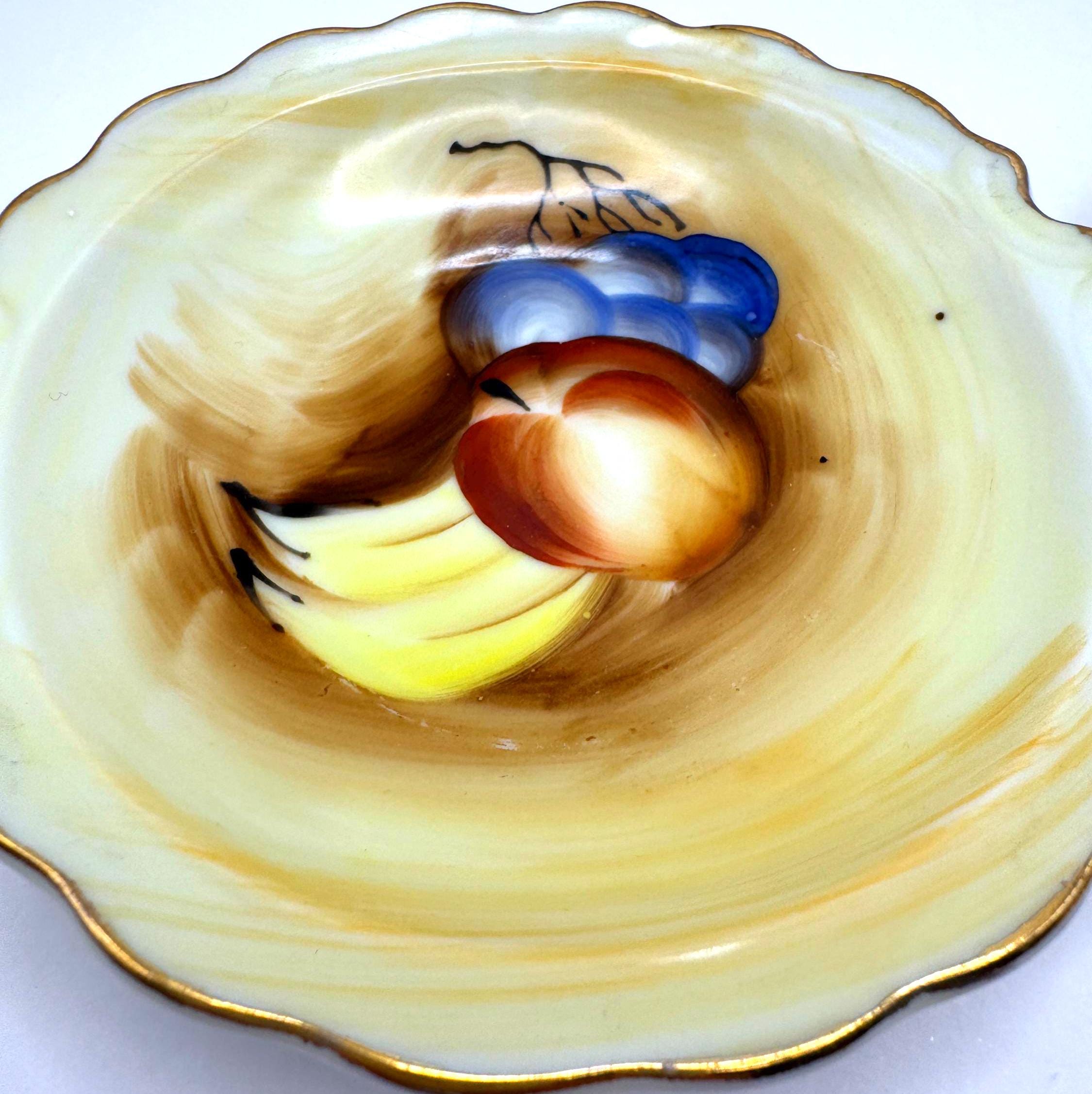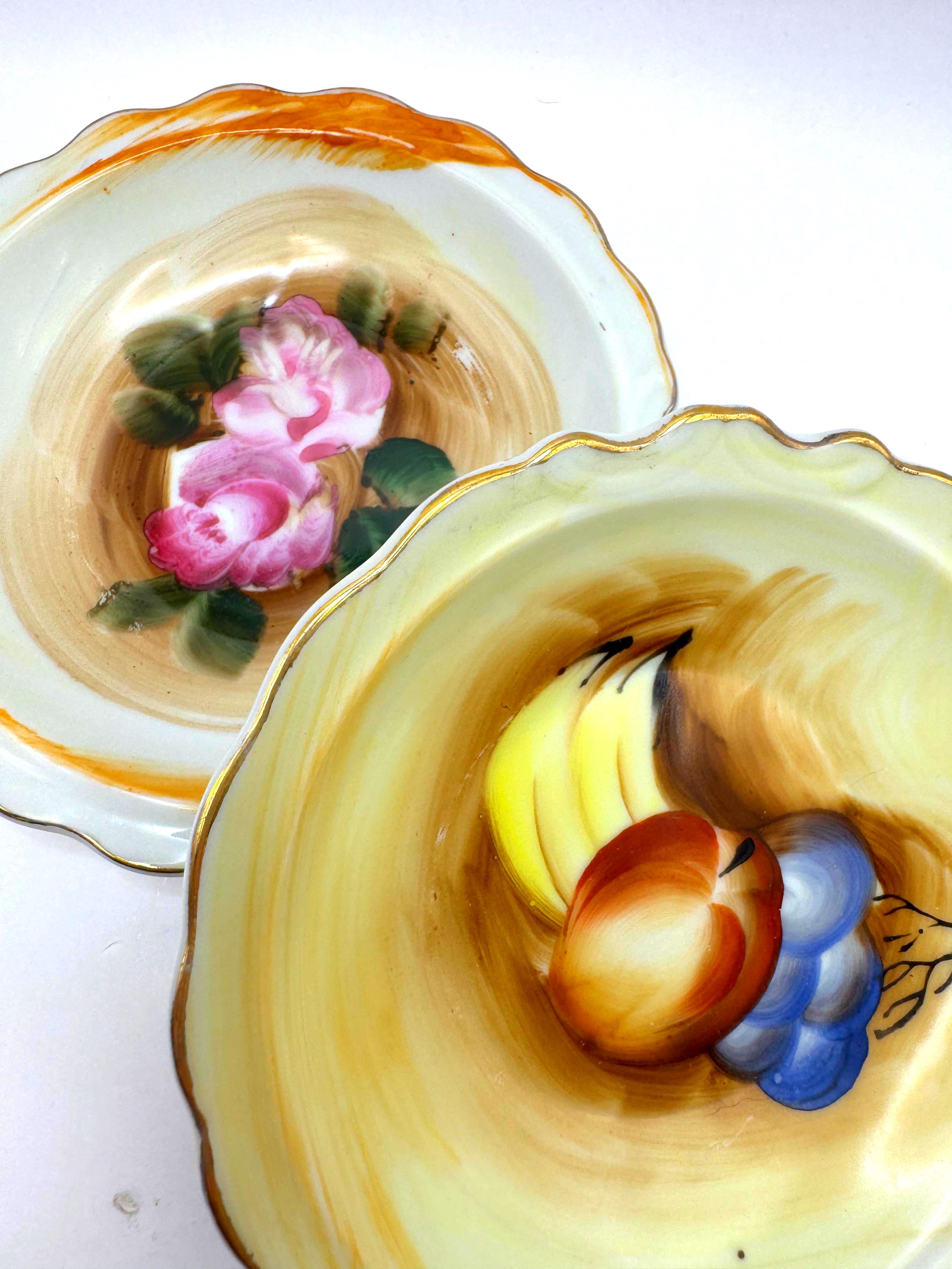 Add a touch of vintage charm with this pair of small hand-painted Artmark porcelain bowls made in Japan, circa 1950s-1960s. Each bowl features a unique design--one with pink rose bouquet, the other with a fruit still life in soft brown and yellow tones.