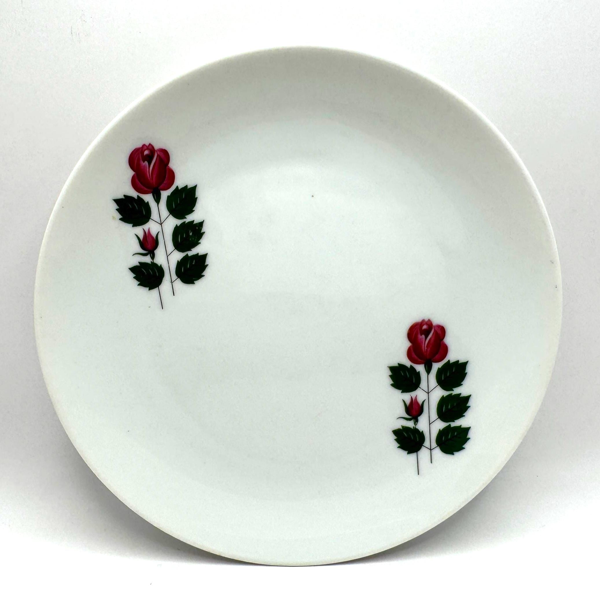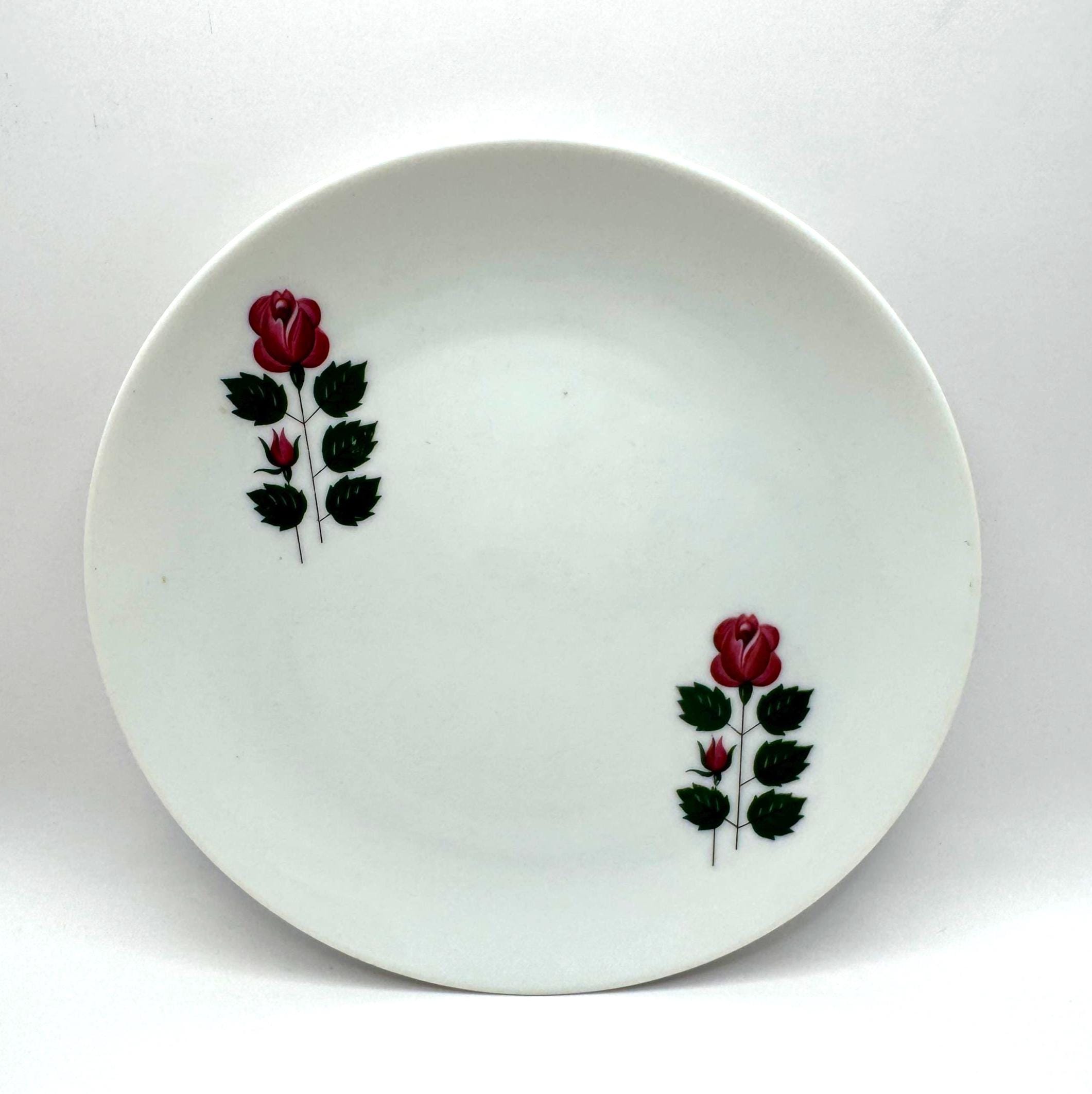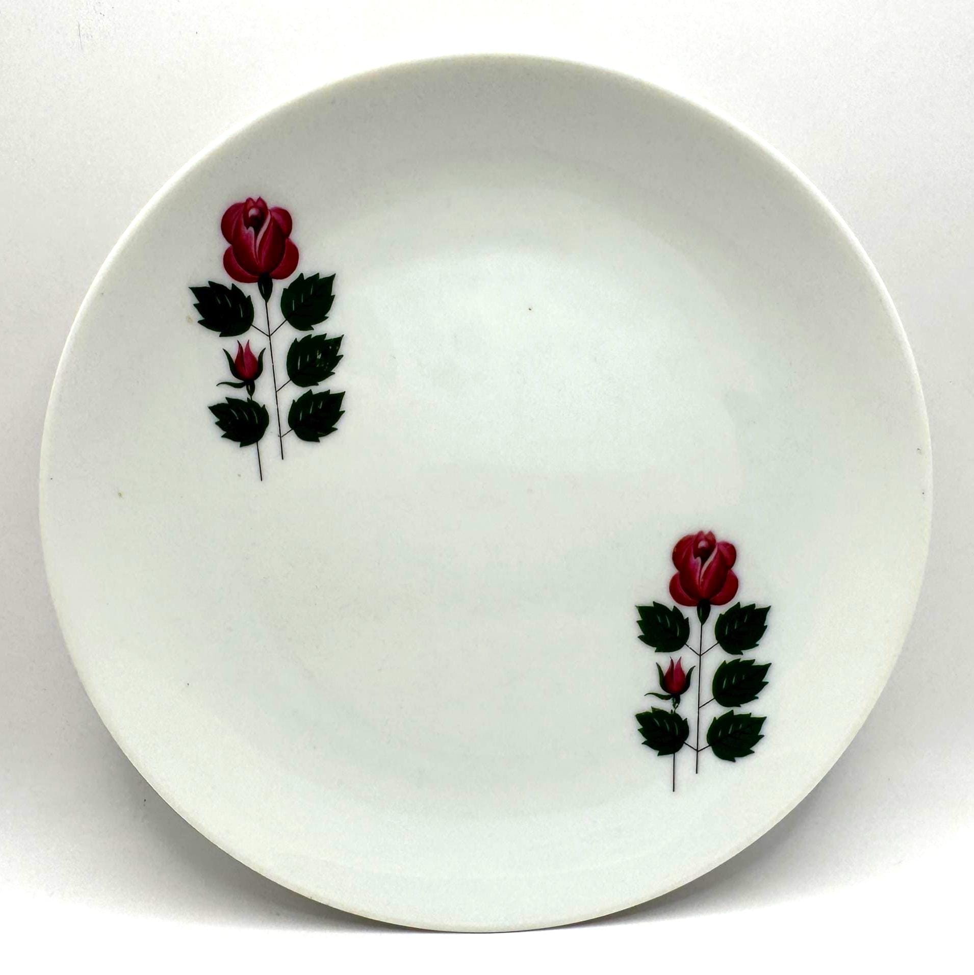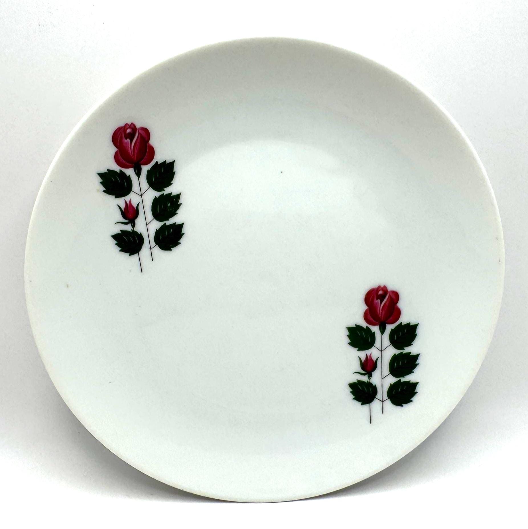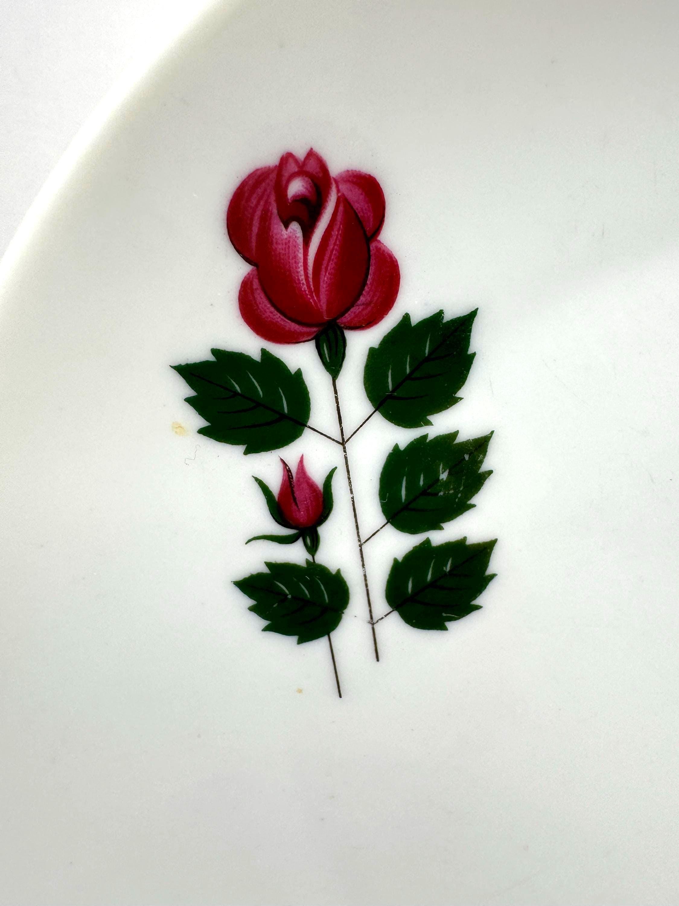 Lovely Winterling Markleuthen Bavaria porcelain salad/dessert plate featuring a dark pink rosebud design with deep green leaves on crisp white porcelain.