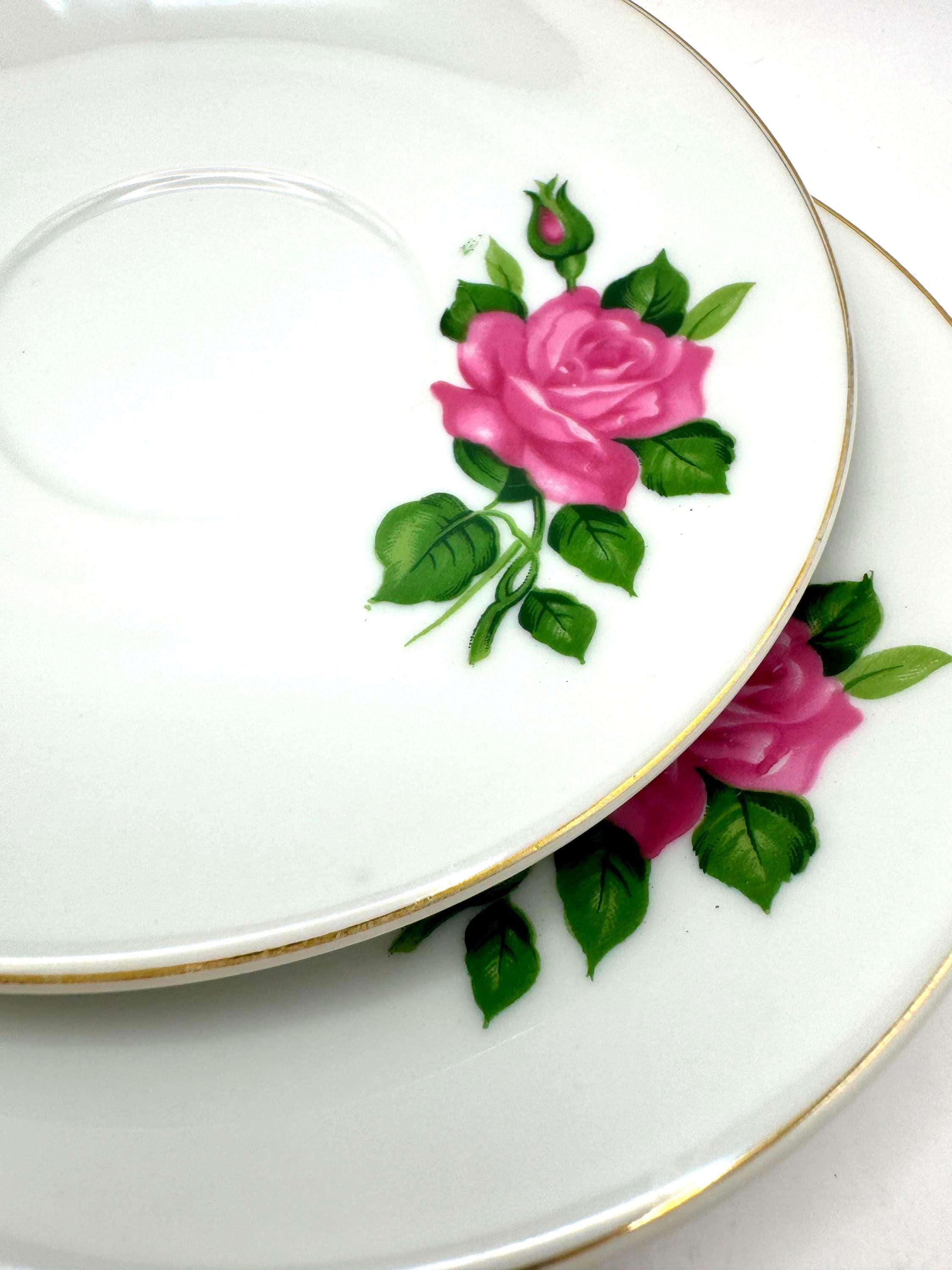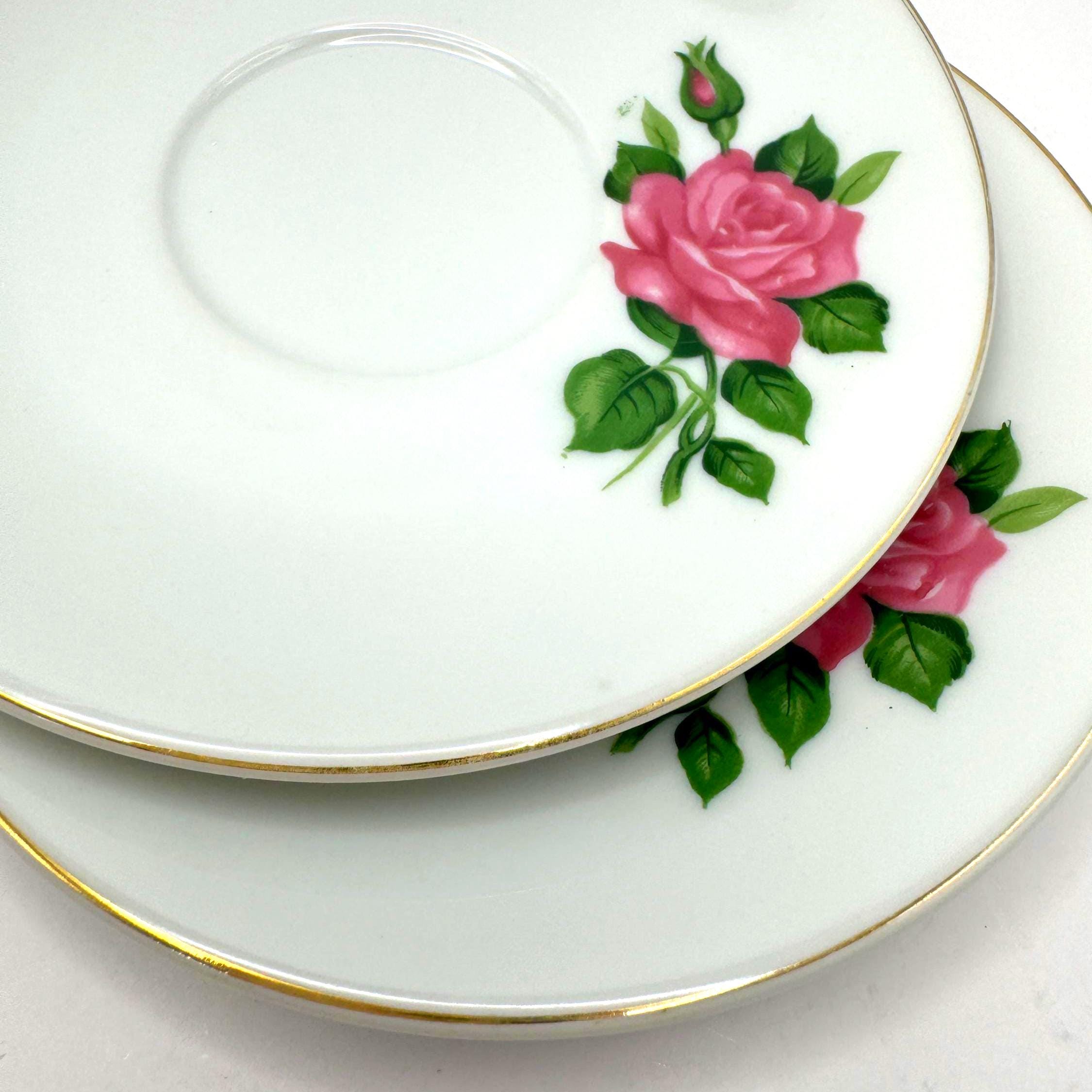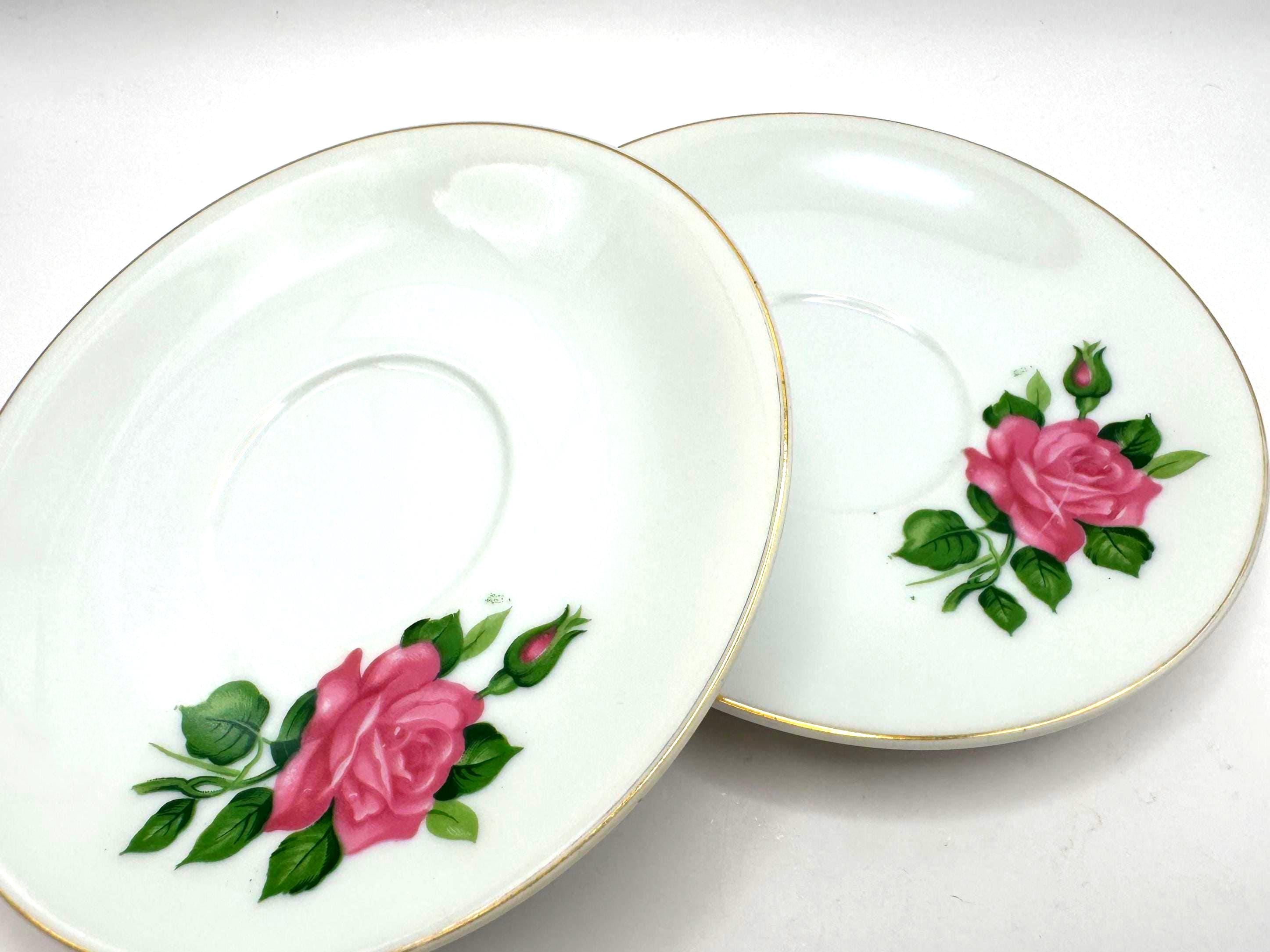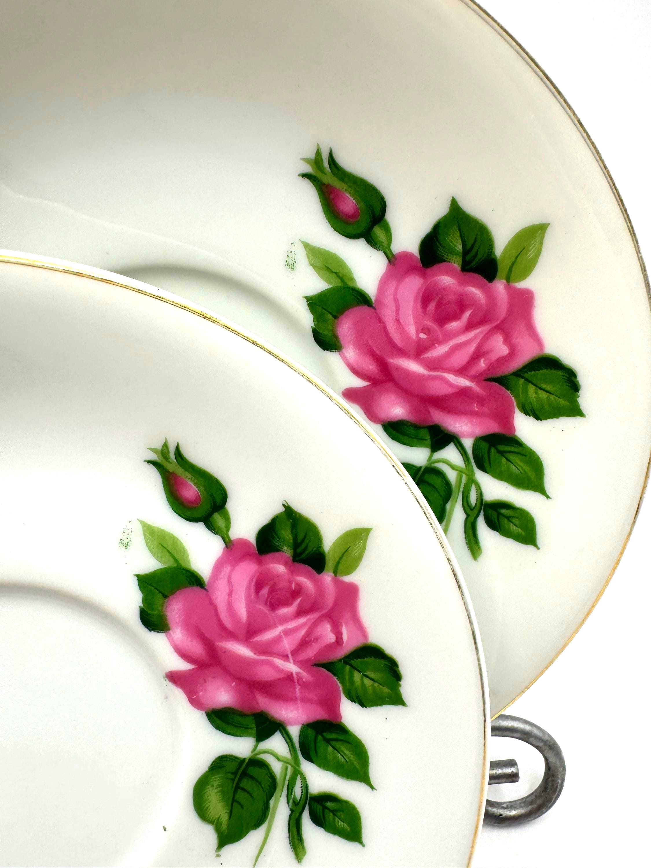 Elegant pair of vintage porcelain saucers featuring soft pink rose blooms with green leaves, accented by fine gold trim around the rim. These mid-century saucers have a timeless romantic charm, perfect for mixing and matching with floral tea sets or displaying in a cottage style kitchen.