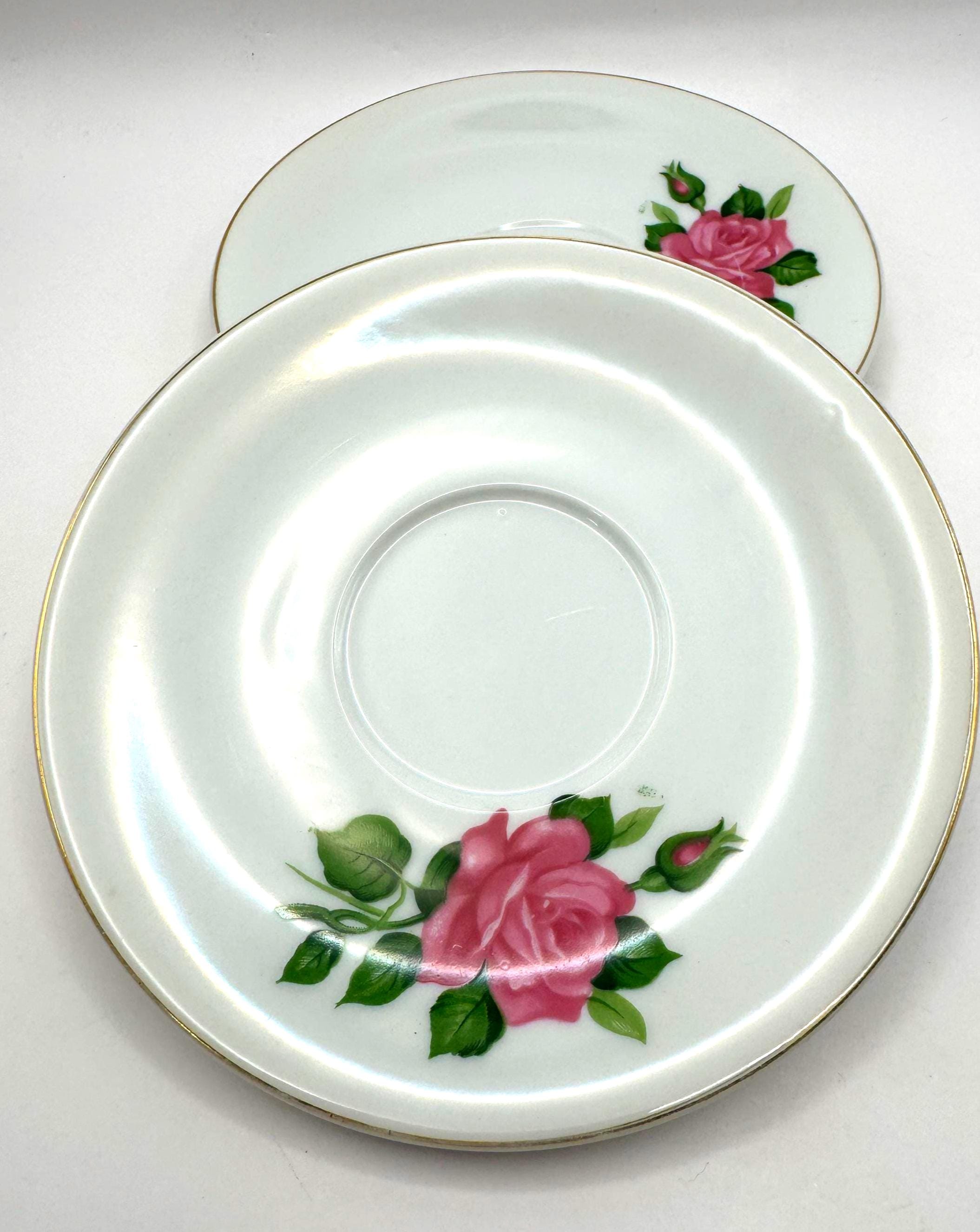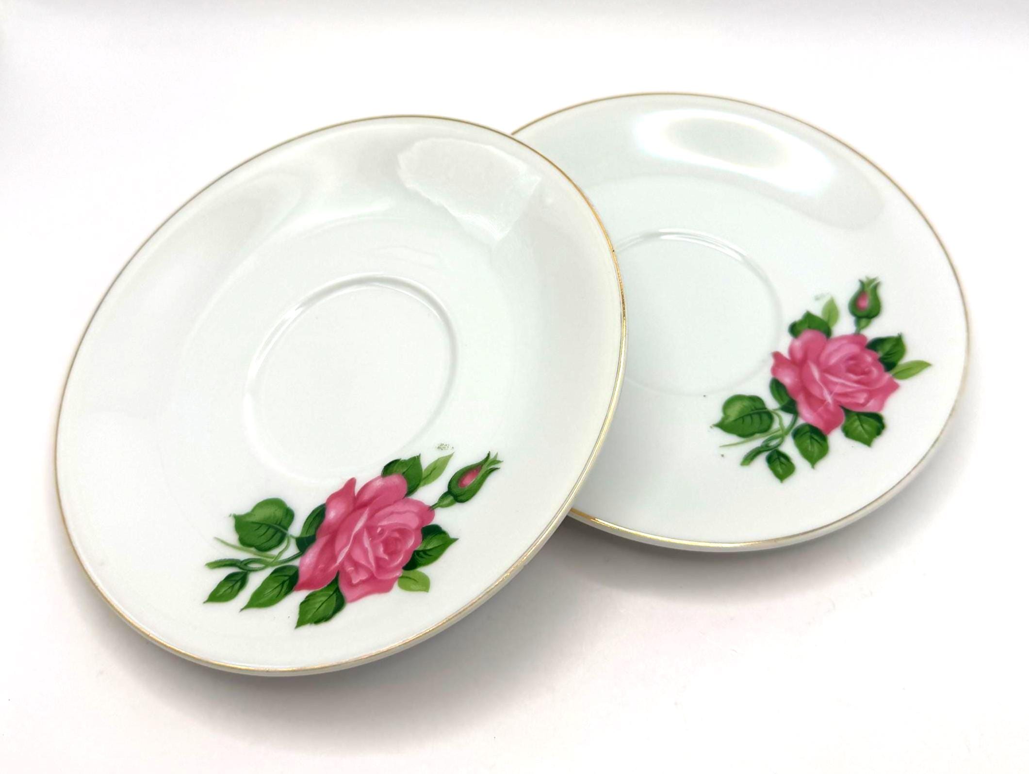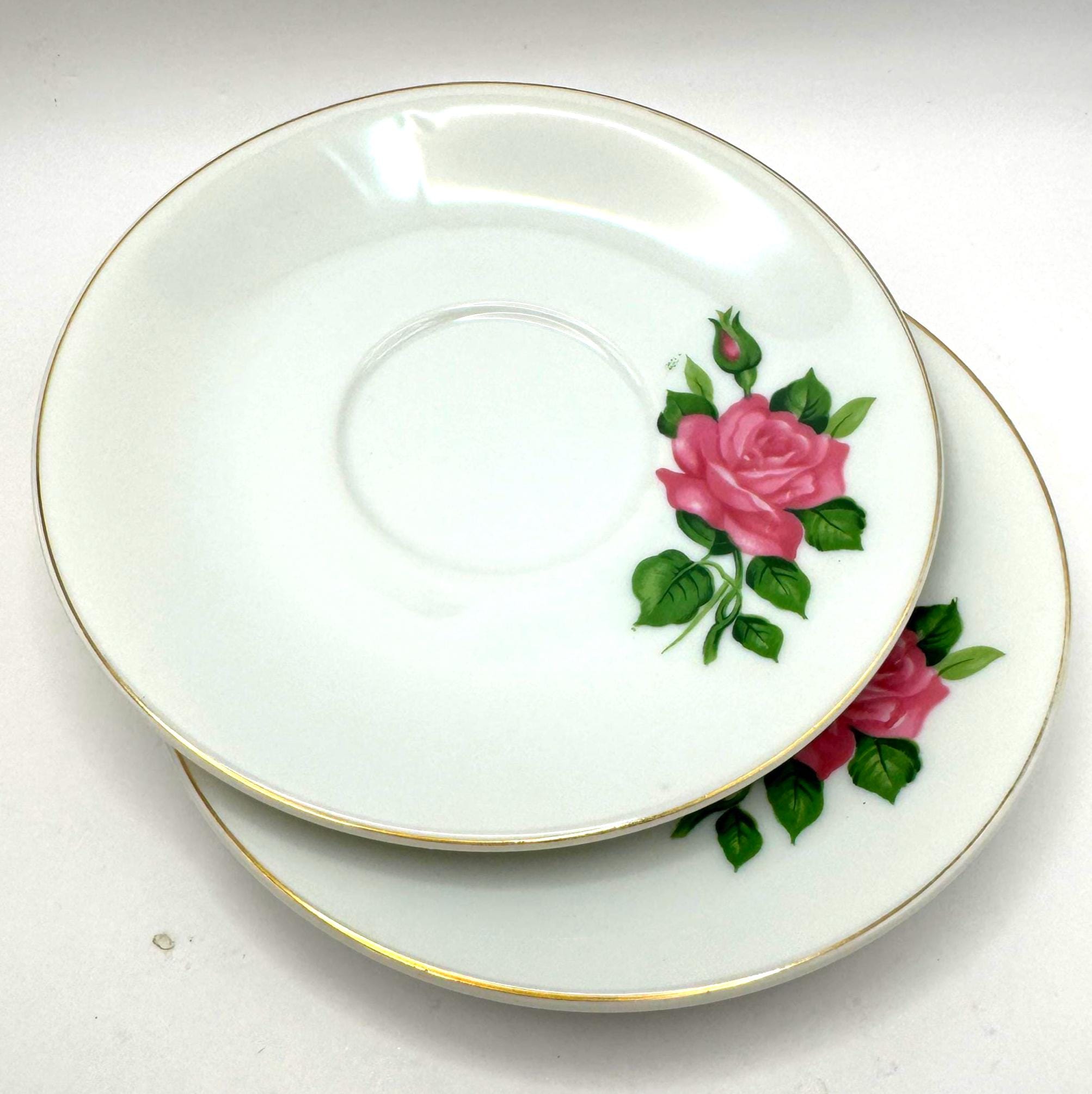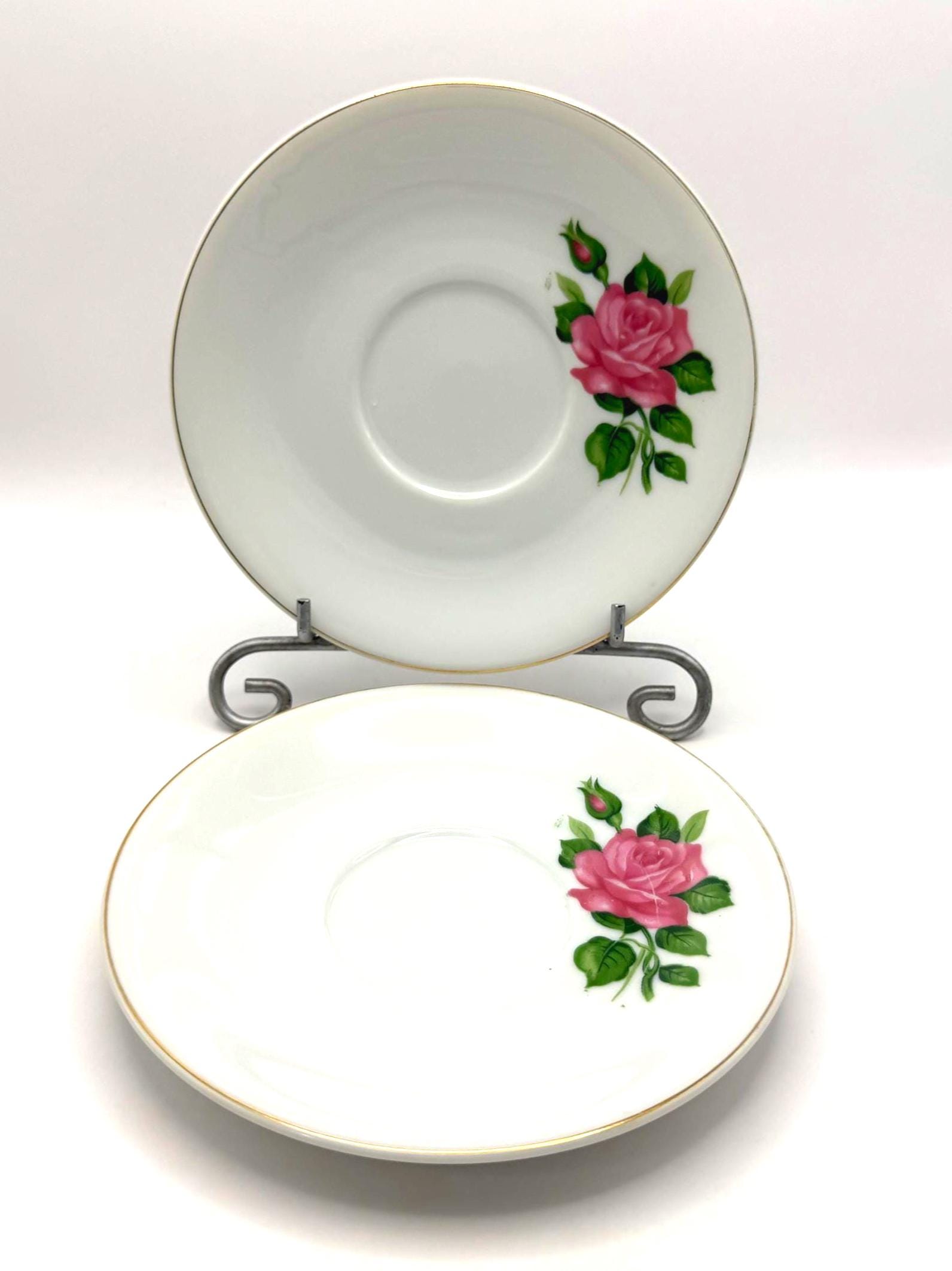 Elegant pair of vintage porcelain saucers featuring soft pink rose blooms with green leaves, accented by fine gold trim around the rim. These mid-century saucers have a timeless romantic charm, perfect for mixing and matching with floral tea sets or displaying in a cottage style kitchen.