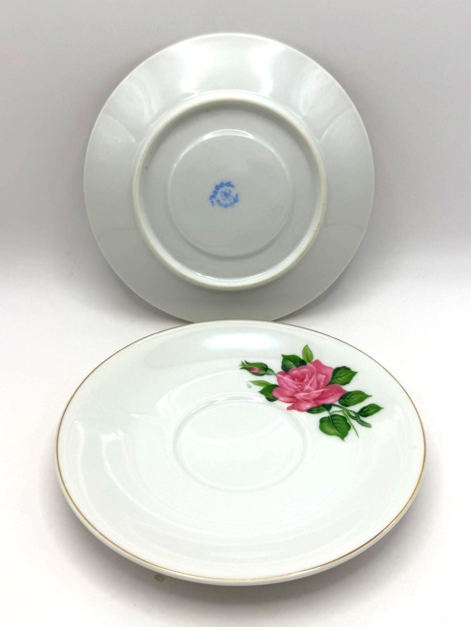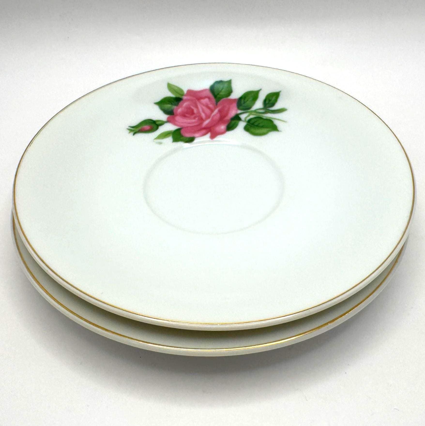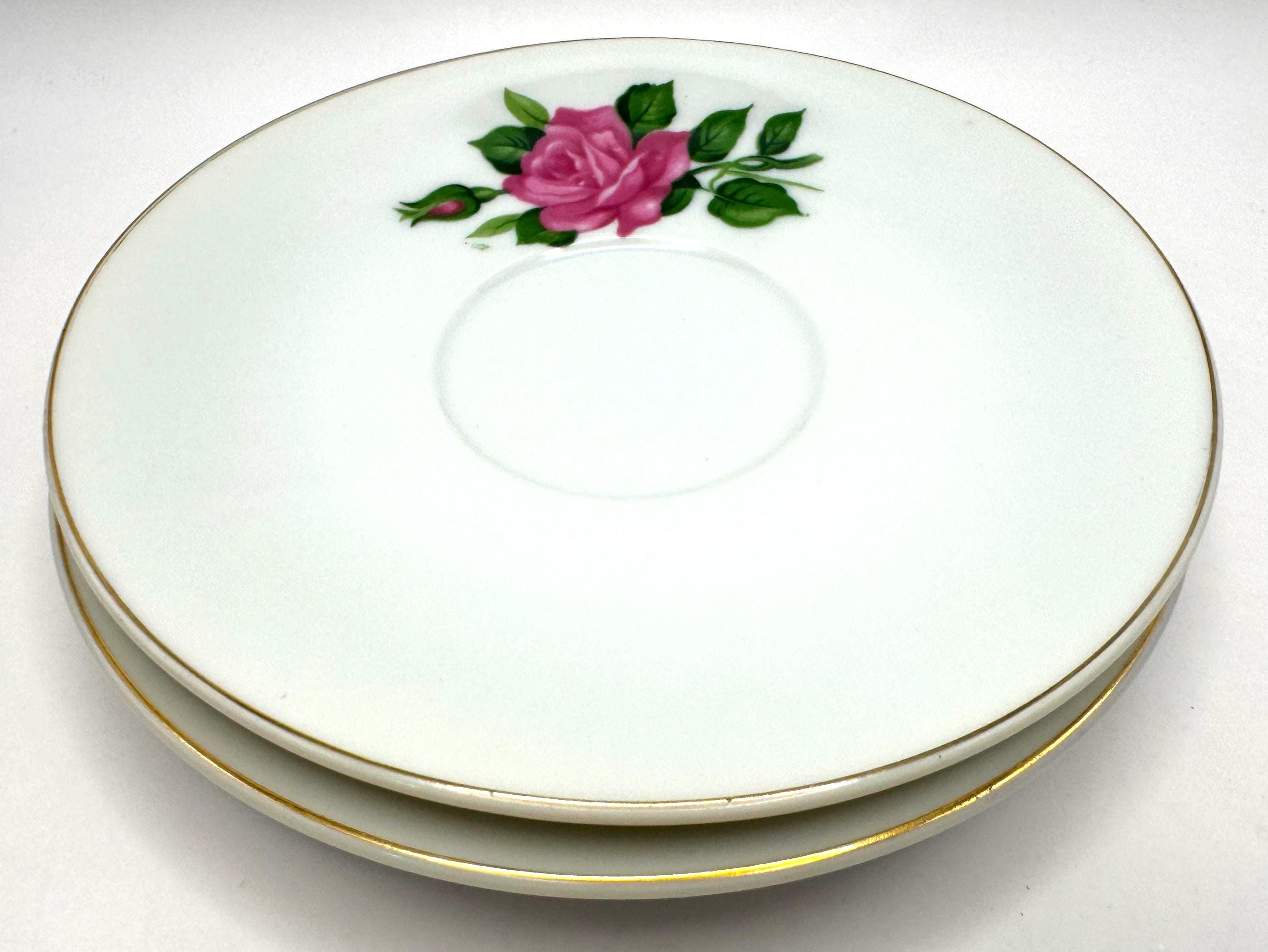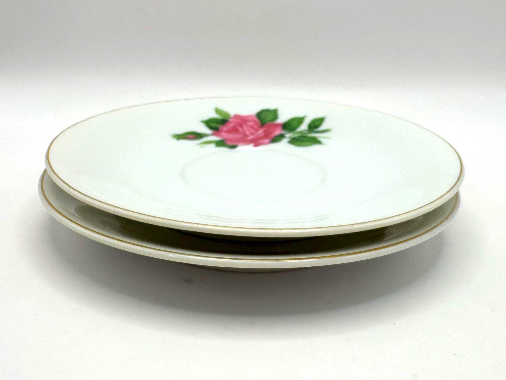 Elegant pair of vintage porcelain saucers featuring soft pink rose blooms with green leaves, accented by fine gold trim around the rim. These mid-century saucers have a timeless romantic charm, perfect for mixing and matching with floral tea sets or displaying in a cottage style kitchen.