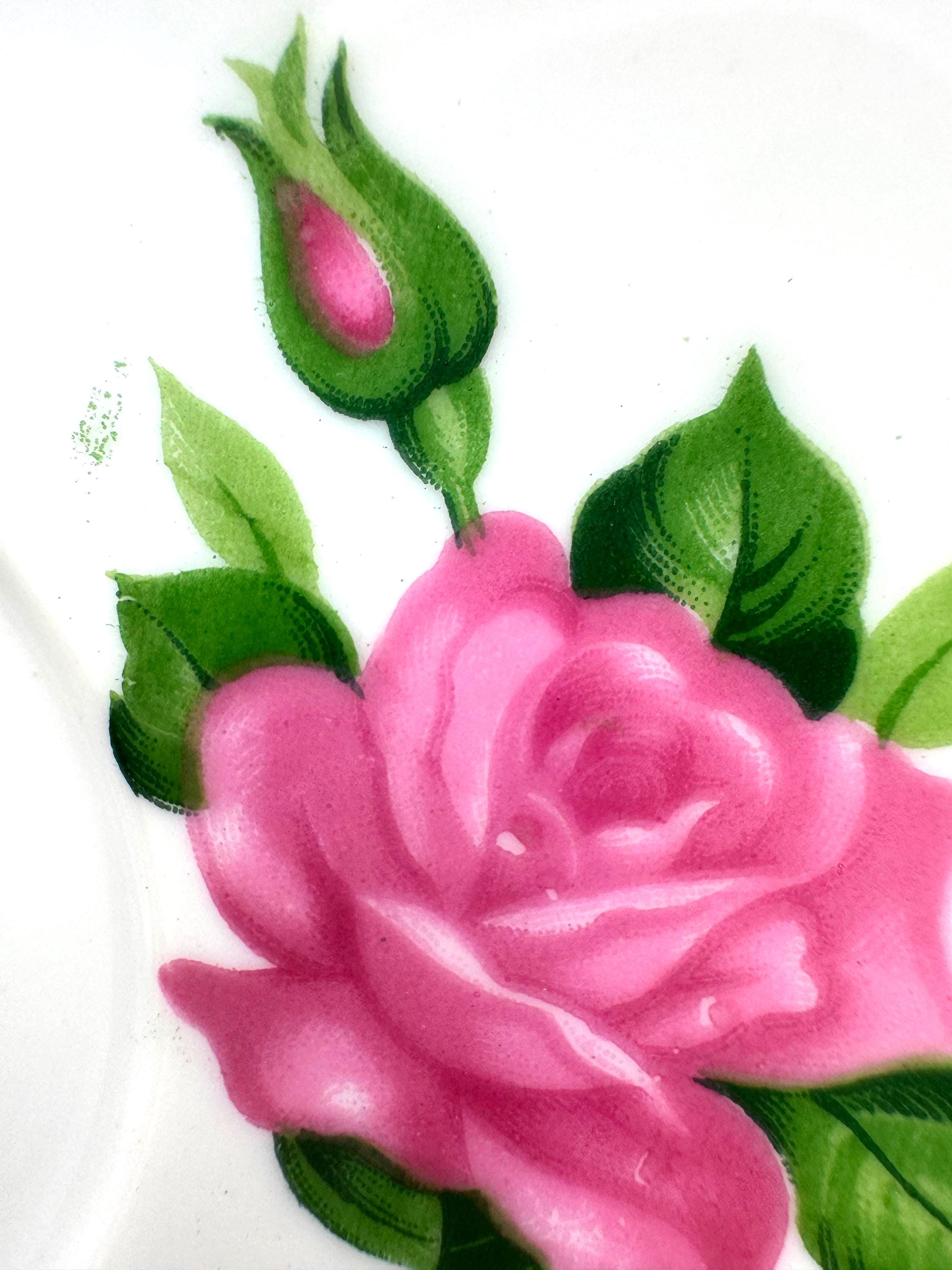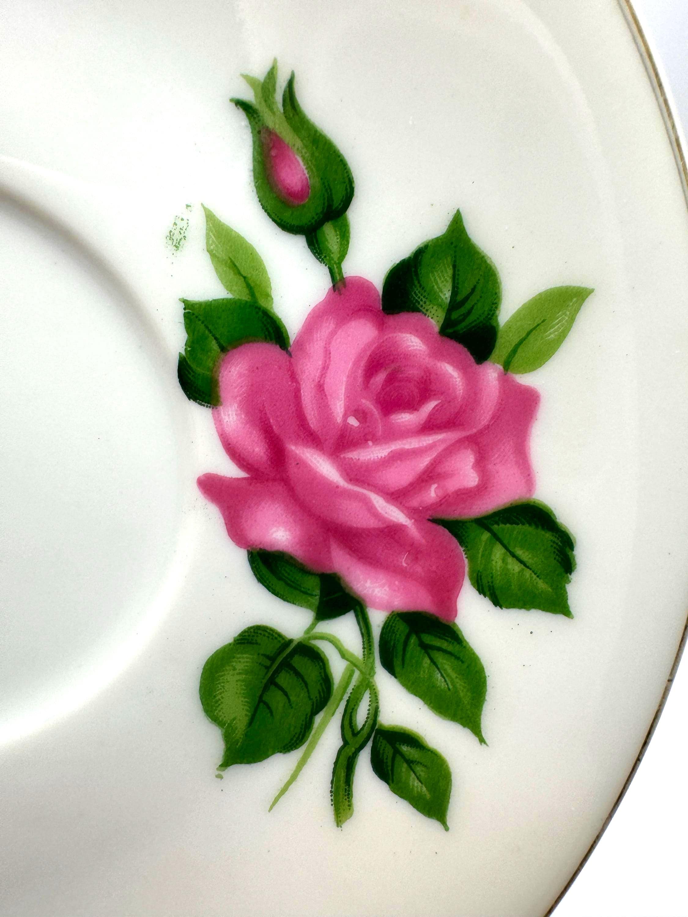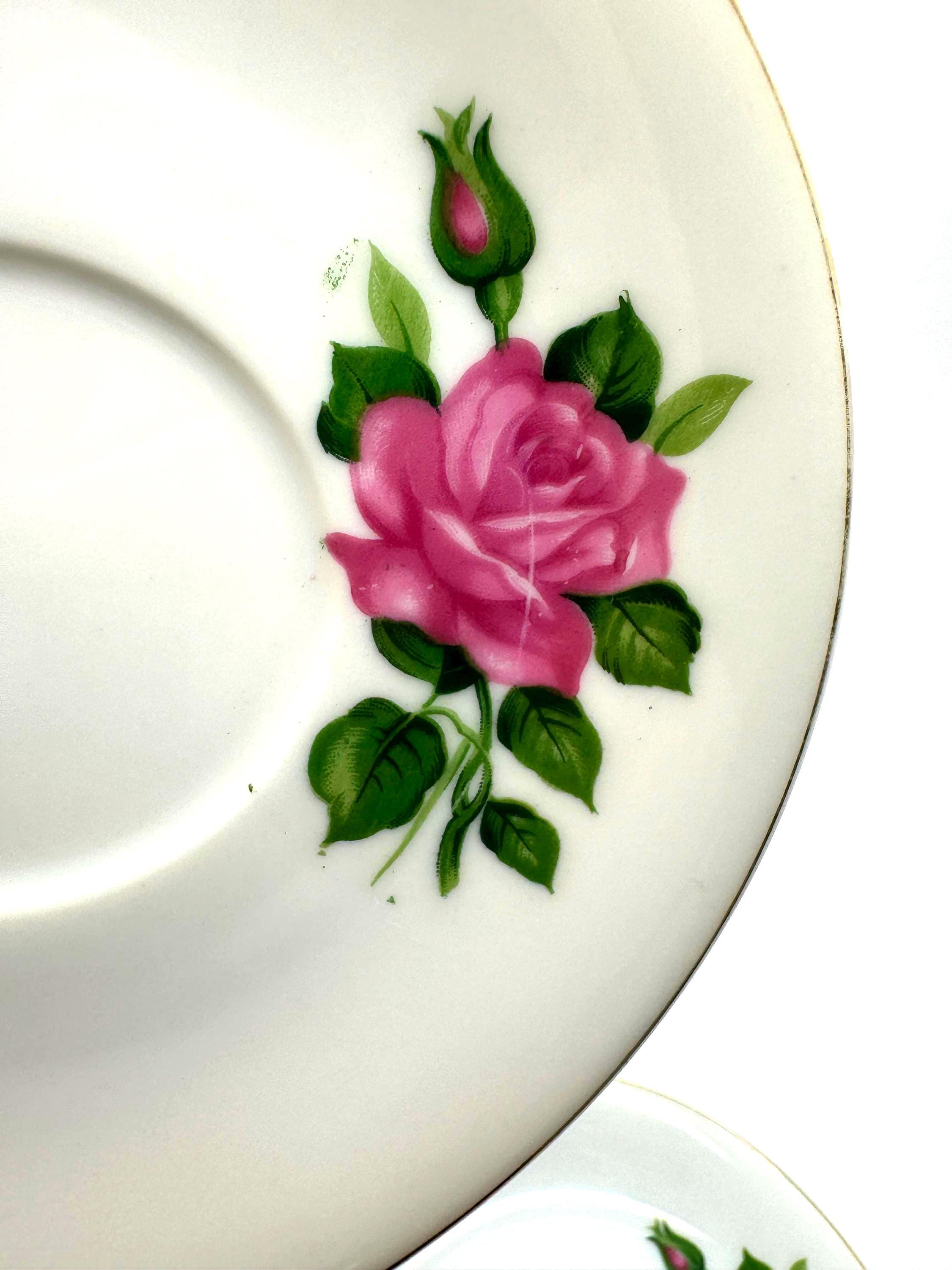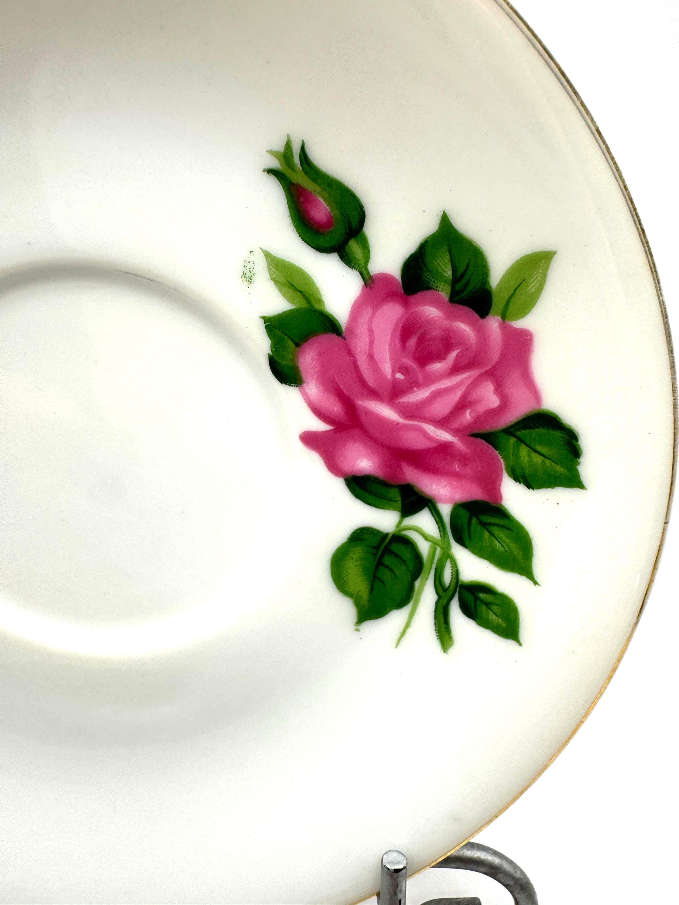 White porcelain background, delicate rose transfer, and thin gold rim capture the refined aesthetic typical of 1950s-1960s Japanese tableware.
