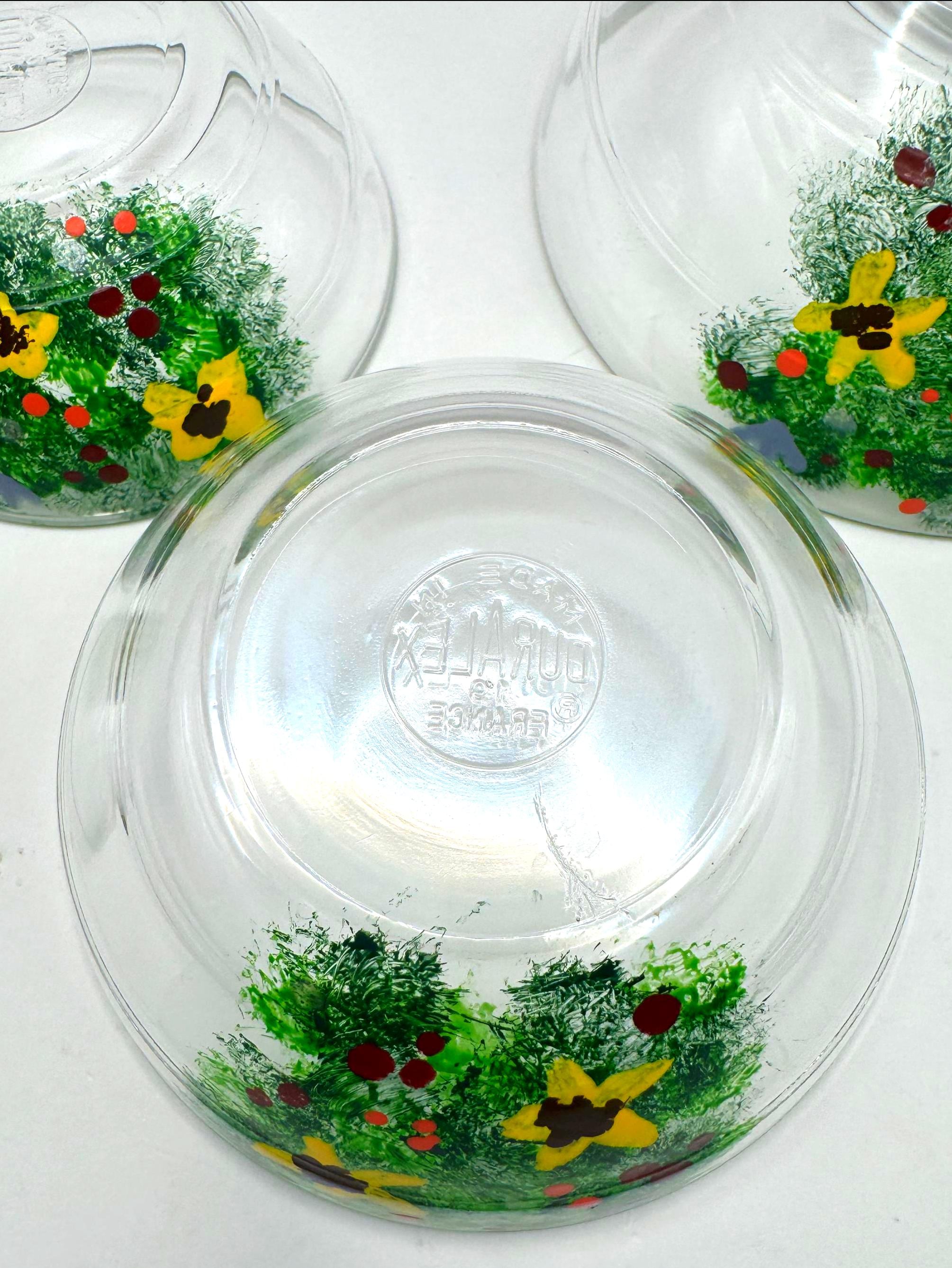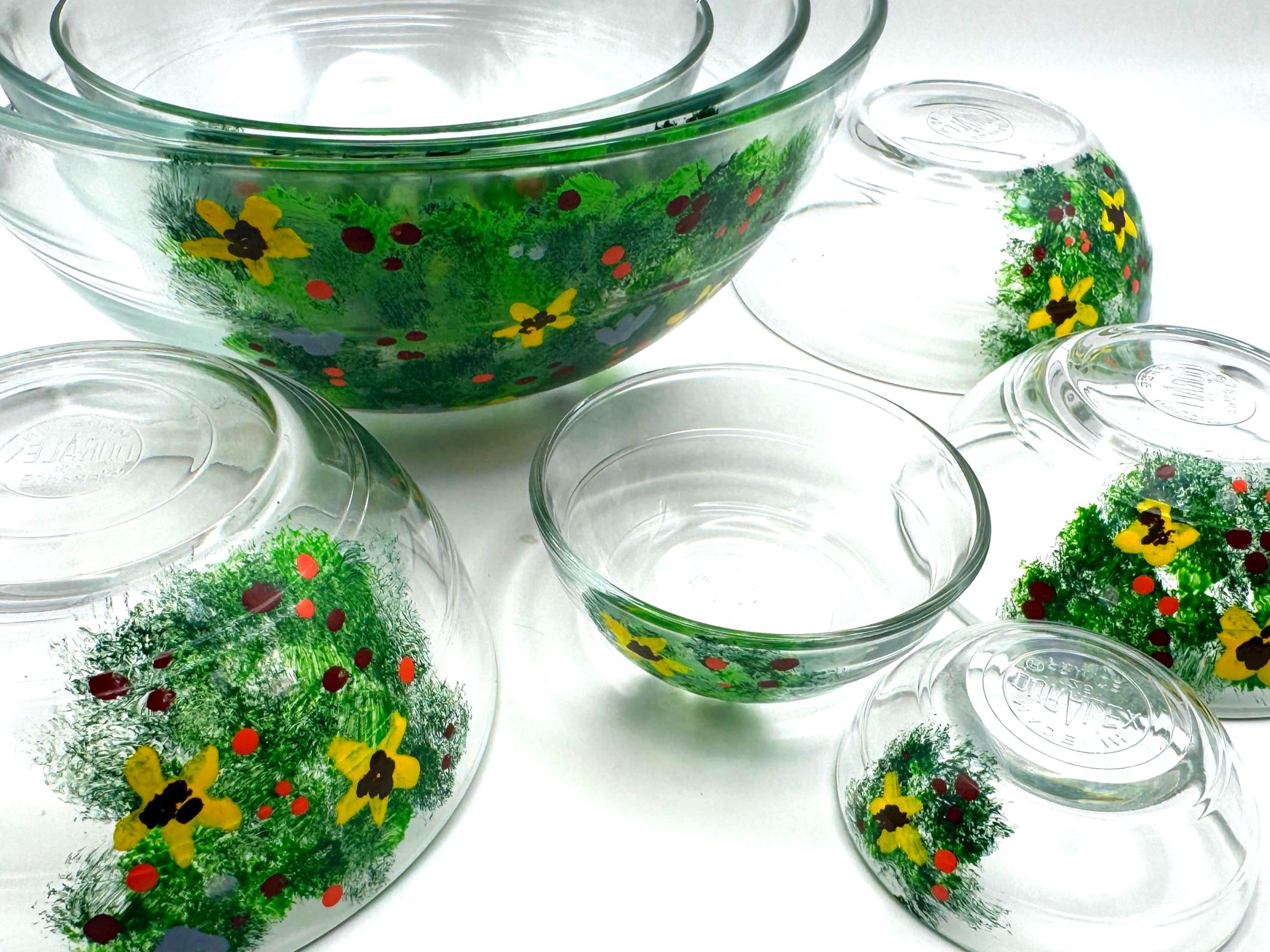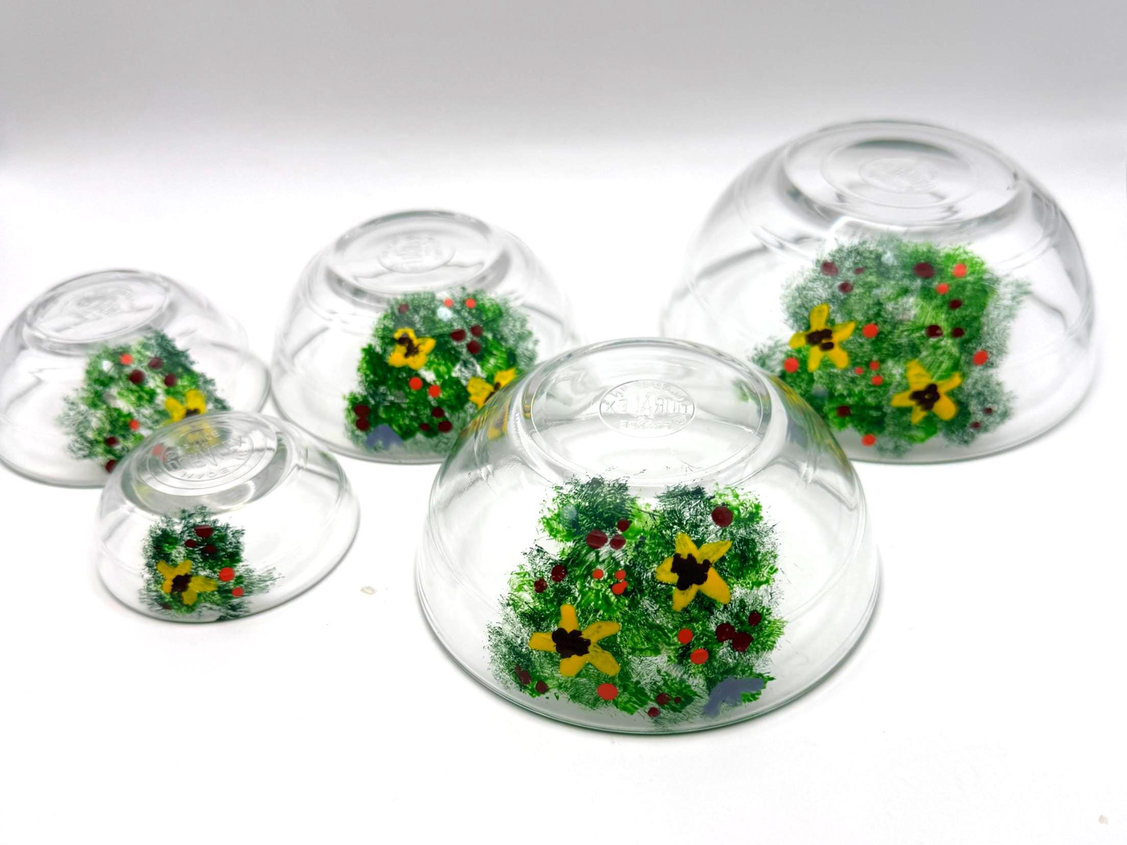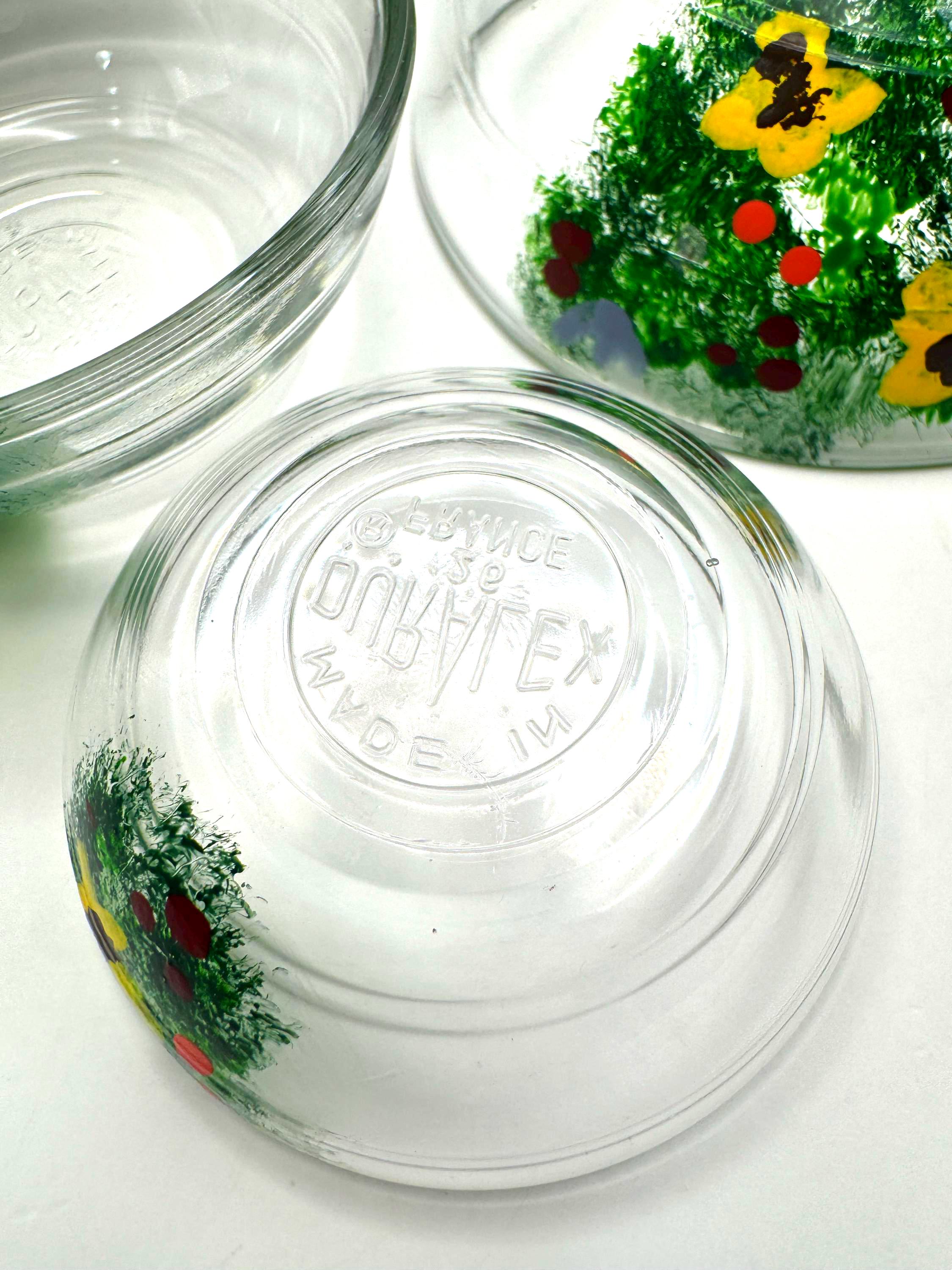 Beautiful and bold---this vintage Duraflex 8-piece nesting bowl set brings together timeless French craftsmanship with a burst of retro artistry. Each clear glass bowl features a hand-sponged floral design with bright yellow blossoms, red berry dots, and textured green brushwork---a cheerful, one-of-a-kind finish reminiscent of 1970s hobbyist artistry.