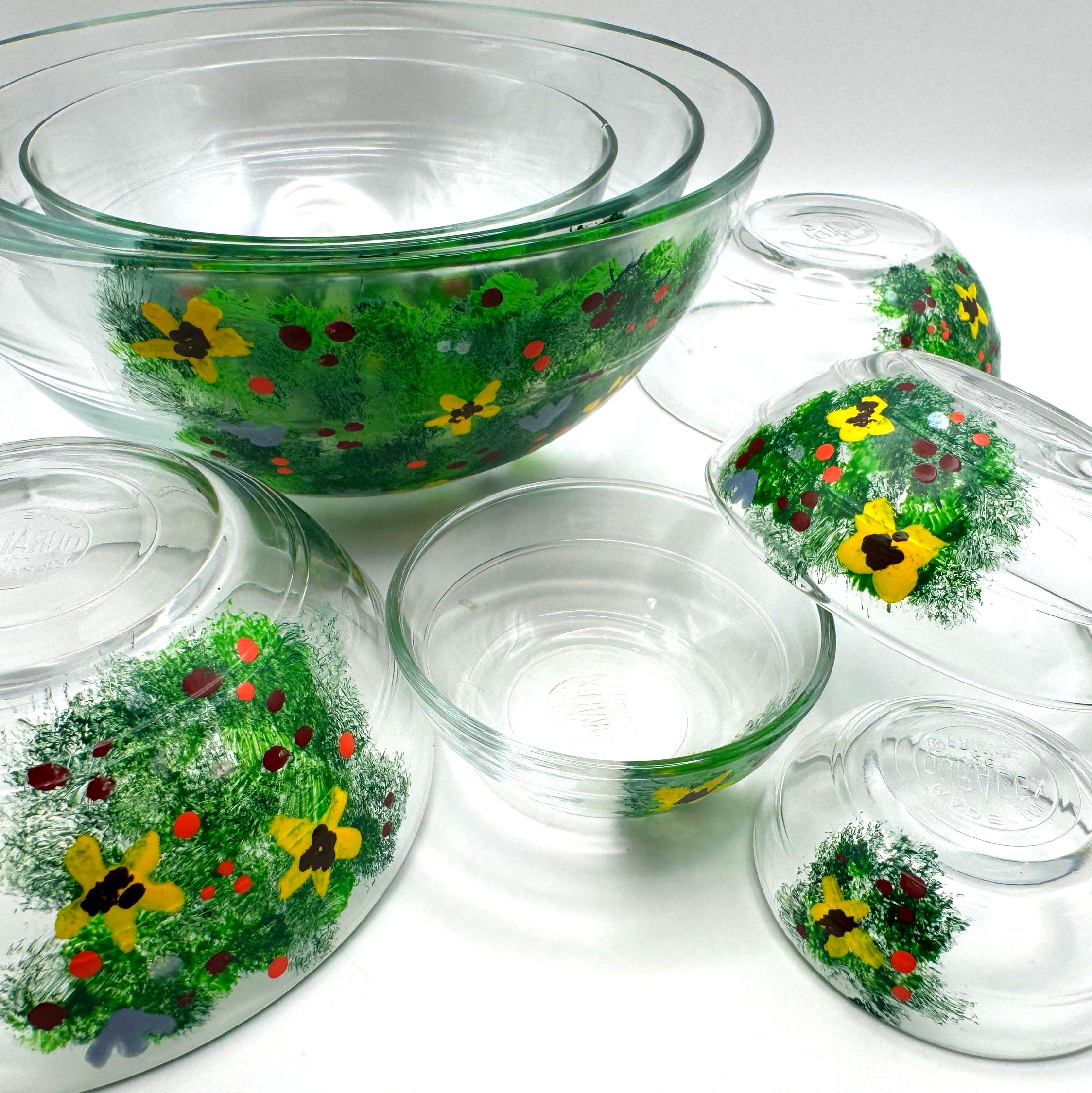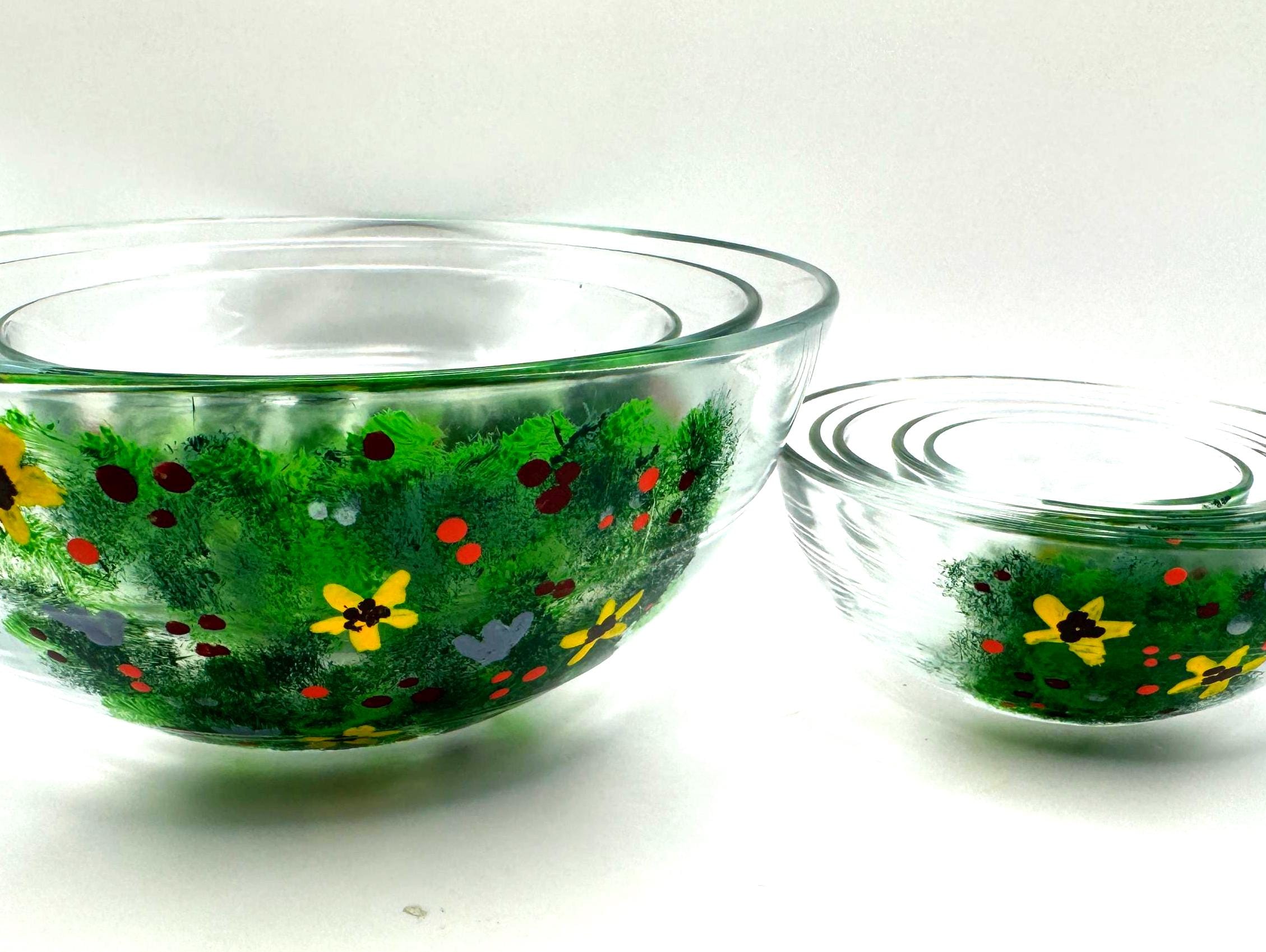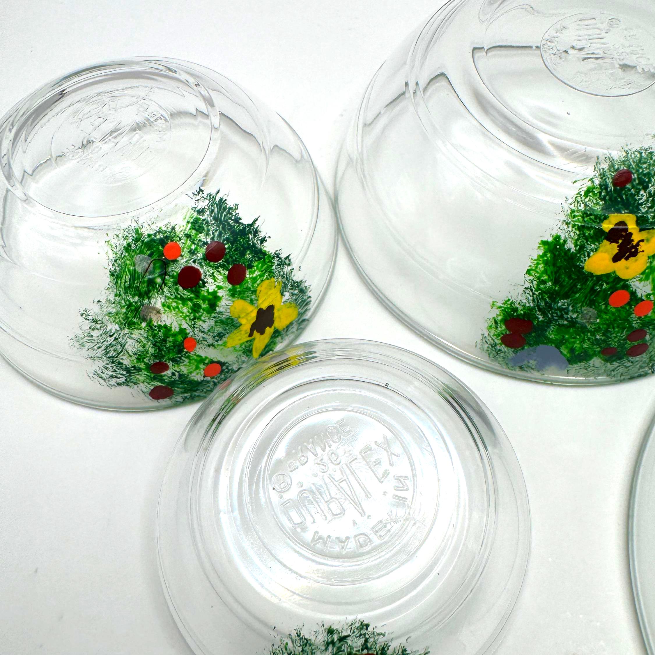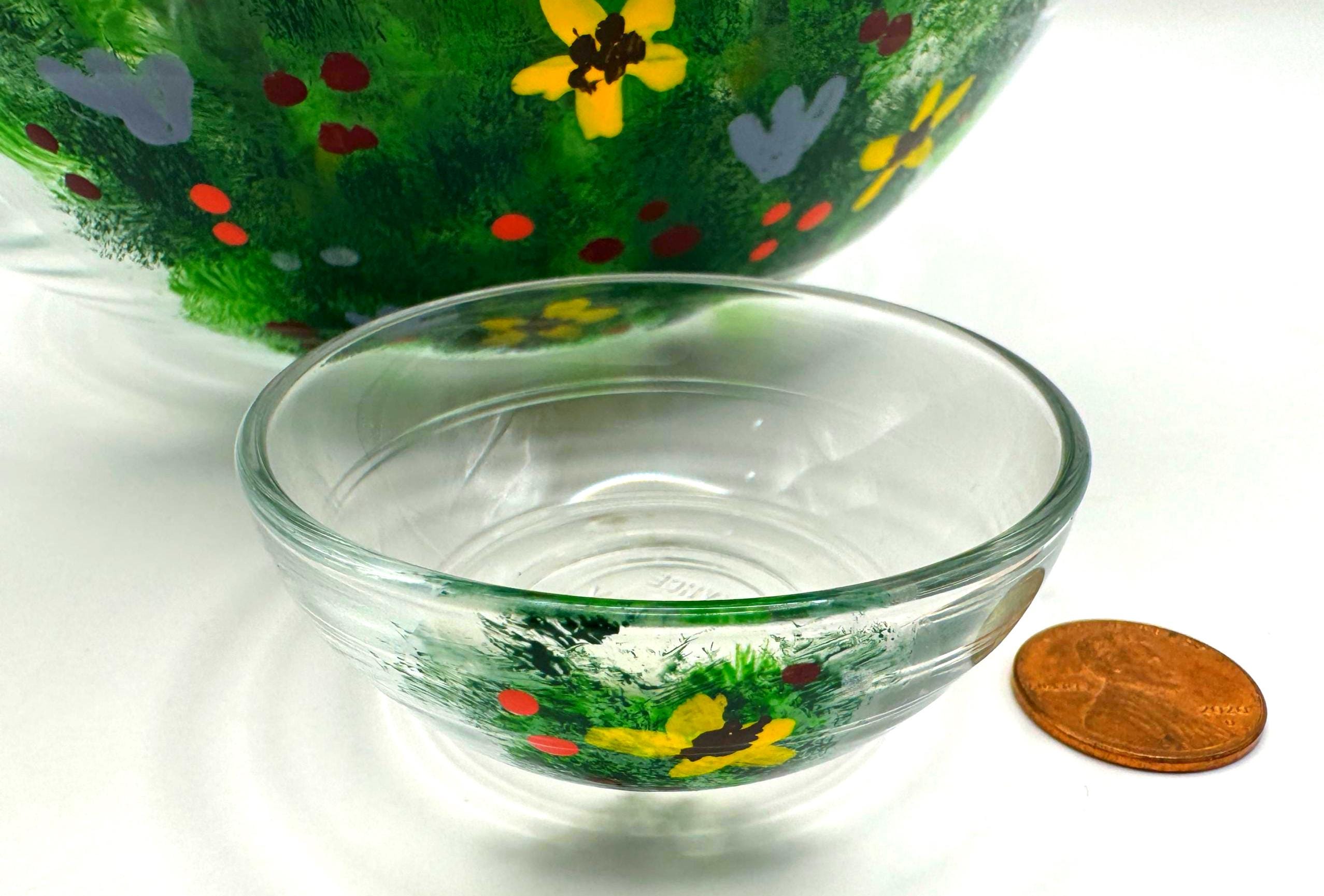 Beautiful and bold---this vintage Duraflex 8-piece nesting bowl set brings together timeless French craftsmanship with a burst of retro artistry. Each clear glass bowl features a hand-sponged floral design with bright yellow blossoms, red berry dots, and textured green brushwork---a cheerful, one-of-a-kind finish reminiscent of 1970s hobbyist artistry.