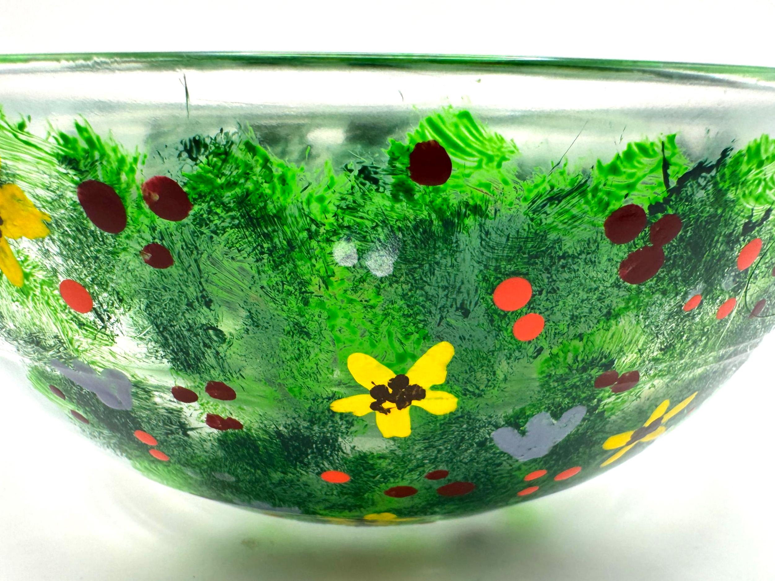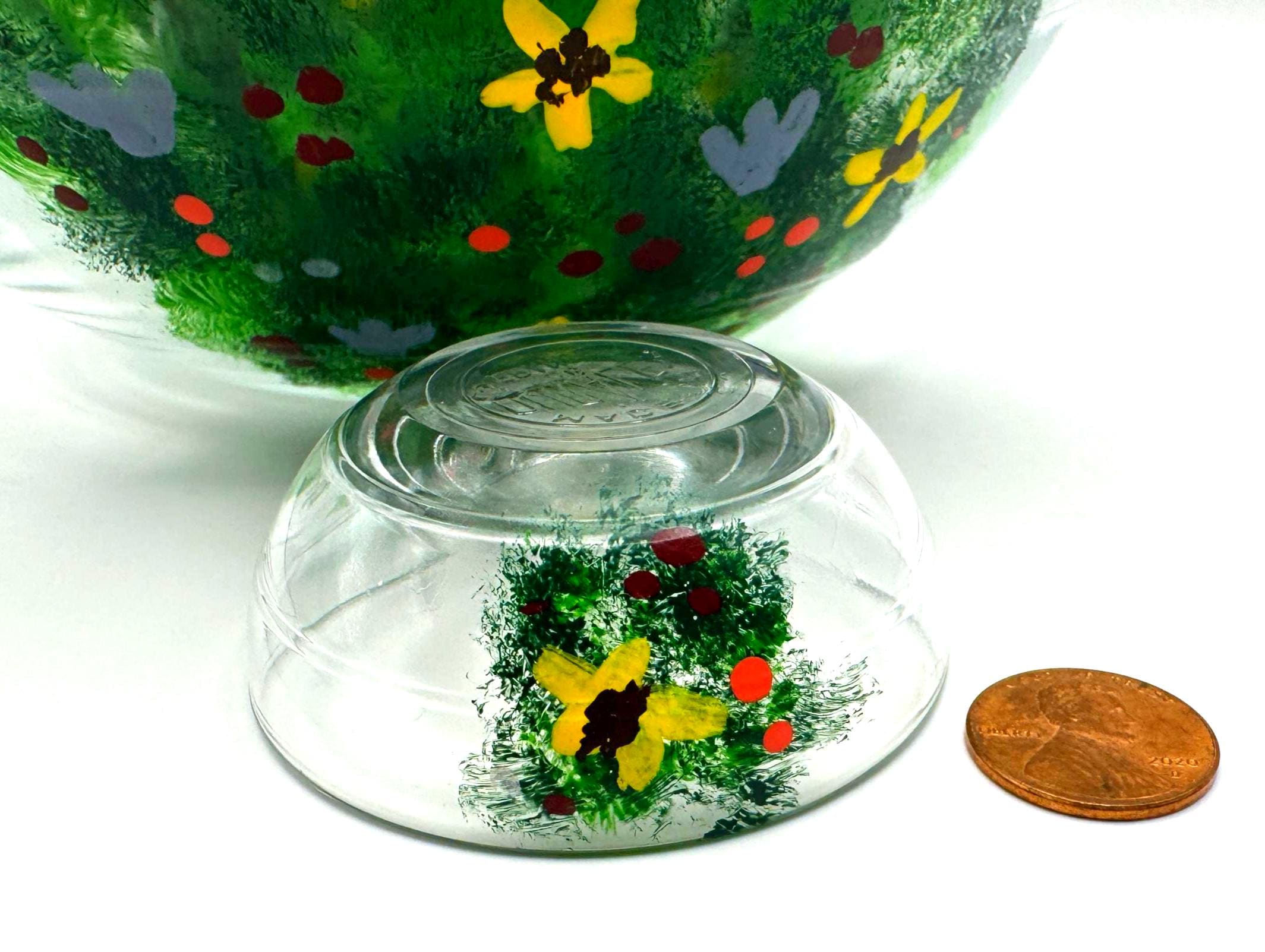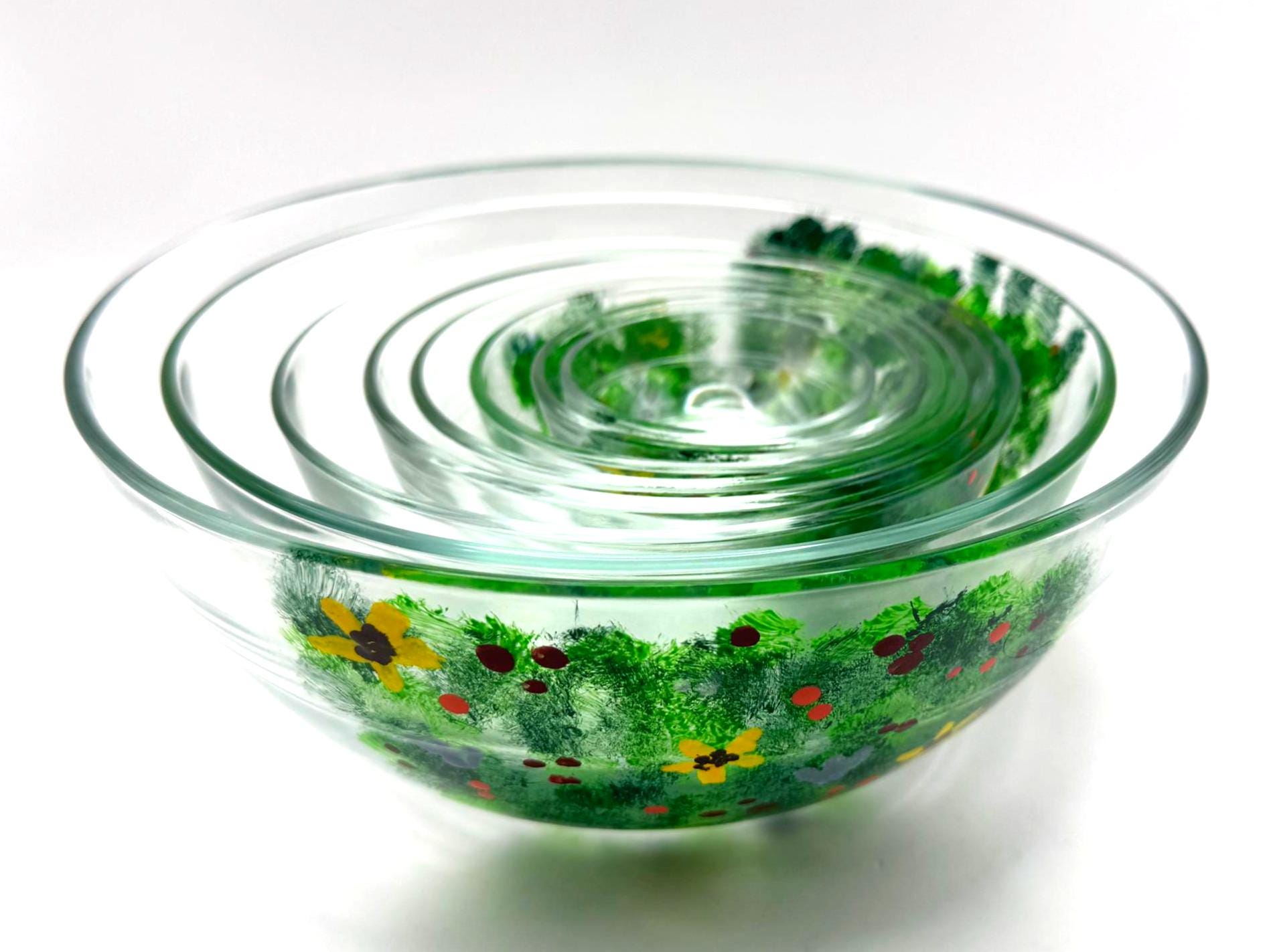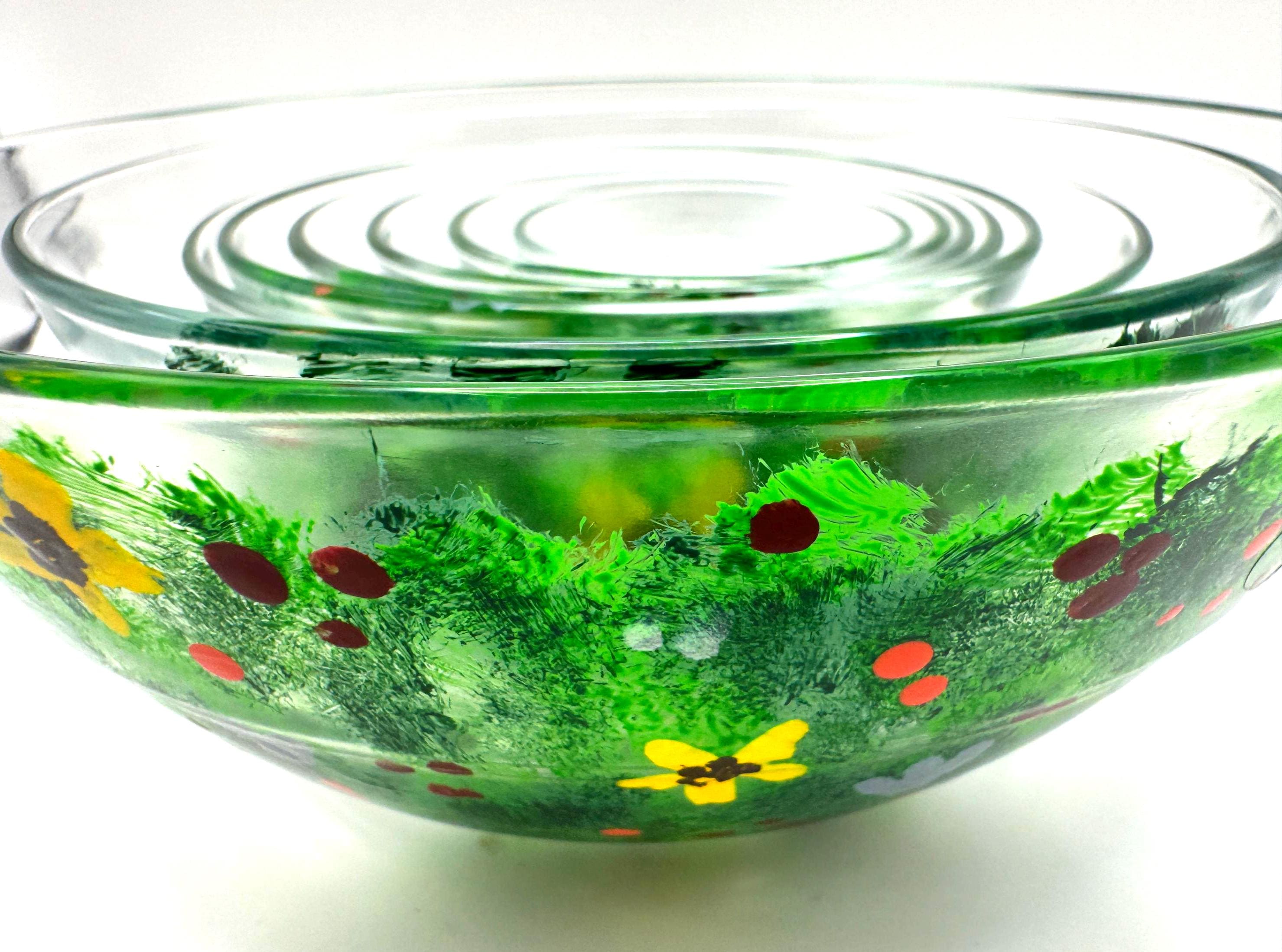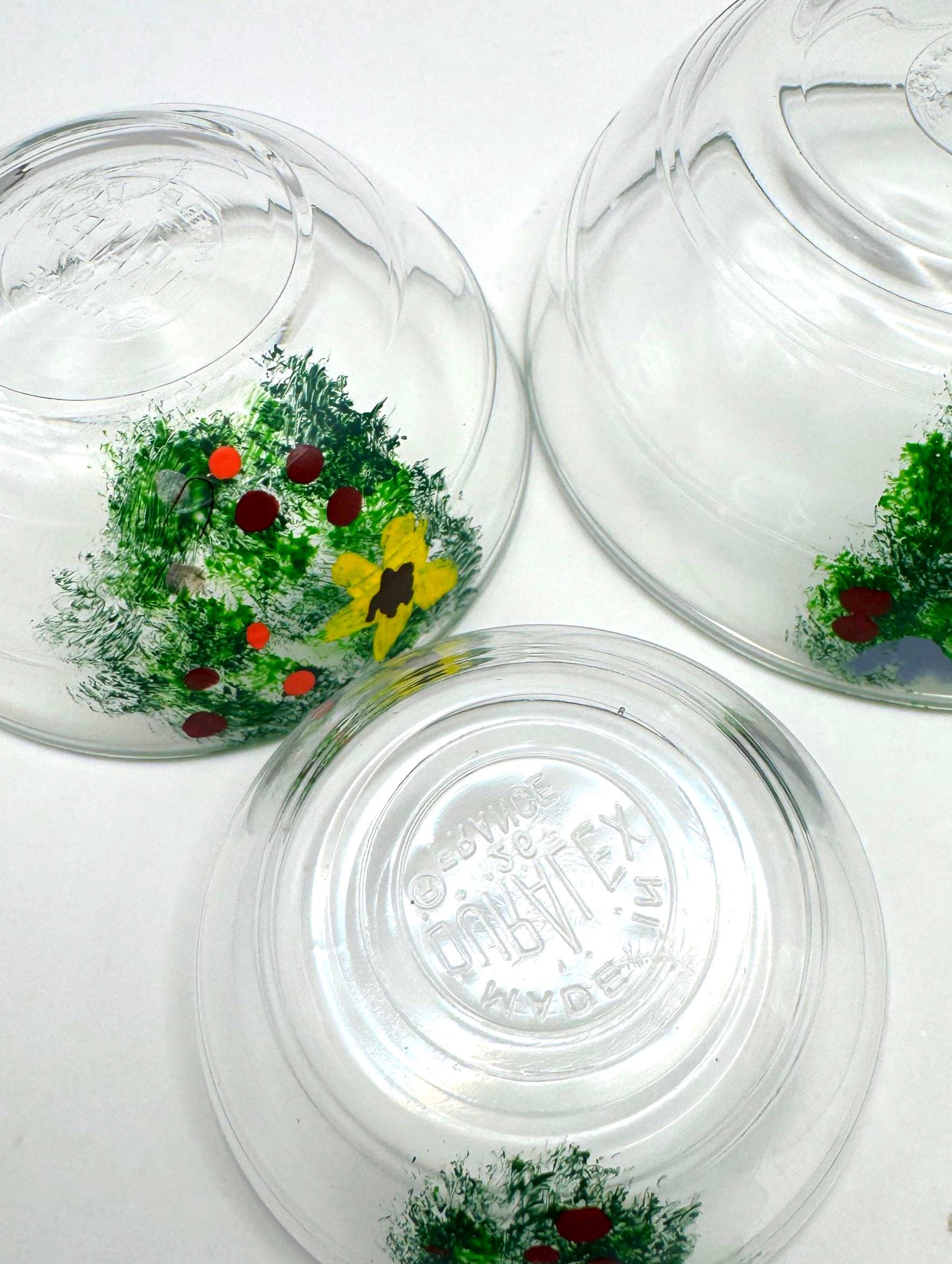 Beautiful and bold---this vintage Duraflex 8-piece nesting bowl set brings together timeless French craftsmanship with a burst of retro artistry. Each clear glass bowl features a hand-sponged floral design with bright yellow blossoms, red berry dots, and textured green brushwork---a cheerful, one-of-a-kind finish reminiscent of 1970s hobbyist artistry.