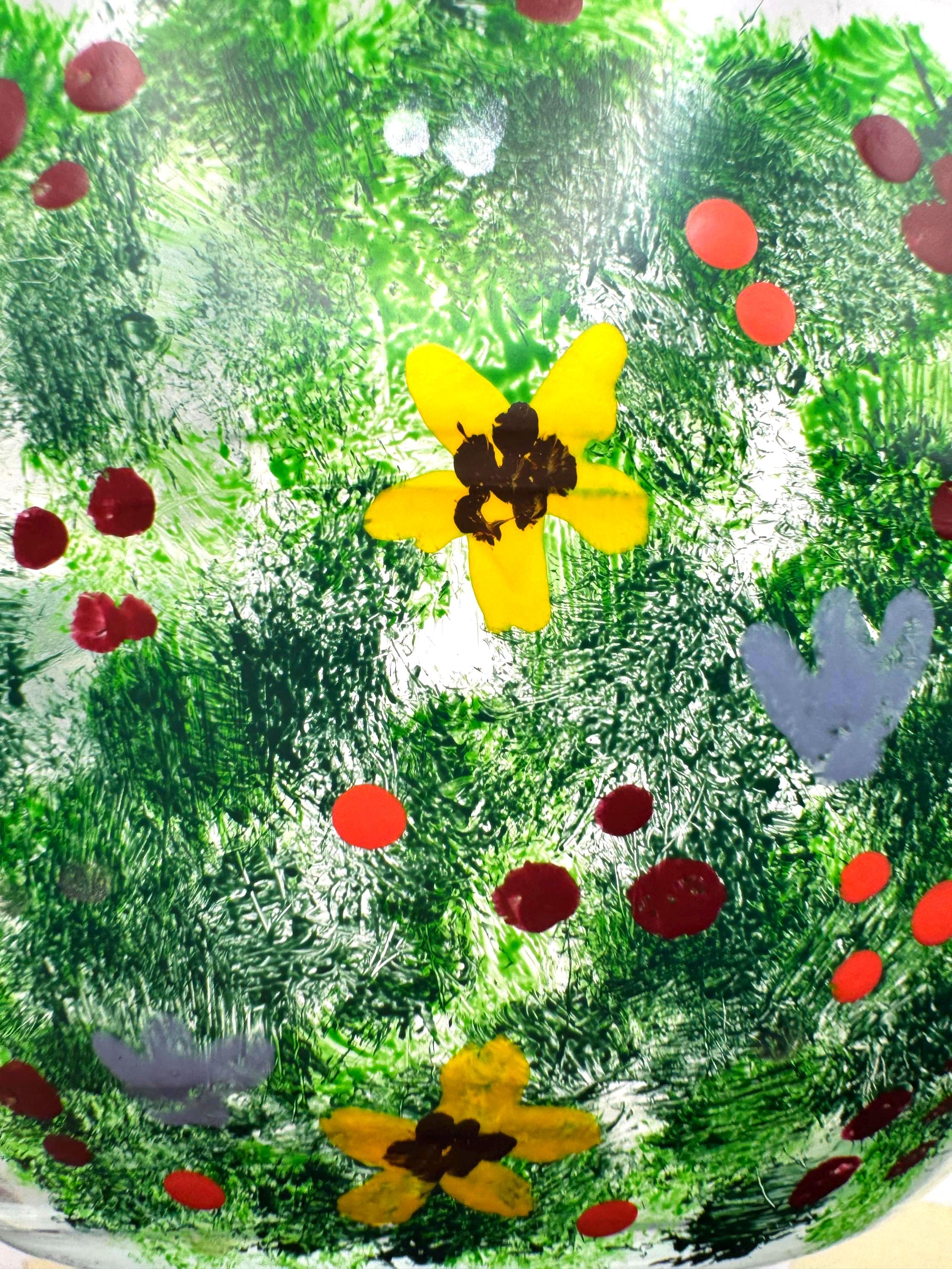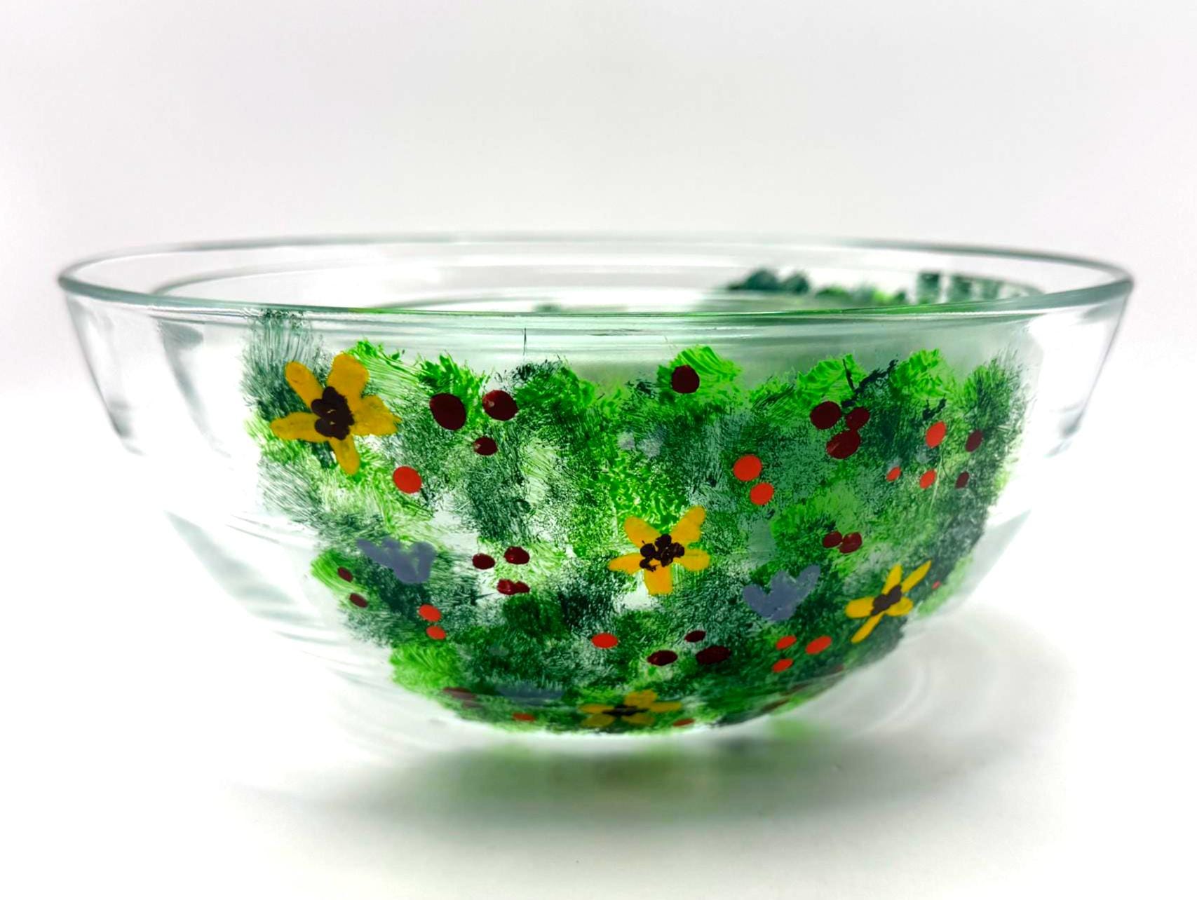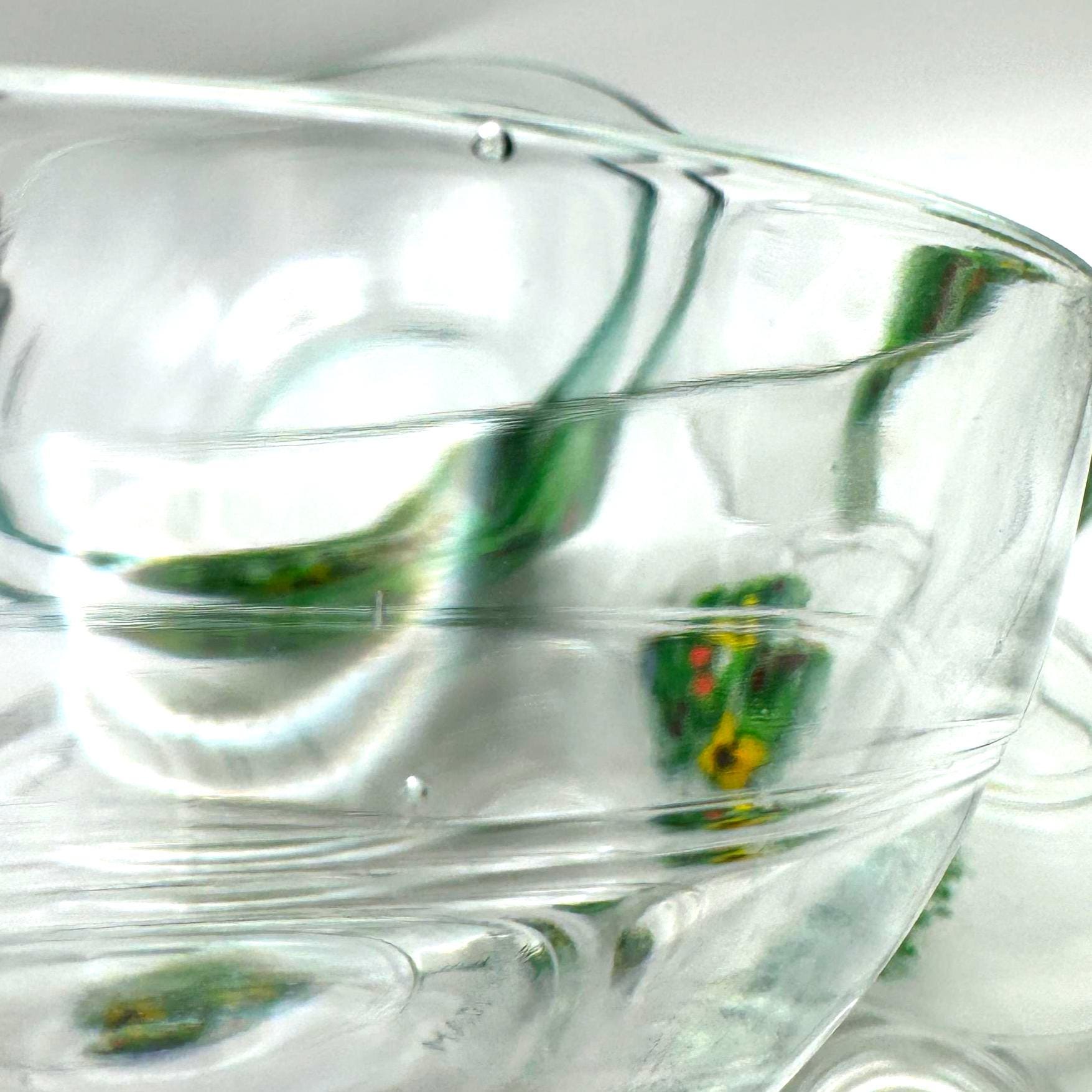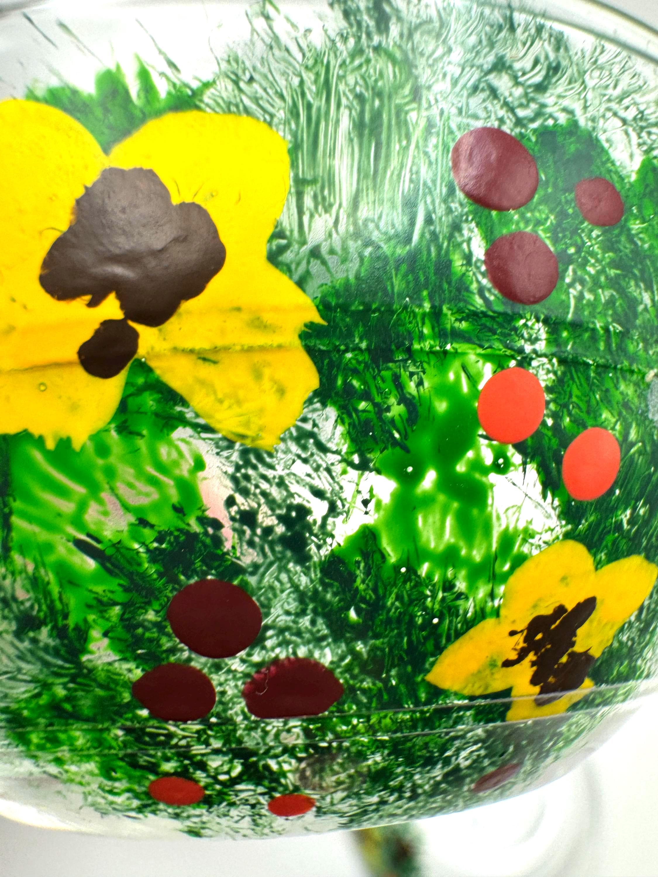 Beautiful and bold---this vintage Duraflex 8-piece nesting bowl set brings together timeless French craftsmanship with a burst of retro artistry. Each clear glass bowl features a hand-sponged floral design with bright yellow blossoms, red berry dots, and textured green brushwork---a cheerful, one-of-a-kind finish reminiscent of 1970s hobbyist artistry.