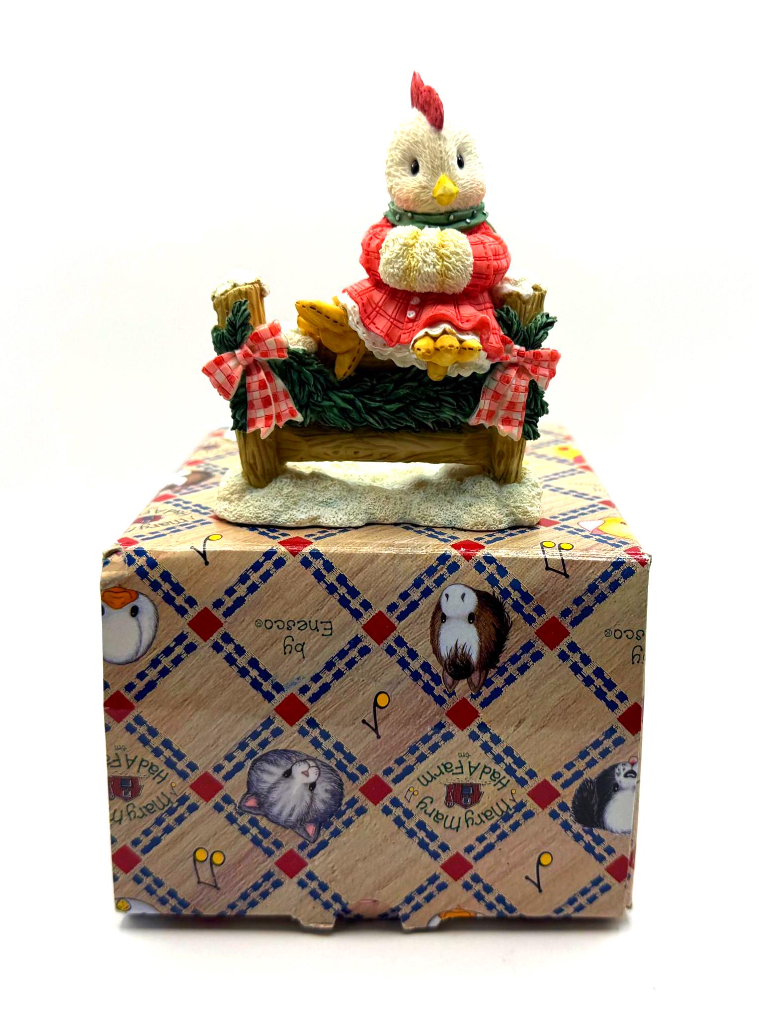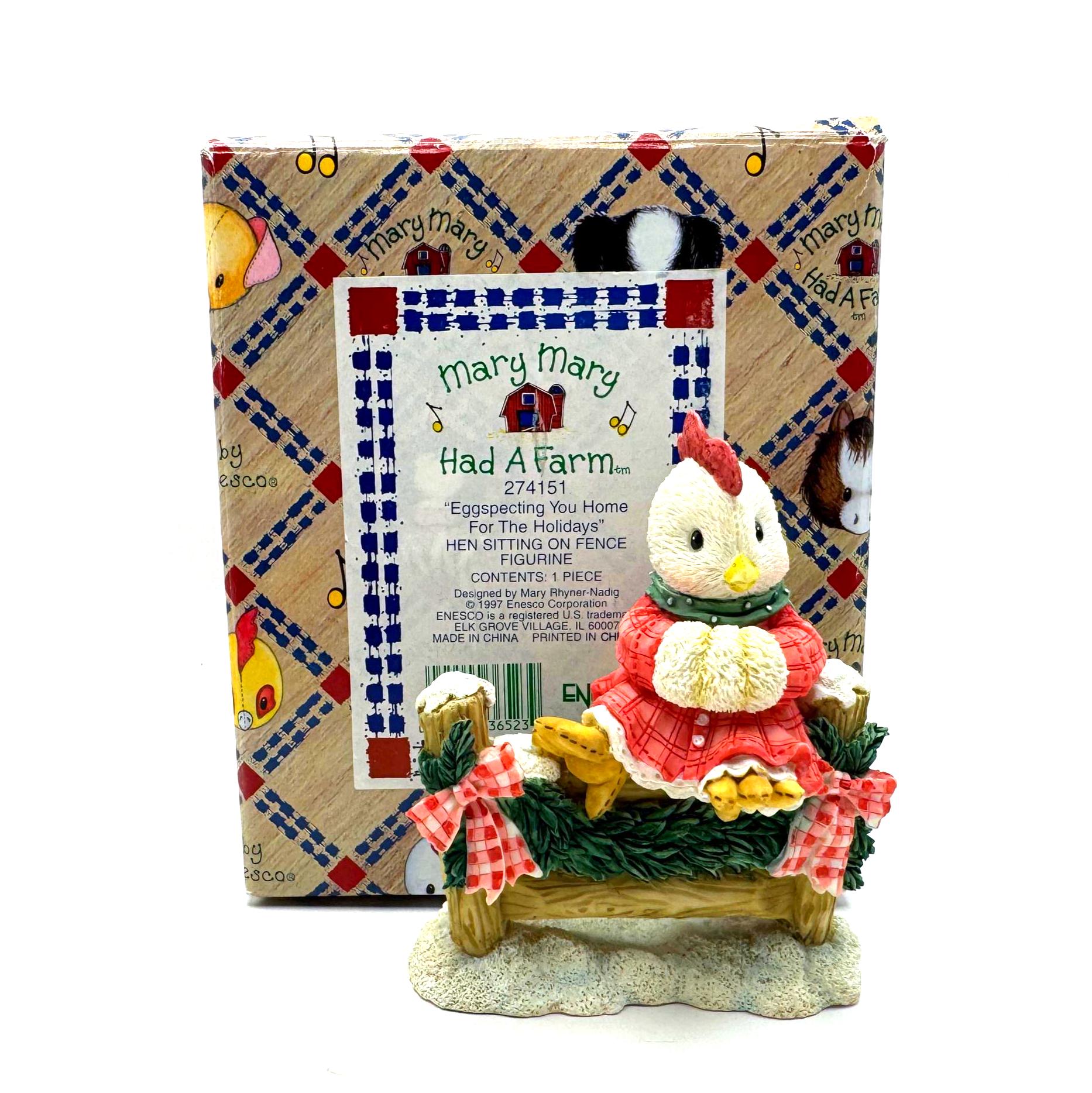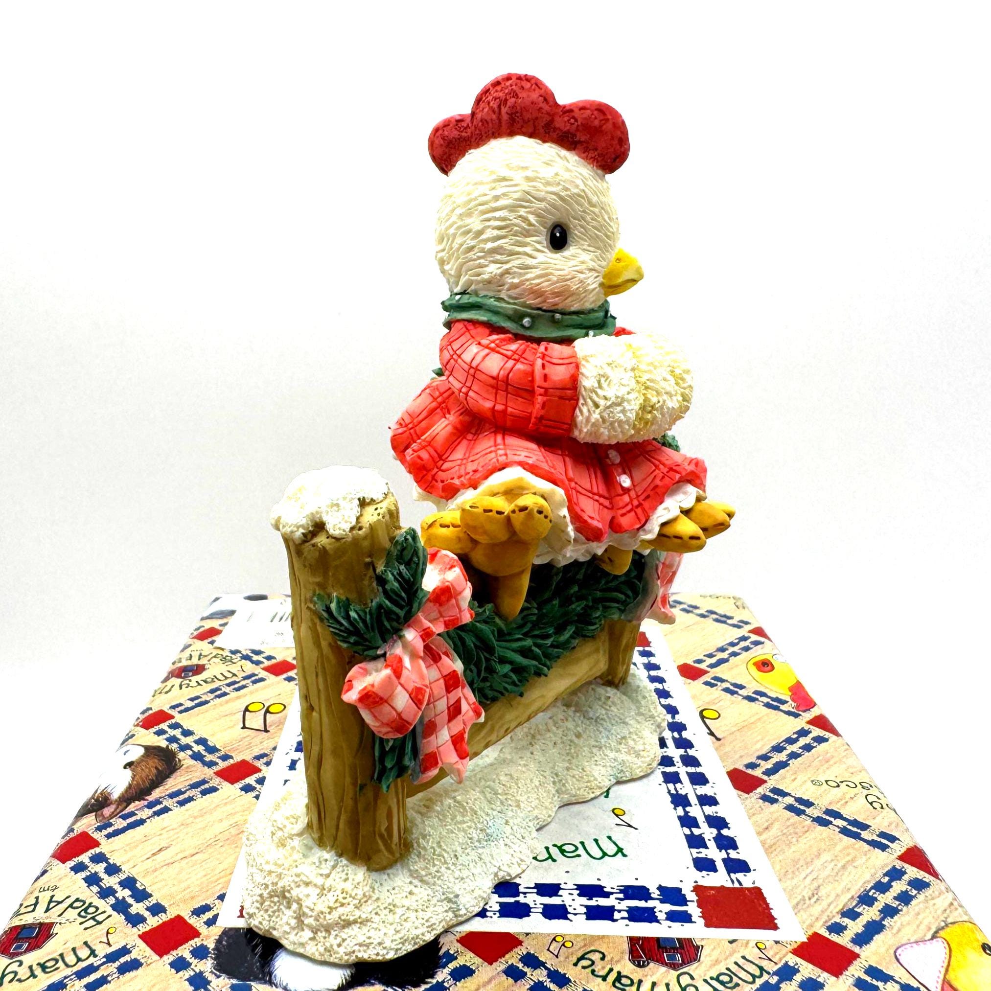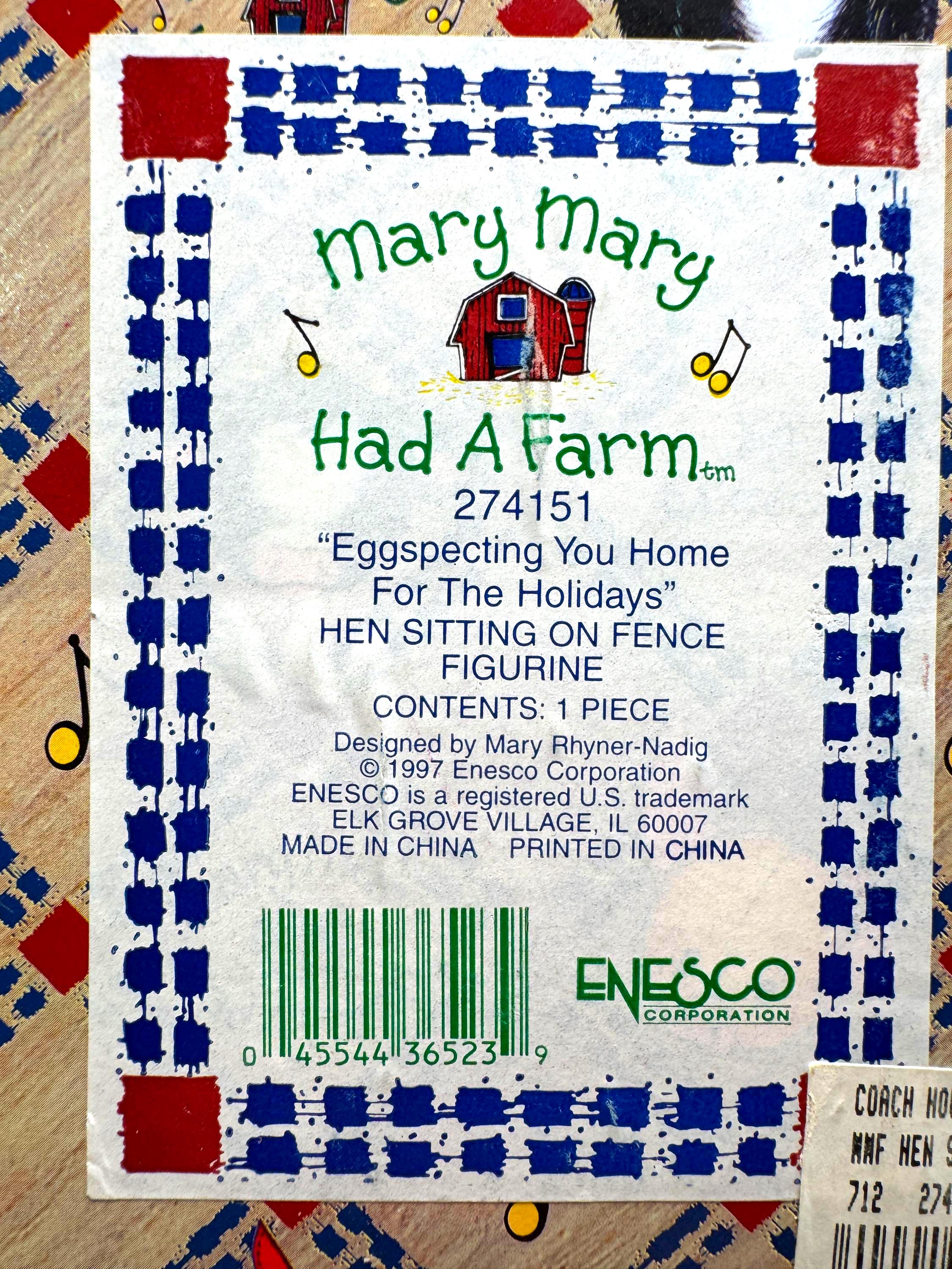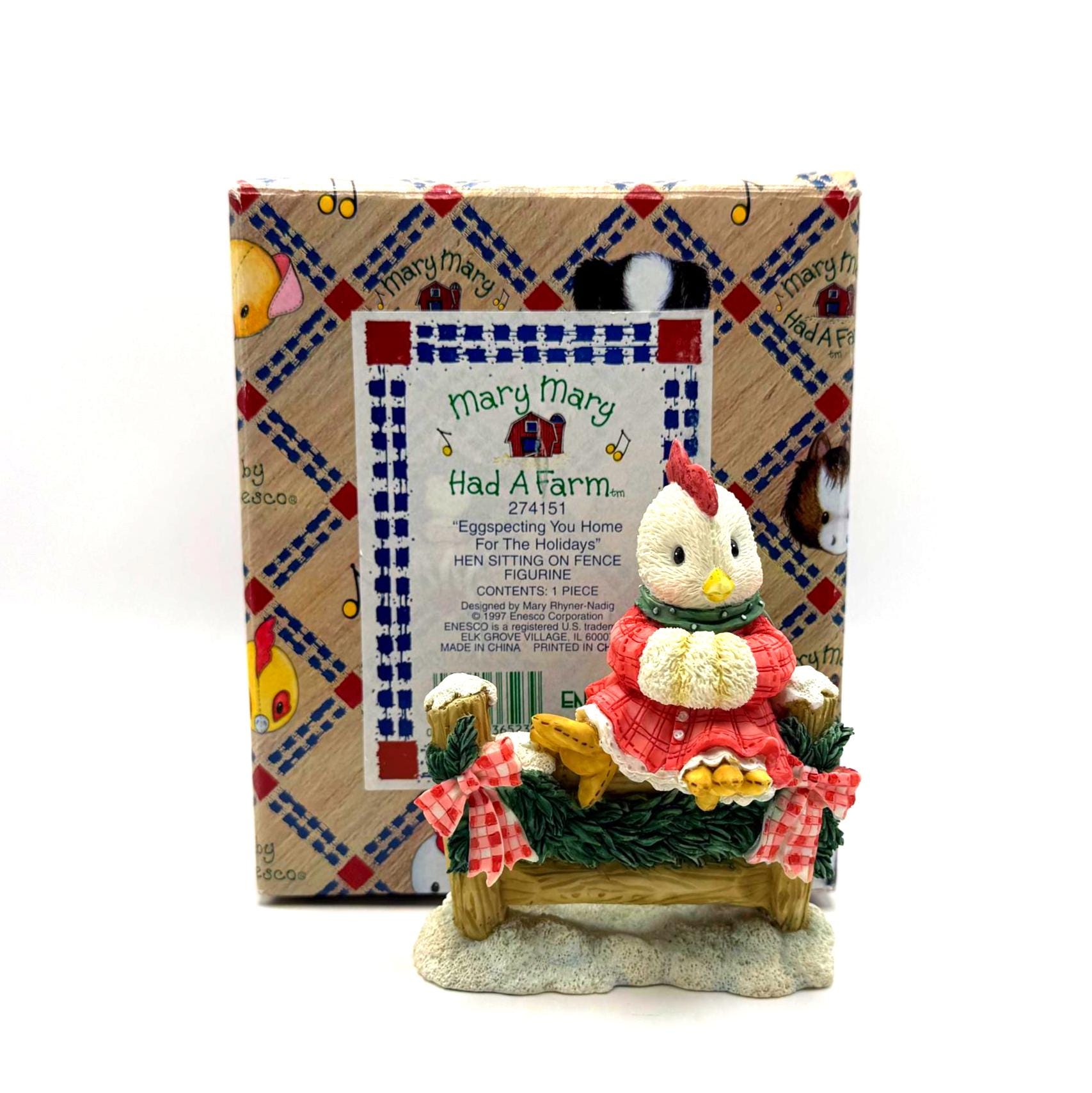 Add a touch of farmhouse charm to your holiday decor with this adorable Mary Mary Had A Farm "Eggspecting You Home for the Holidays" figurine by Enesco (1997). Designed by Mary Rhyner-Nadig, this festive collectible features a hen in a red plaid dress perched on a snow dusted fence with evergreen garland and gingham bows.