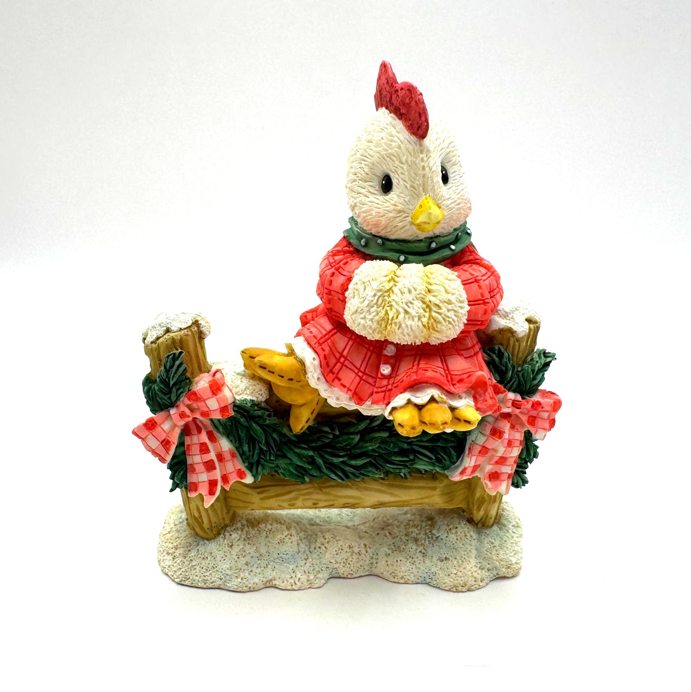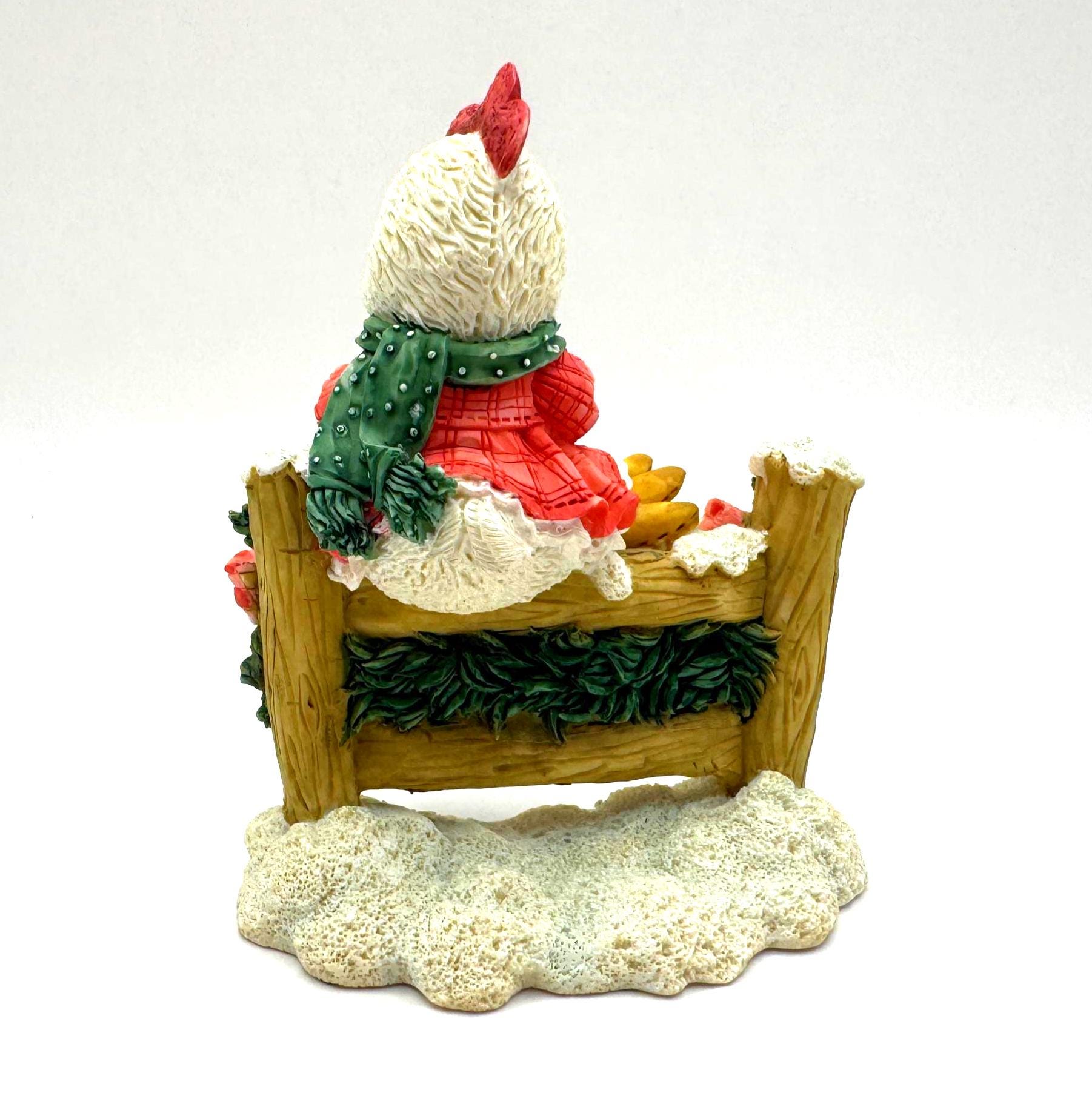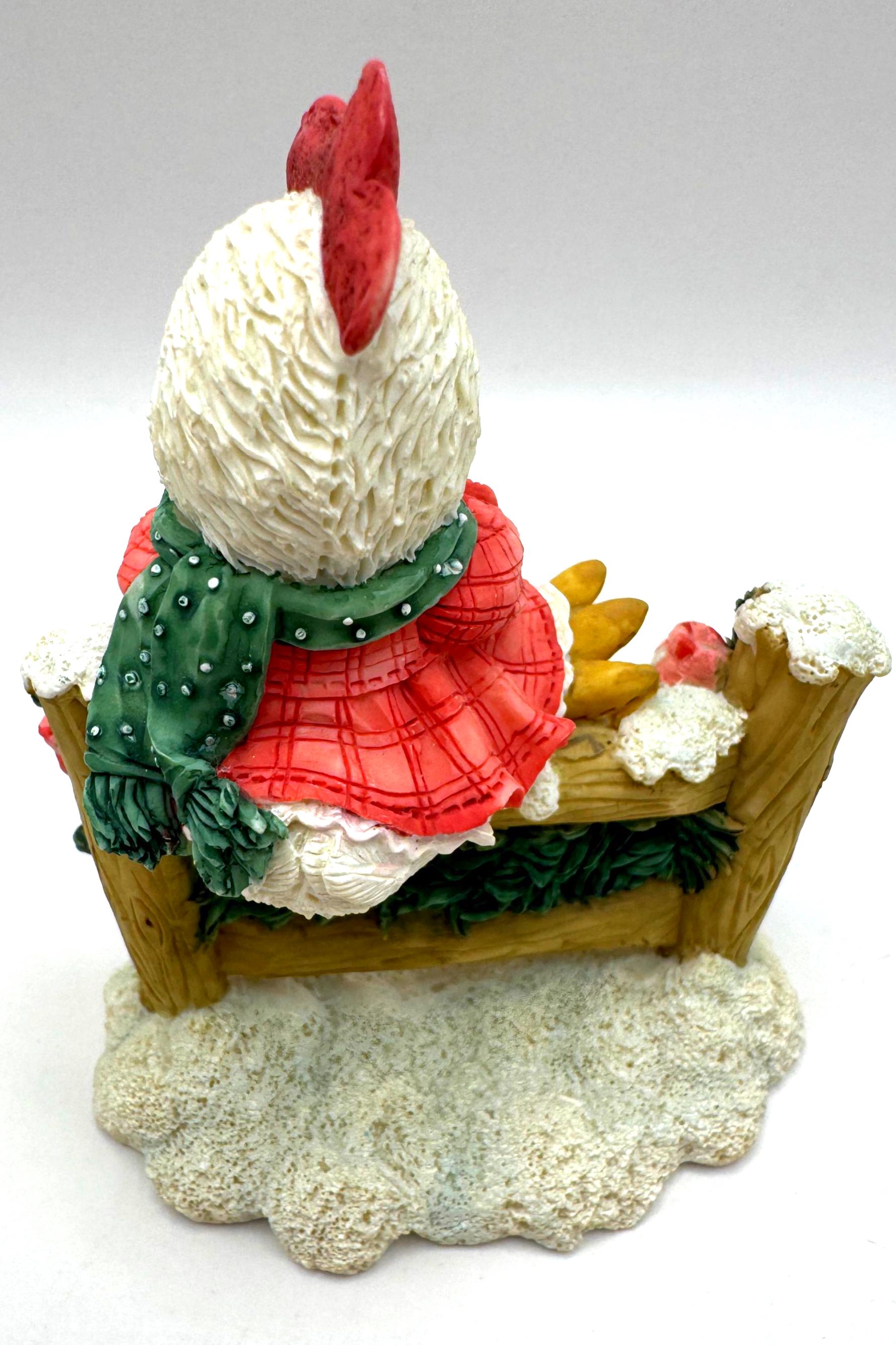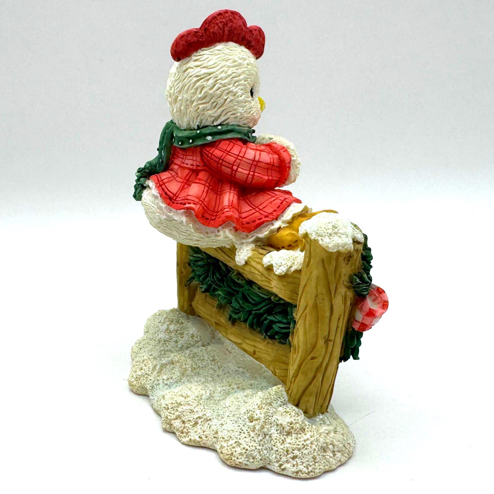 Add a touch of farmhouse charm to your holiday decor with this adorable Mary Mary Had A Farm "Eggspecting You Home for the Holidays" figurine by Enesco (1997). Designed by Mary Rhyner-Nadig, this festive collectible features a hen in a red plaid dress perched on a snow dusted fence with evergreen garland and gingham bows.