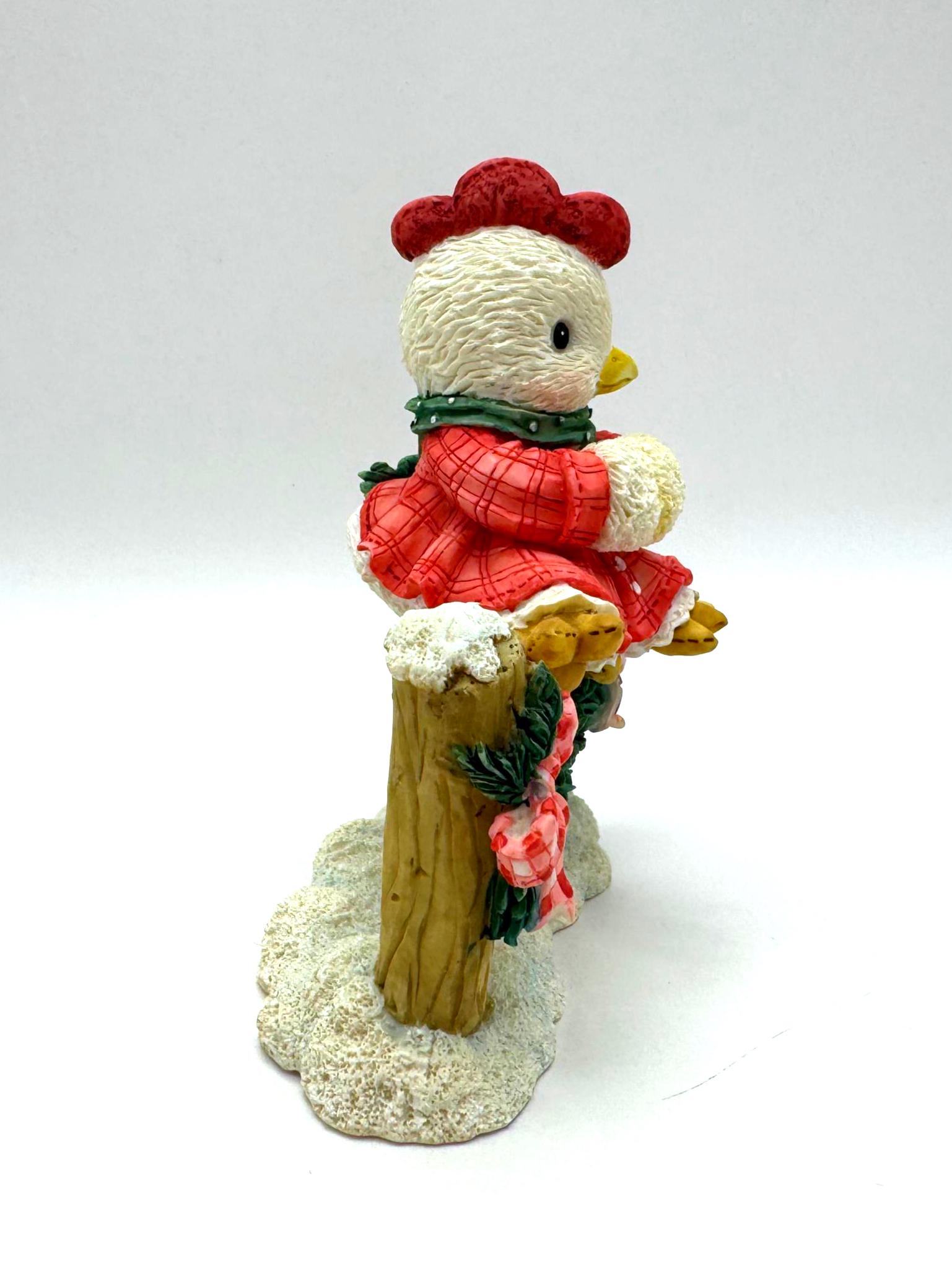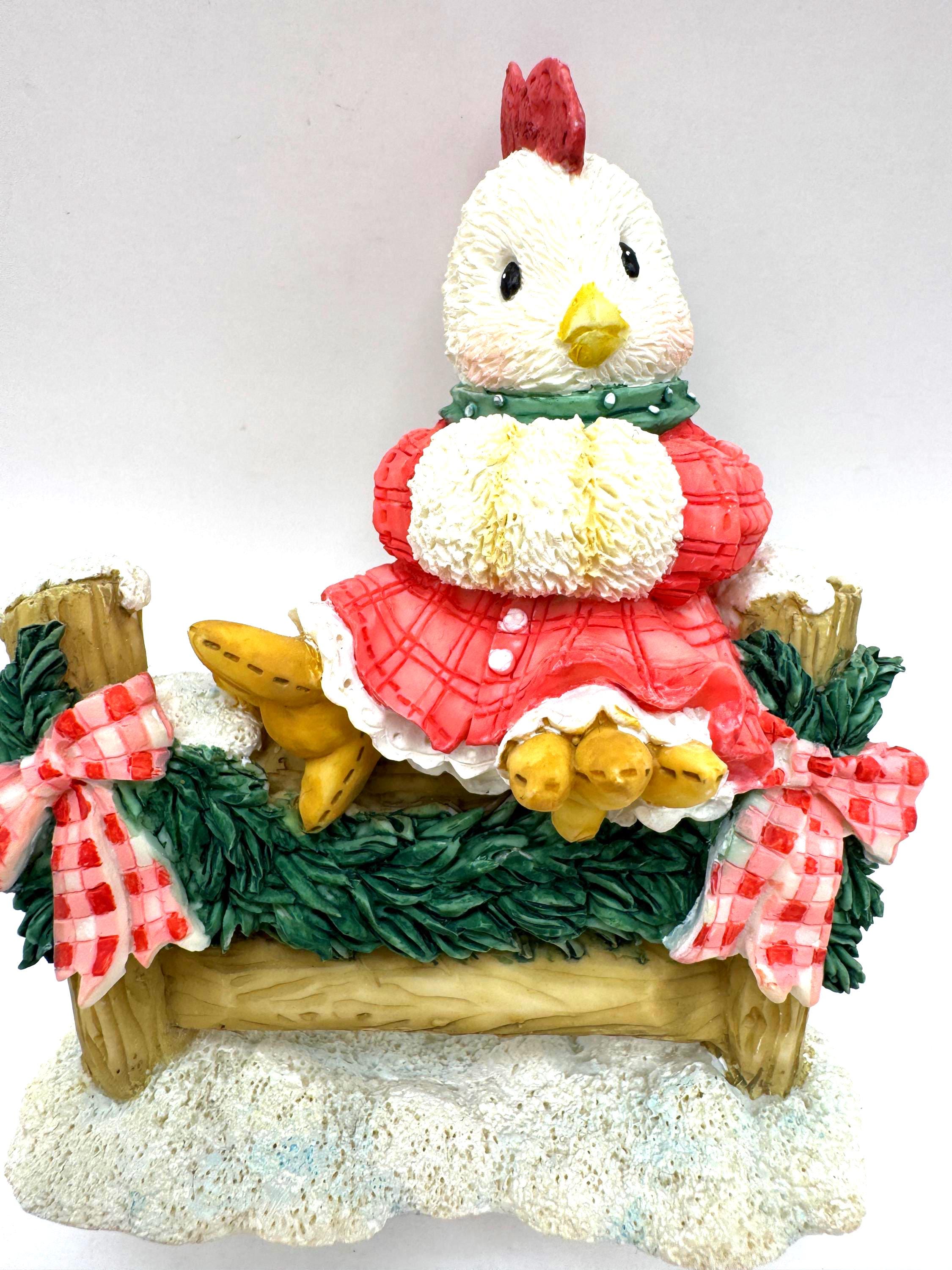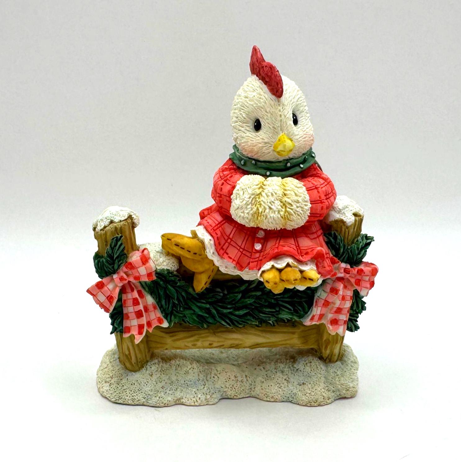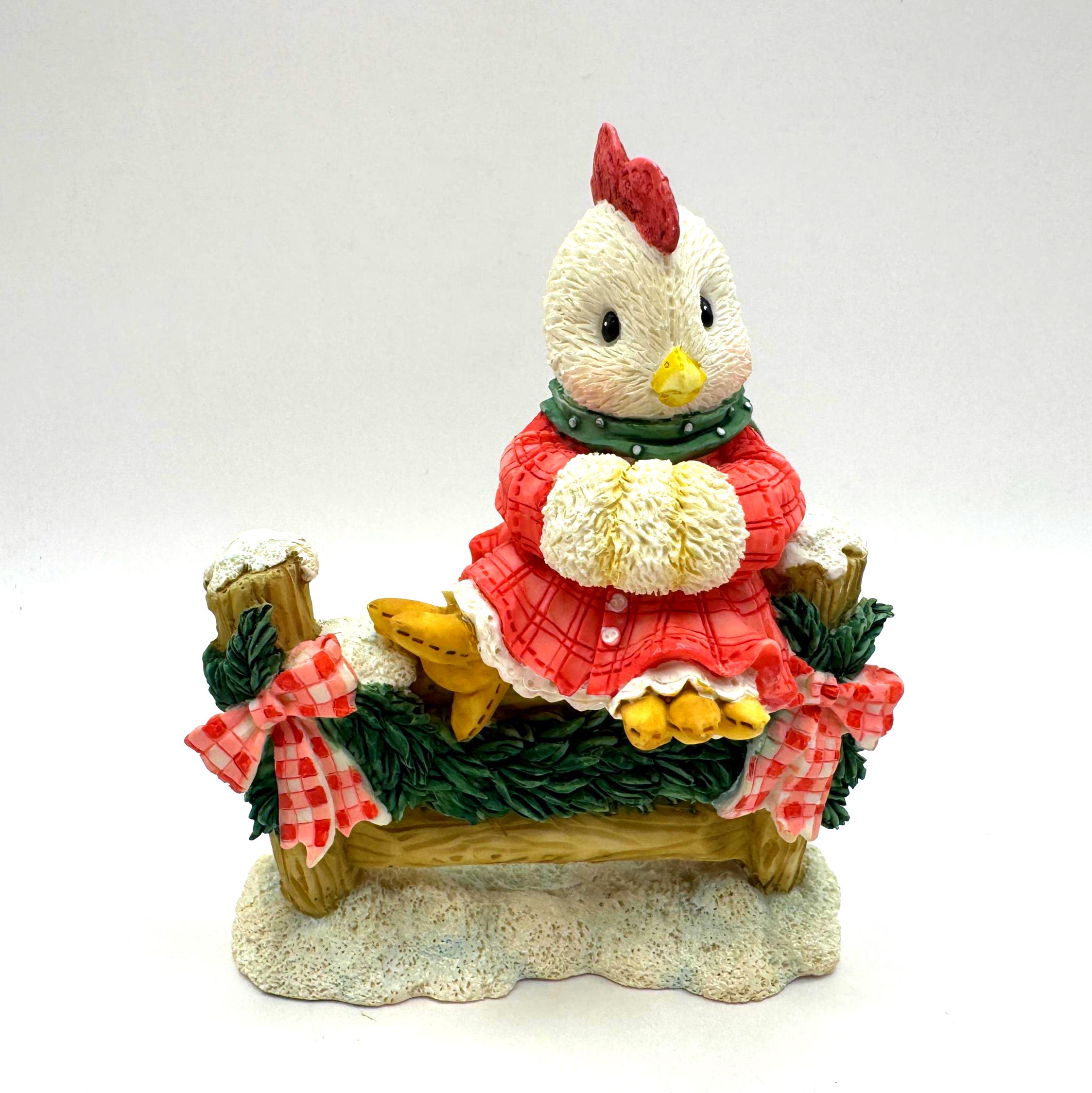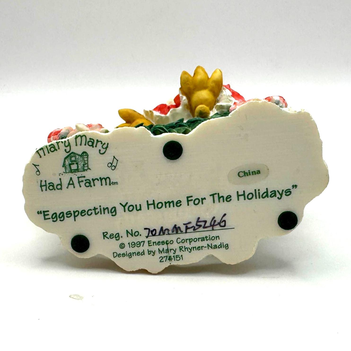 Add a touch of farmhouse charm to your holiday decor with this adorable Mary Mary Had A Farm "Eggspecting You Home for the Holidays" figurine by Enesco (1997). Designed by Mary Rhyner-Nadig, this festive collectible features a hen in a red plaid dress perched on a snow dusted fence with evergreen garland and gingham bows.