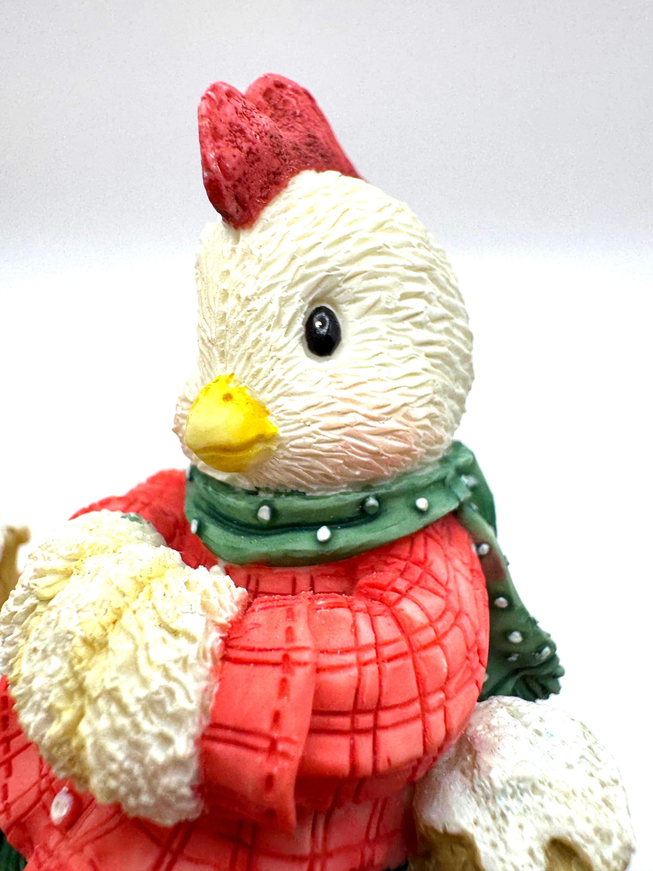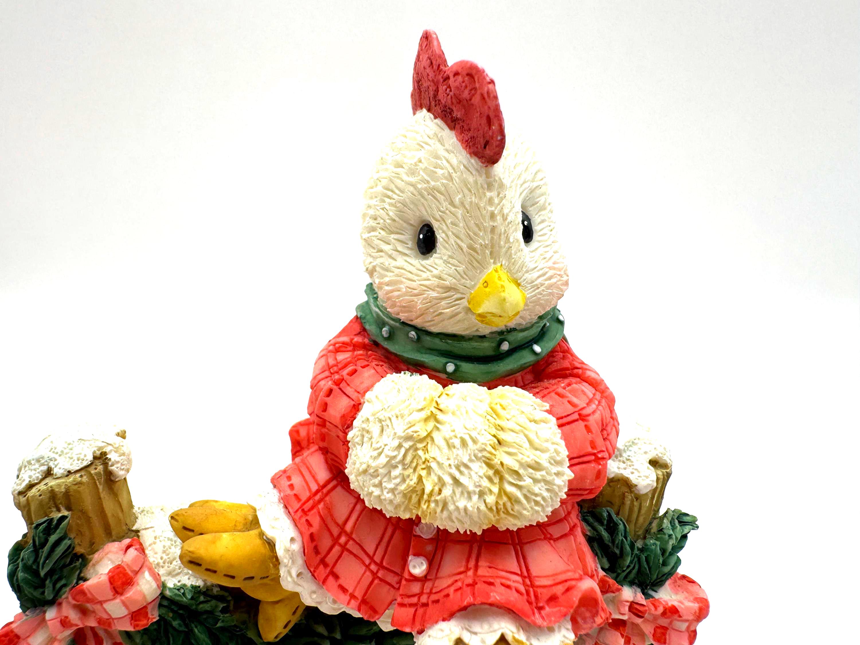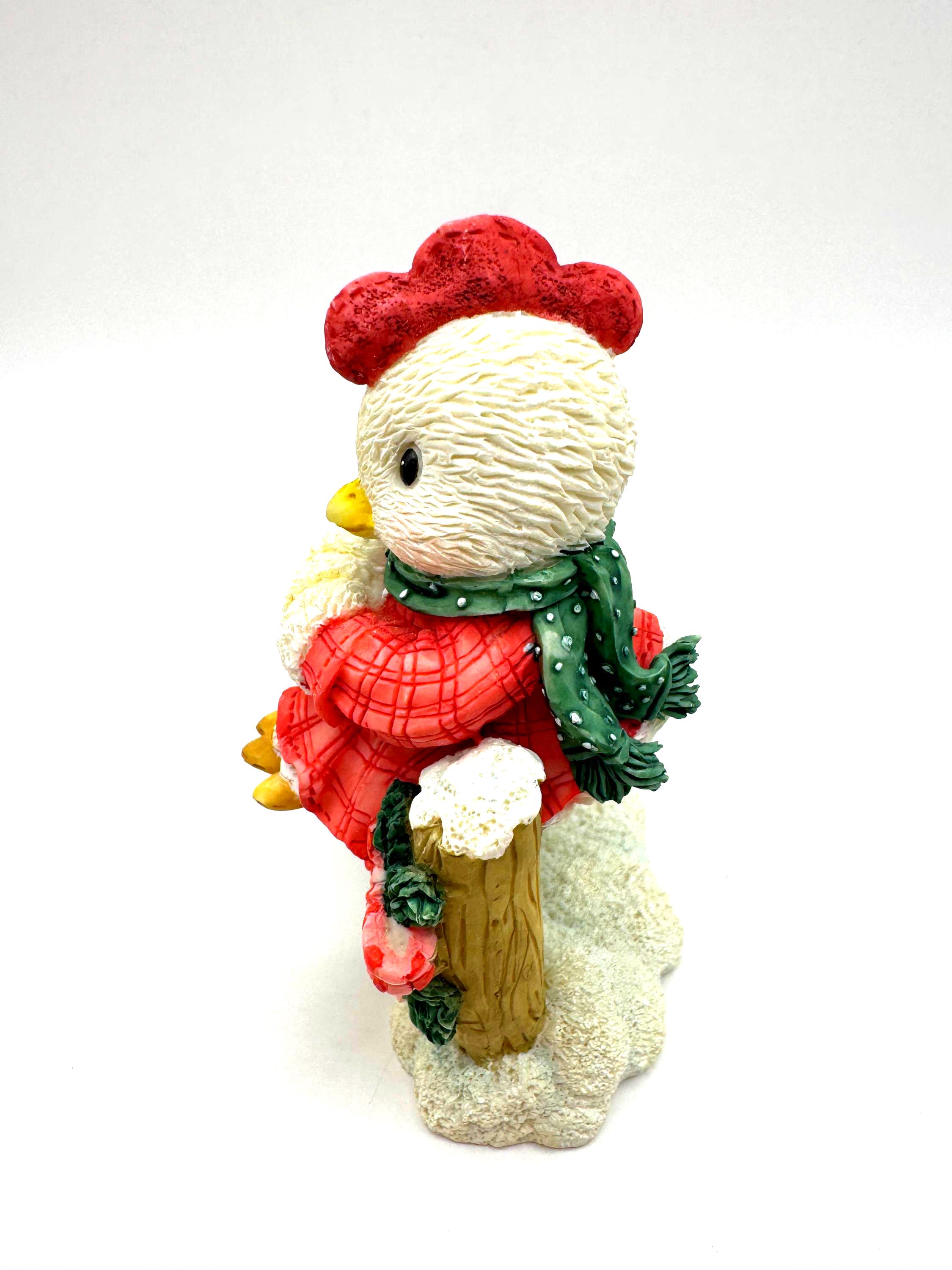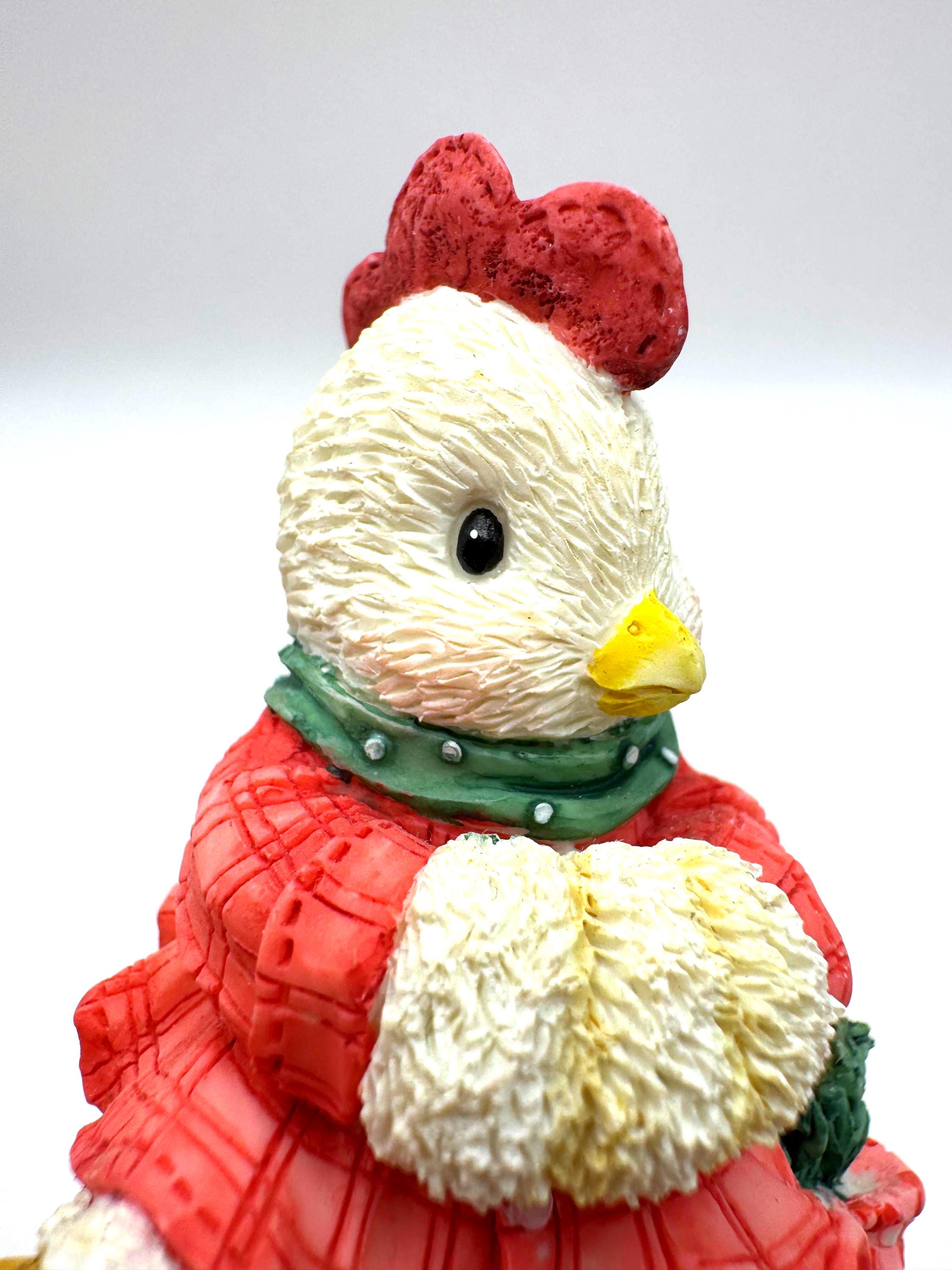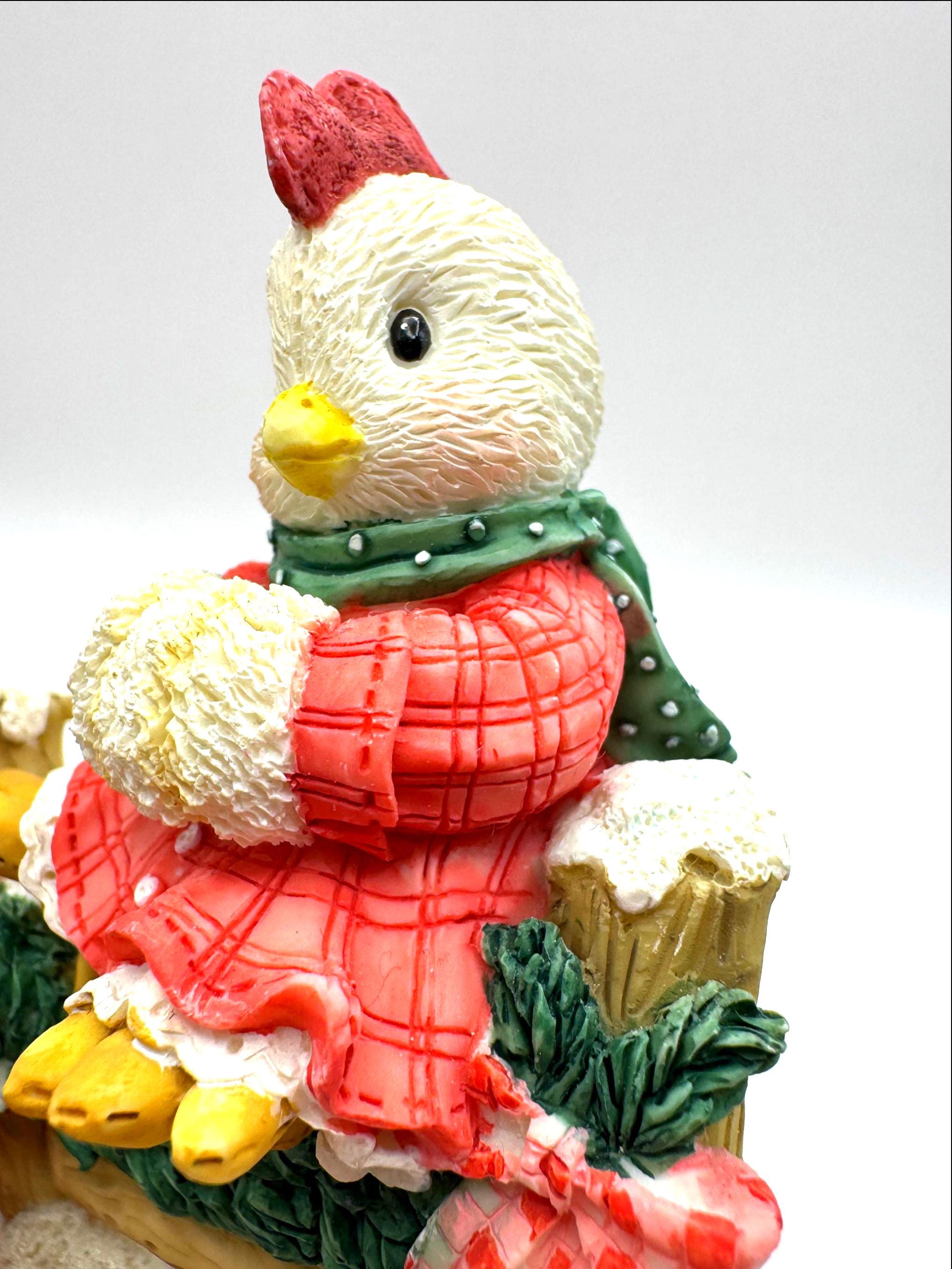 Add a touch of farmhouse charm to your holiday decor with this adorable Mary Mary Had A Farm "Eggspecting You Home for the Holidays" figurine by Enesco (1997). Designed by Mary Rhyner-Nadig, this festive collectible features a hen in a red plaid dress perched on a snow dusted fence with evergreen garland and gingham bows.