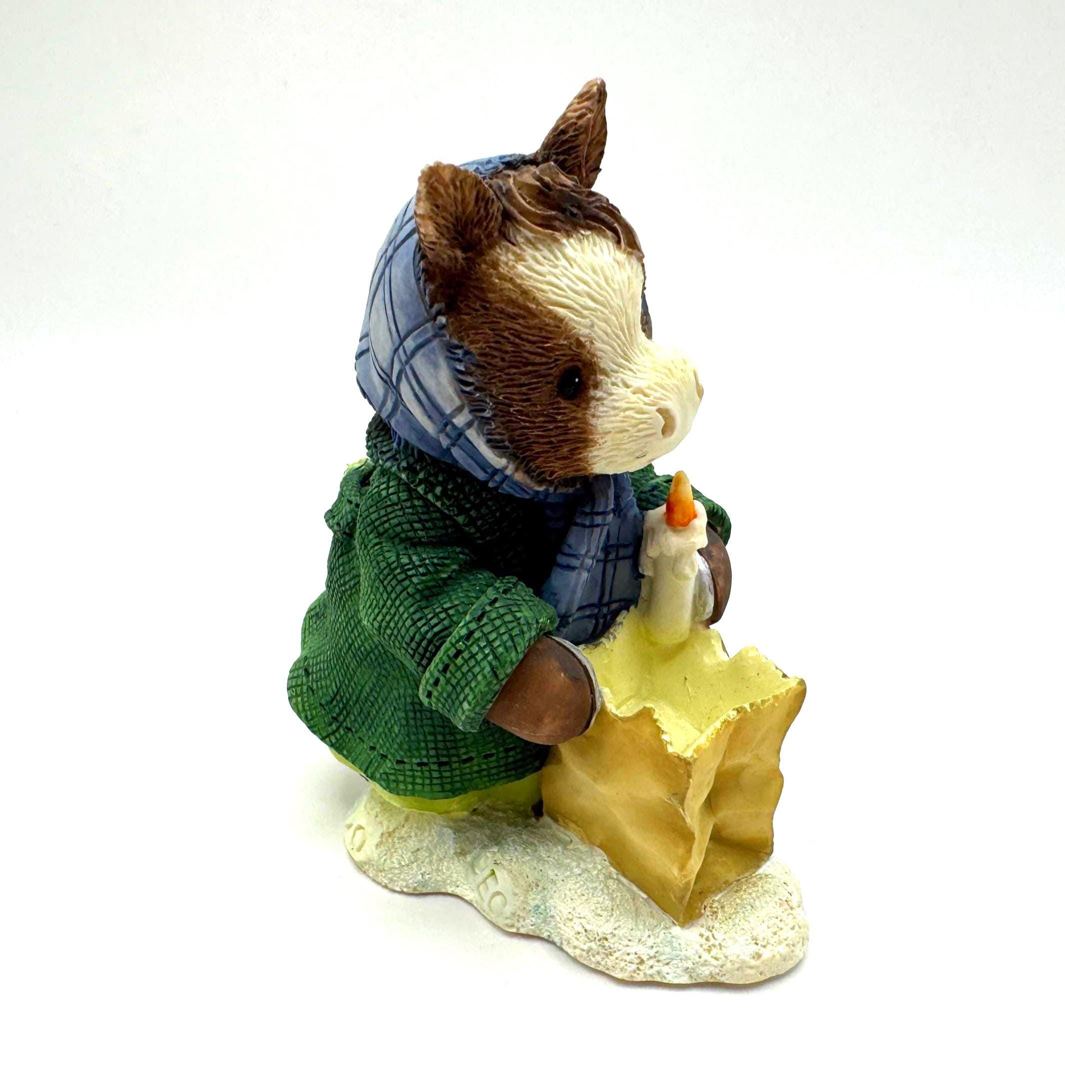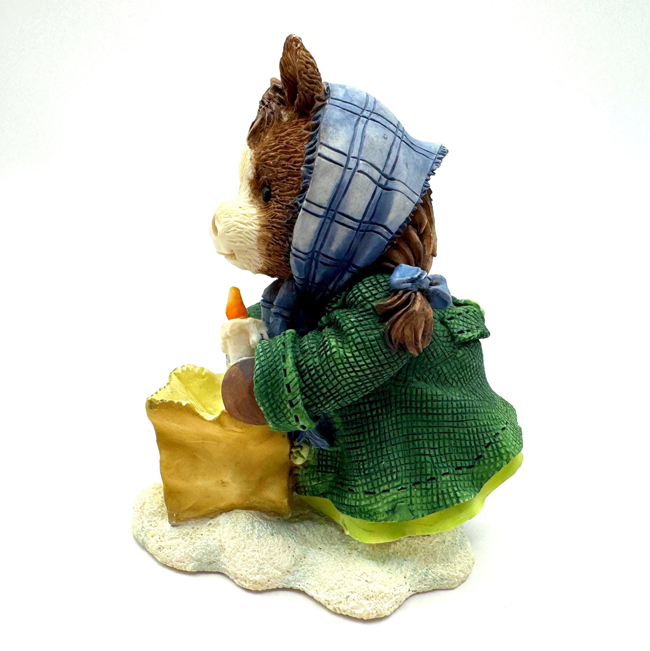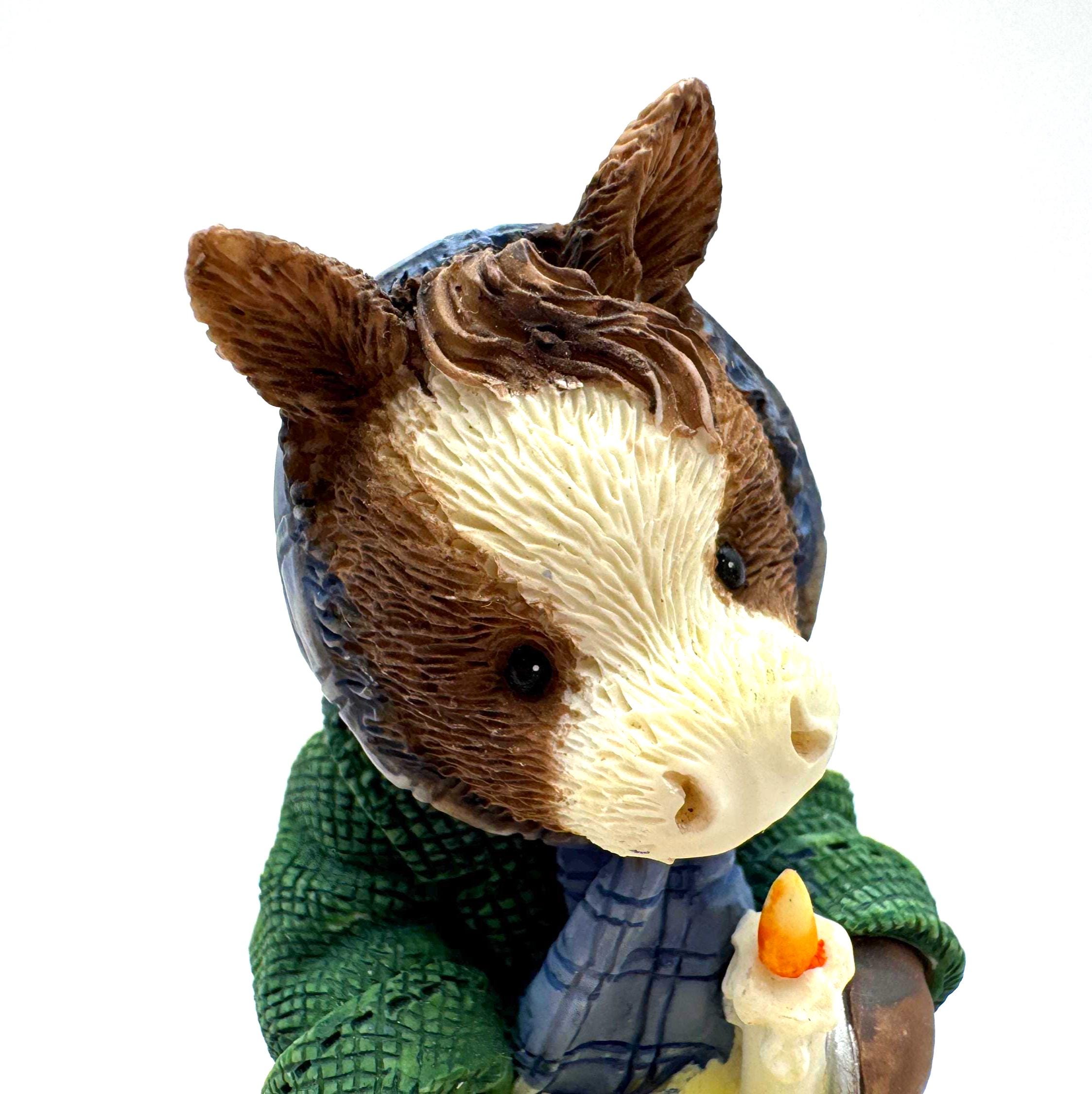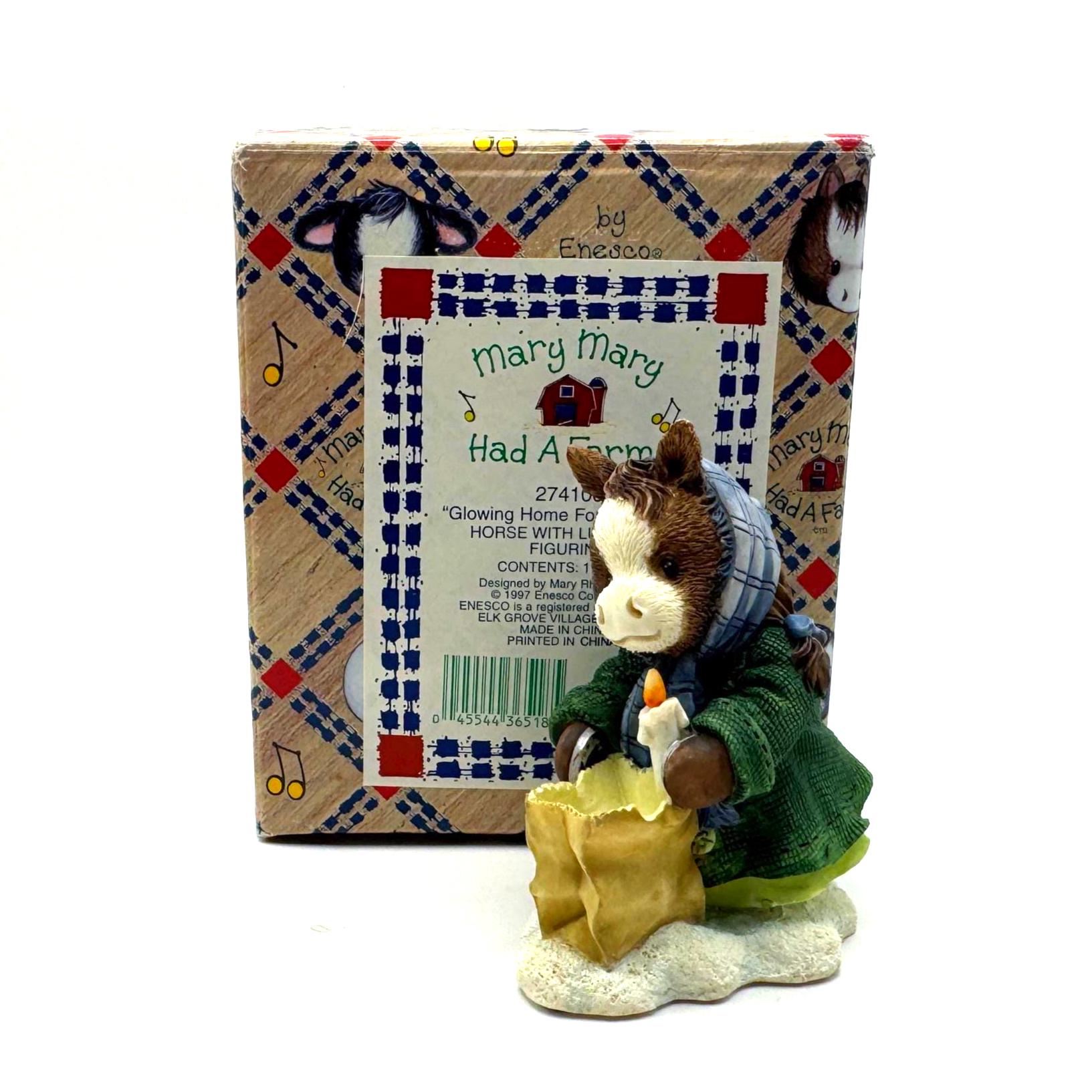Bring a cozy, country glow to your holiday decor with this charming Mary Mary Had A Farm "Glowing Home for Christmas" figurine by Enesco (1997). Designed by Mary Rhyner-Nadig, this collectible features a sweet horse bundled in a green winter coat and blue plaid scarf, gently holding a luminaria candle to light the snowy night.