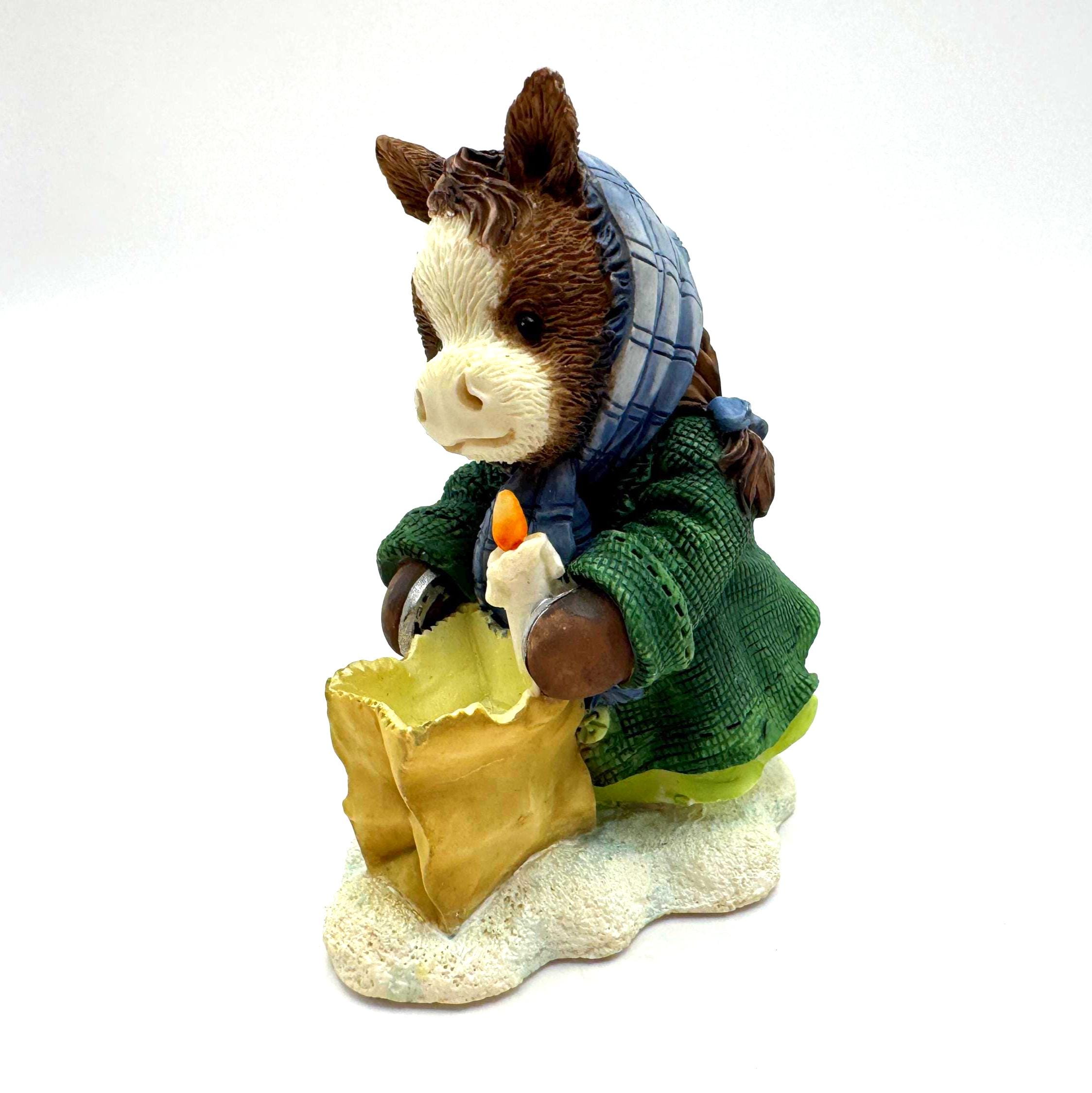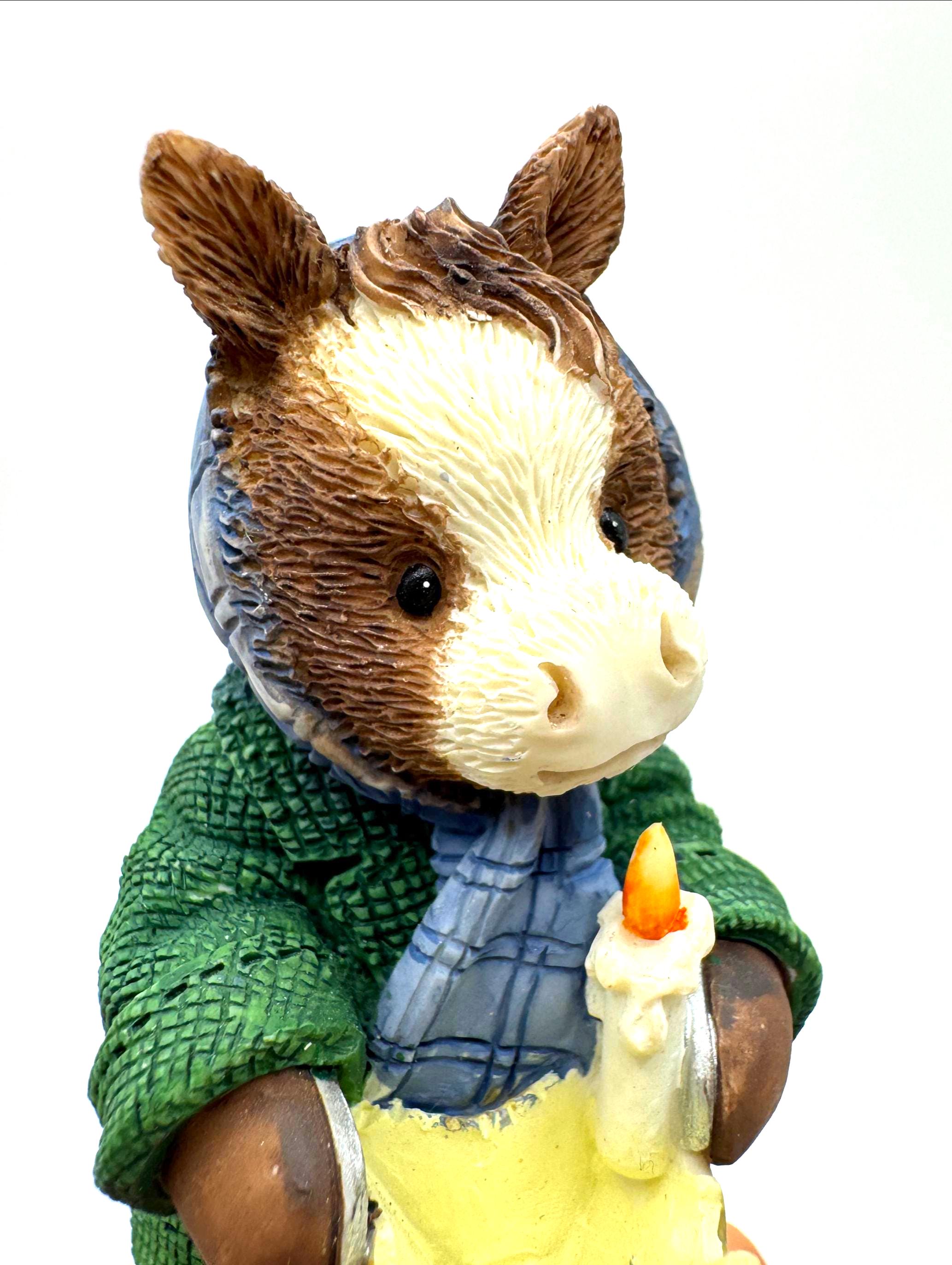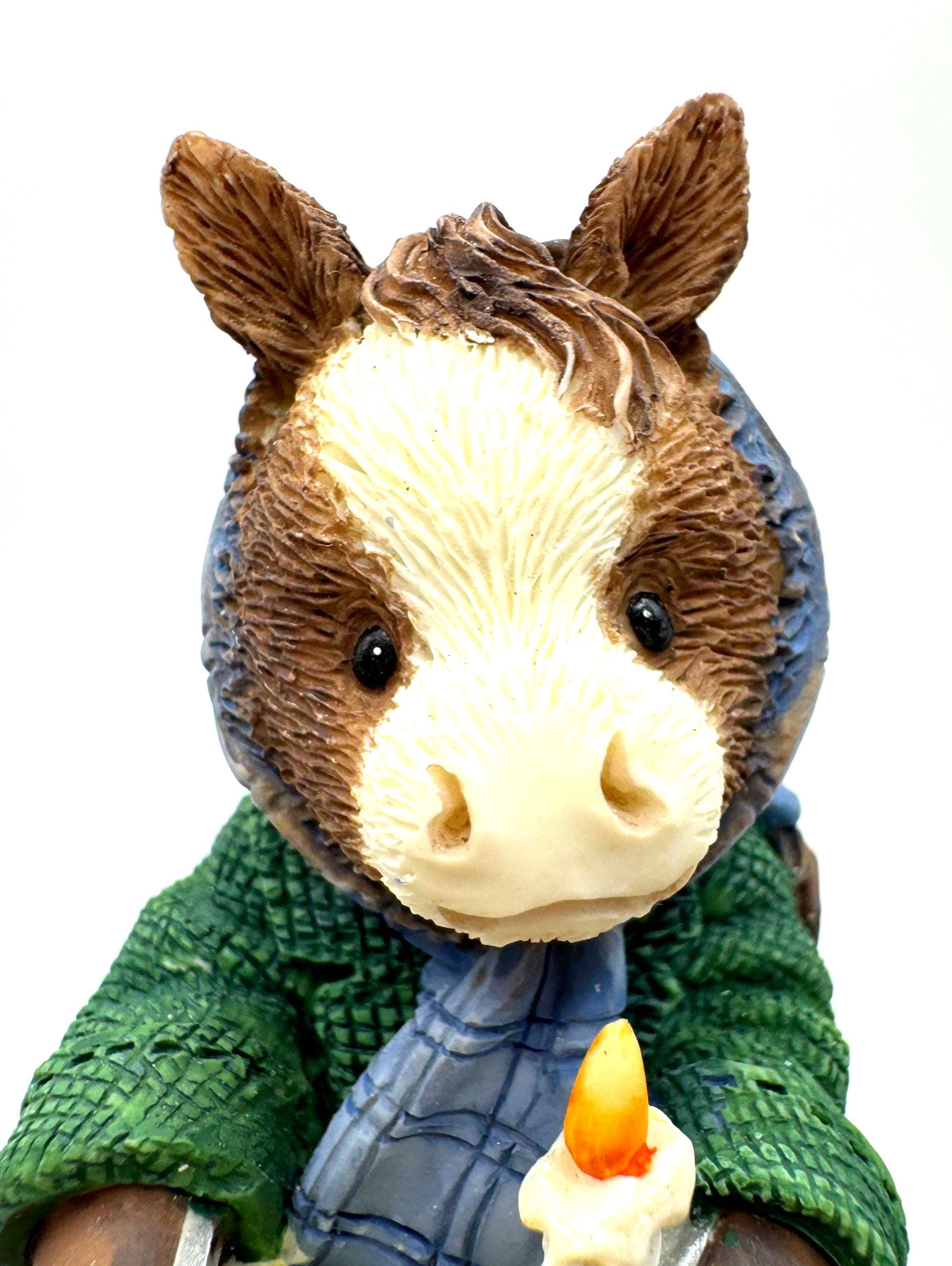 Bring a cozy, country glow to your holiday decor with this charming Mary Mary Had A Farm "Glowing Home for Christmas" figurine by Enesco (1997). Designed by Mary Rhyner-Nadig, this collectible features a sweet horse bundled in a green winter coat and blue plaid scarf, gently holding a luminaria candle to light the snowy night.