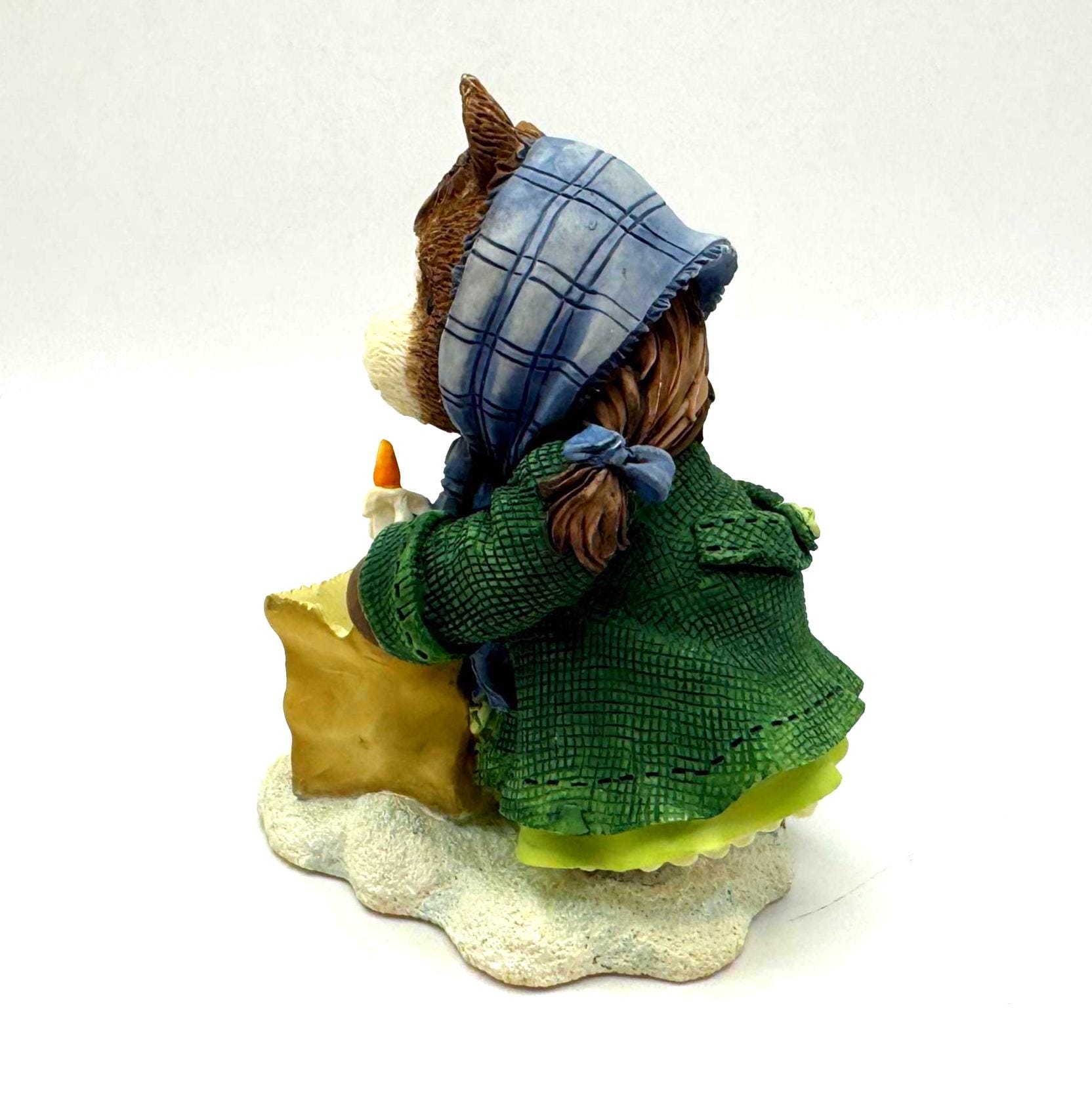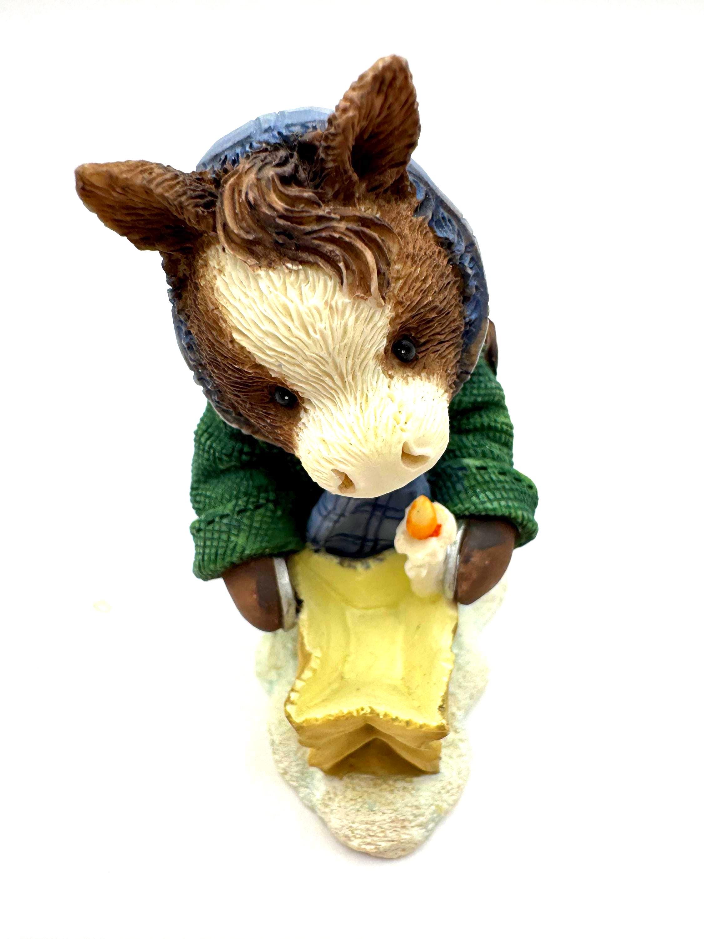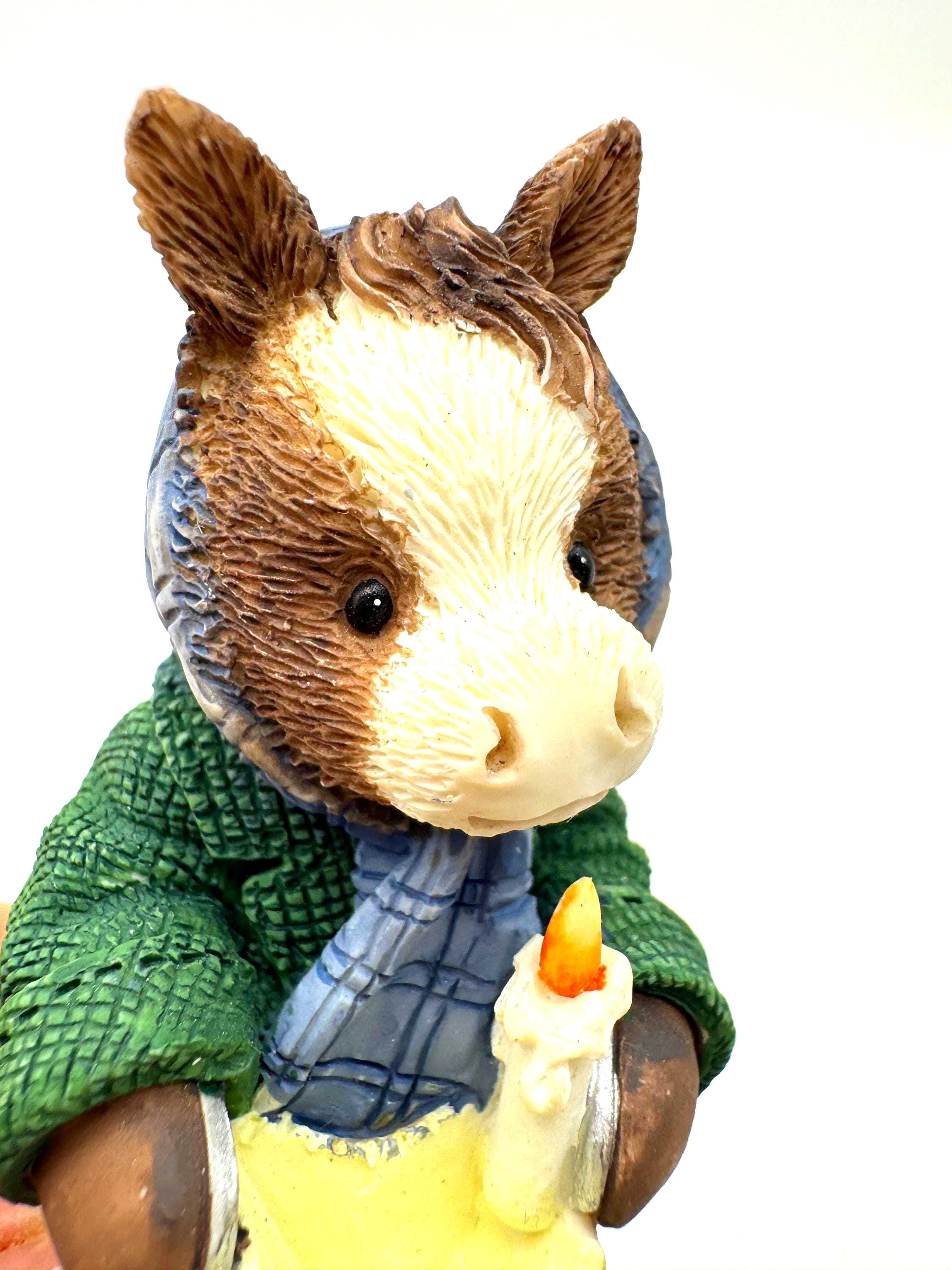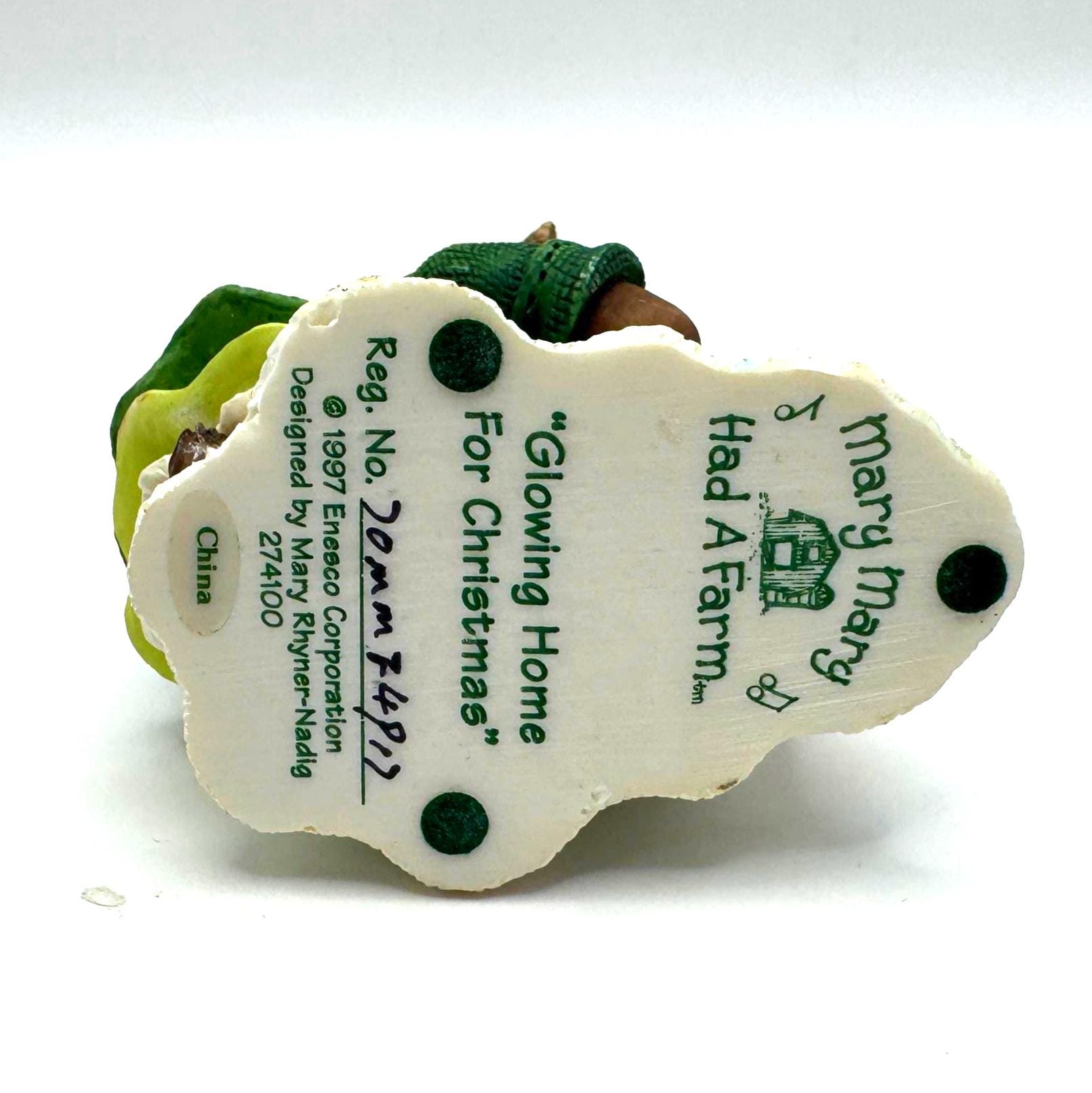 Bring a cozy, country glow to your holiday decor with this charming Mary Mary Had A Farm "Glowing Home for Christmas" figurine by Enesco (1997). Designed by Mary Rhyner-Nadig, this collectible features a sweet horse bundled in a green winter coat and blue plaid scarf, gently holding a luminaria candle to light the snowy night.
