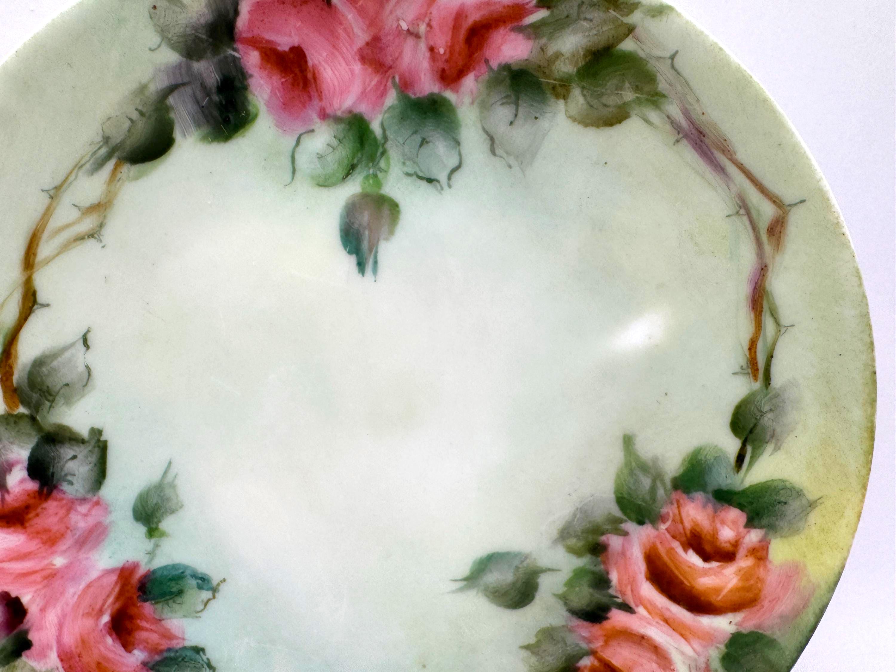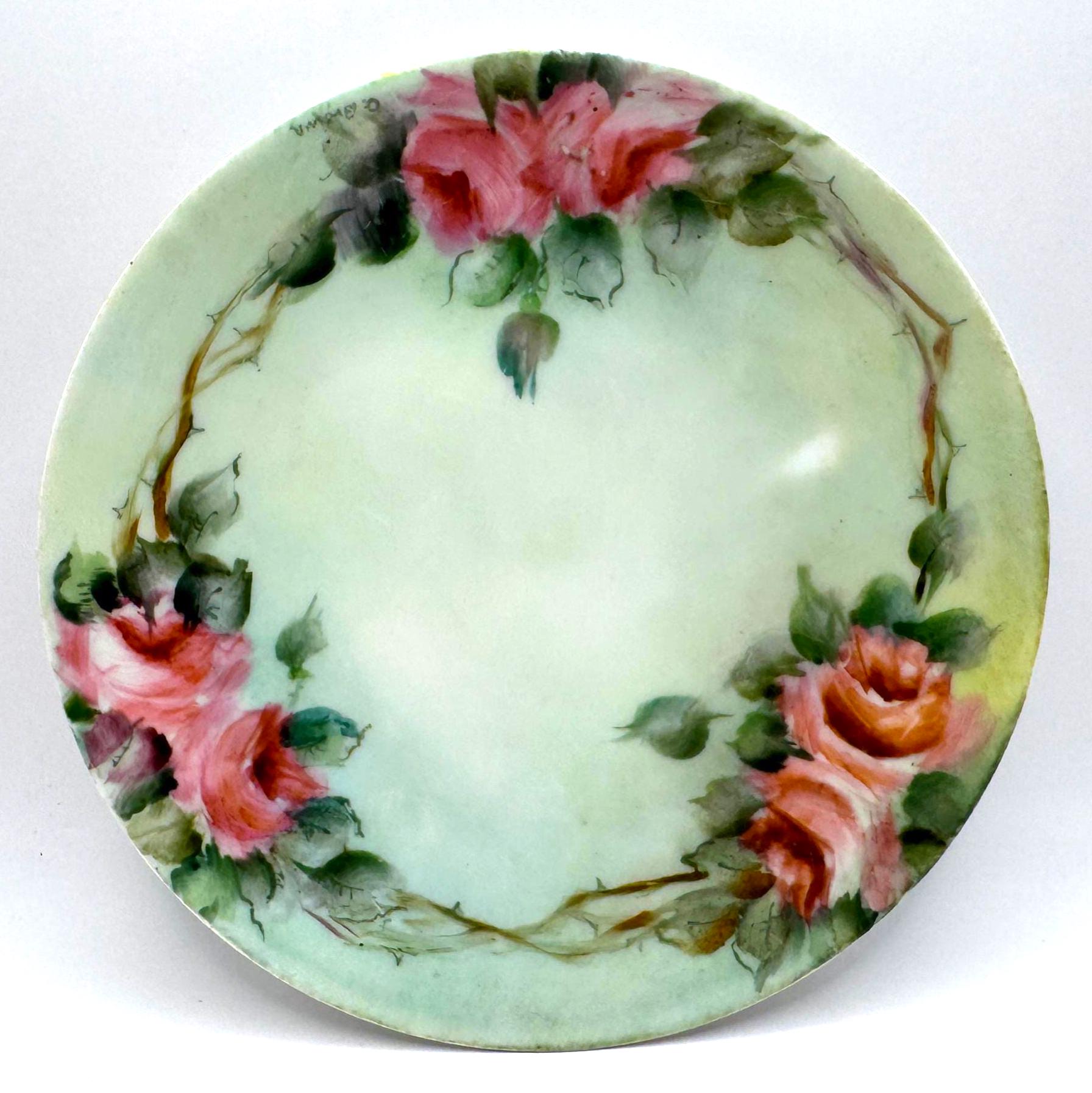This elegant hand-painted porcelain plate by Thomas Sevres Bavaria features soft pink roses framed by trailing vines and leaves again a pale green background. The plate showcases the delicate brushwork and romantic style typical of early 1900s Bavarian artistry.