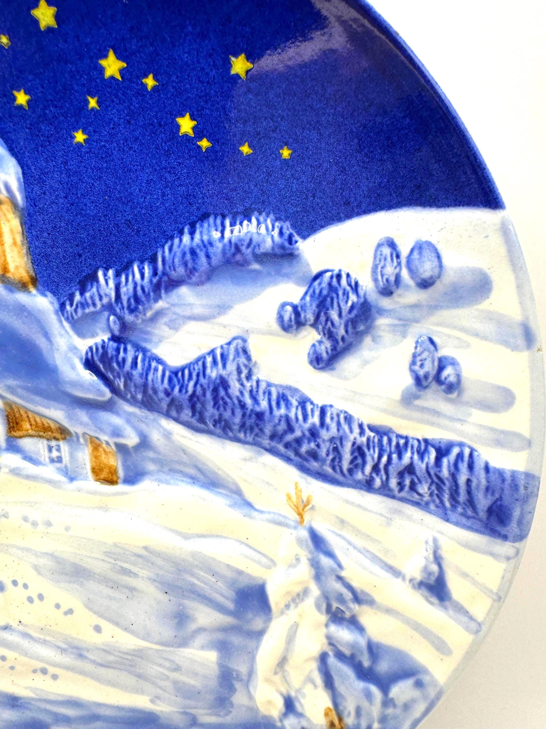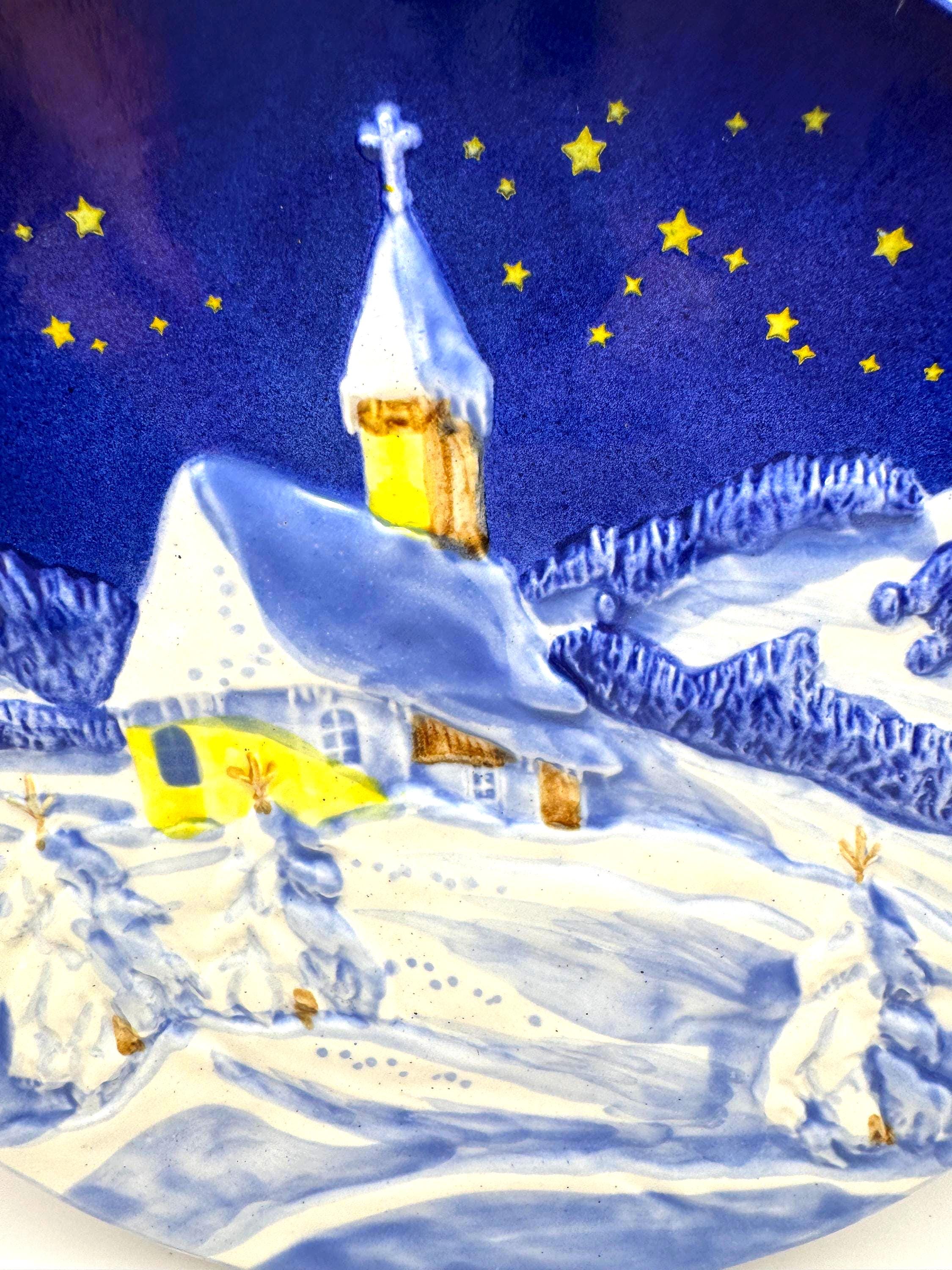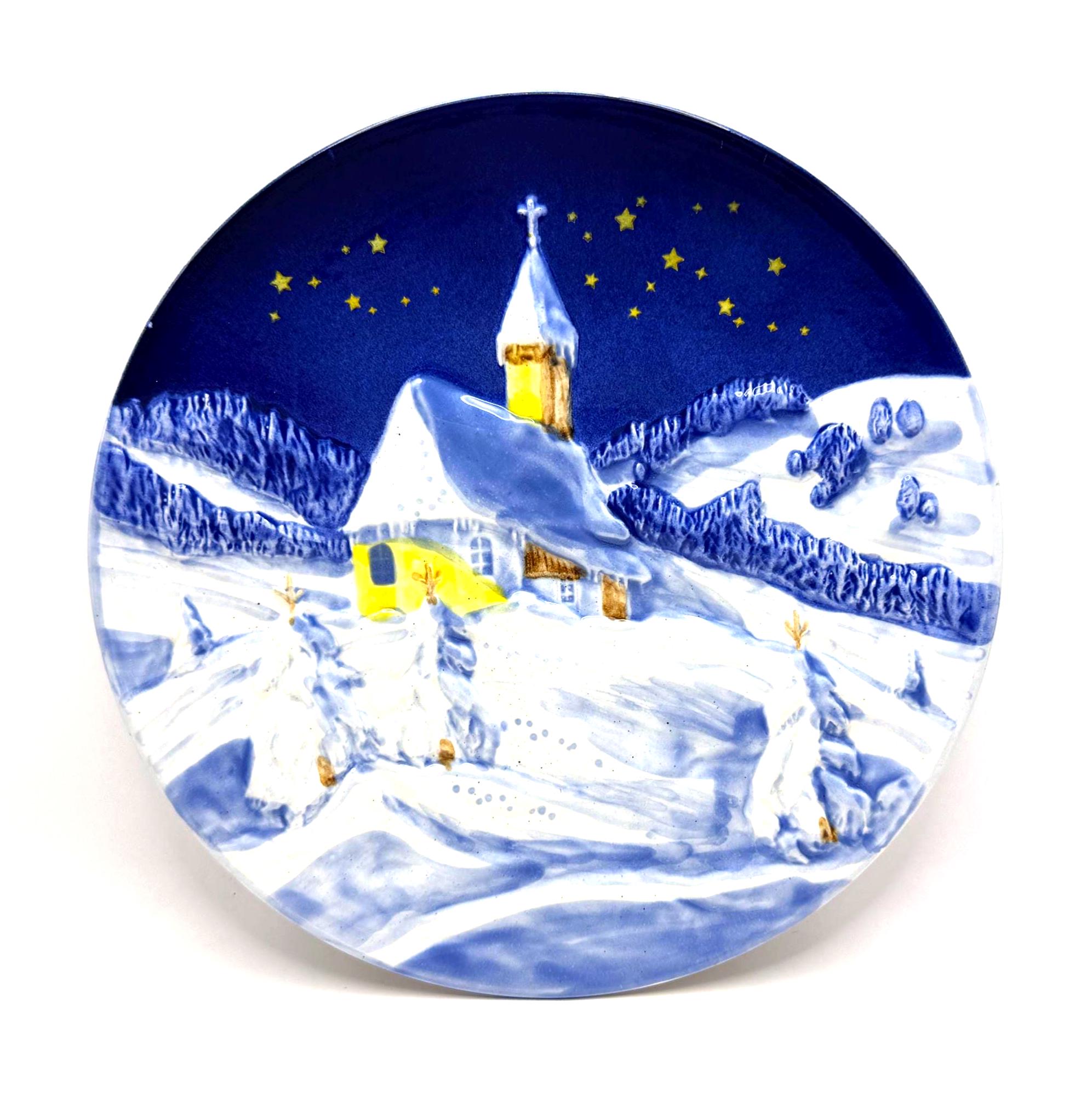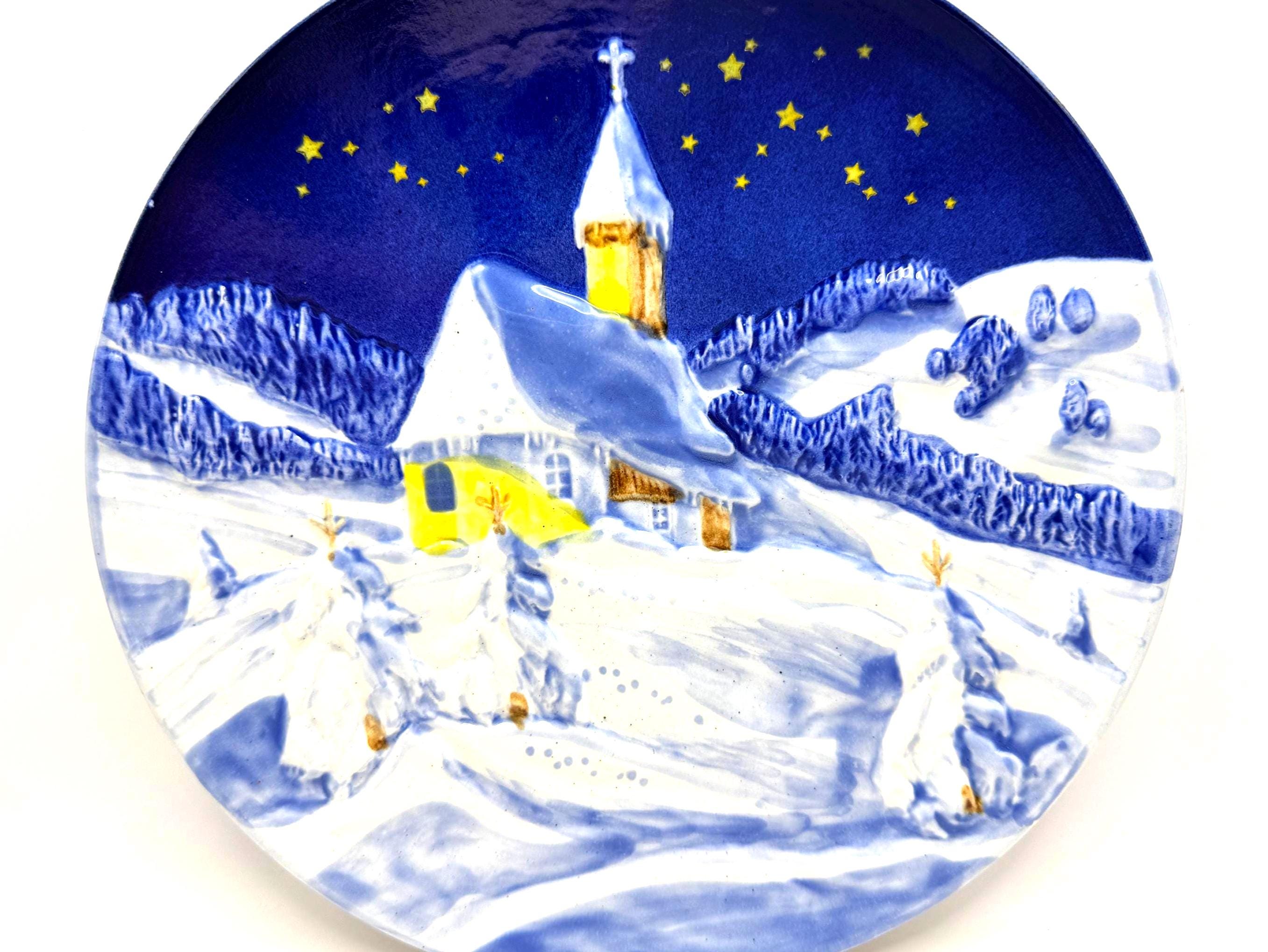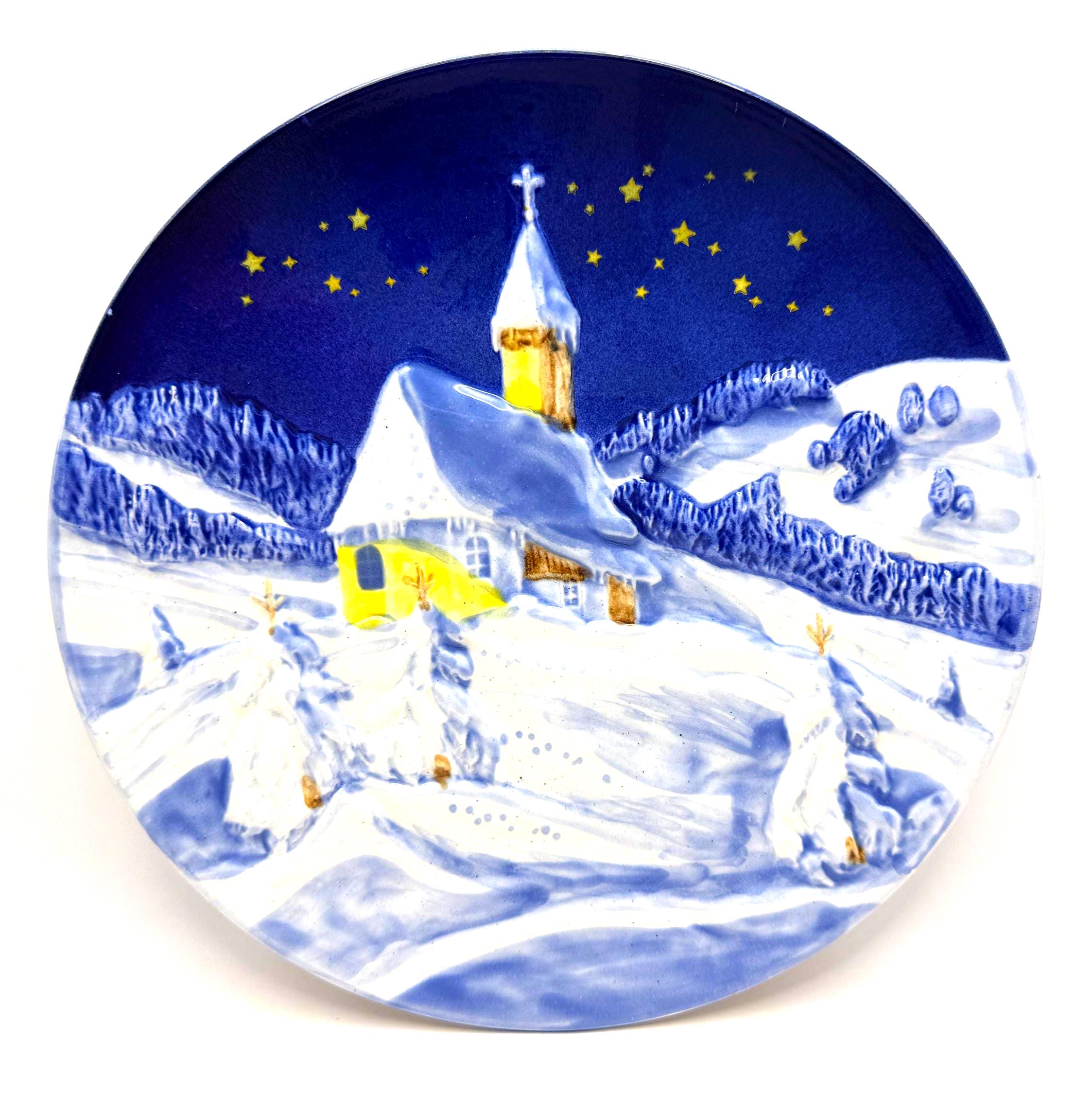 Charming vintage Schramberg Majolika (SMF) wall plate, hand-painted in rich cobalt blue and snowy white tones with a peaceful church in winter landscape under a golden starlit sky. The embossed ceramic design creates beautiful dimension, capturing the cozy glow of a winter evening in Bavaria.