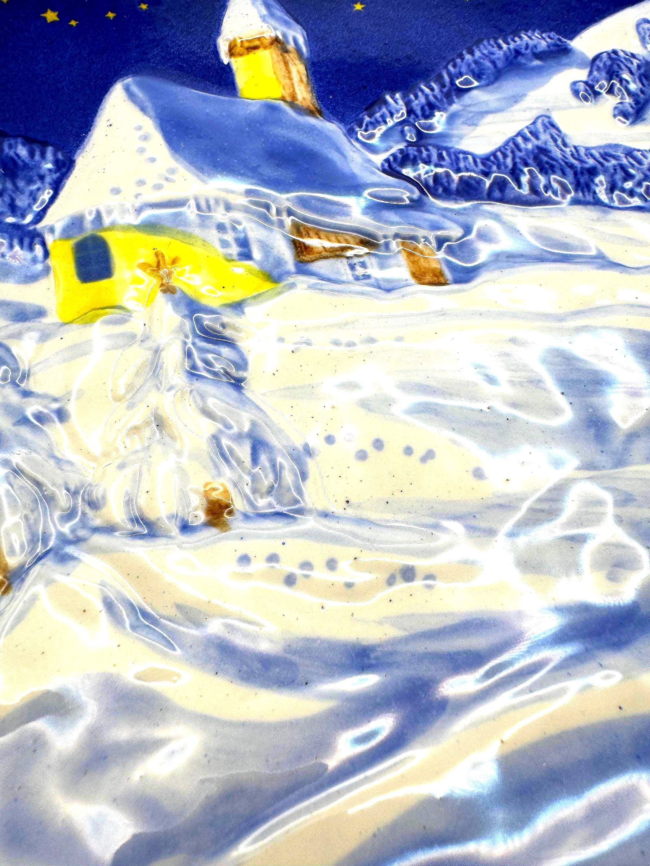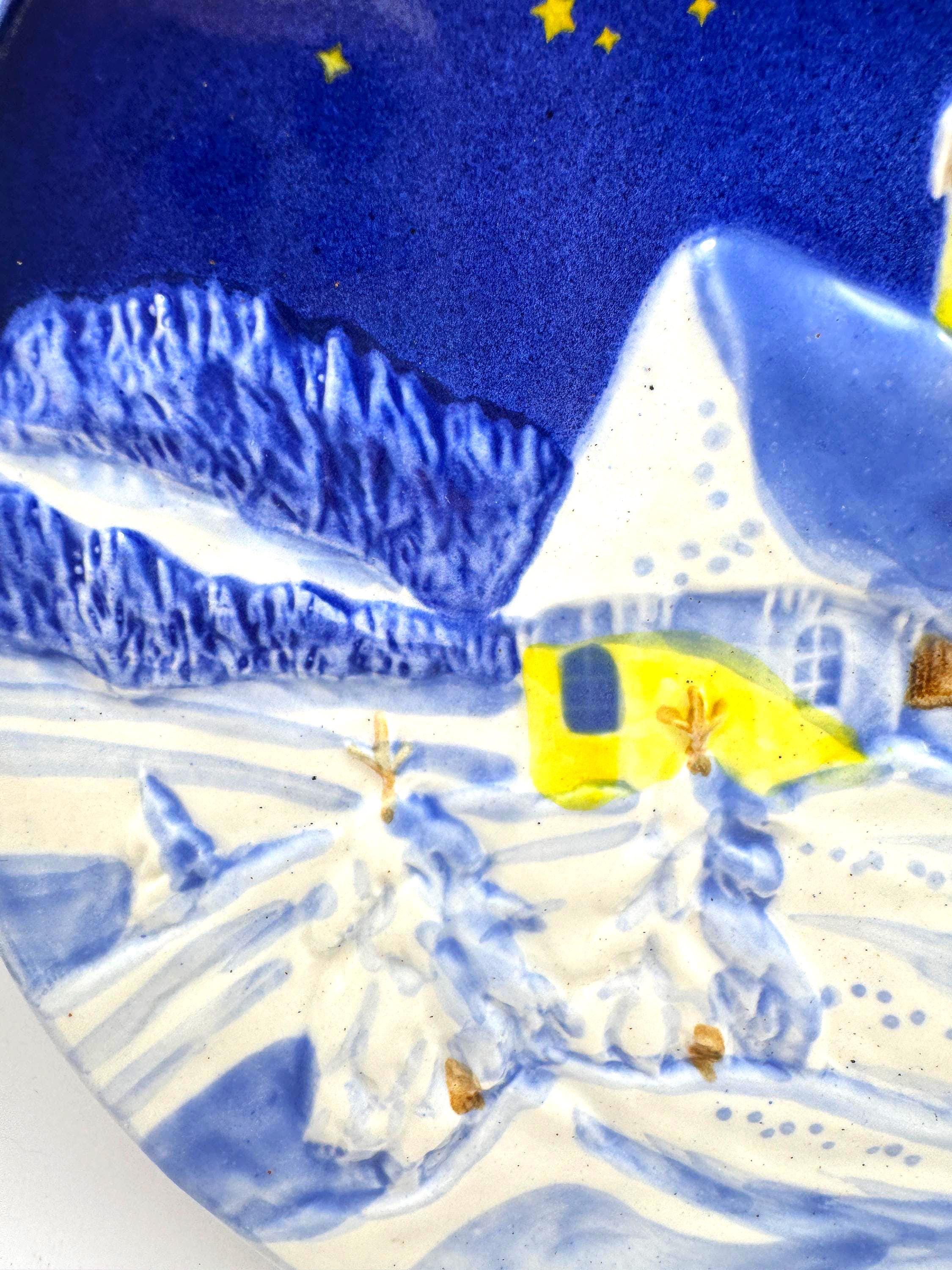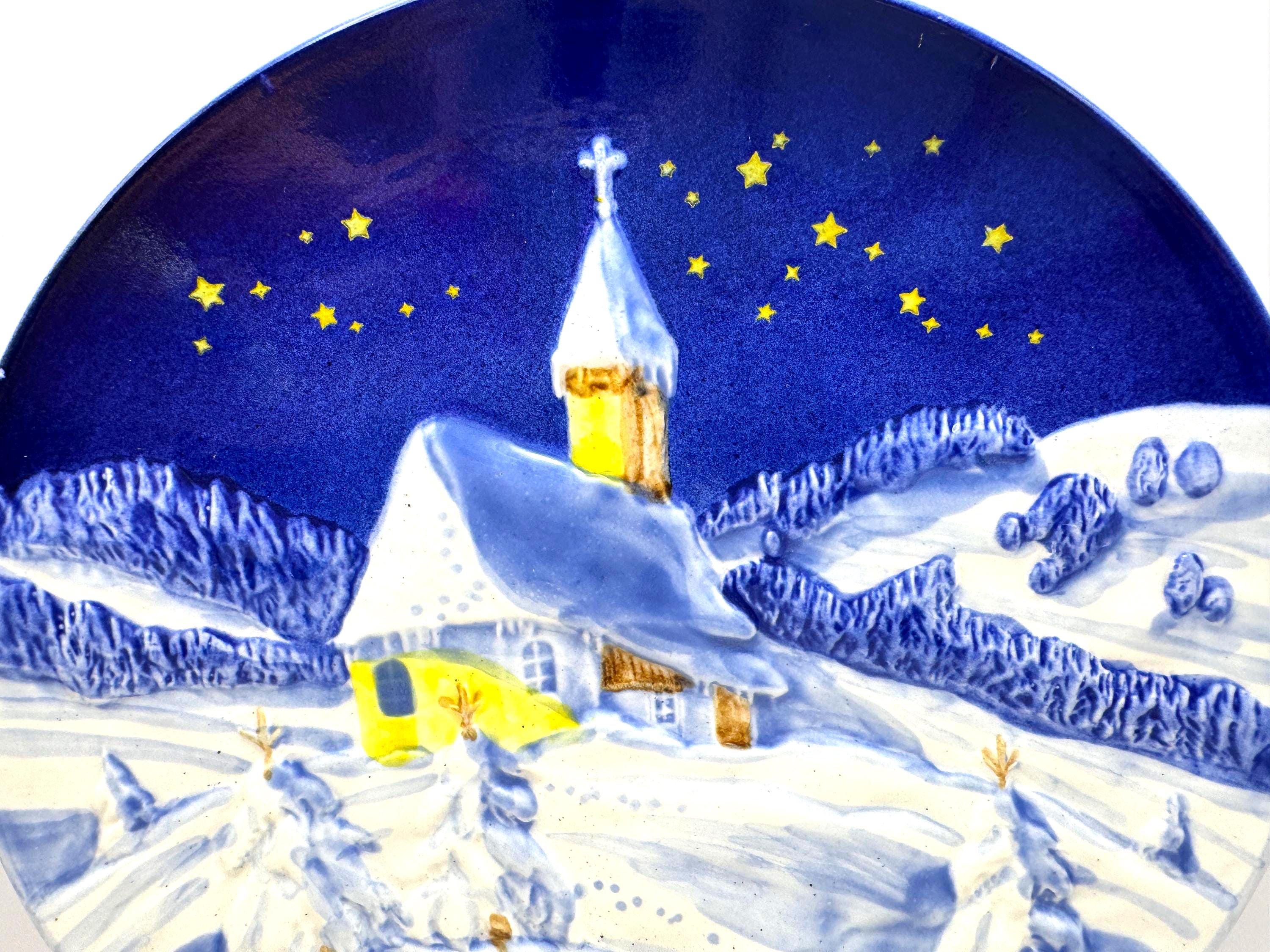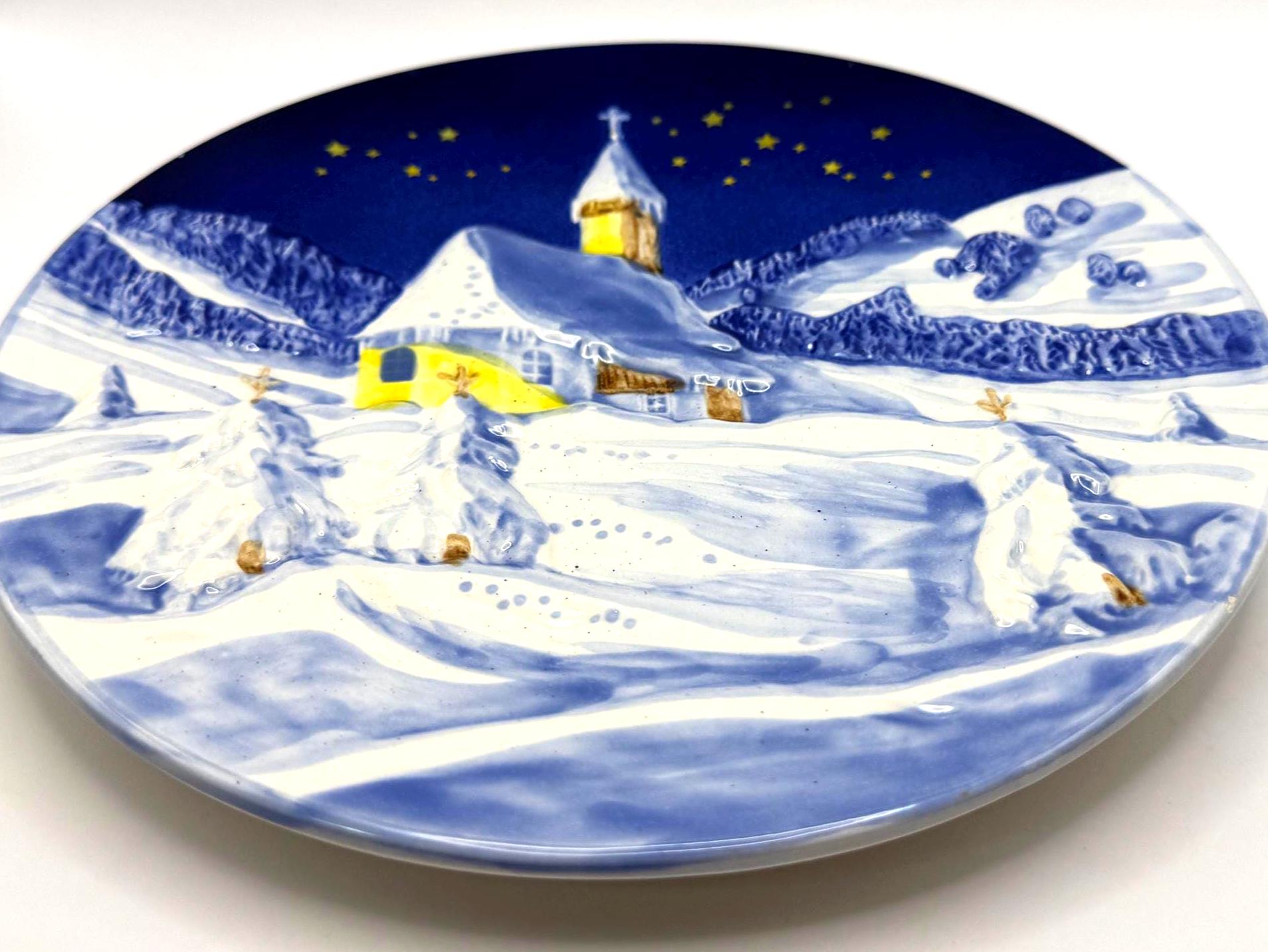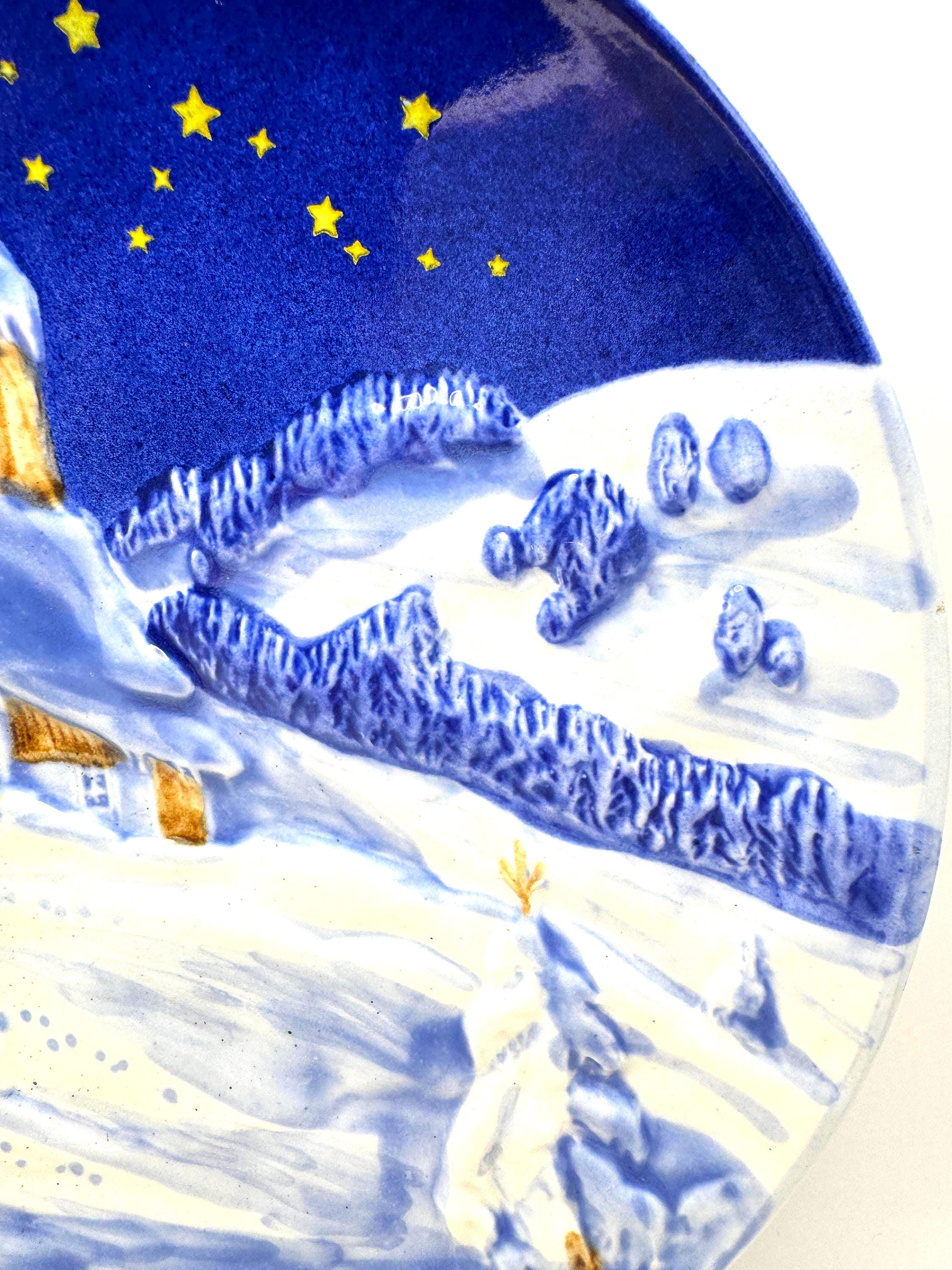 Charming vintage Schramberg Majolika (SMF) wall plate, hand-painted in rich cobalt blue and snowy white tones with a peaceful church in winter landscape under a golden starlit sky. The embossed ceramic design creates beautiful dimension, capturing the cozy glow of a winter evening in Bavaria.