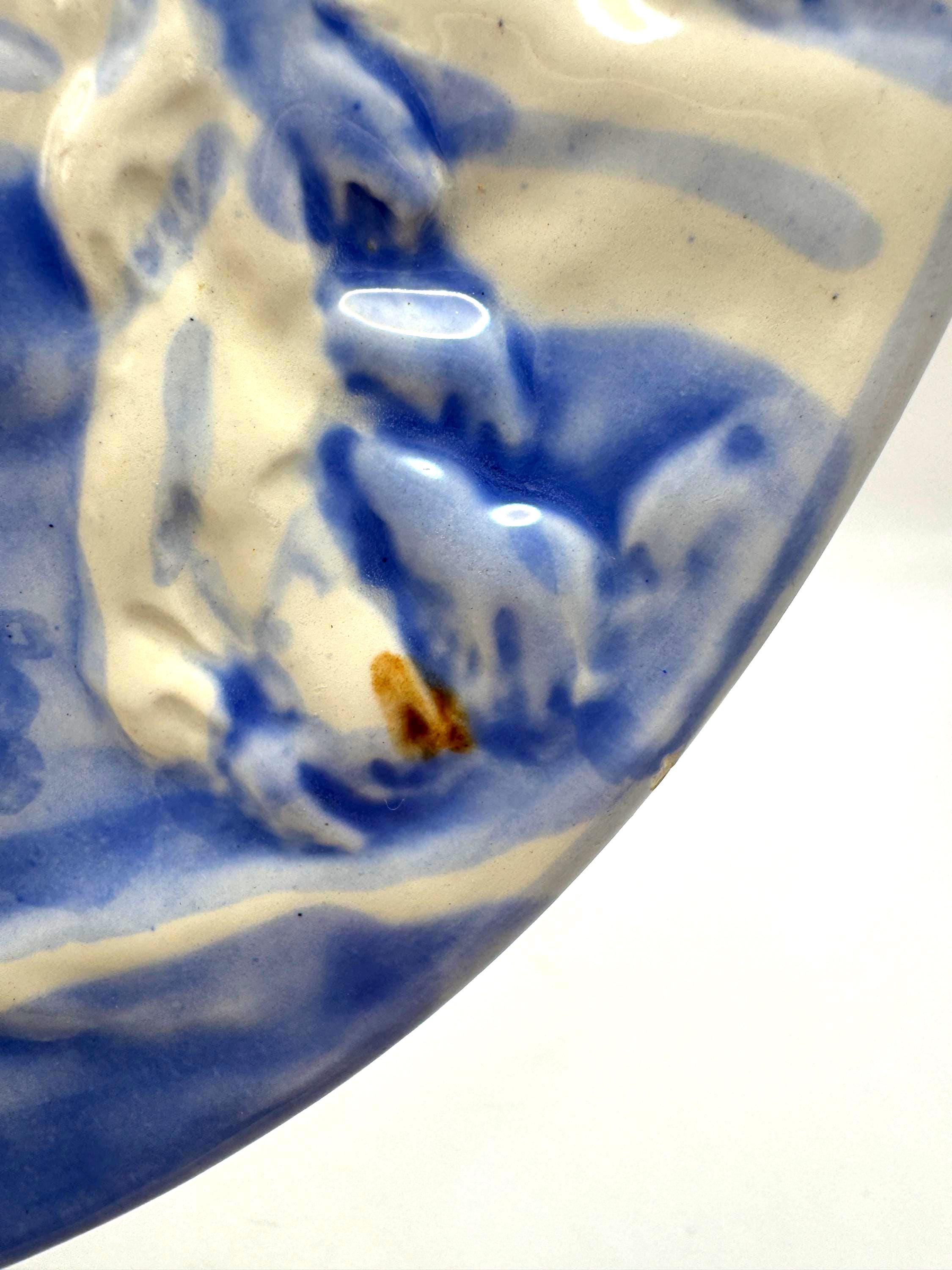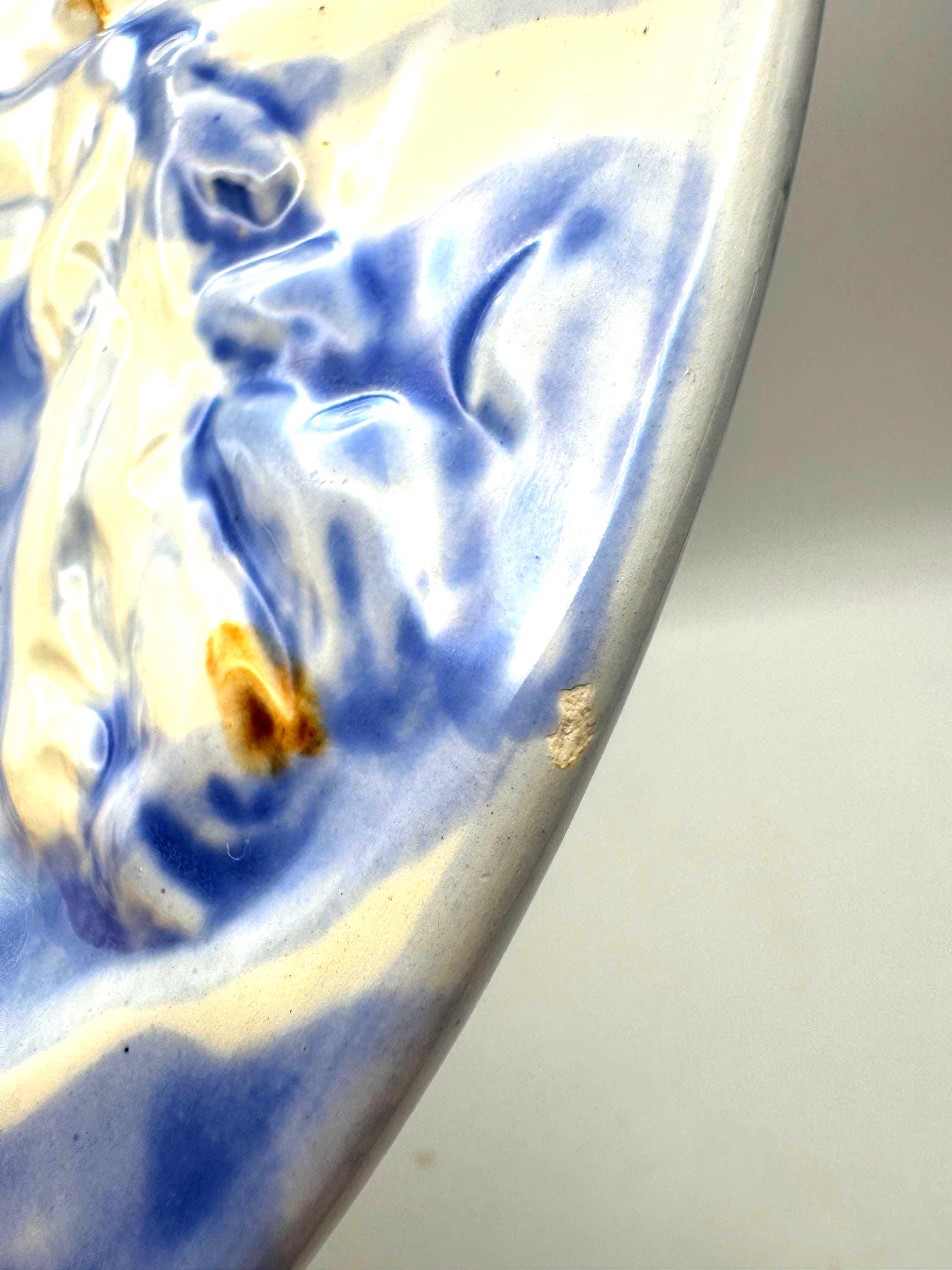 Small glaze chip on rim (pictured) and very light age related wear. No cracks; the original holes for wall hanging are intact. Will display beautifully. (See pictures for more detail)