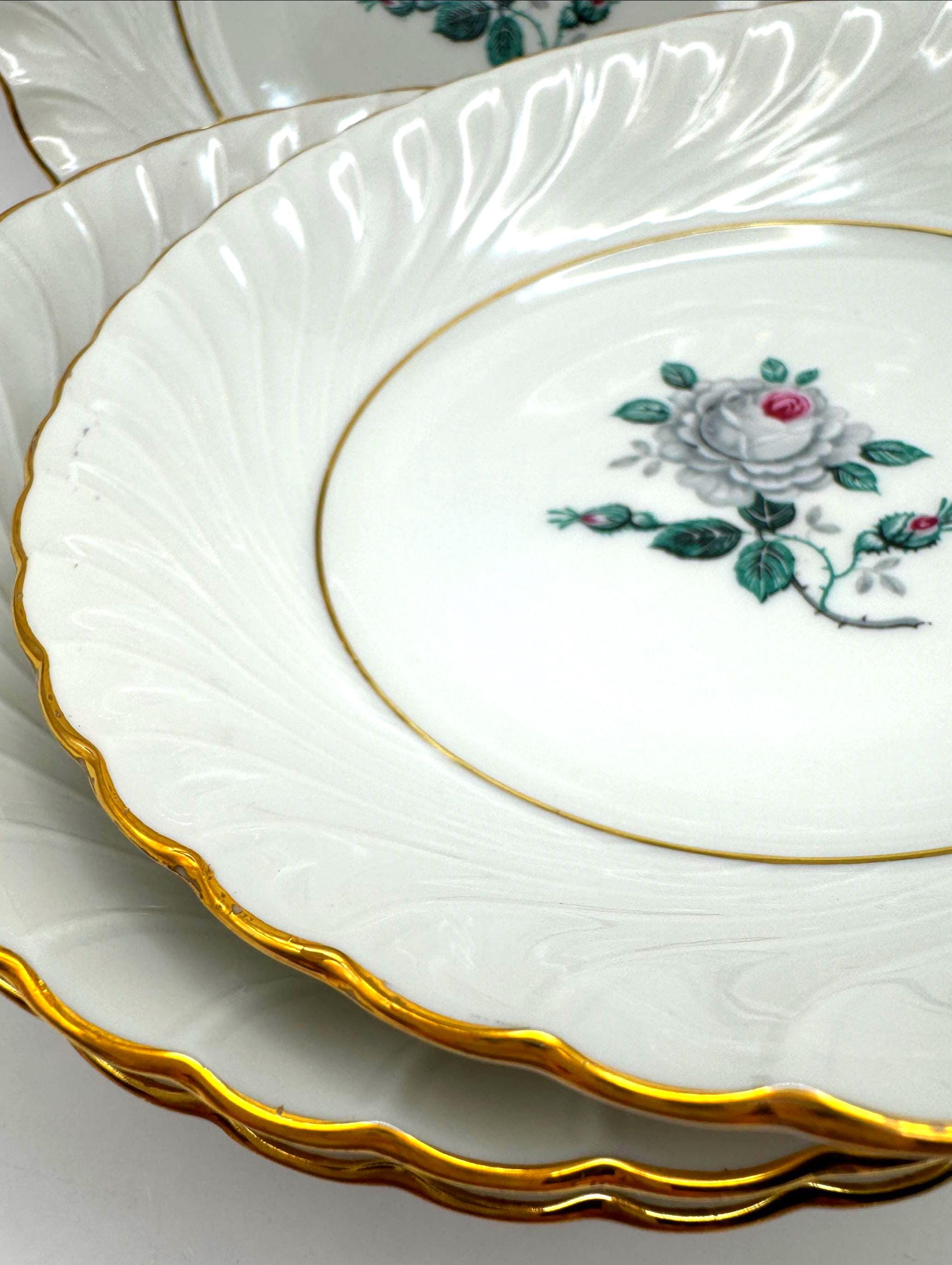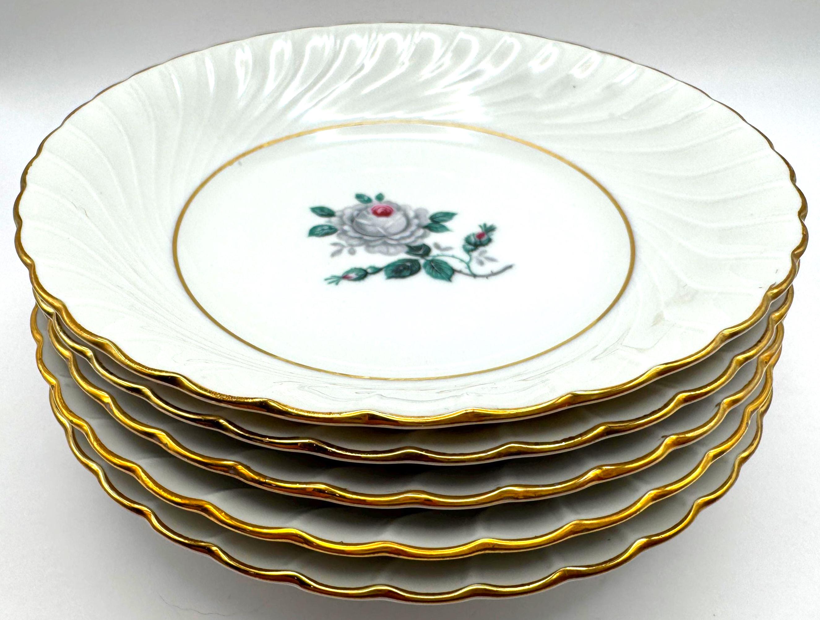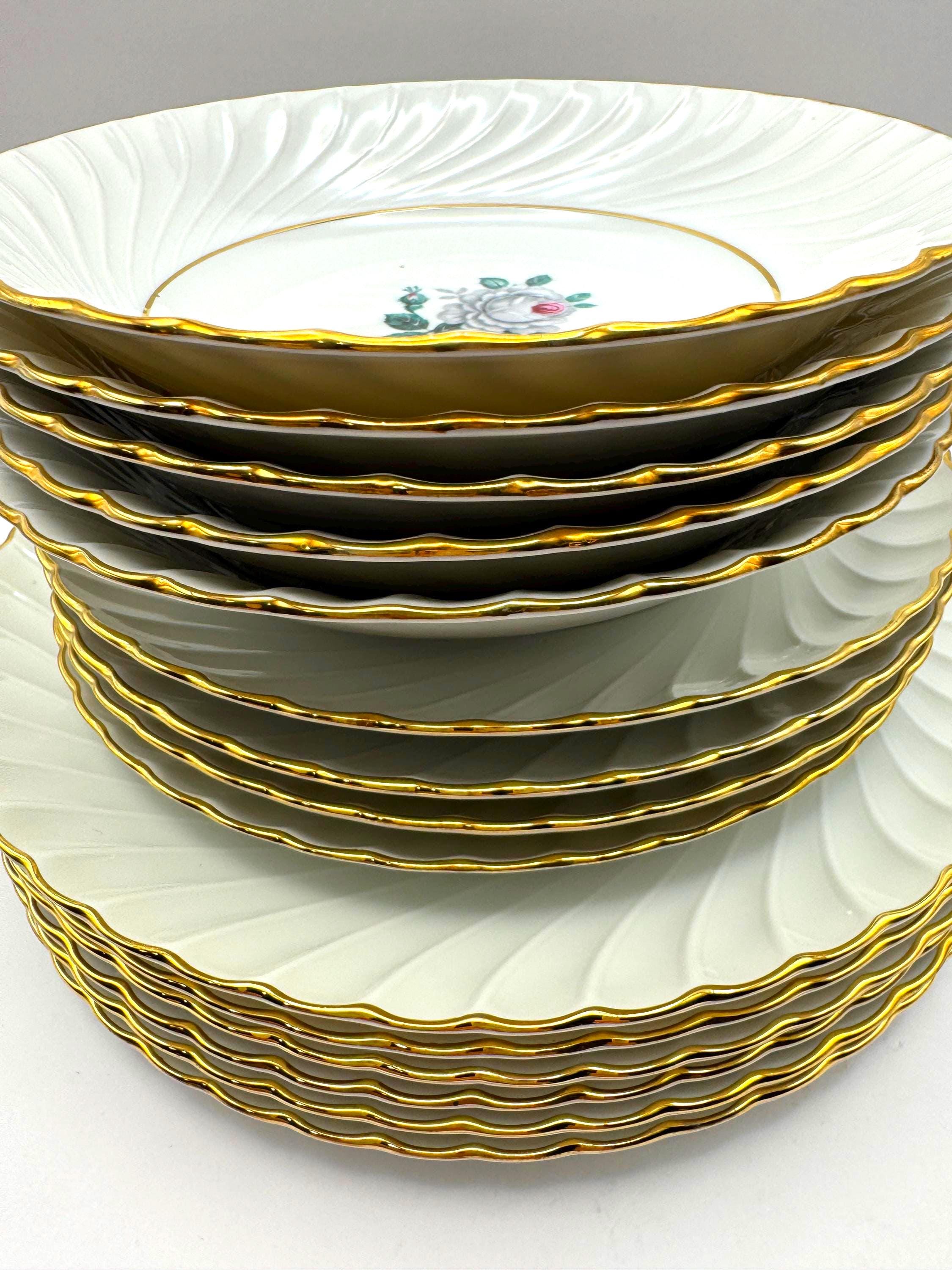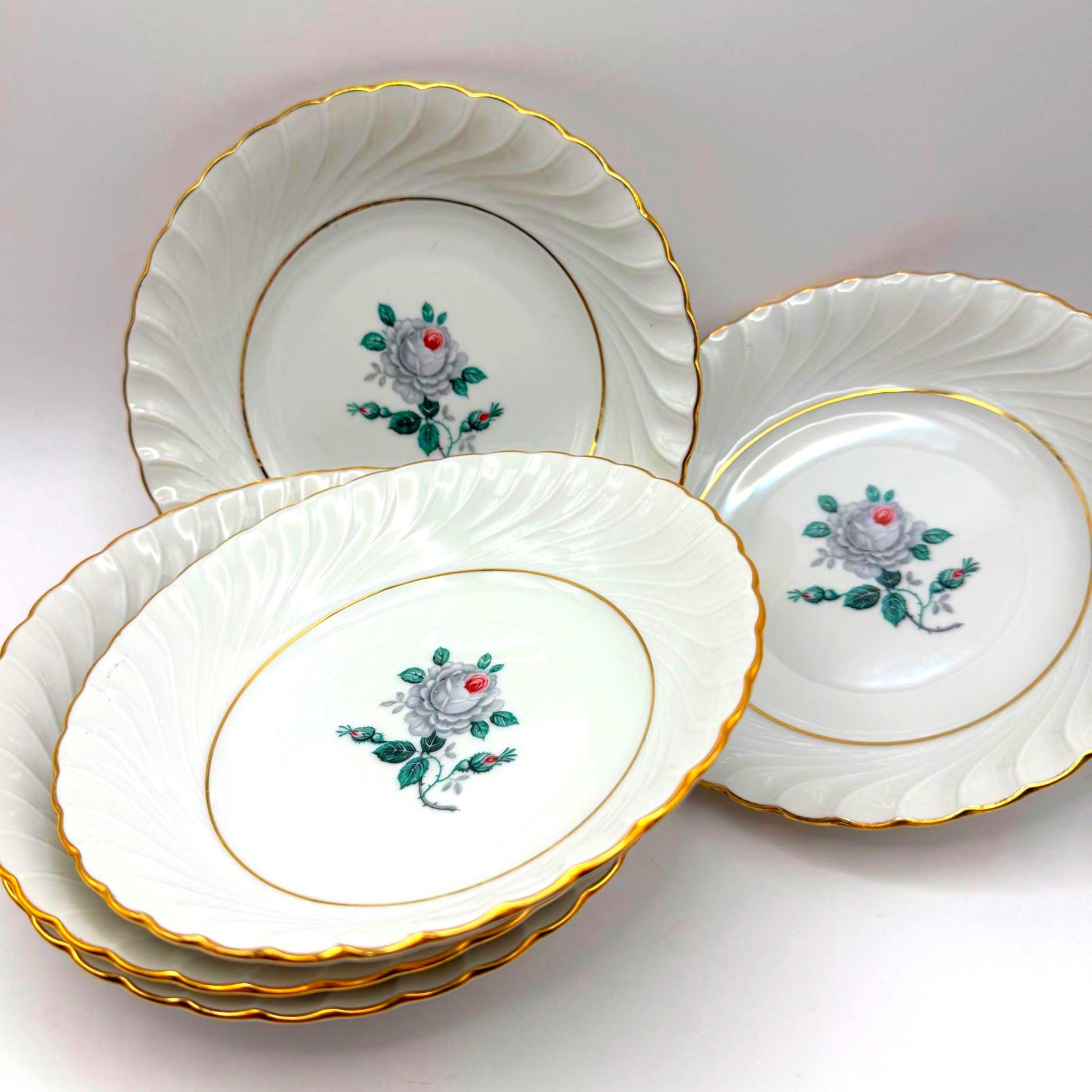 Elegant Royal Bayreuth, Bavaria, made in Germany during the U.S. Zone period (1945-1949). Each piece features a white rose accented in soft gray with a pink center, lush green leaves, and a swirl embossed rim with rich gold trim on warm ivory porcelain.