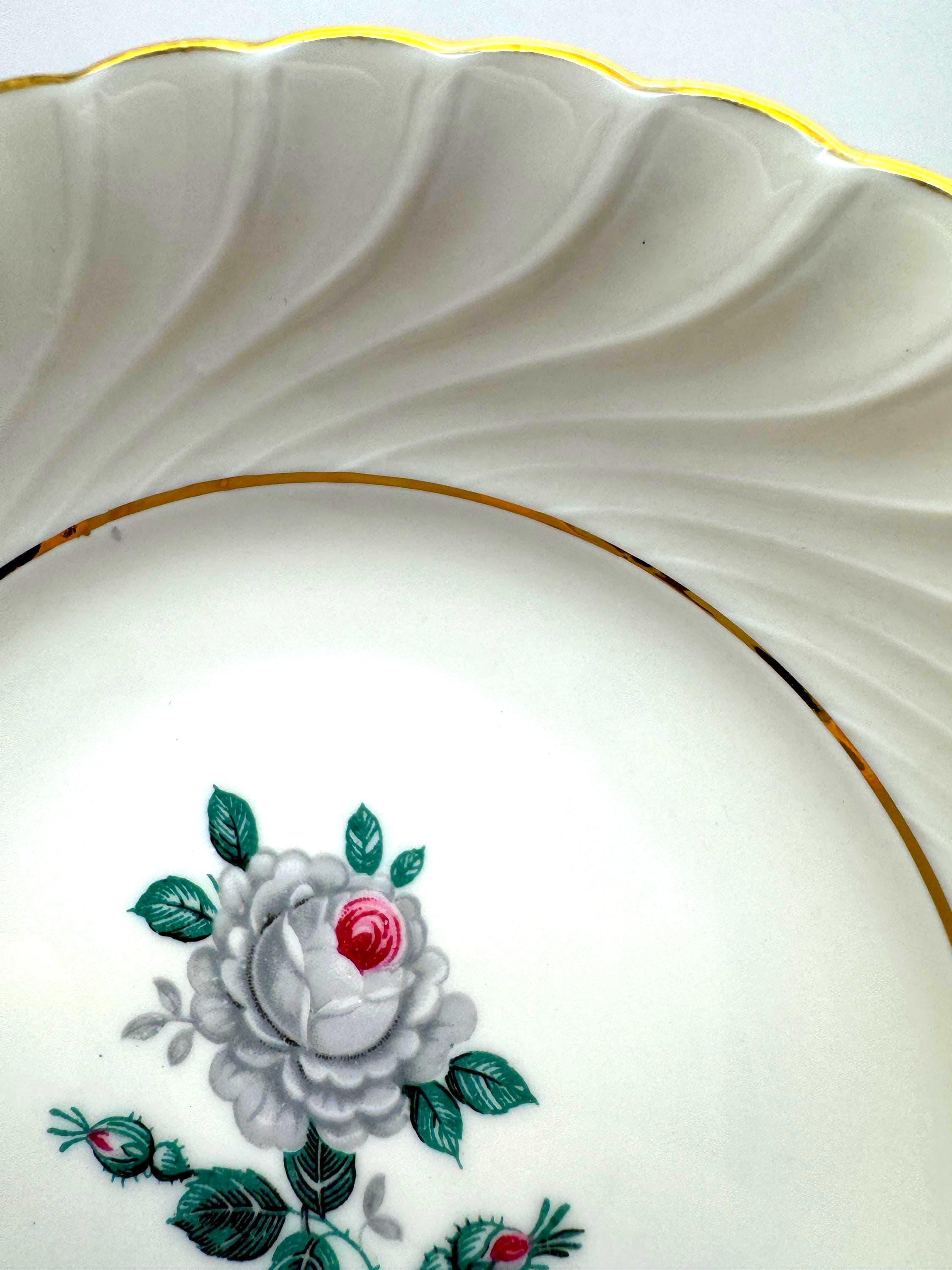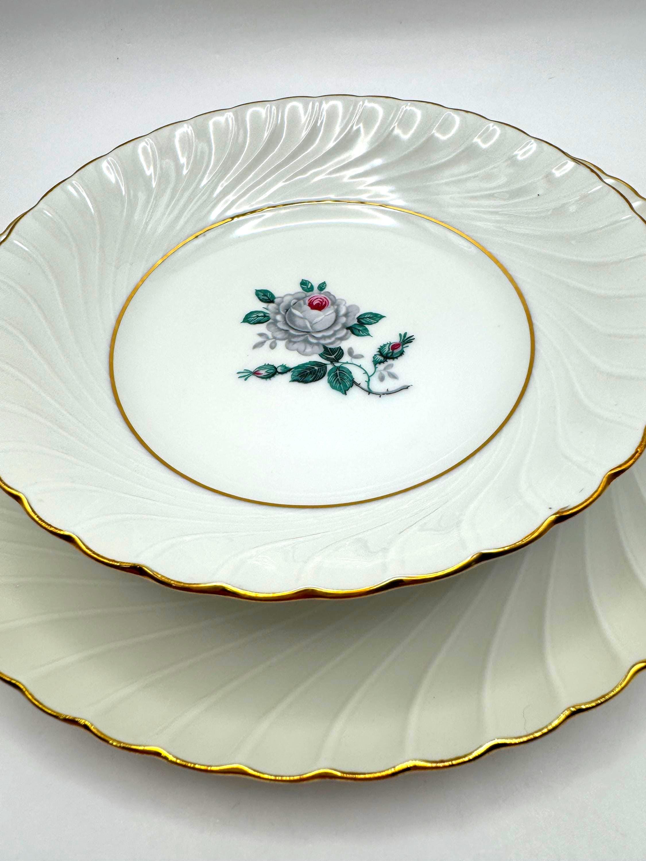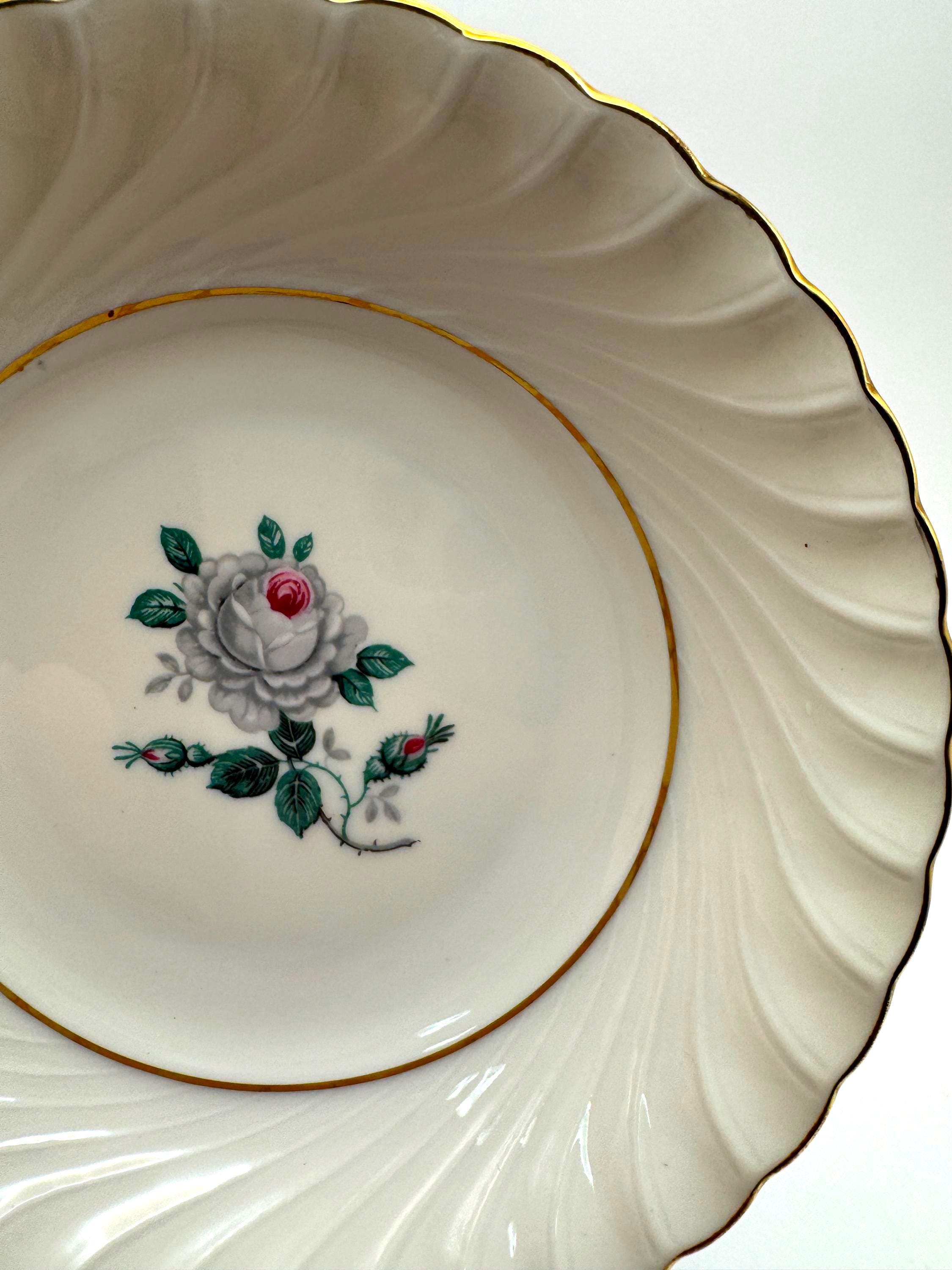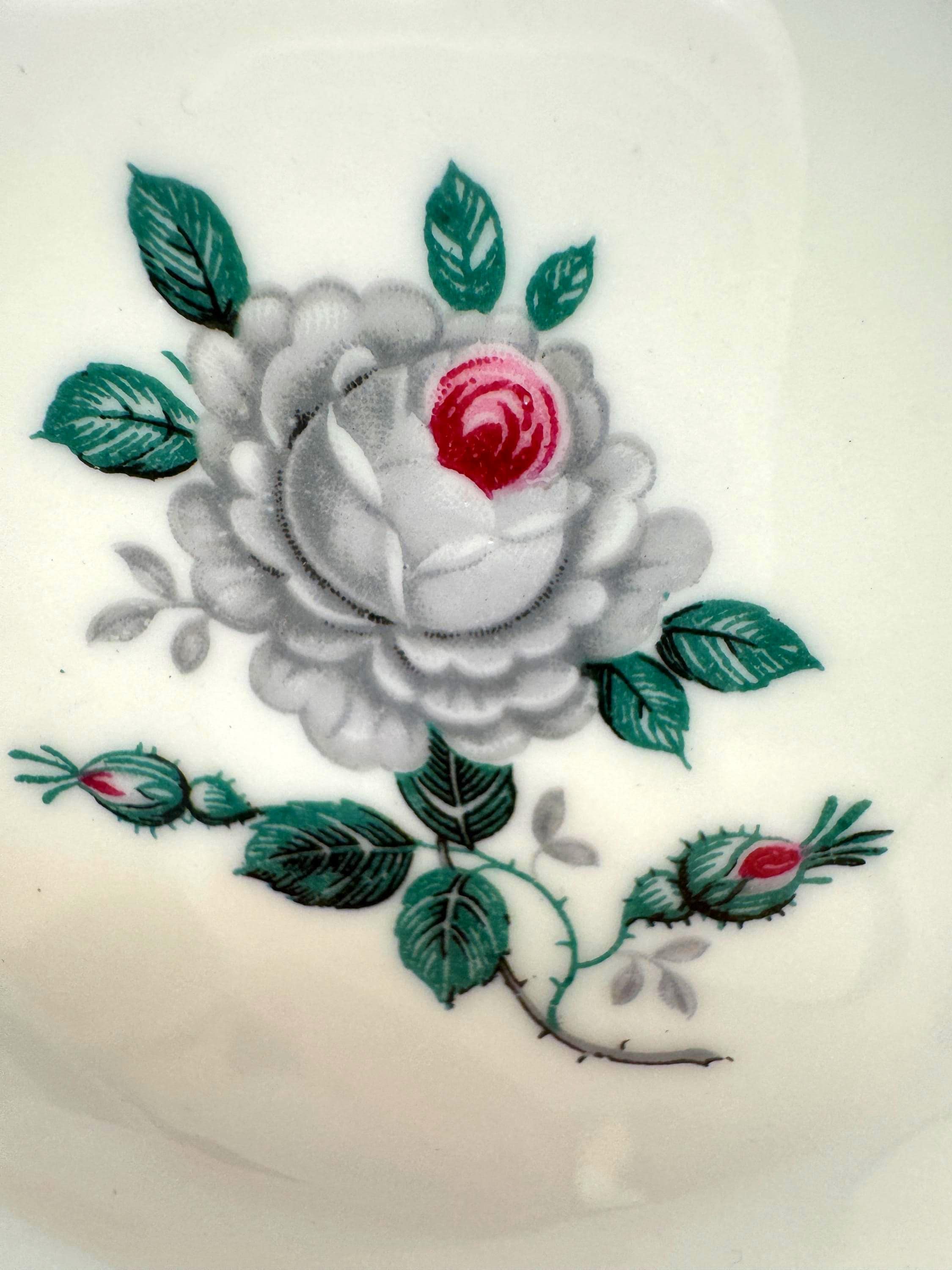 Elegant Royal Bayreuth, Bavaria, made in Germany during the U.S. Zone period (1945-1949). Each piece features a white rose accented in soft gray with a pink center, lush green leaves, and a swirl embossed rim with rich gold trim on warm ivory porcelain.