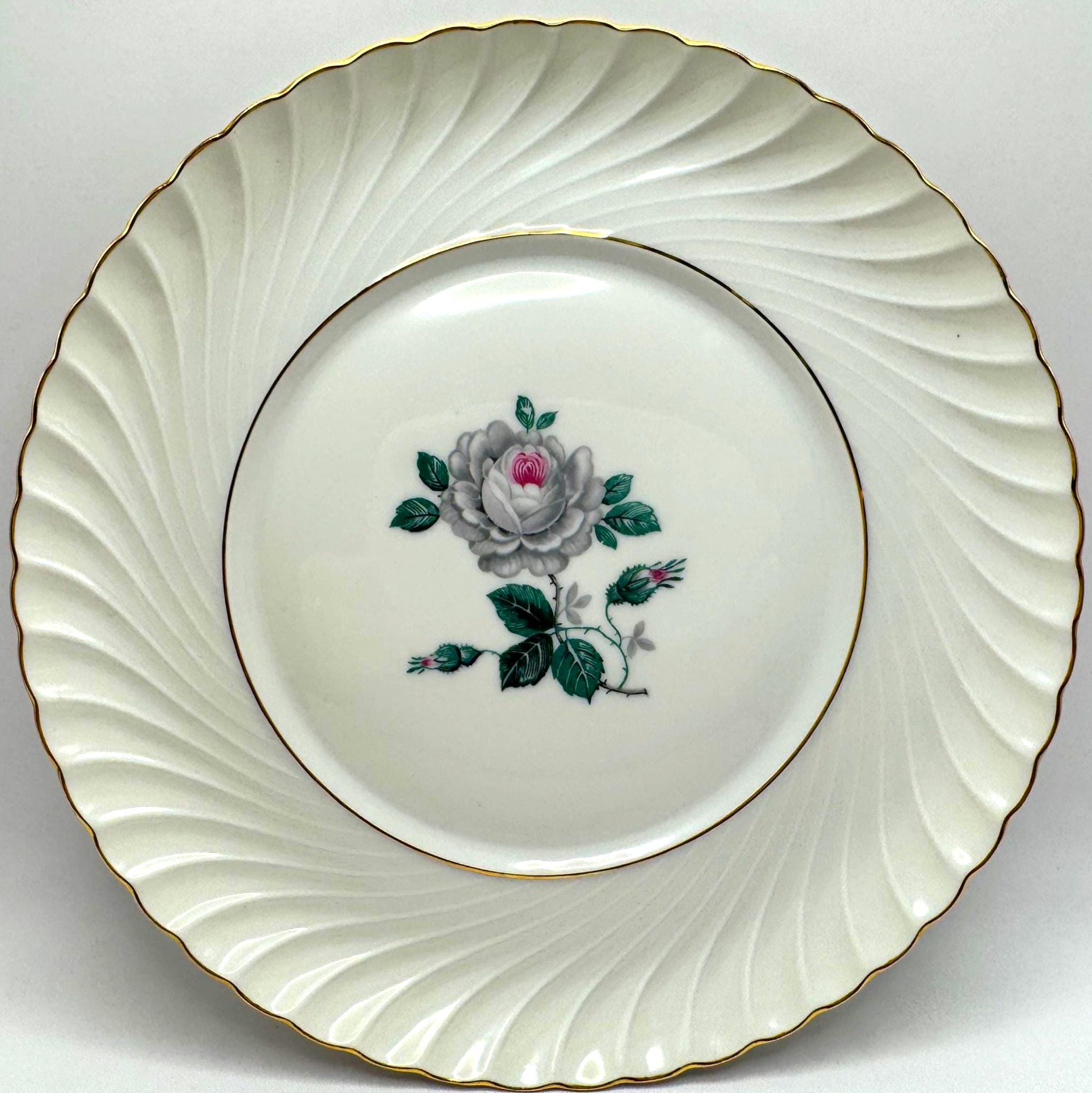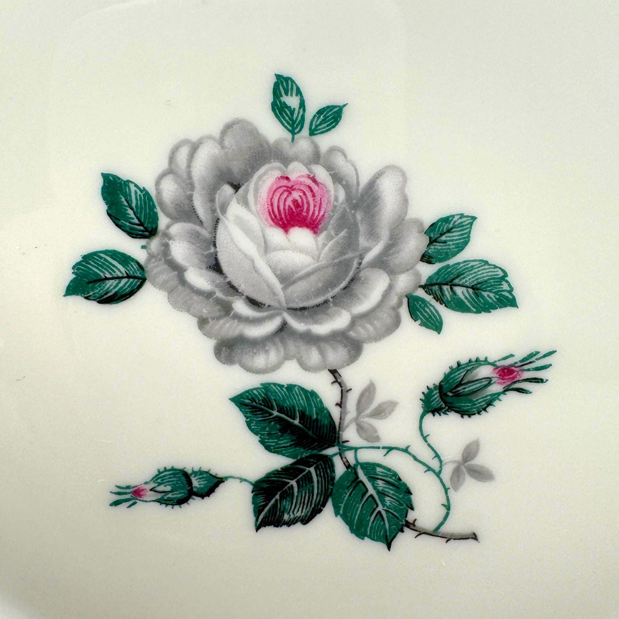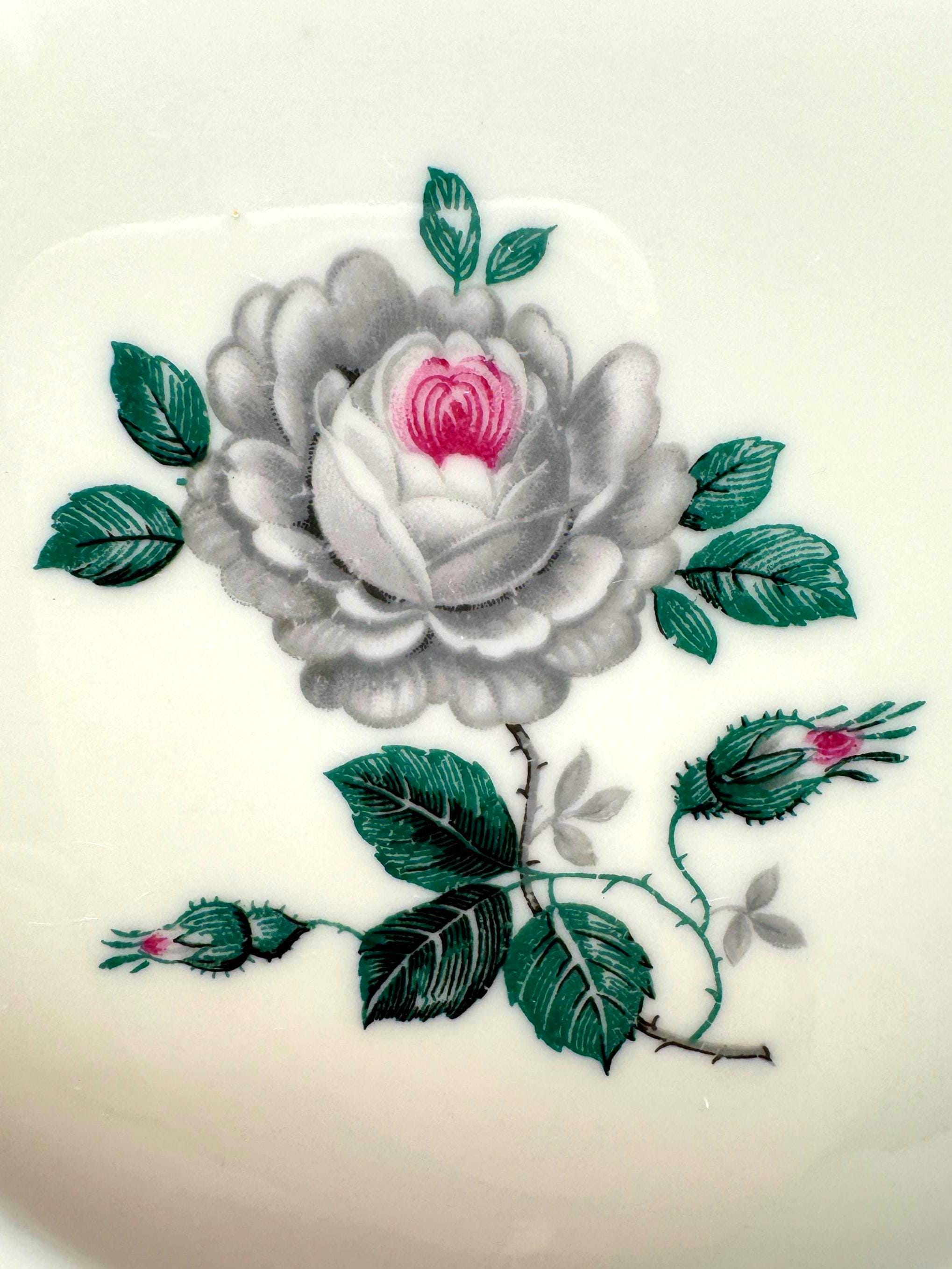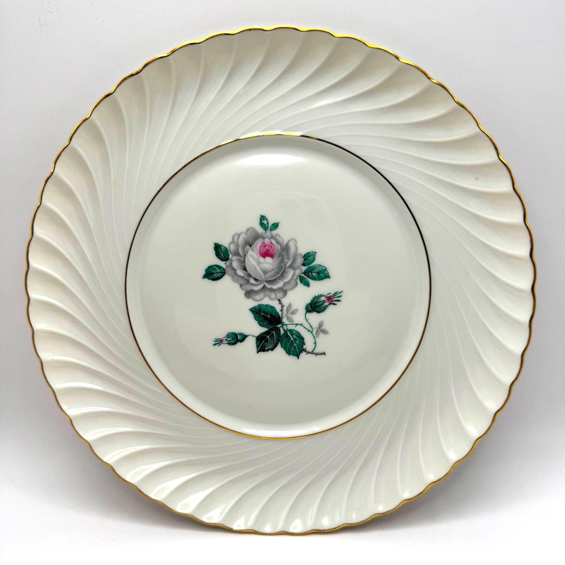 Elegant Royal Bayreuth, Bavaria, made in Germany during the U.S. Zone period (1945-1949). Each piece features a white rose accented in soft gray with a pink center, lush green leaves, and a swirl embossed rim with rich gold trim on warm ivory porcelain.