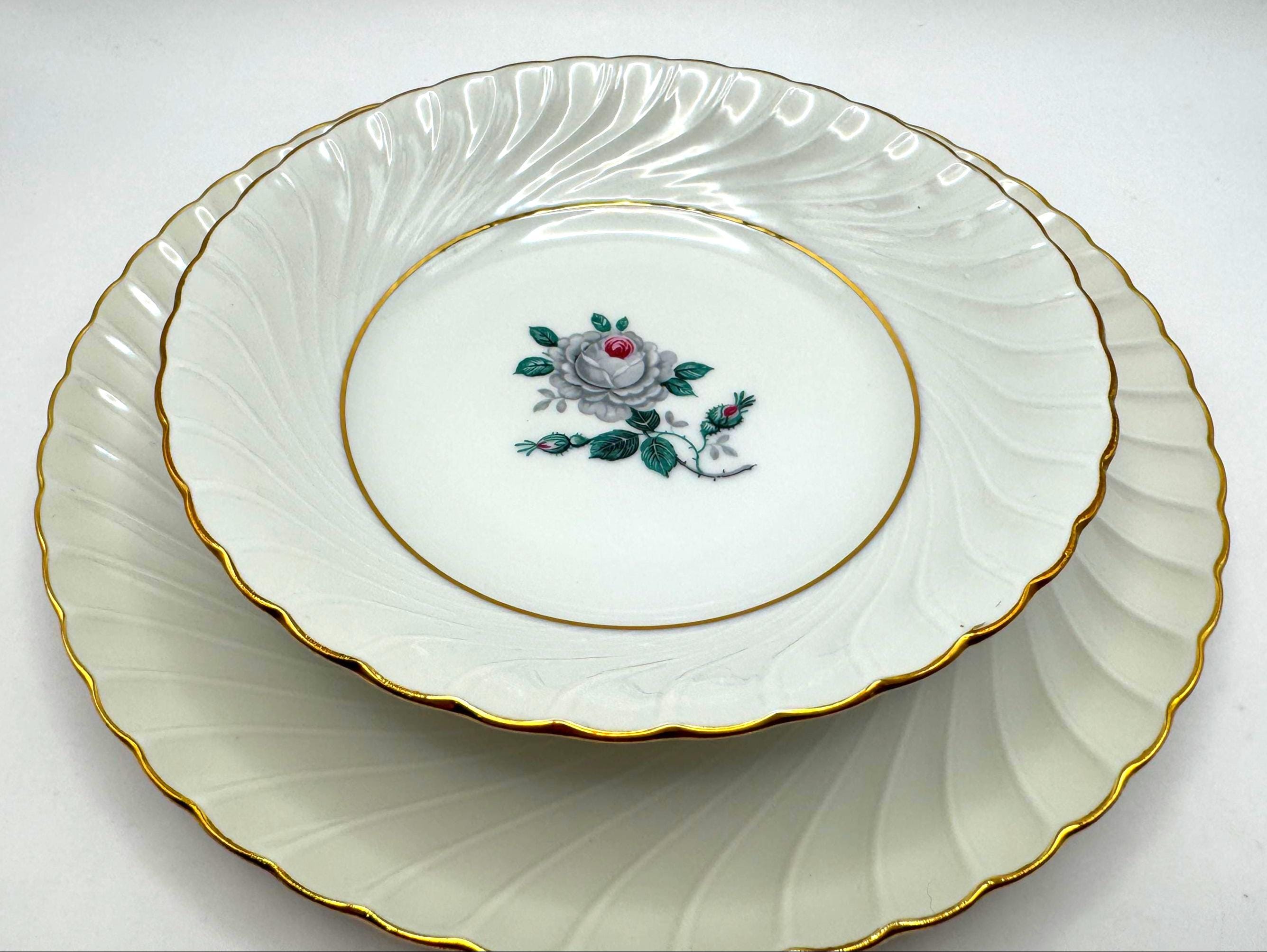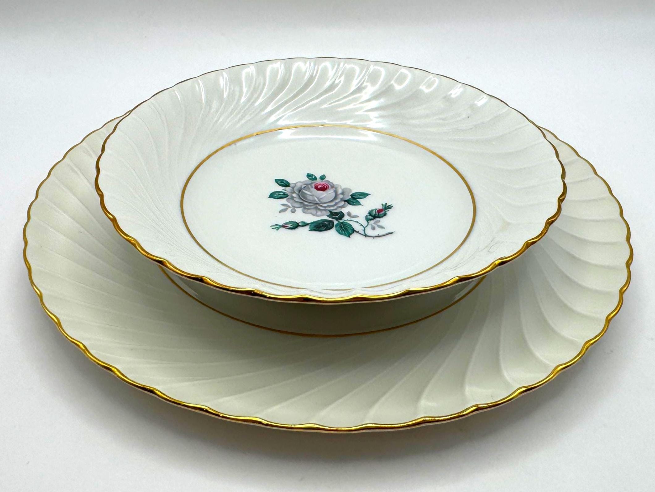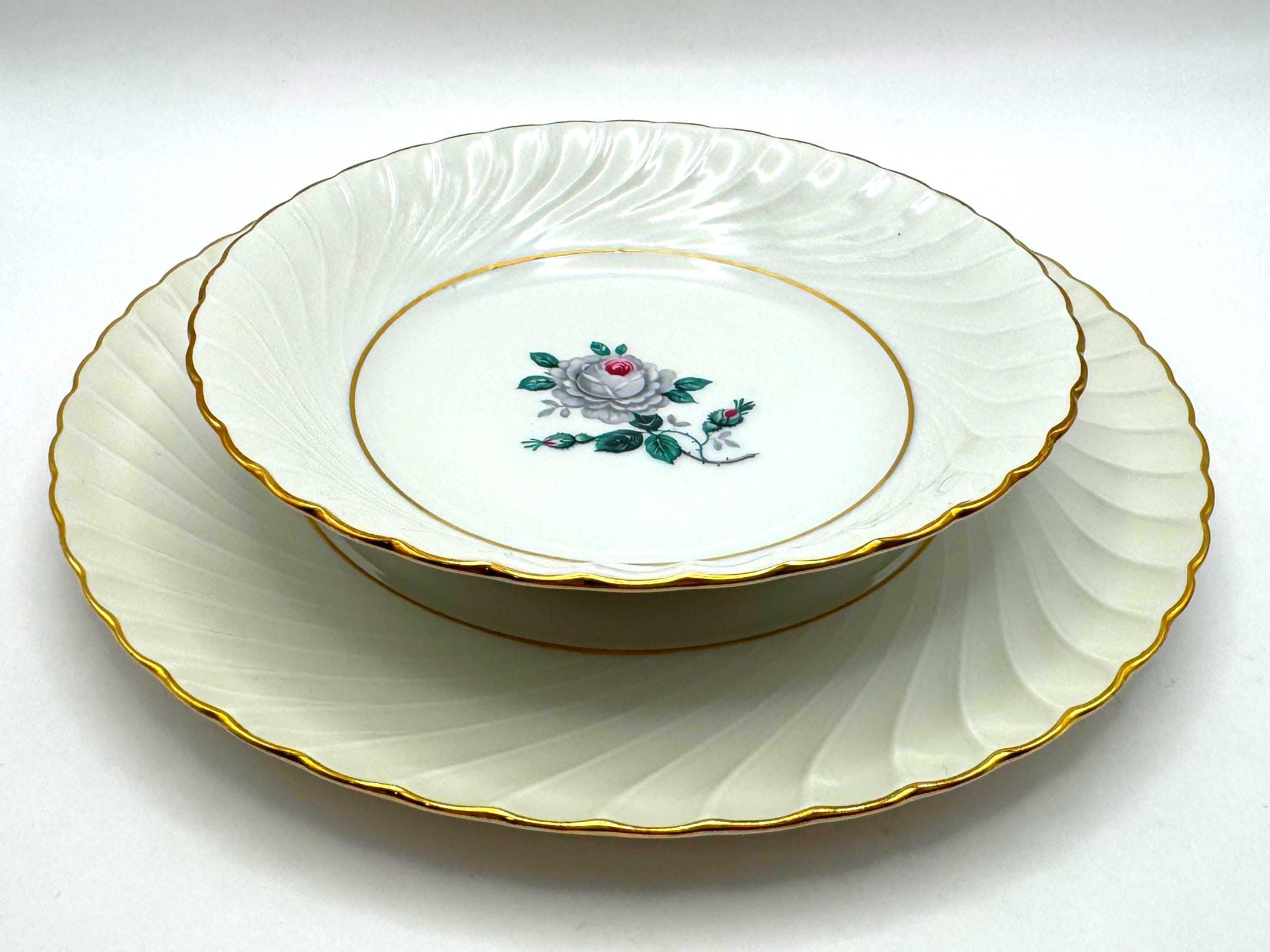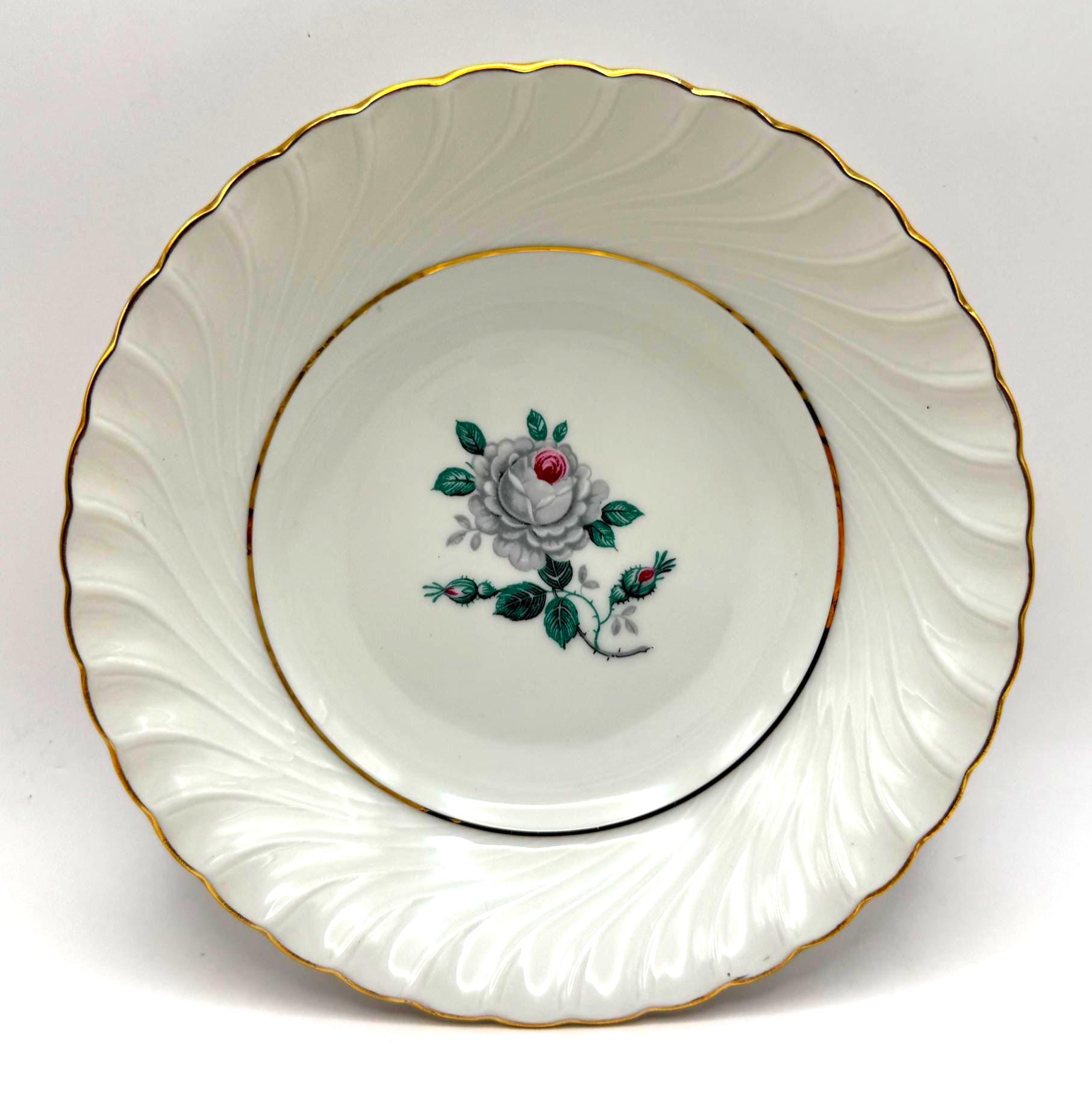 Elegant Royal Bayreuth, Bavaria, made in Germany during the U.S. Zone period (1945-1949). Each piece features a white rose accented in soft gray with a pink center, lush green leaves, and a swirl embossed rim with rich gold trim on warm ivory porcelain.