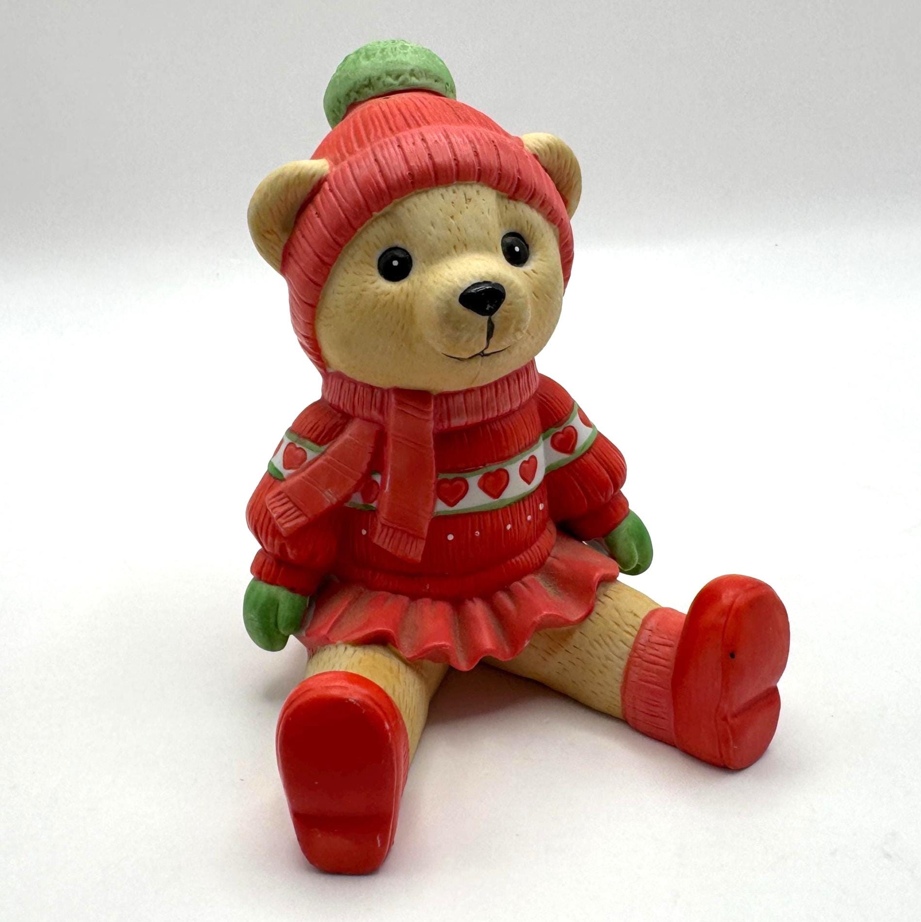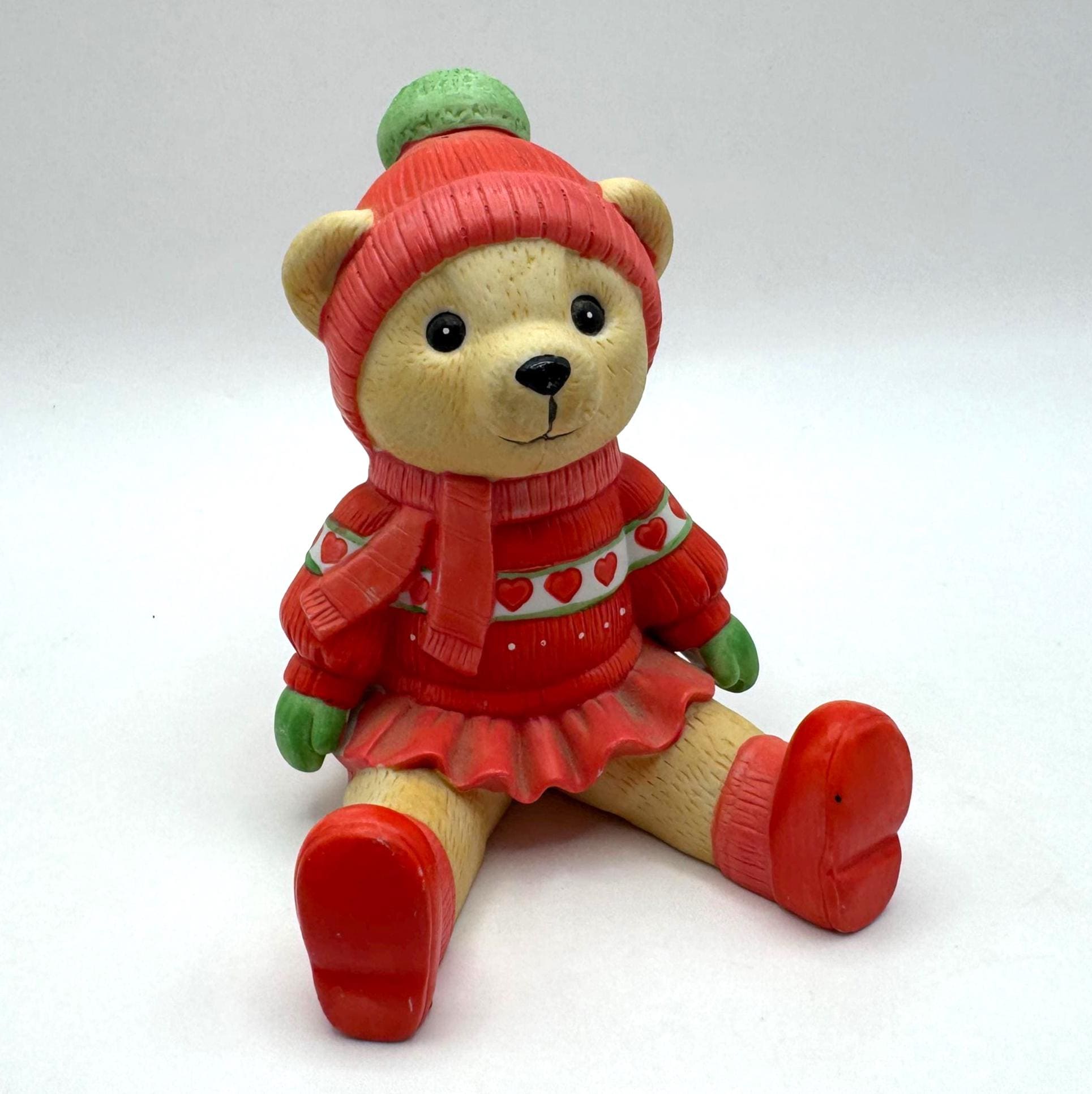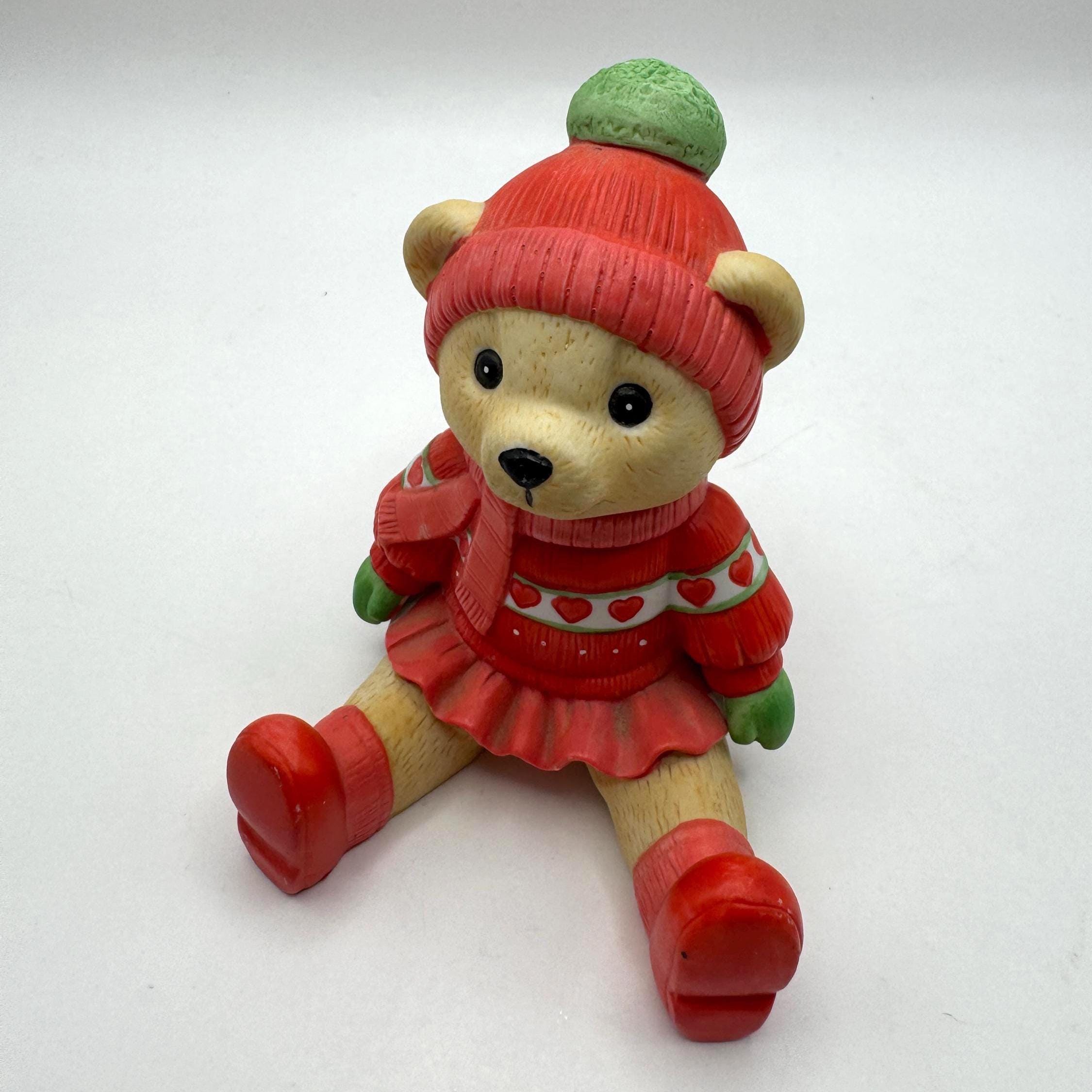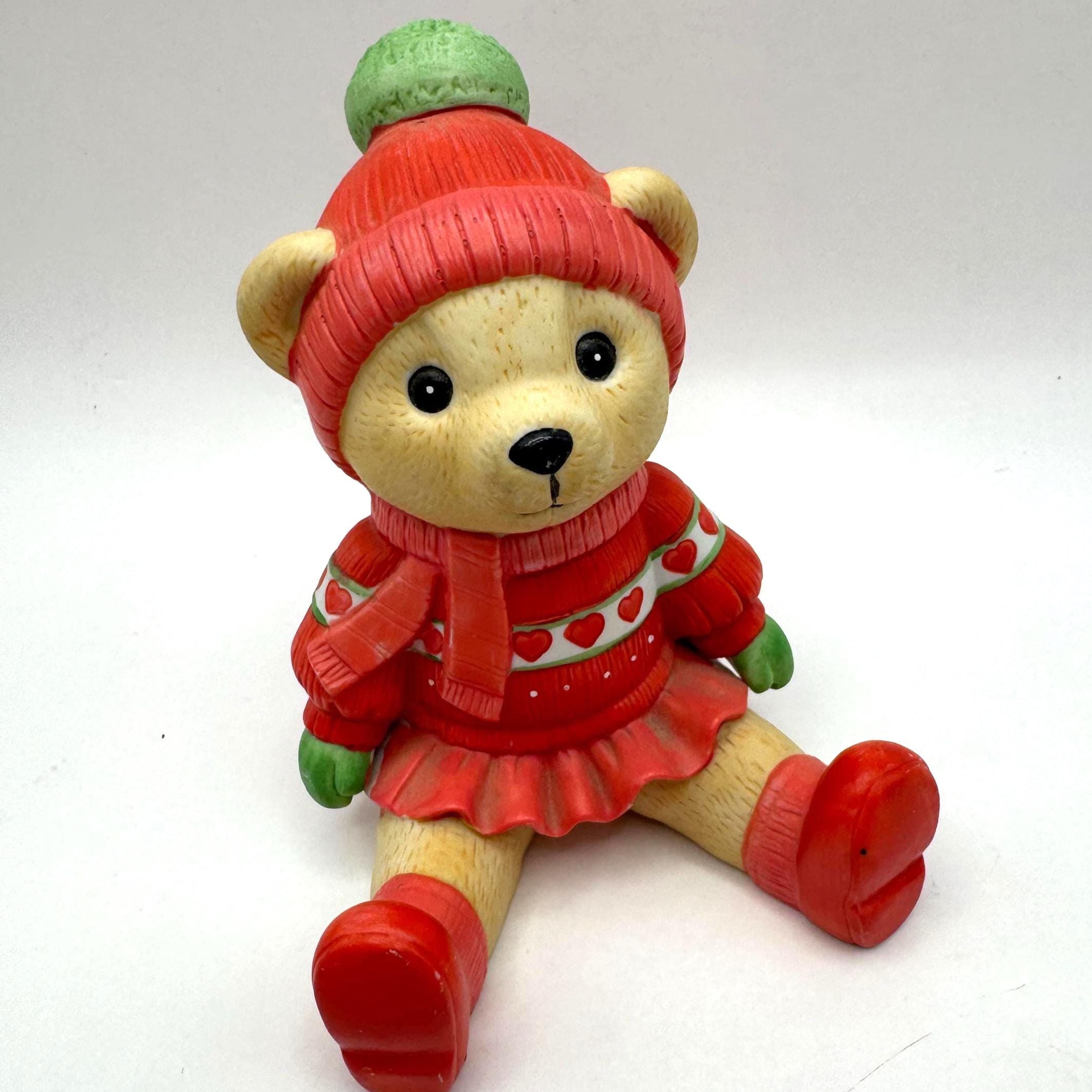 Adorable vintage porcelain bear figurine by Russ Berrie dressed for the holidays in a cozy red knit-look sweater and skirt with tiny red hearts, green mittens, and a matching red hat topped with a green pom-pom. The sweet bear captures the warmth and charm of the 1990s Russ Holiday collection, crafted in smooth porcelain with hand-painted details.