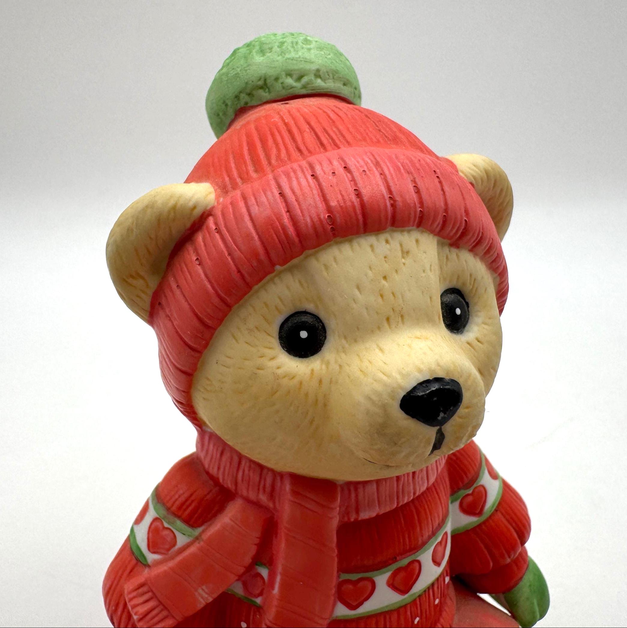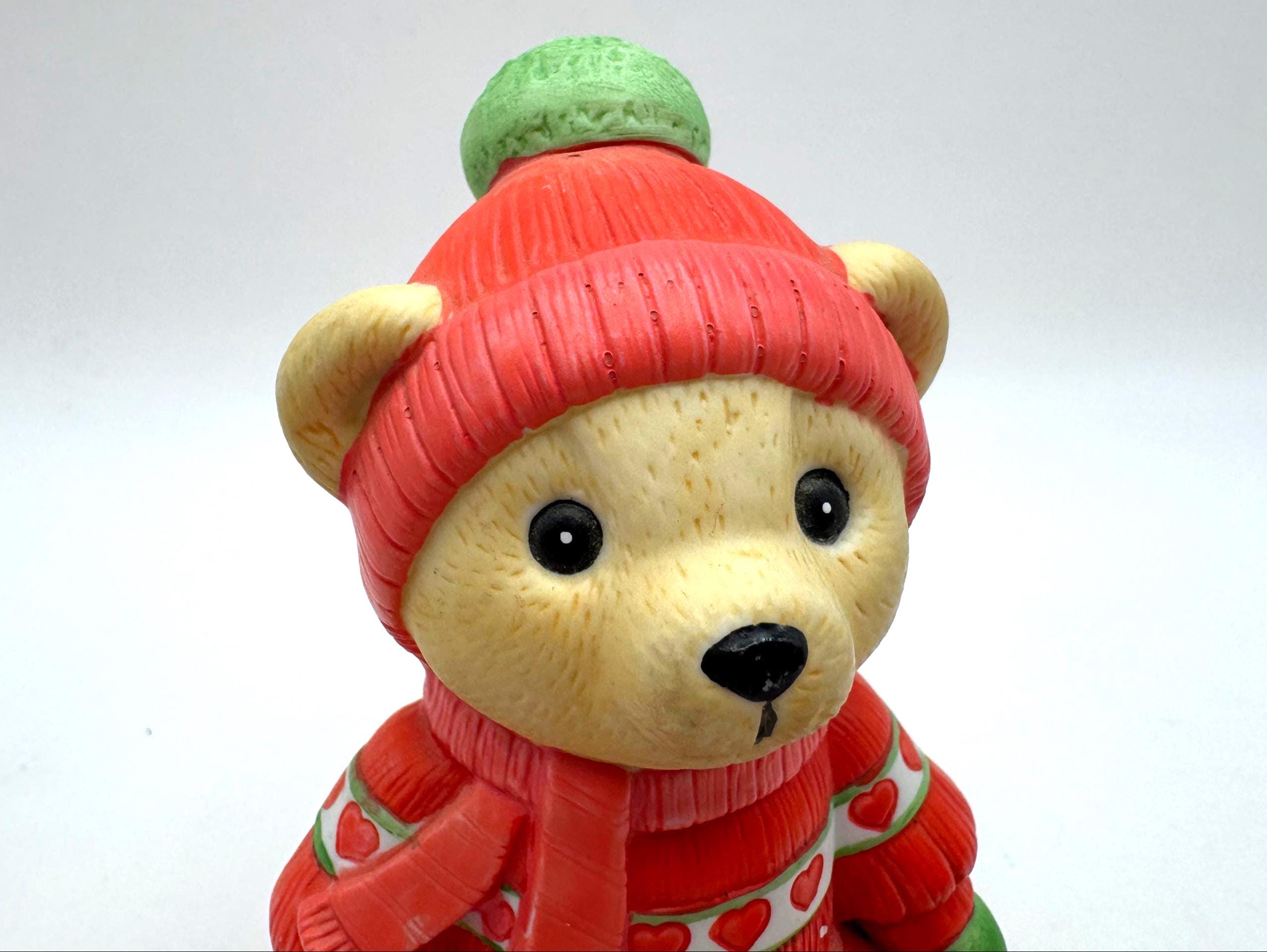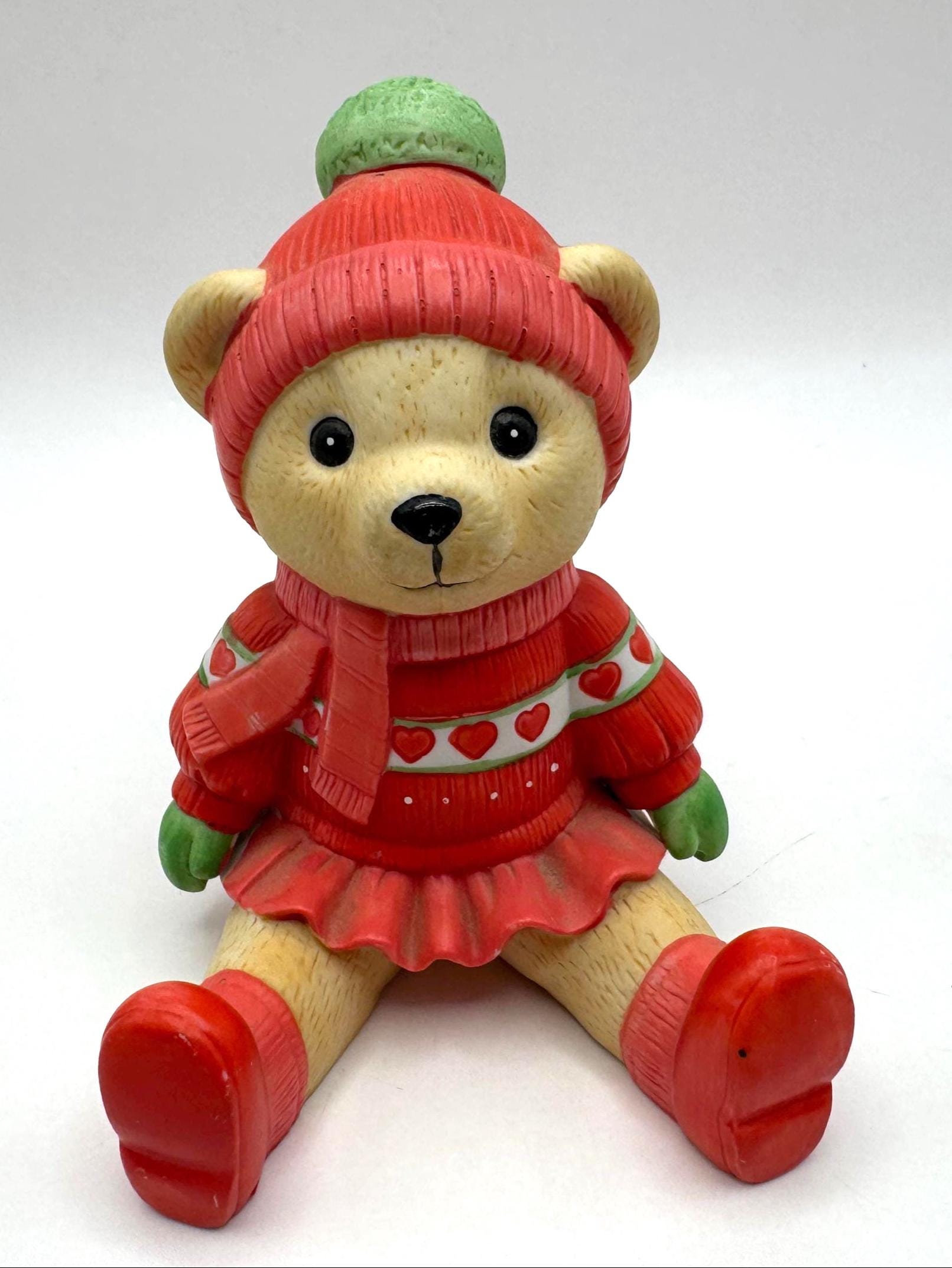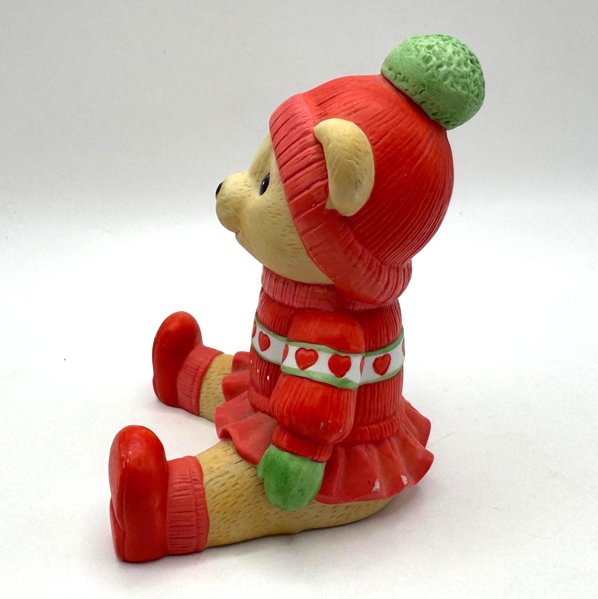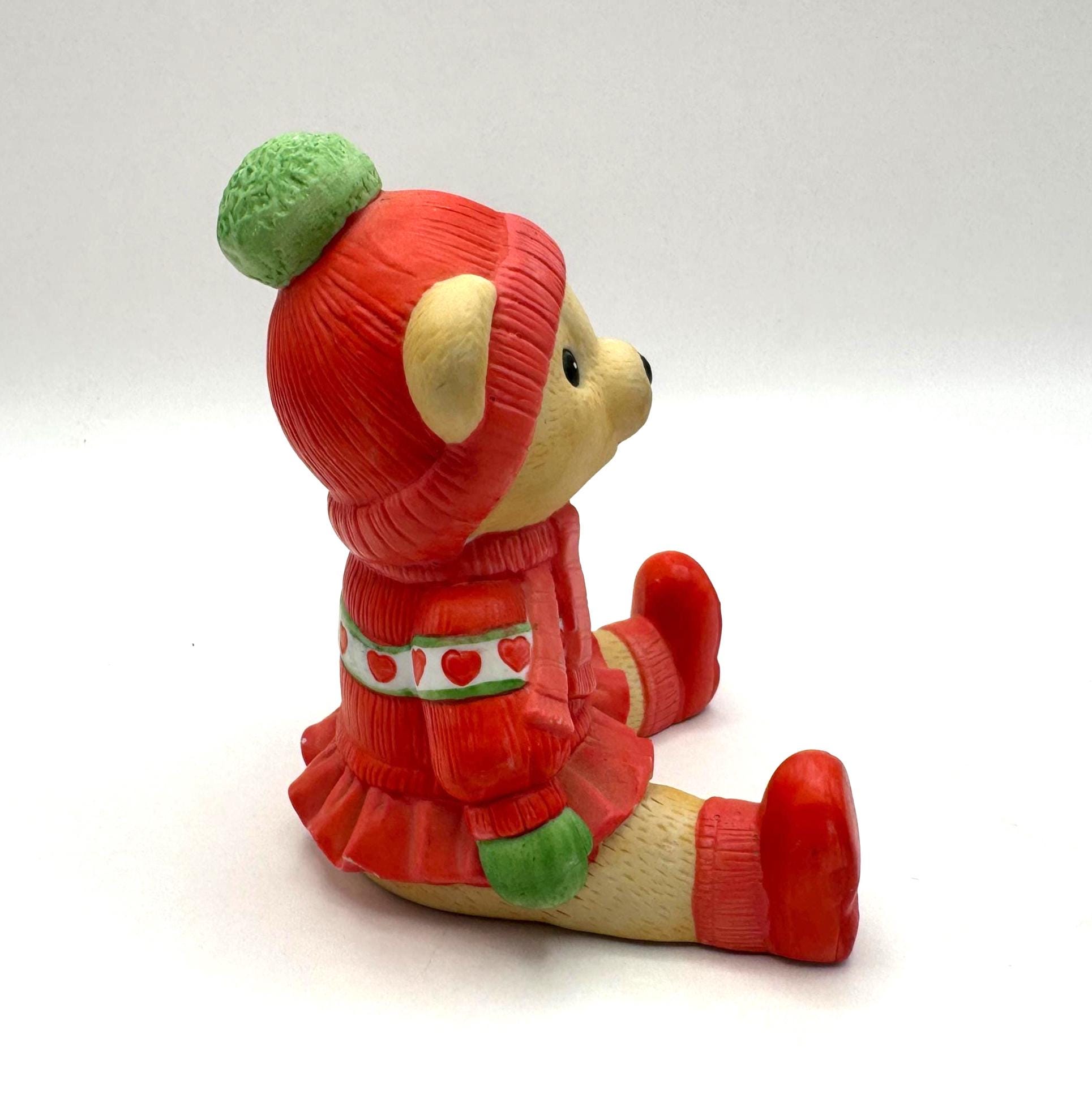 Adorable vintage porcelain bear figurine by Russ Berrie dressed for the holidays in a cozy red knit-look sweater and skirt with tiny red hearts, green mittens, and a matching red hat topped with a green pom-pom. The sweet bear captures the warmth and charm of the 1990s Russ Holiday collection, crafted in smooth porcelain with hand-painted details.