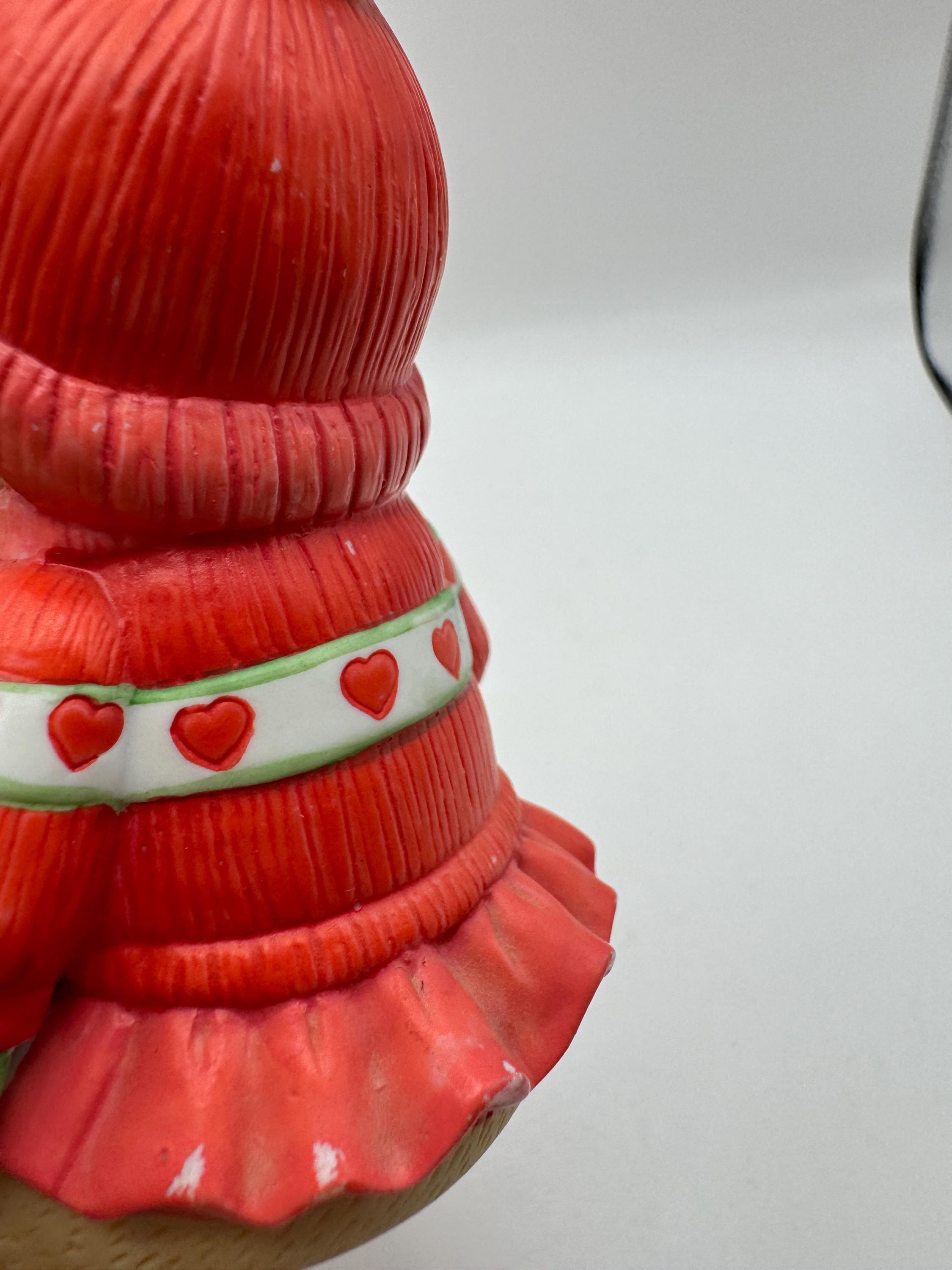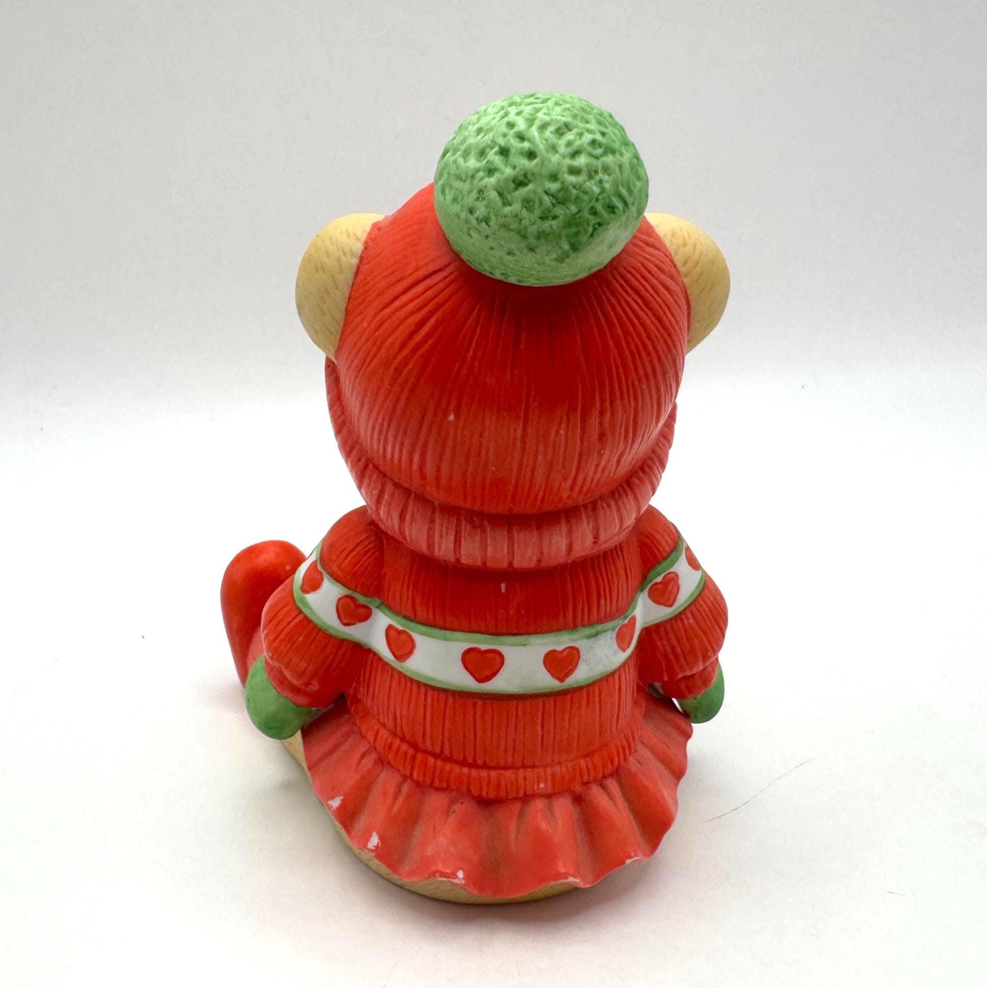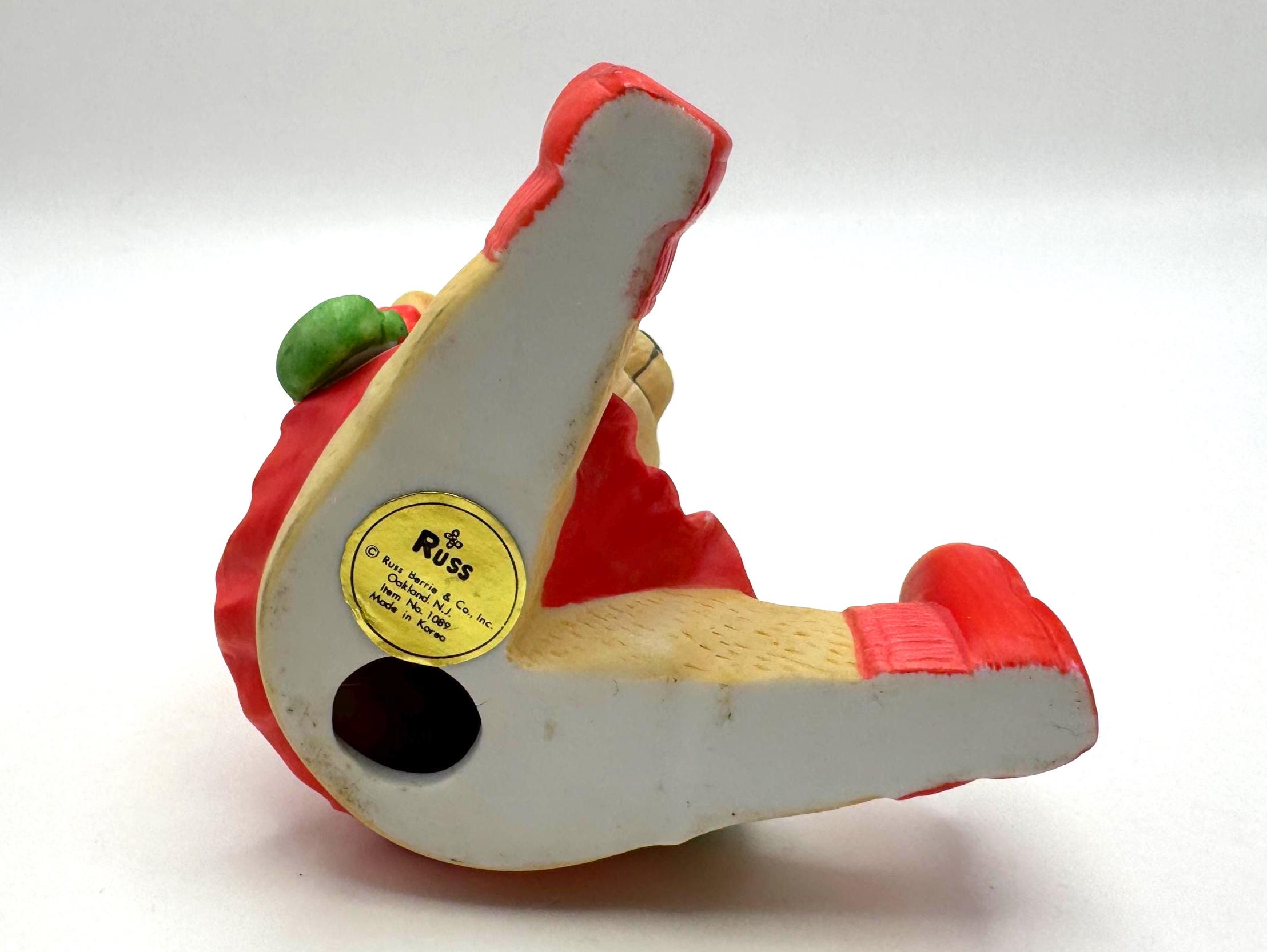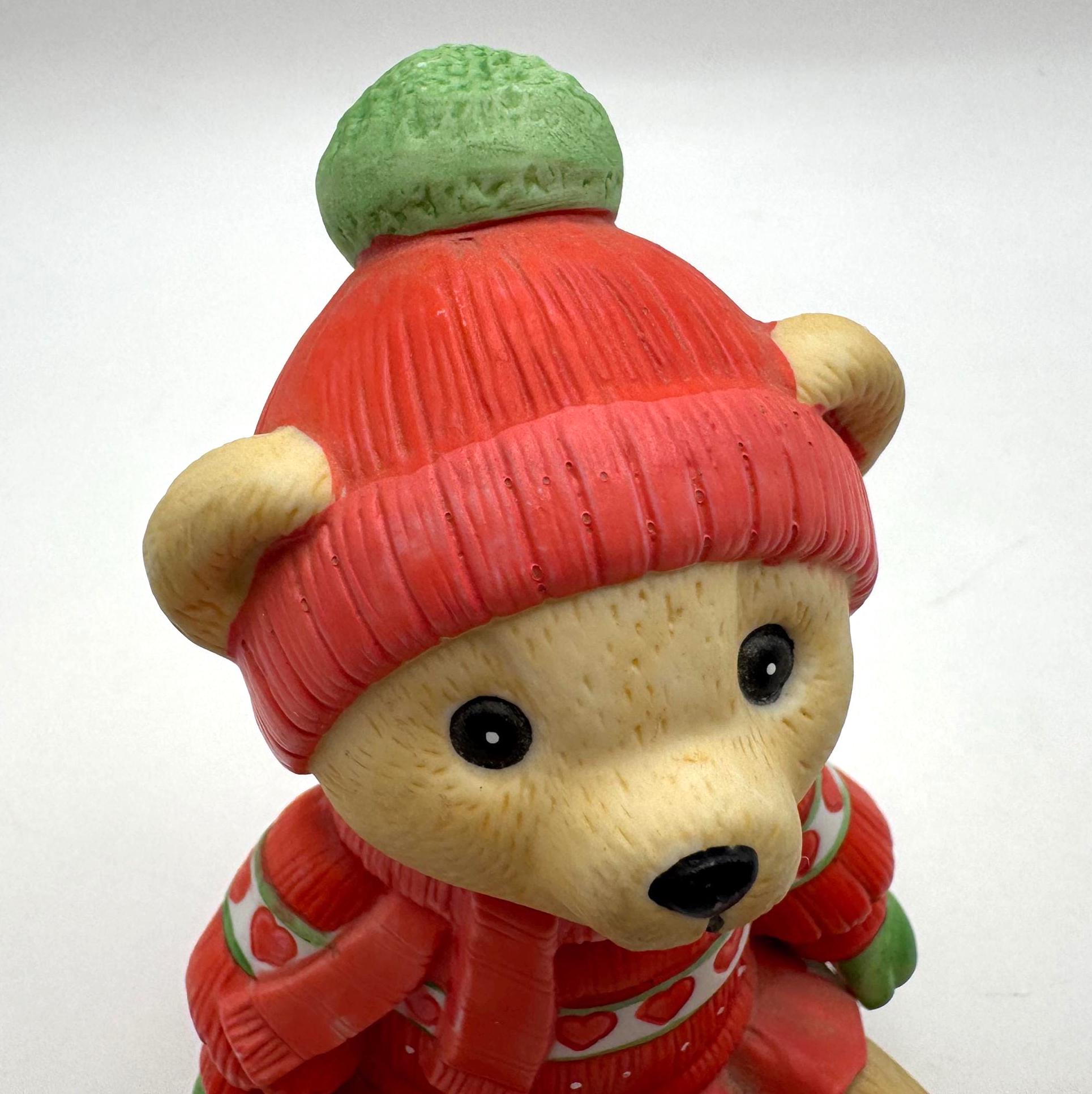 Adorable vintage porcelain bear figurine by Russ Berrie dressed for the holidays in a cozy red knit-look sweater and skirt with tiny red hearts, green mittens, and a matching red hat topped with a green pom-pom. The sweet bear captures the warmth and charm of the 1990s Russ Holiday collection, crafted in smooth porcelain with hand-painted details.